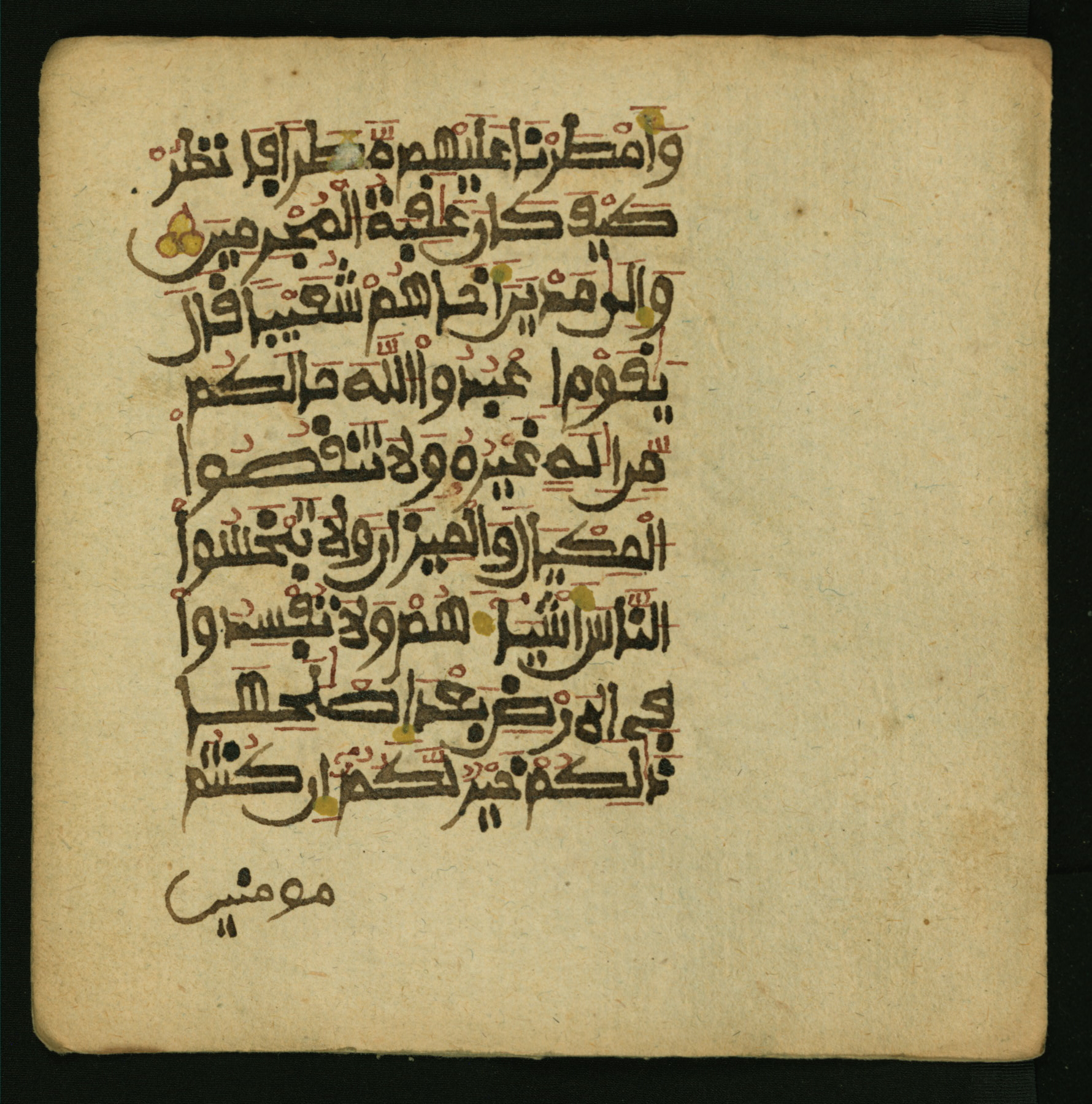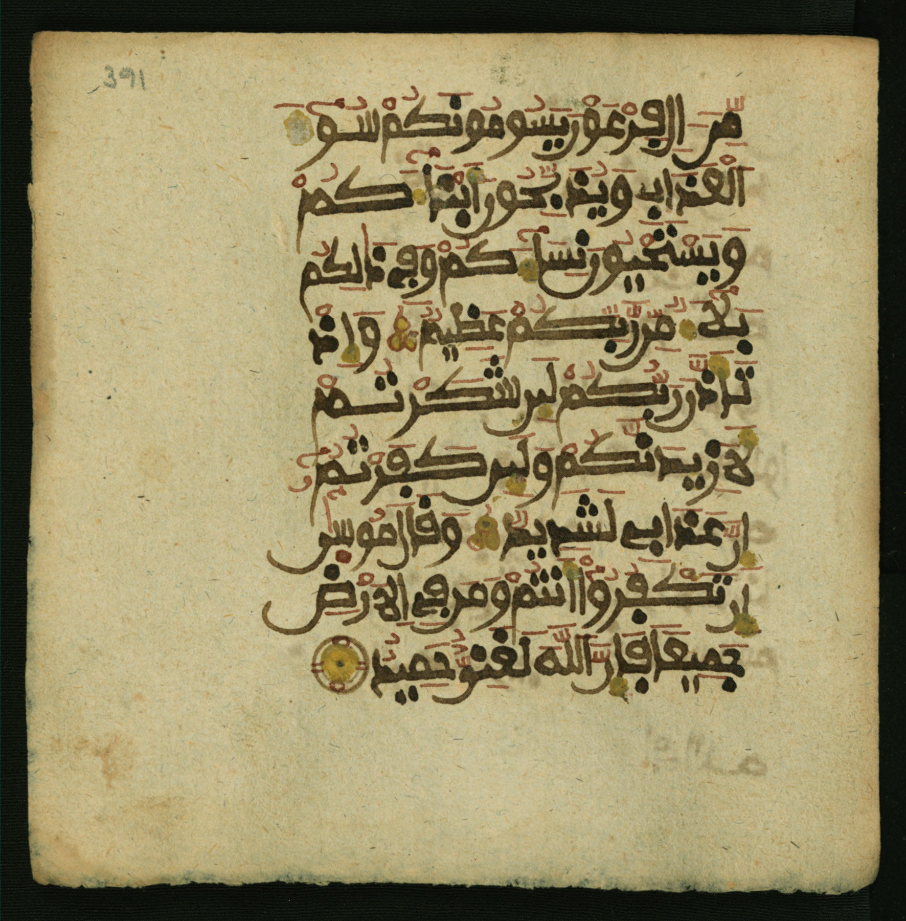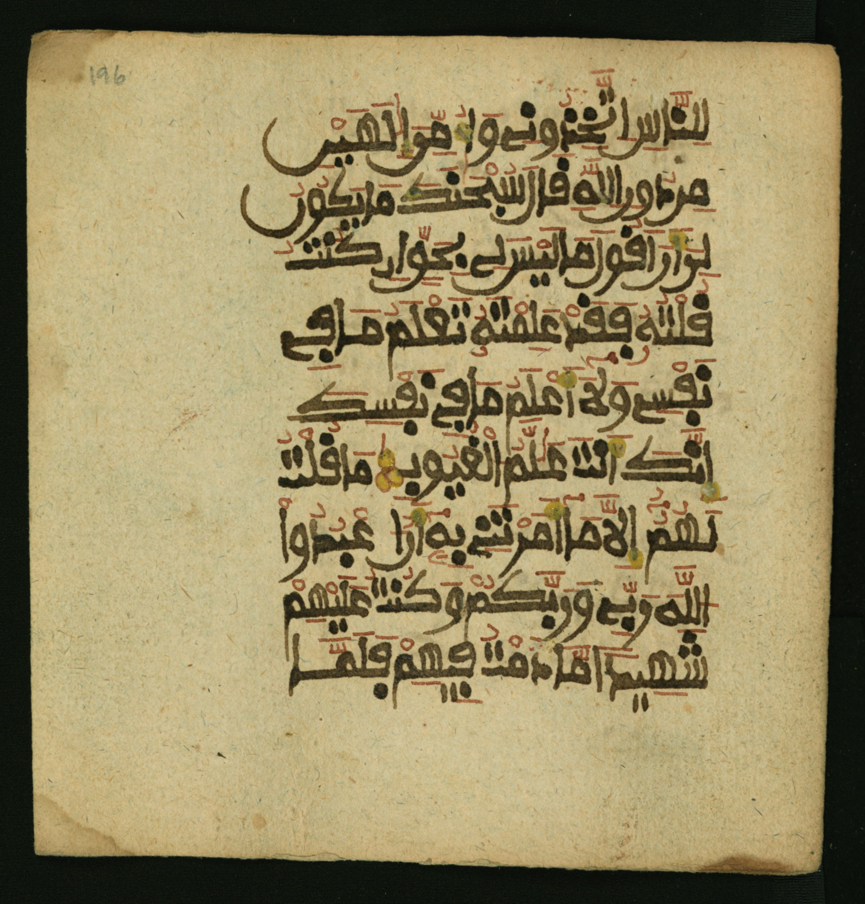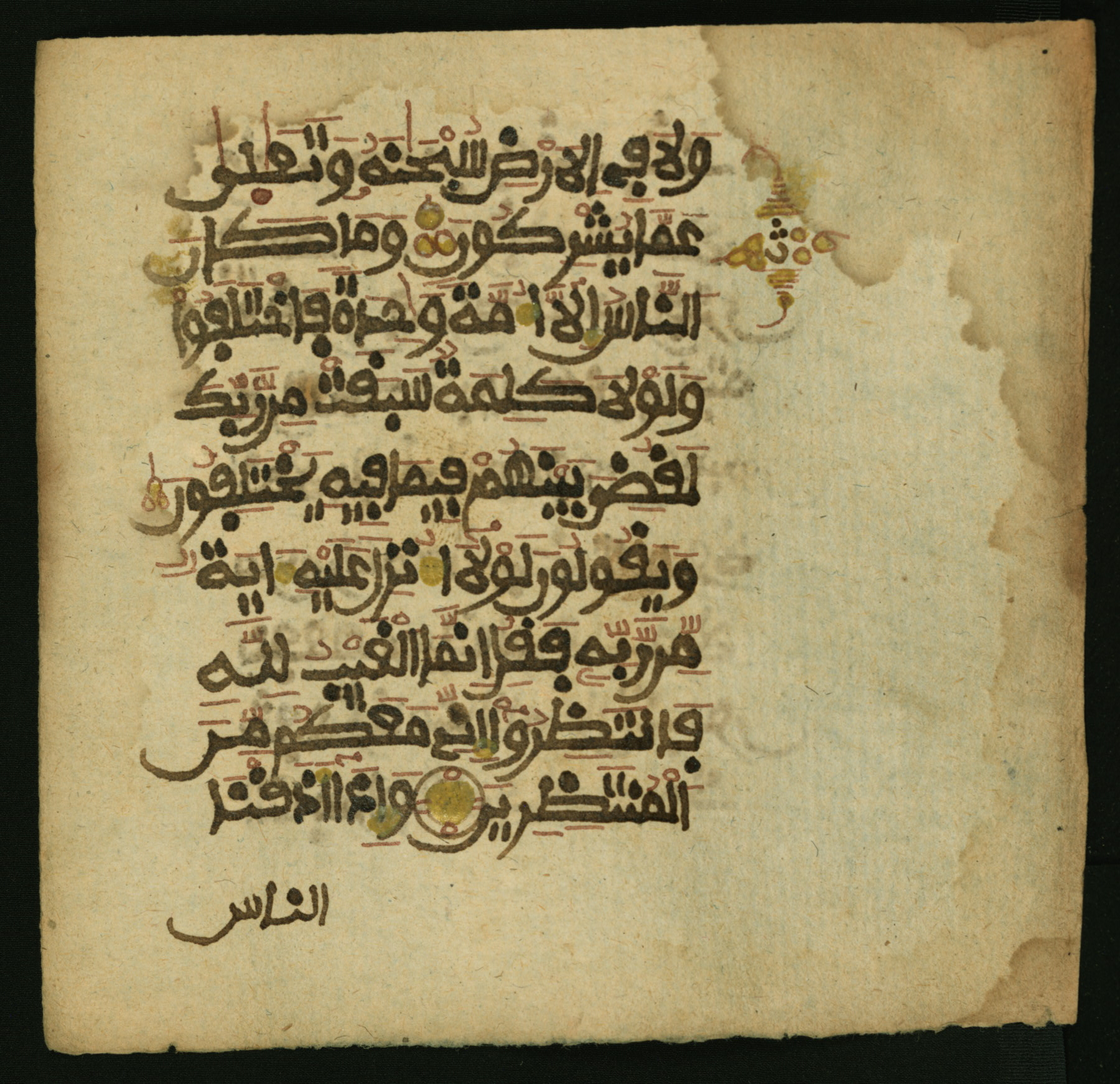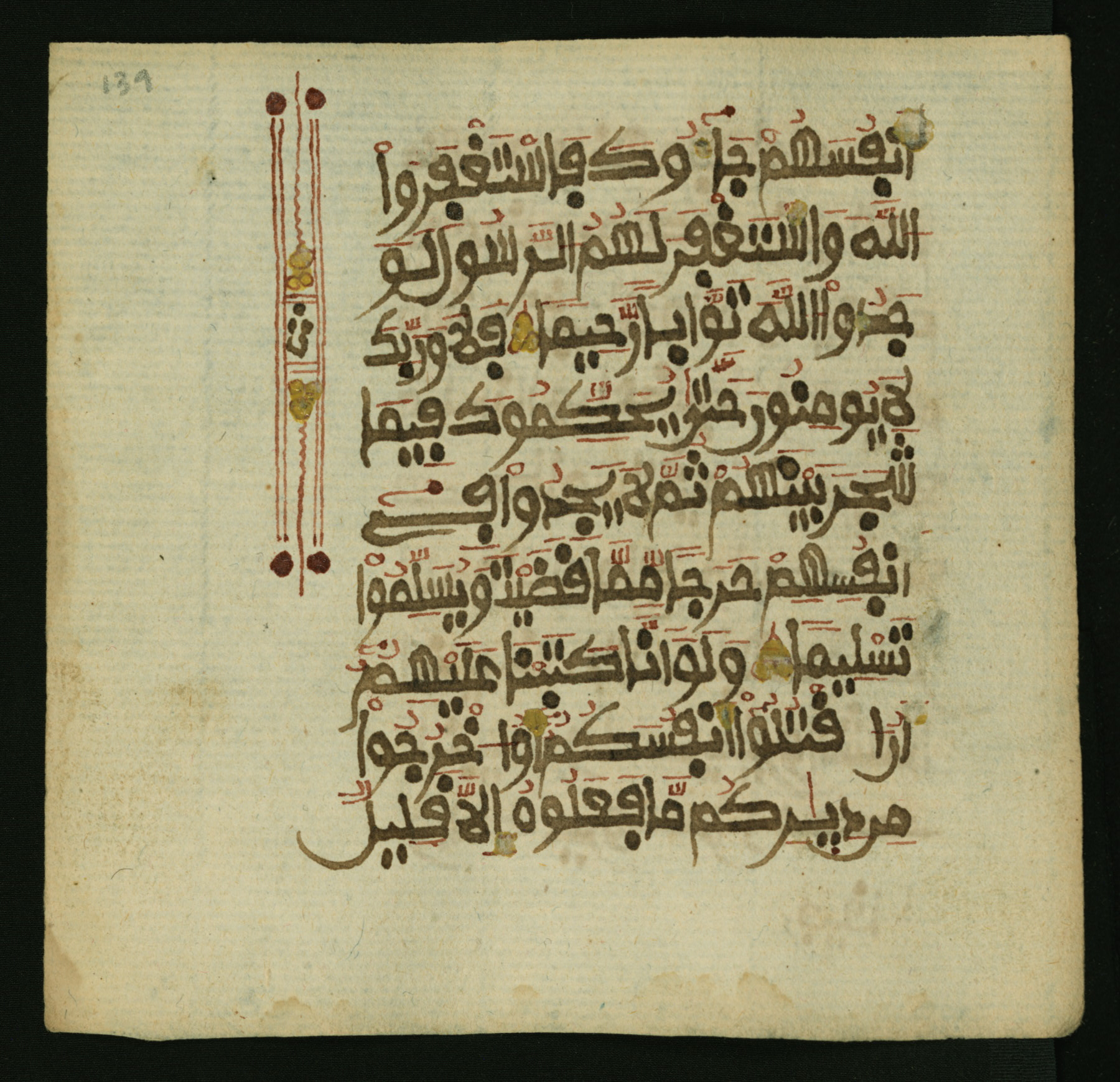 This square-format manuscript is volume 1, containing chapters 1-18 (Sūrat al-fātiḥah through Sūrat al-kahf), of an illuminated two-volume Qur'an produced in Sub-Saharan (West) Africa in the thirteenth century AH / nineteenth CE. The text is written in Sūdānī script in dark brown ink with vocalization in red on loose leaves. Chapter headings are in reddish-brown ink. Three yellow dots outlined in red arranged in a triangular form separate verses. Polychrome circular medallions as well as square and rectangular devices in a variety of patterns and colors mark textual divisions. The leaves of the text are organized between two decorated boards with geometric compositions. The pages and boards are housed in a leather pouch (satchel).