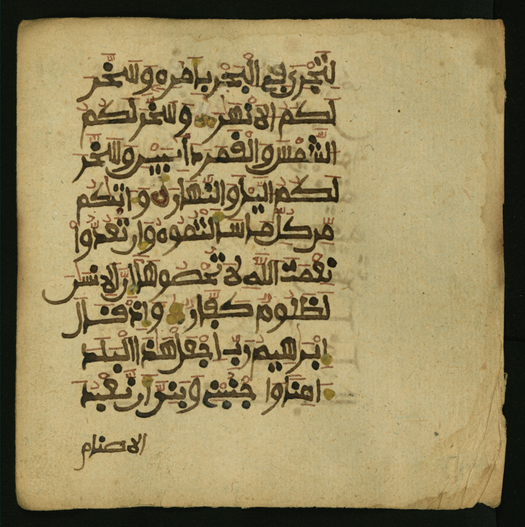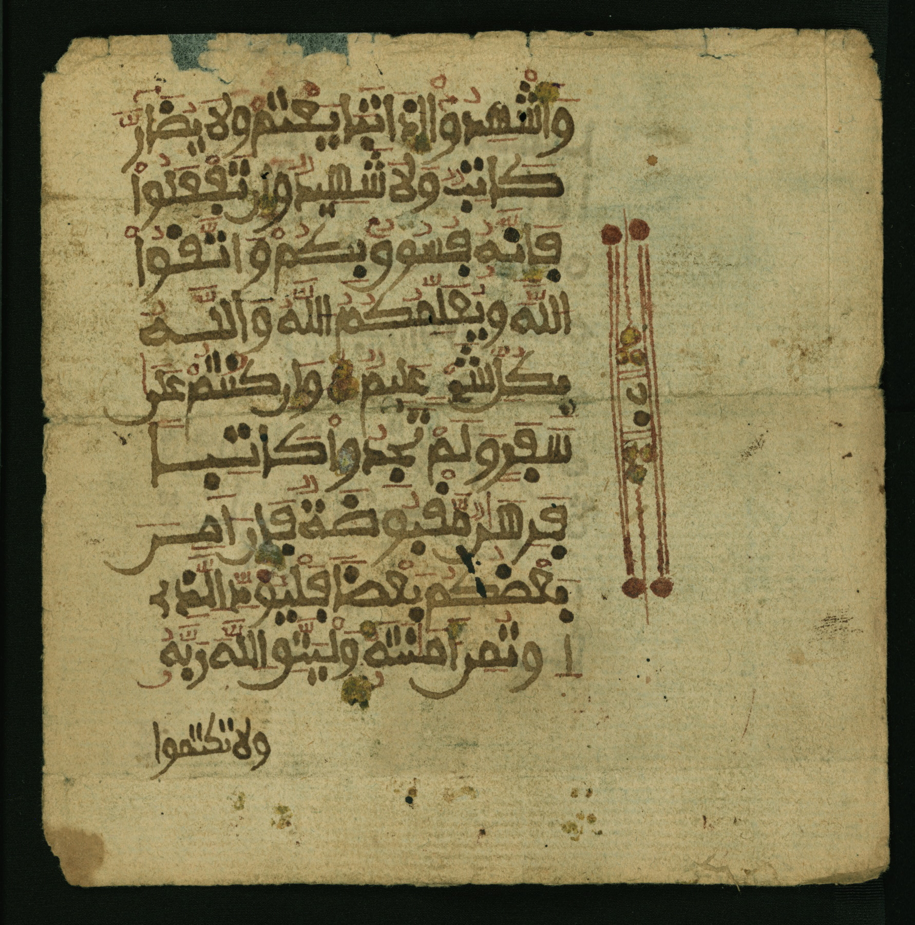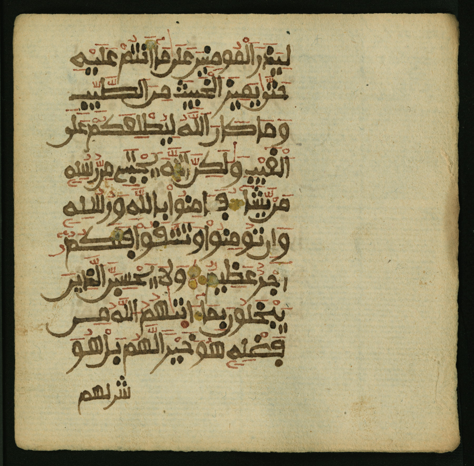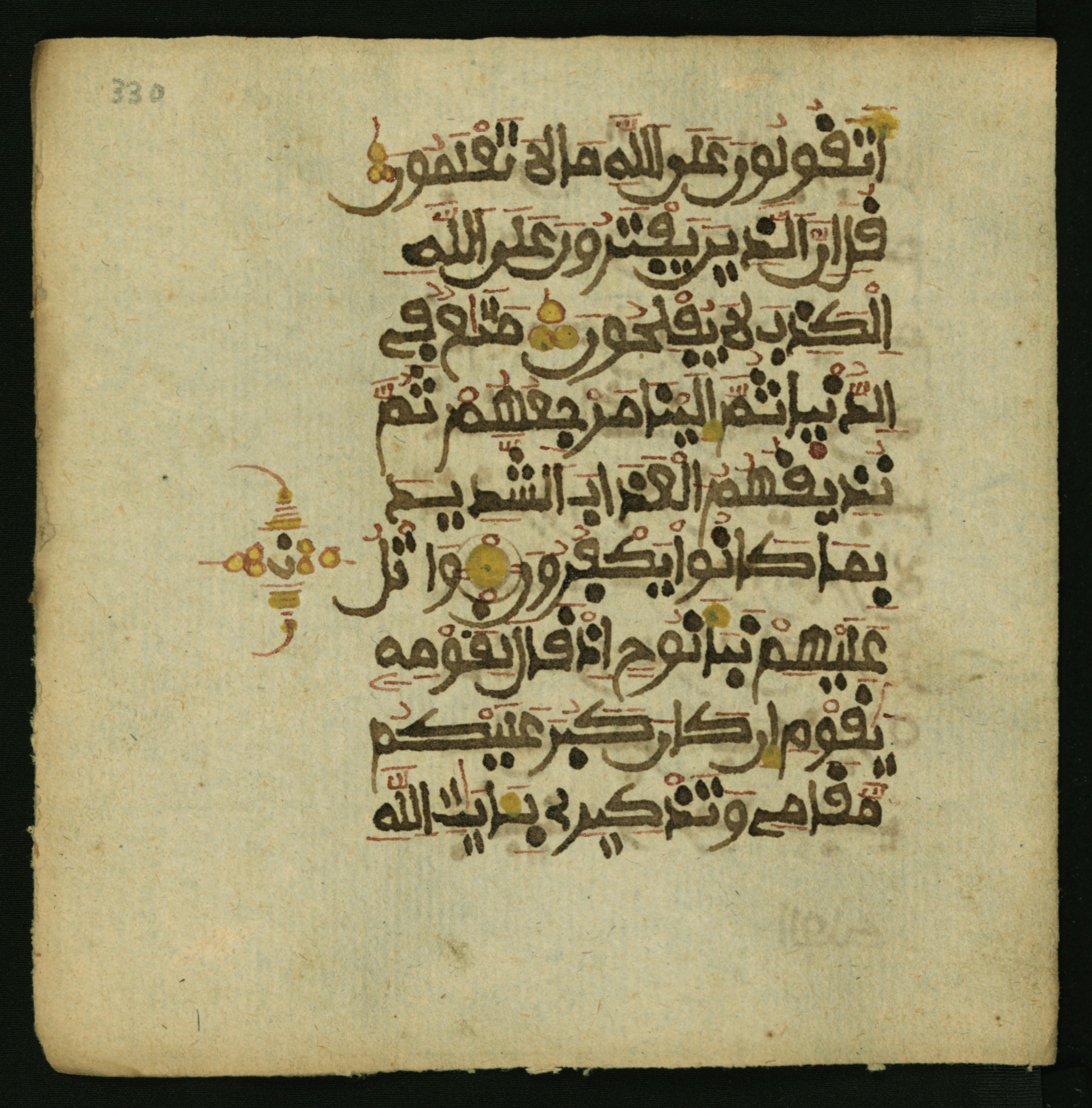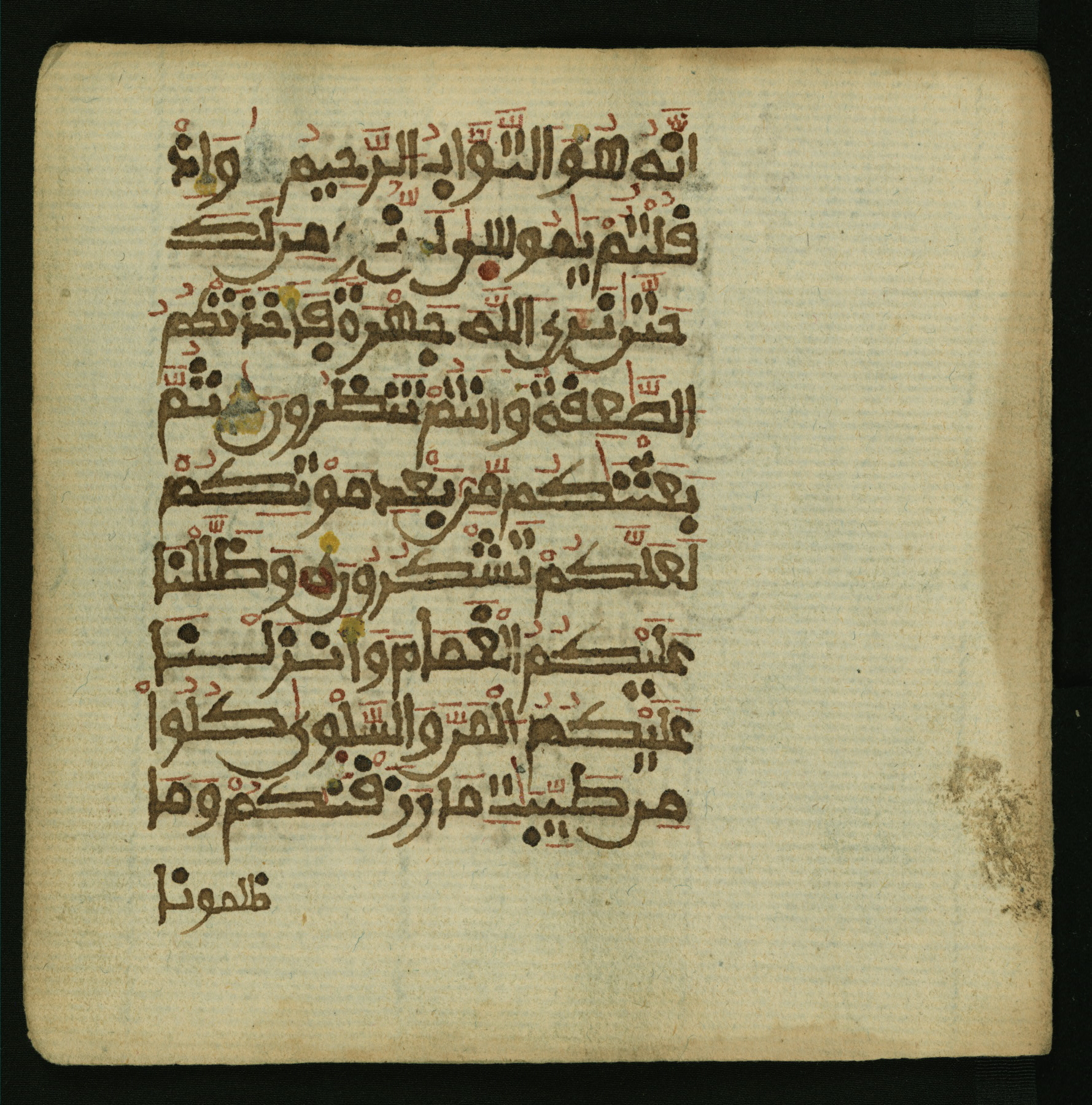 This square-format manuscript is volume 1, containing chapters 1-18 (Sūrat al-fātiḥah through Sūrat al-kahf), of an illuminated two-volume Qur'an produced in Sub-Saharan (West) Africa in the thirteenth century AH / nineteenth CE. The text is written in Sūdānī script in dark brown ink with vocalization in red on loose leaves. Chapter headings are in reddish-brown ink. Three yellow dots outlined in red arranged in a triangular form separate verses. Polychrome circular medallions as well as square and rectangular devices in a variety of patterns and colors mark textual divisions. The leaves of the text are organized between two decorated boards with geometric compositions. The pages and boards are housed in a leather pouch (satchel).