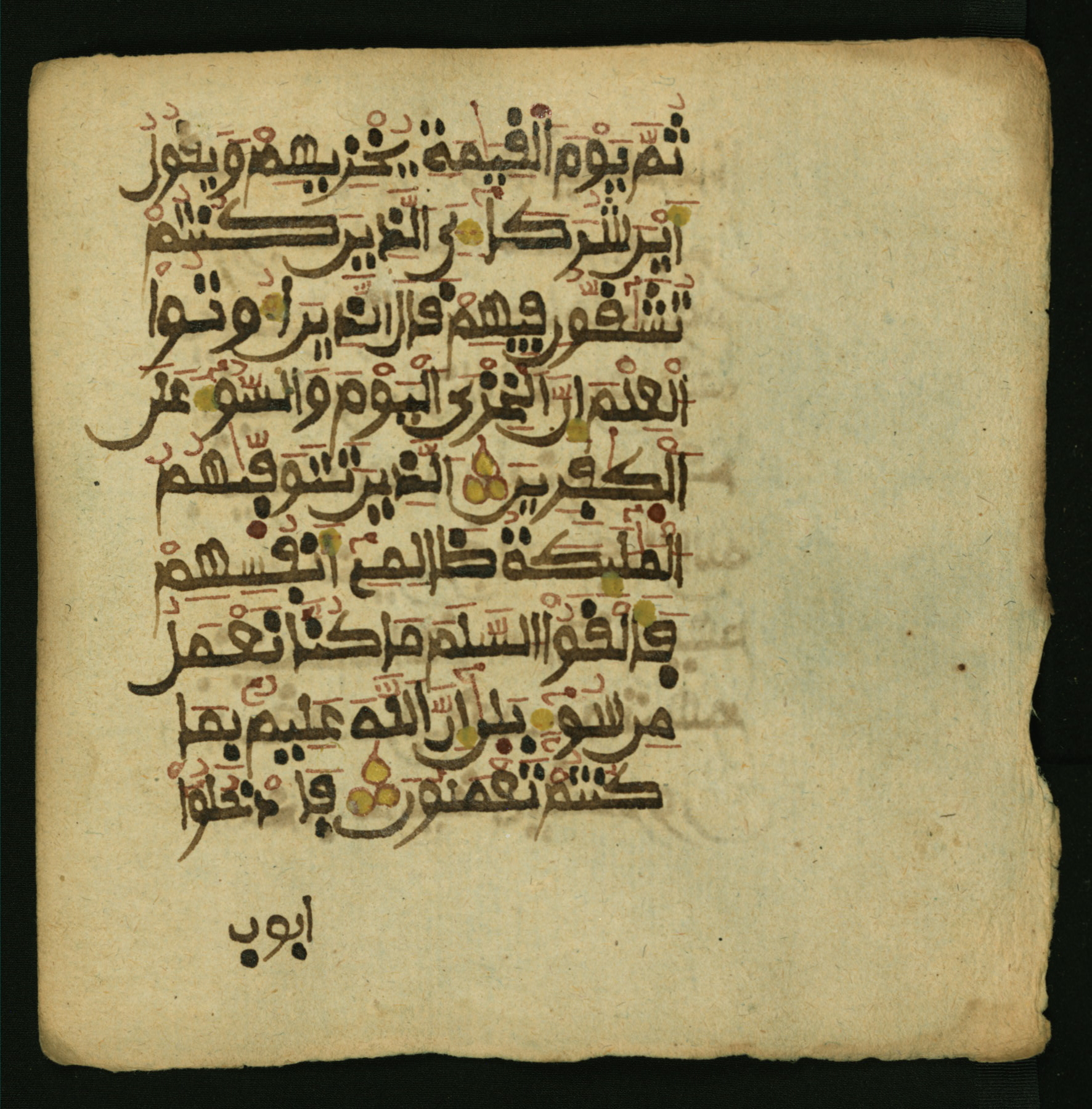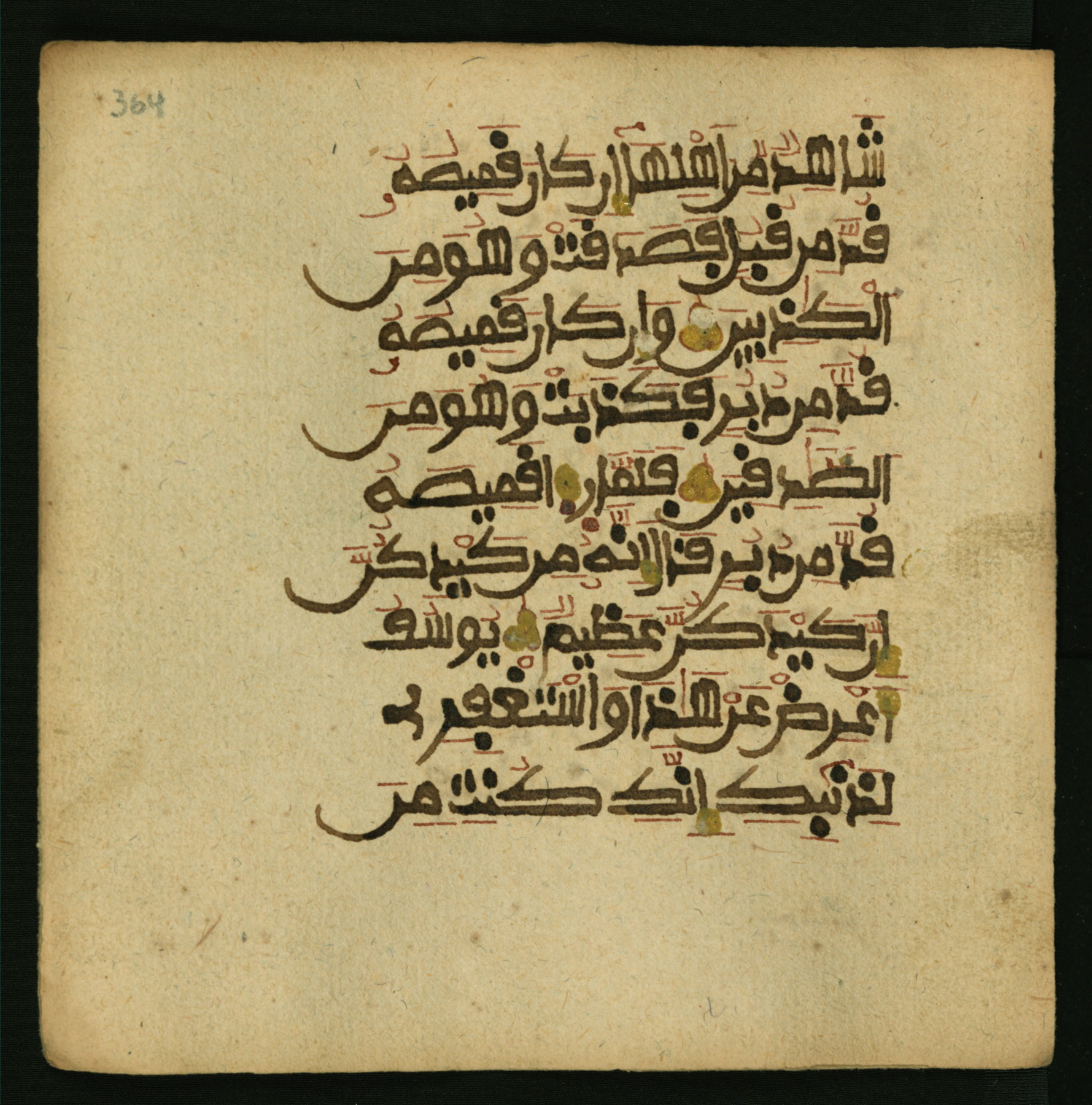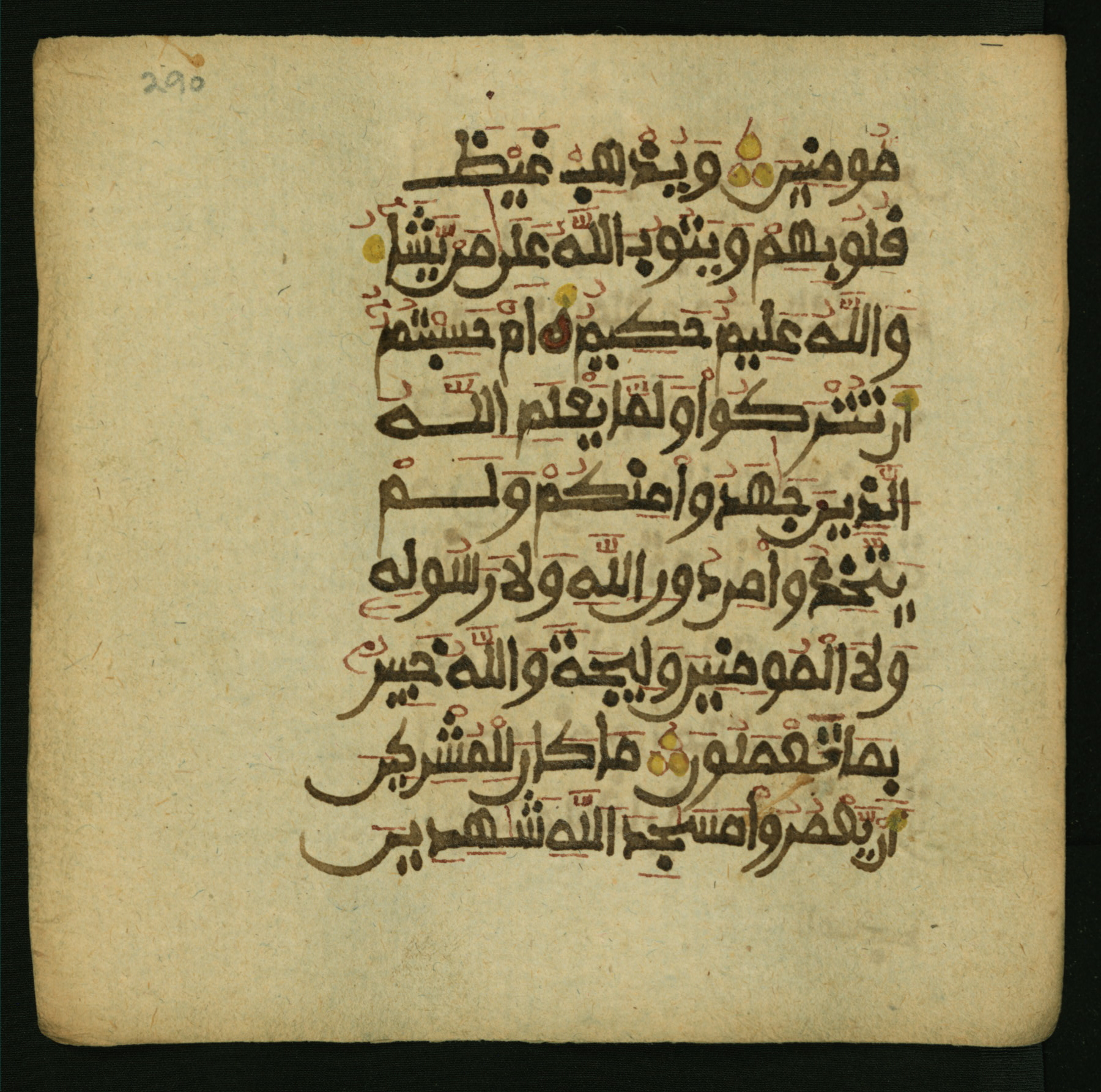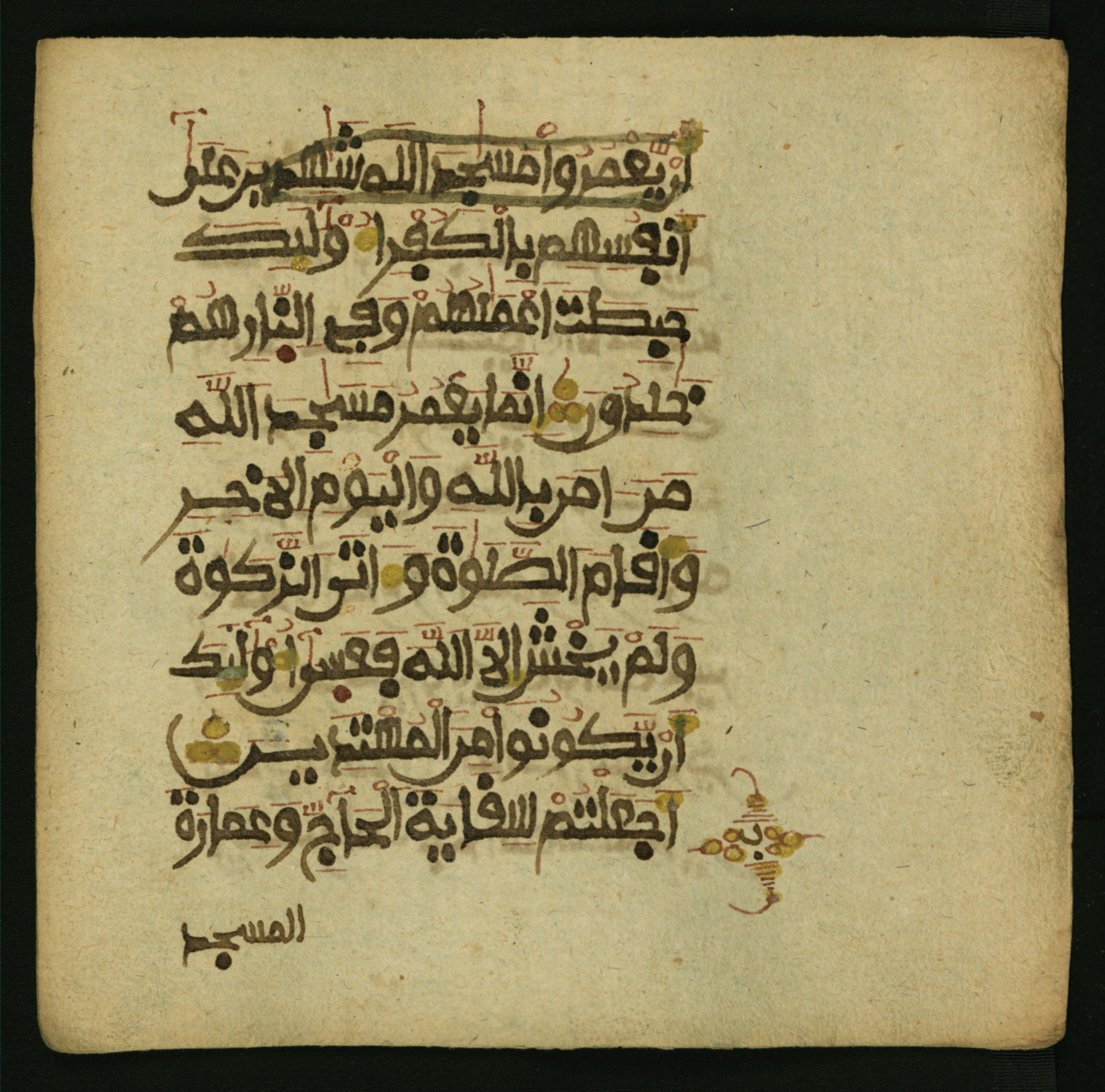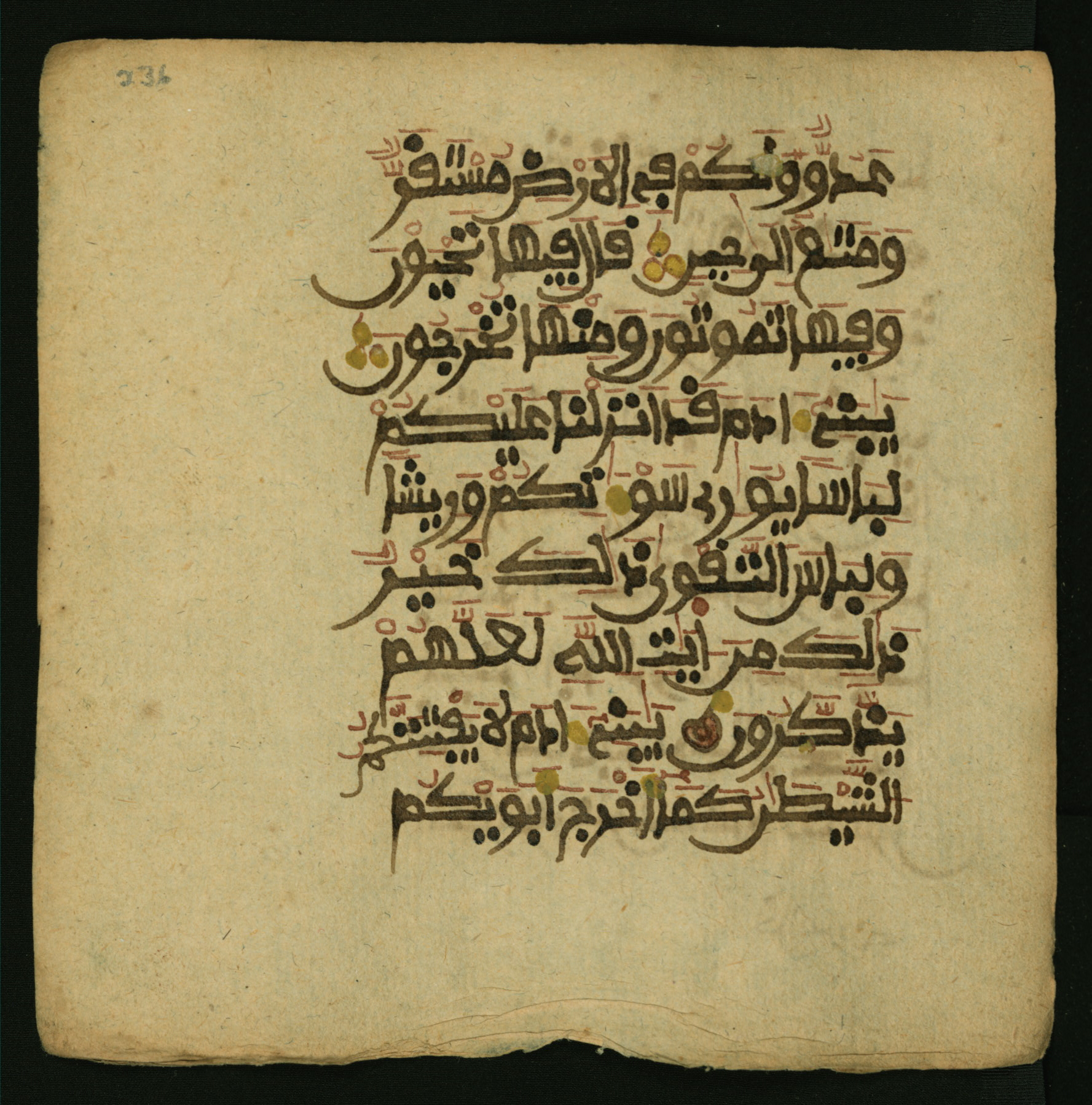 This square-format manuscript is volume 1, containing chapters 1-18 (Sūrat al-fātiḥah through Sūrat al-kahf), of an illuminated two-volume Qur'an produced in Sub-Saharan (West) Africa in the thirteenth century AH / nineteenth CE. The text is written in Sūdānī script in dark brown ink with vocalization in red on loose leaves. Chapter headings are in reddish-brown ink. Three yellow dots outlined in red arranged in a triangular form separate verses. Polychrome circular medallions as well as square and rectangular devices in a variety of patterns and colors mark textual divisions. The leaves of the text are organized between two decorated boards with geometric compositions. The pages and boards are housed in a leather pouch (satchel).