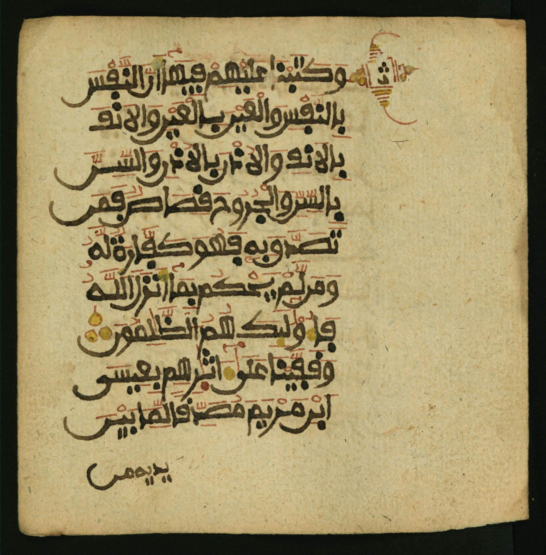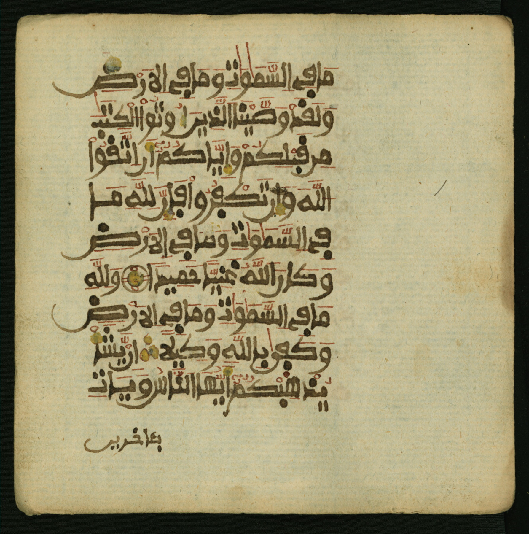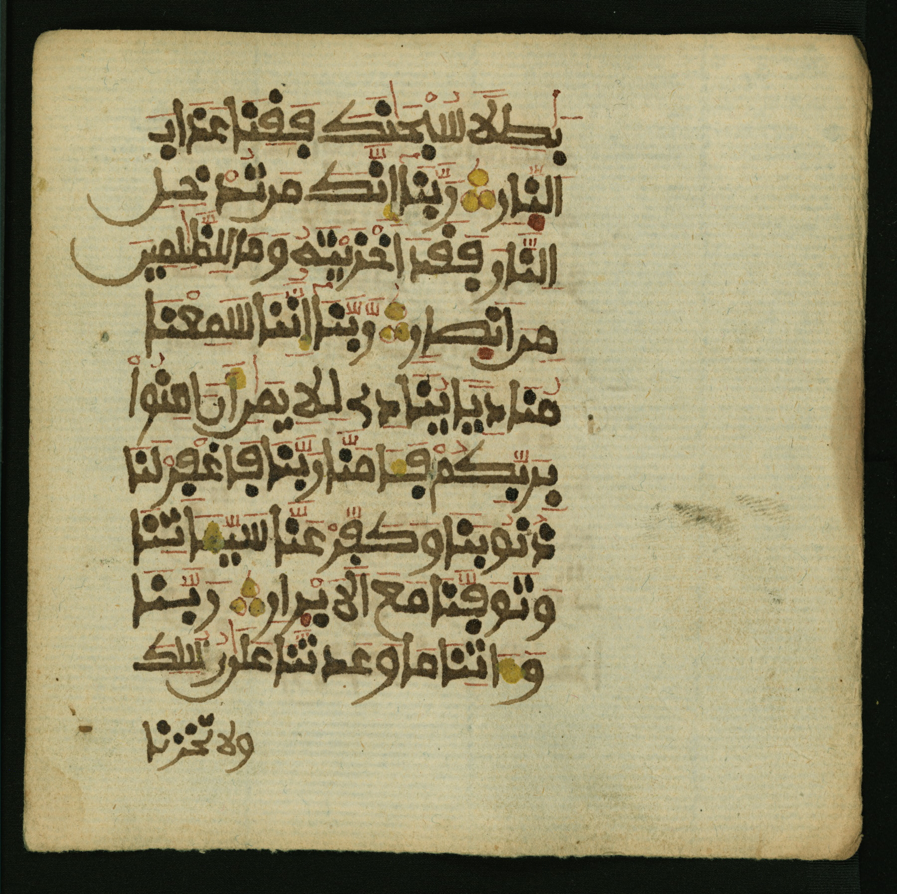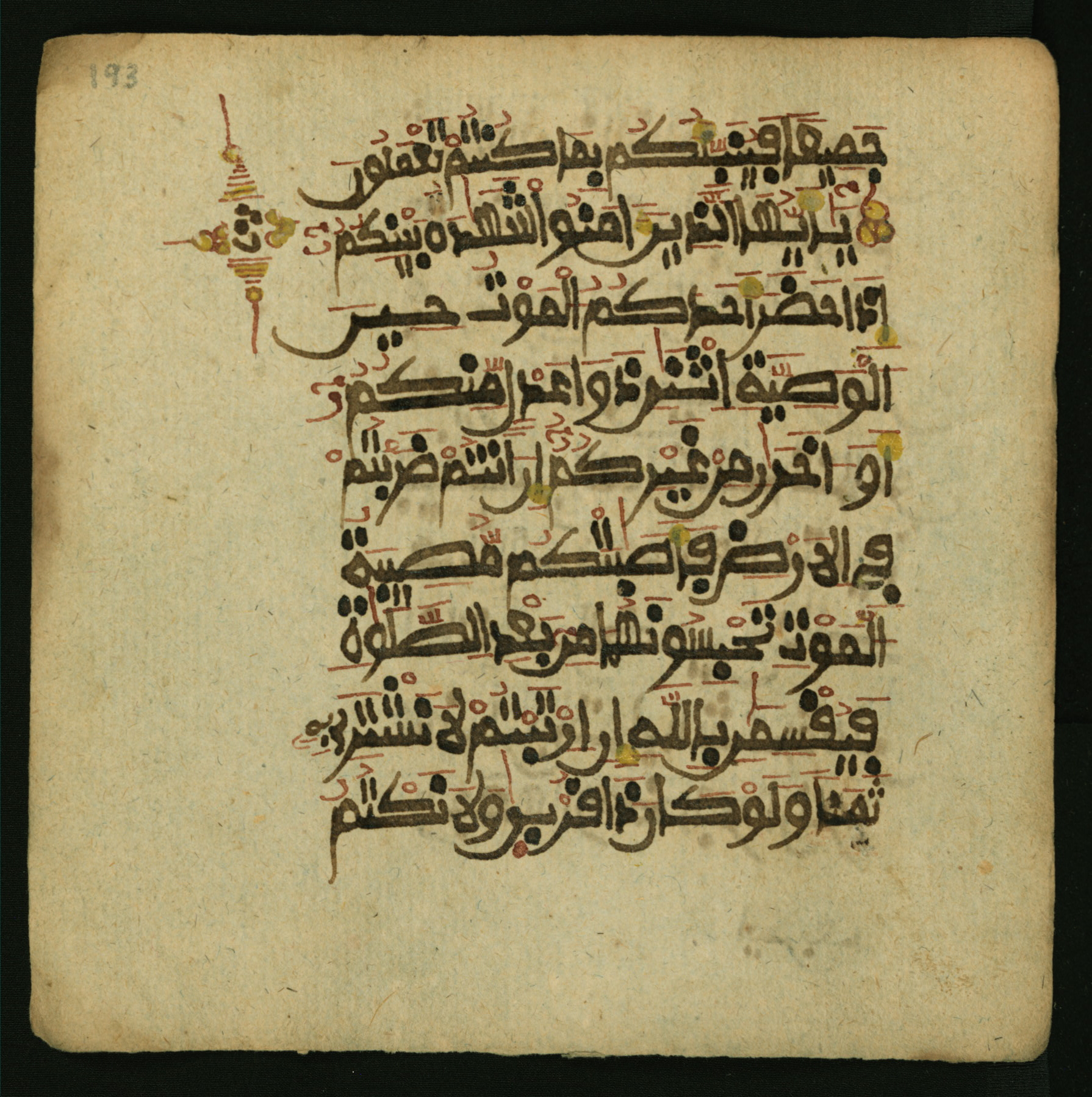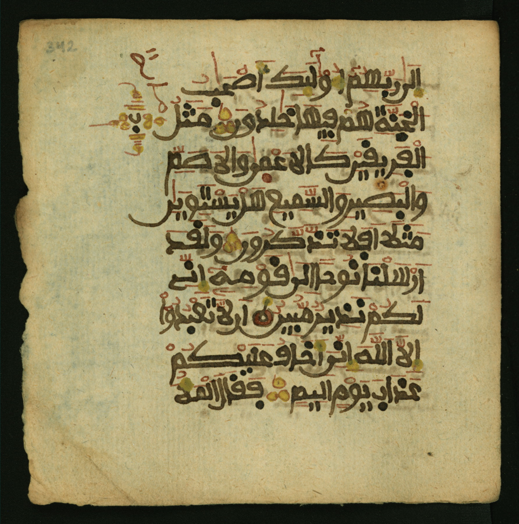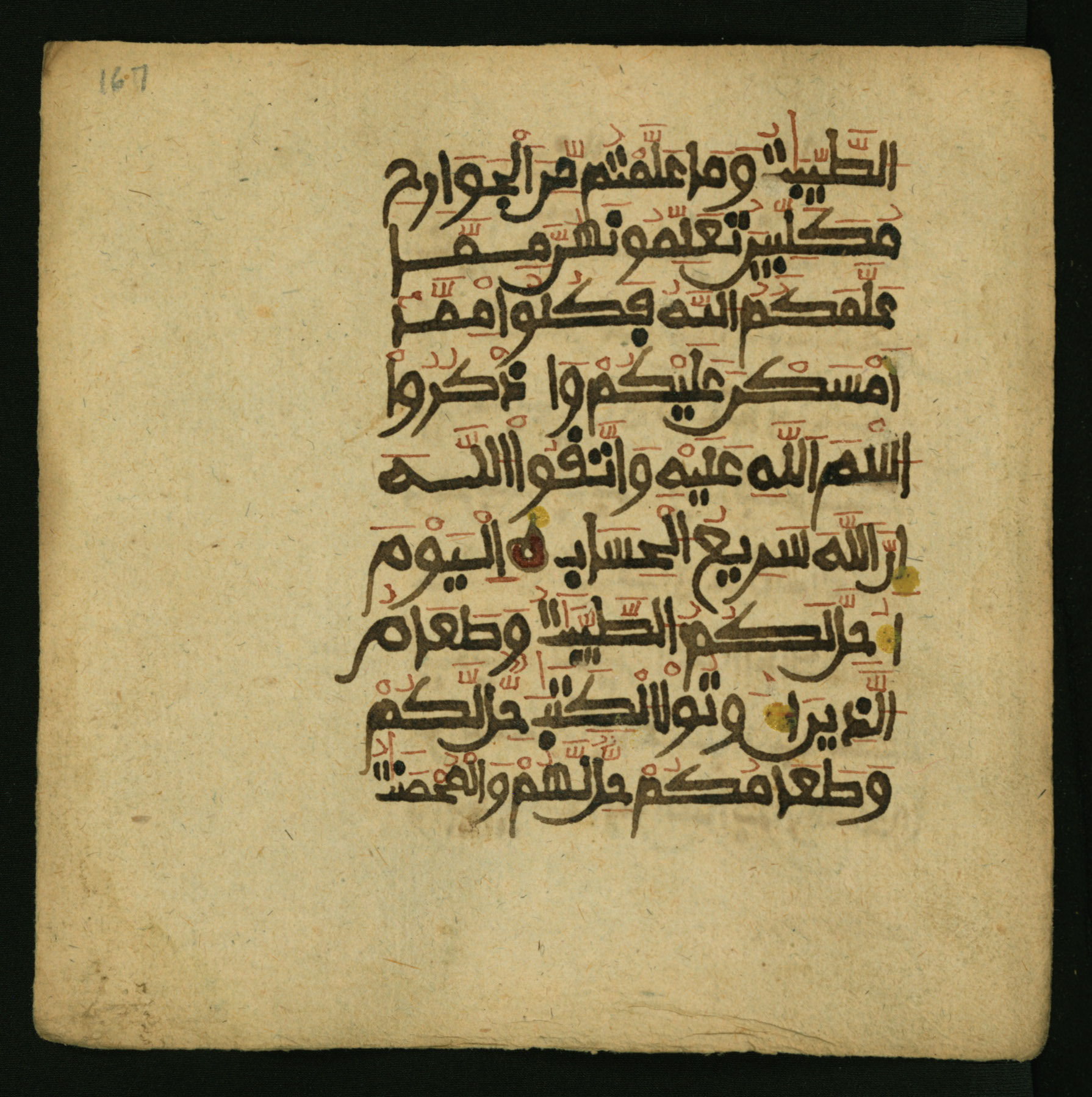 This square-format manuscript is volume 1, containing chapters 1-18 (Sūrat al-fātiḥah through Sūrat al-kahf), of an illuminated two-volume Qur'an produced in Sub-Saharan (West) Africa in the thirteenth century AH / nineteenth CE. The text is written in Sūdānī script in dark brown ink with vocalization in red on loose leaves. Chapter headings are in reddish-brown ink. Three yellow dots outlined in red arranged in a triangular form separate verses. Polychrome circular medallions as well as square and rectangular devices in a variety of patterns and colors mark textual divisions. The leaves of the text are organized between two decorated boards with geometric compositions. The pages and boards are housed in a leather pouch (satchel).