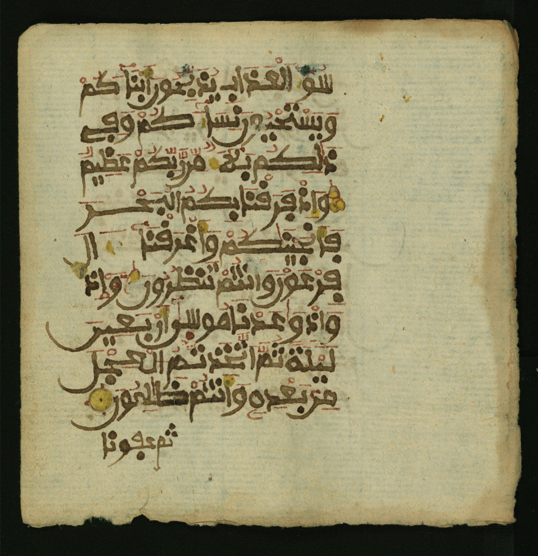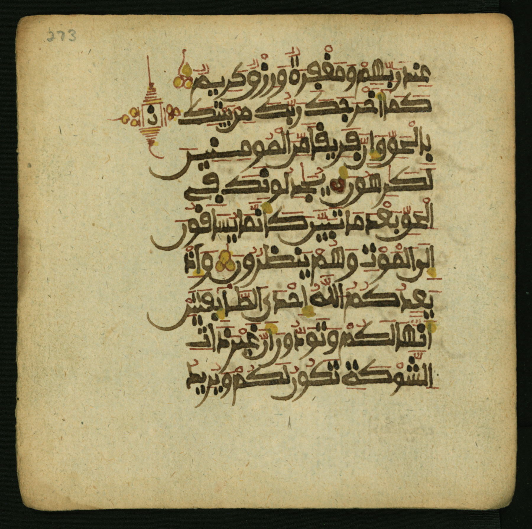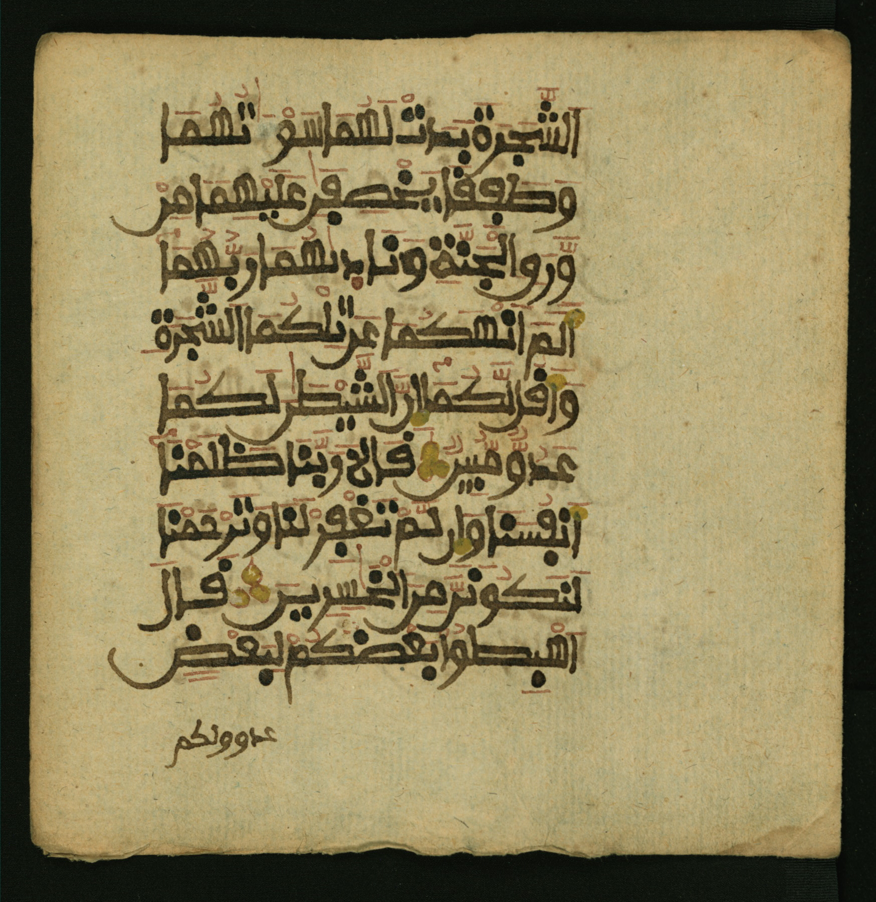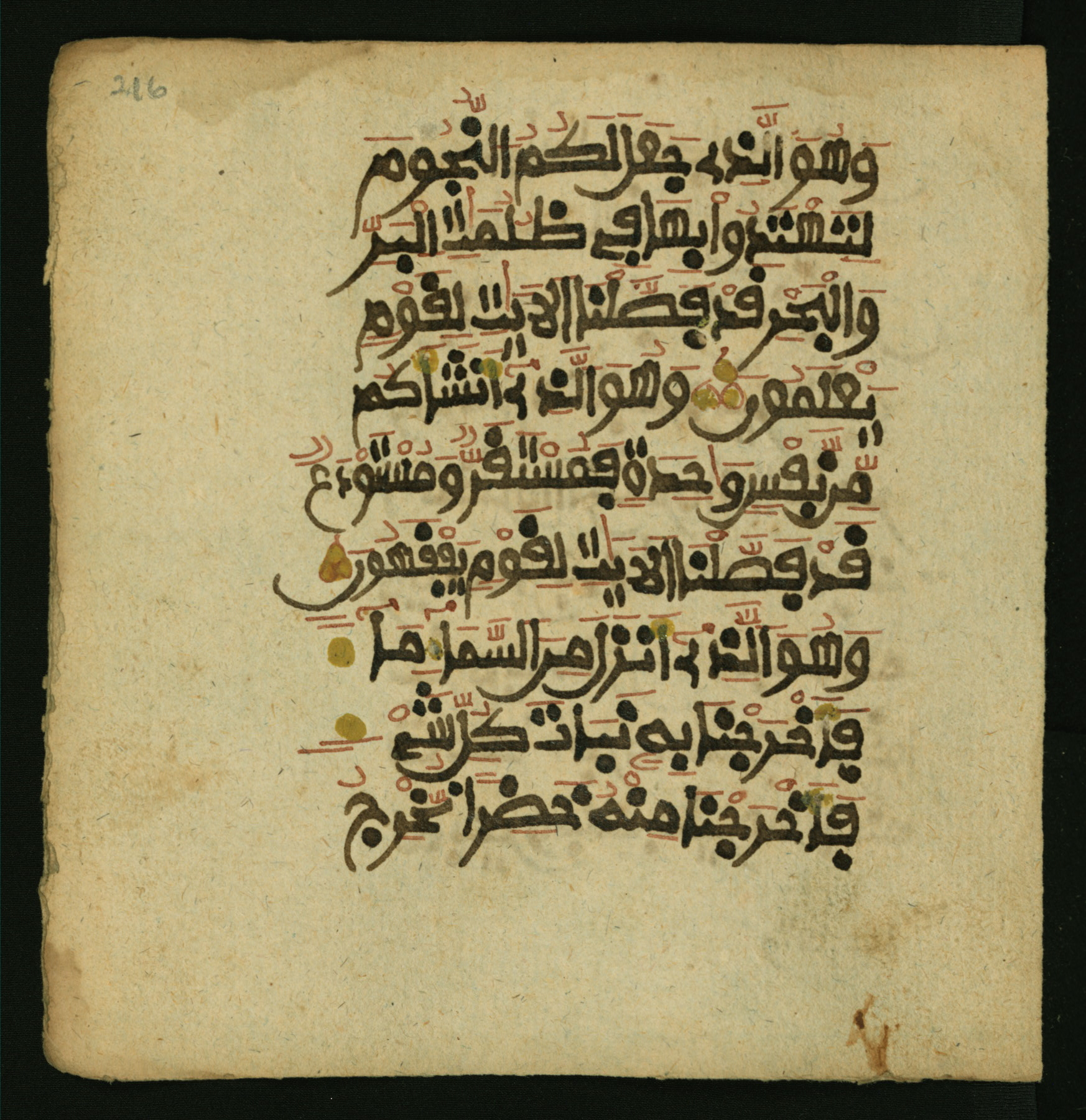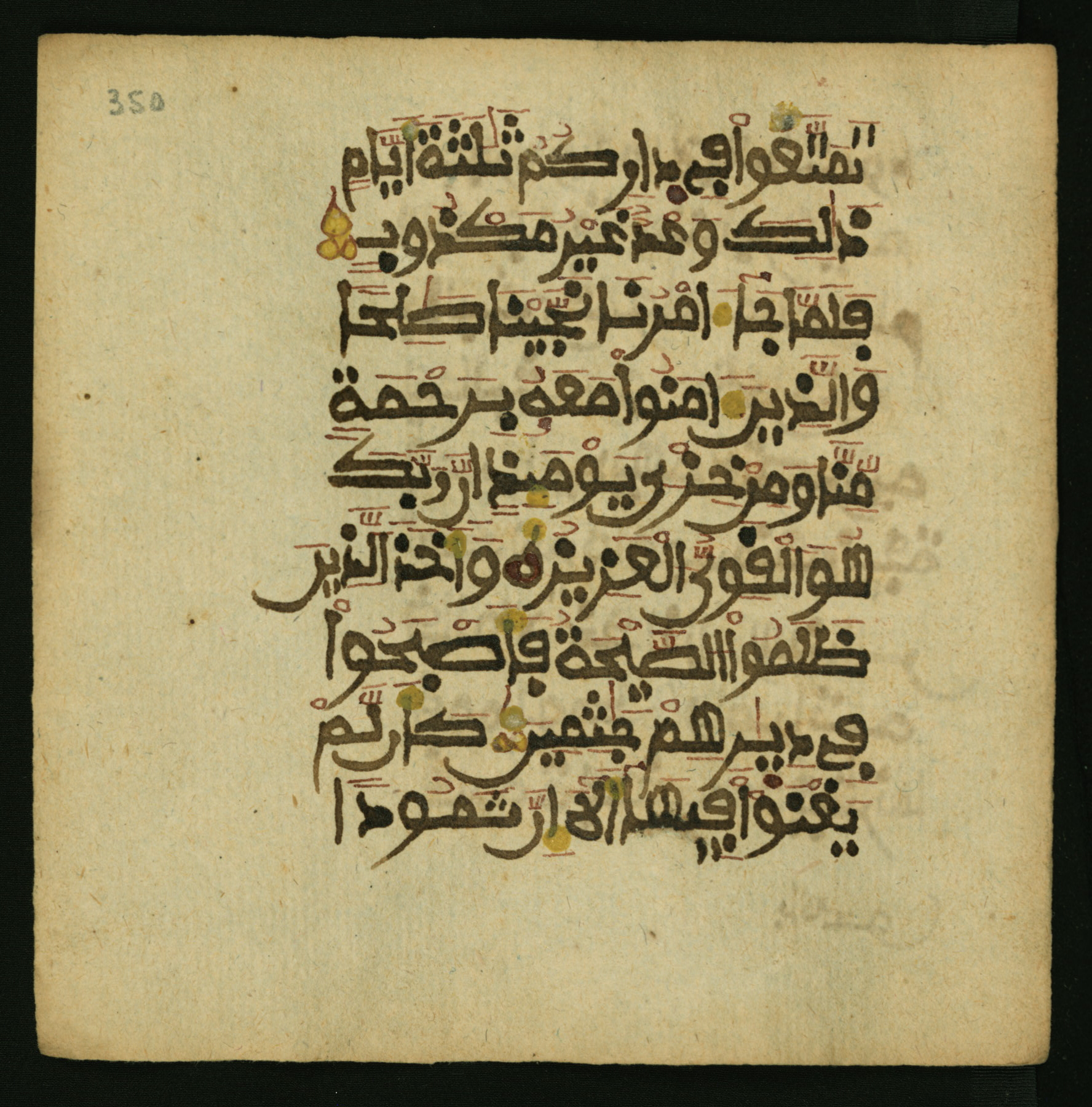 This square-format manuscript is volume 1, containing chapters 1-18 (Sūrat al-fātiḥah through Sūrat al-kahf), of an illuminated two-volume Qur'an produced in Sub-Saharan (West) Africa in the thirteenth century AH / nineteenth CE. The text is written in Sūdānī script in dark brown ink with vocalization in red on loose leaves. Chapter headings are in reddish-brown ink. Three yellow dots outlined in red arranged in a triangular form separate verses. Polychrome circular medallions as well as square and rectangular devices in a variety of patterns and colors mark textual divisions. The leaves of the text are organized between two decorated boards with geometric compositions. The pages and boards are housed in a leather pouch (satchel).