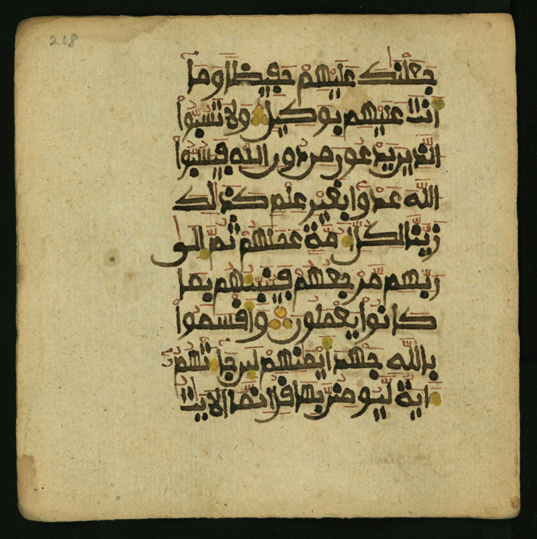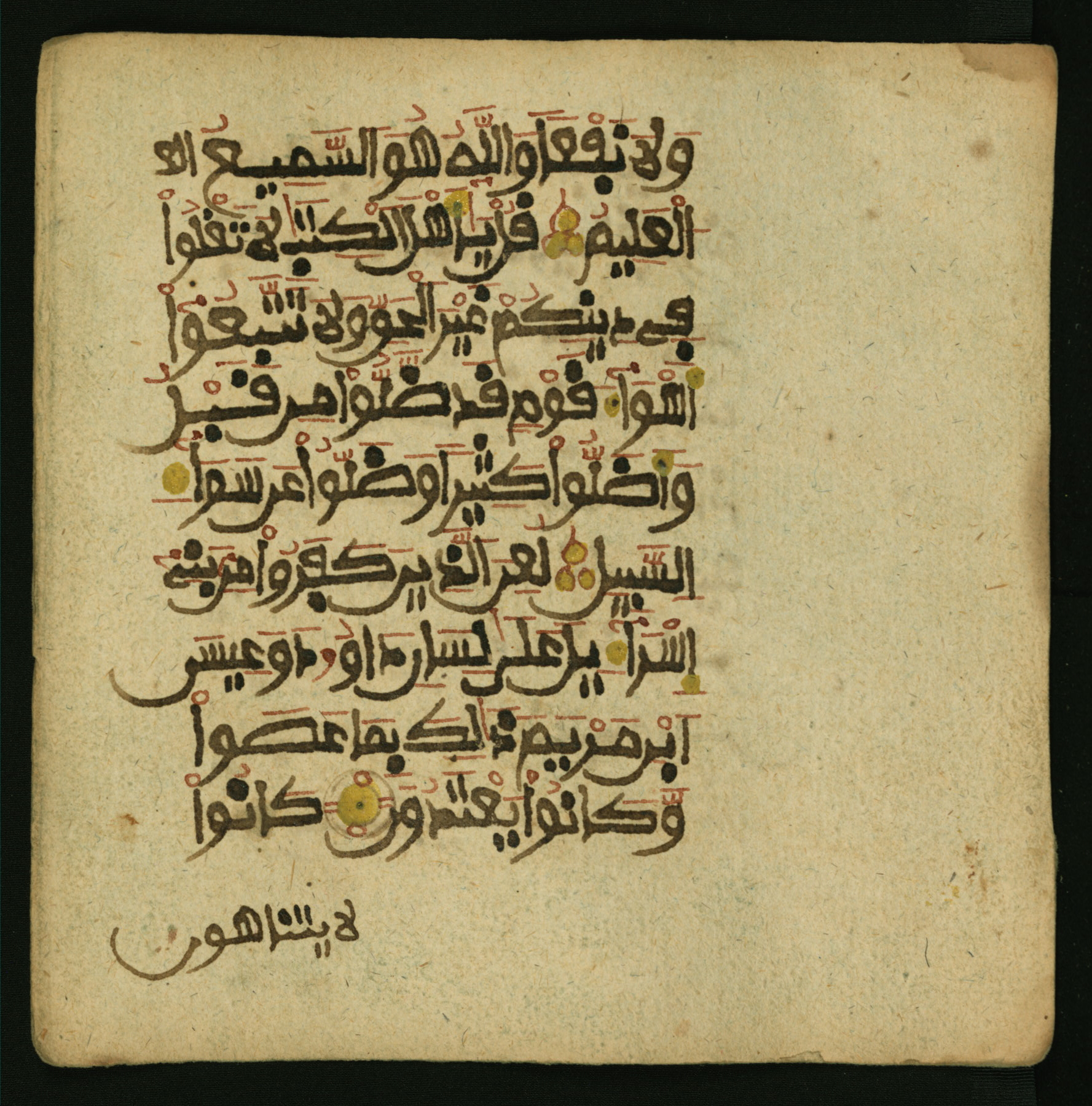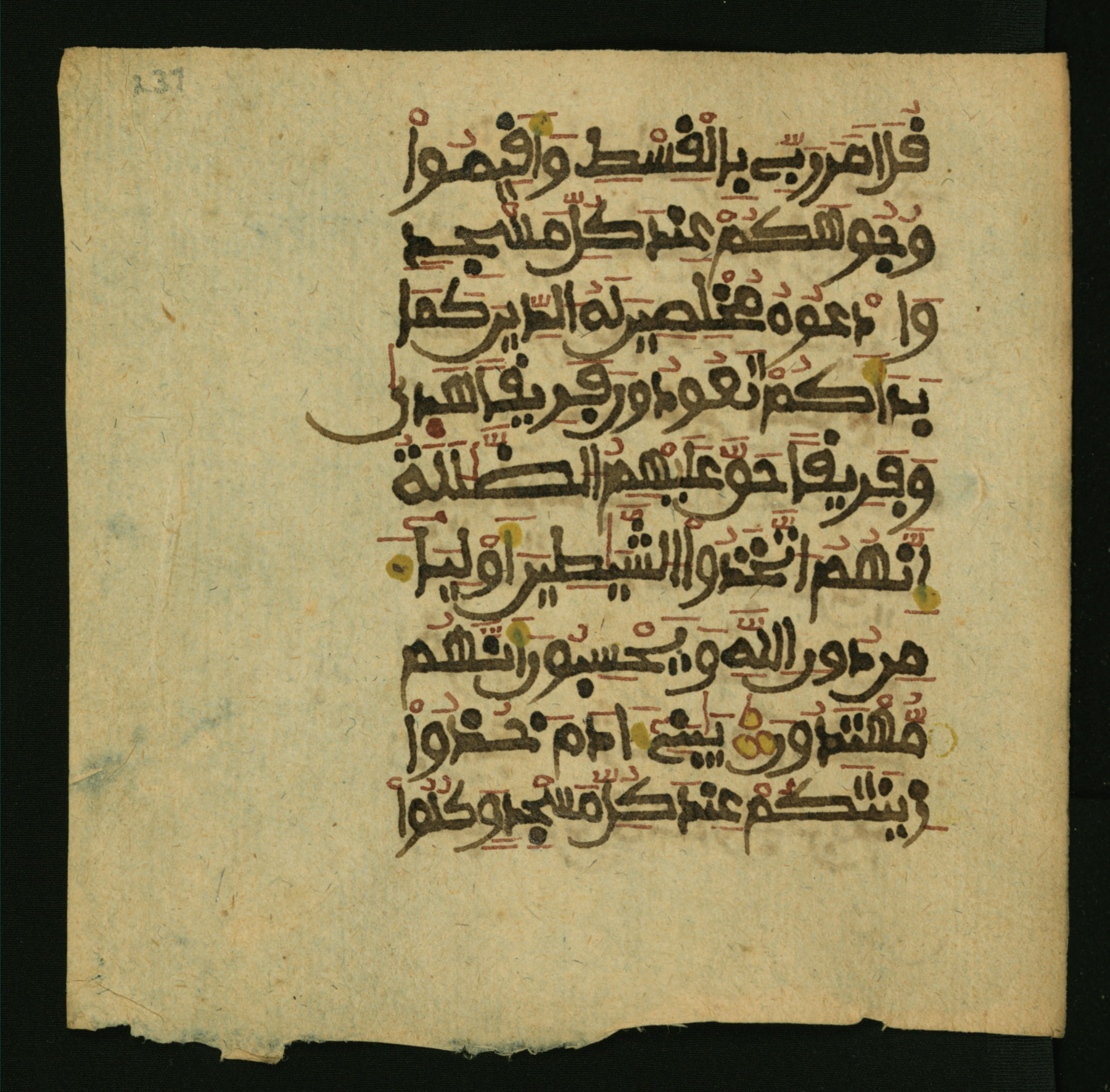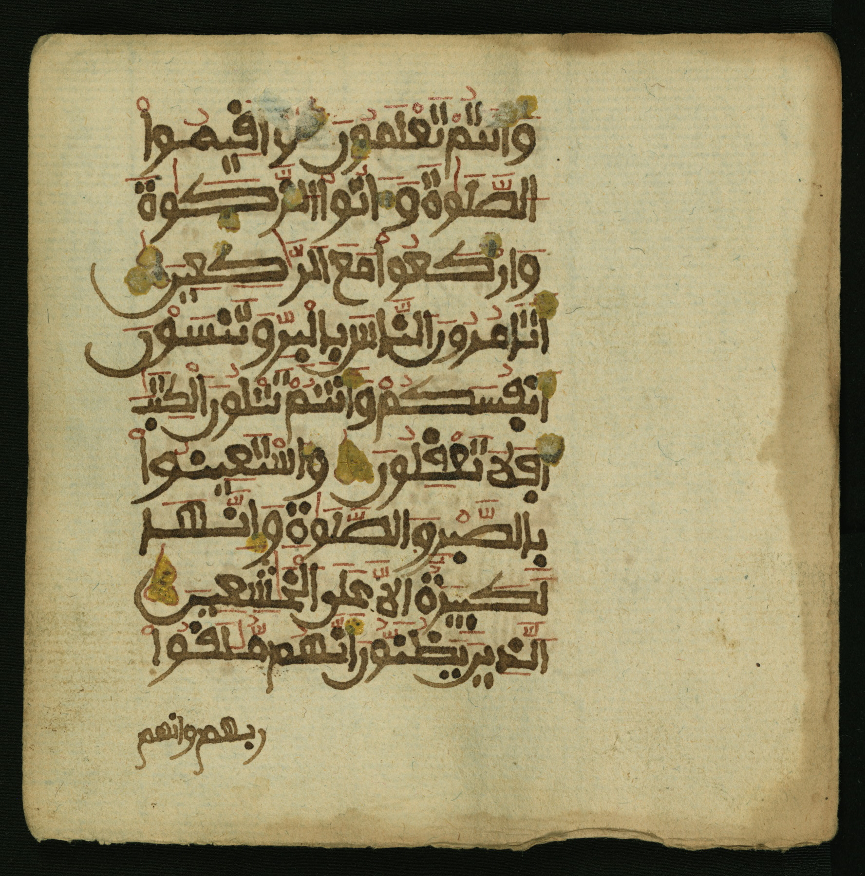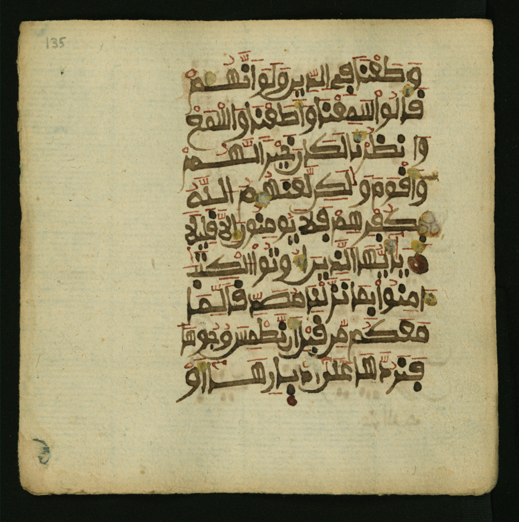 This square-format manuscript is volume 1, containing chapters 1-18 (Sūrat al-fātiḥah through Sūrat al-kahf), of an illuminated two-volume Qur'an produced in Sub-Saharan (West) Africa in the thirteenth century AH / nineteenth CE. The text is written in Sūdānī script in dark brown ink with vocalization in red on loose leaves. Chapter headings are in reddish-brown ink. Three yellow dots outlined in red arranged in a triangular form separate verses. Polychrome circular medallions as well as square and rectangular devices in a variety of patterns and colors mark textual divisions. The leaves of the text are organized between two decorated boards with geometric compositions. The pages and boards are housed in a leather pouch (satchel).
