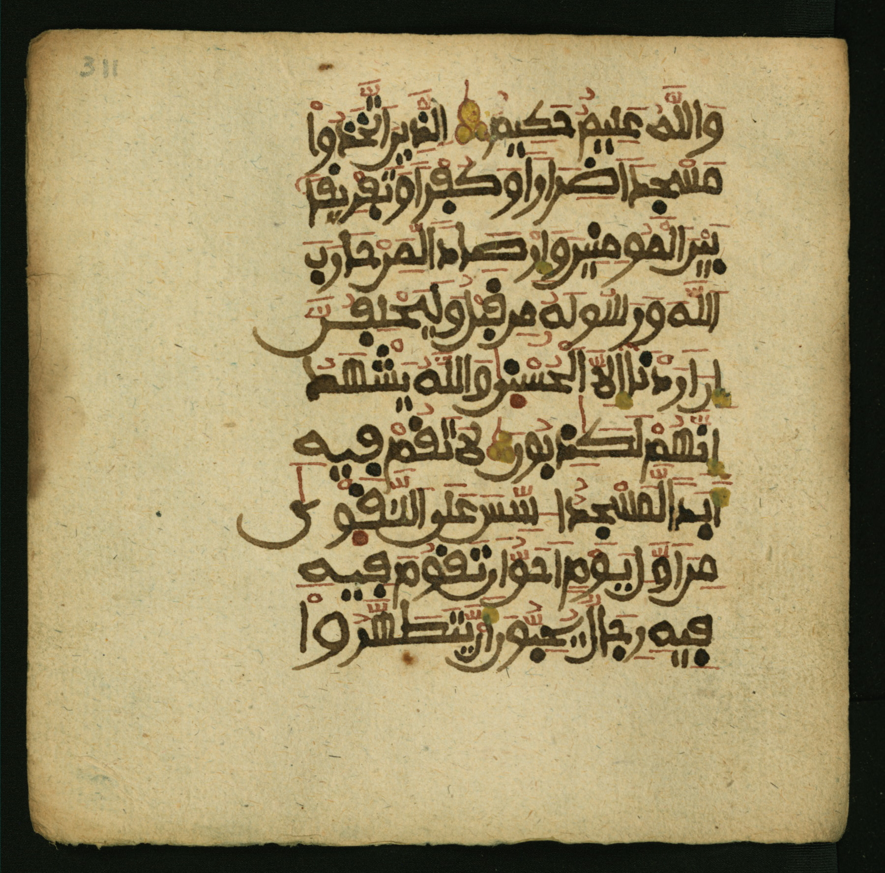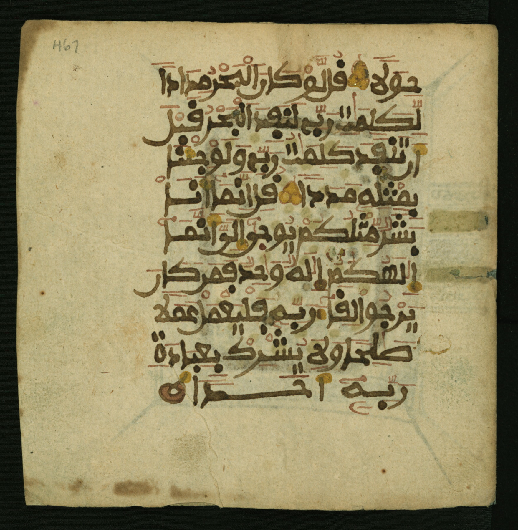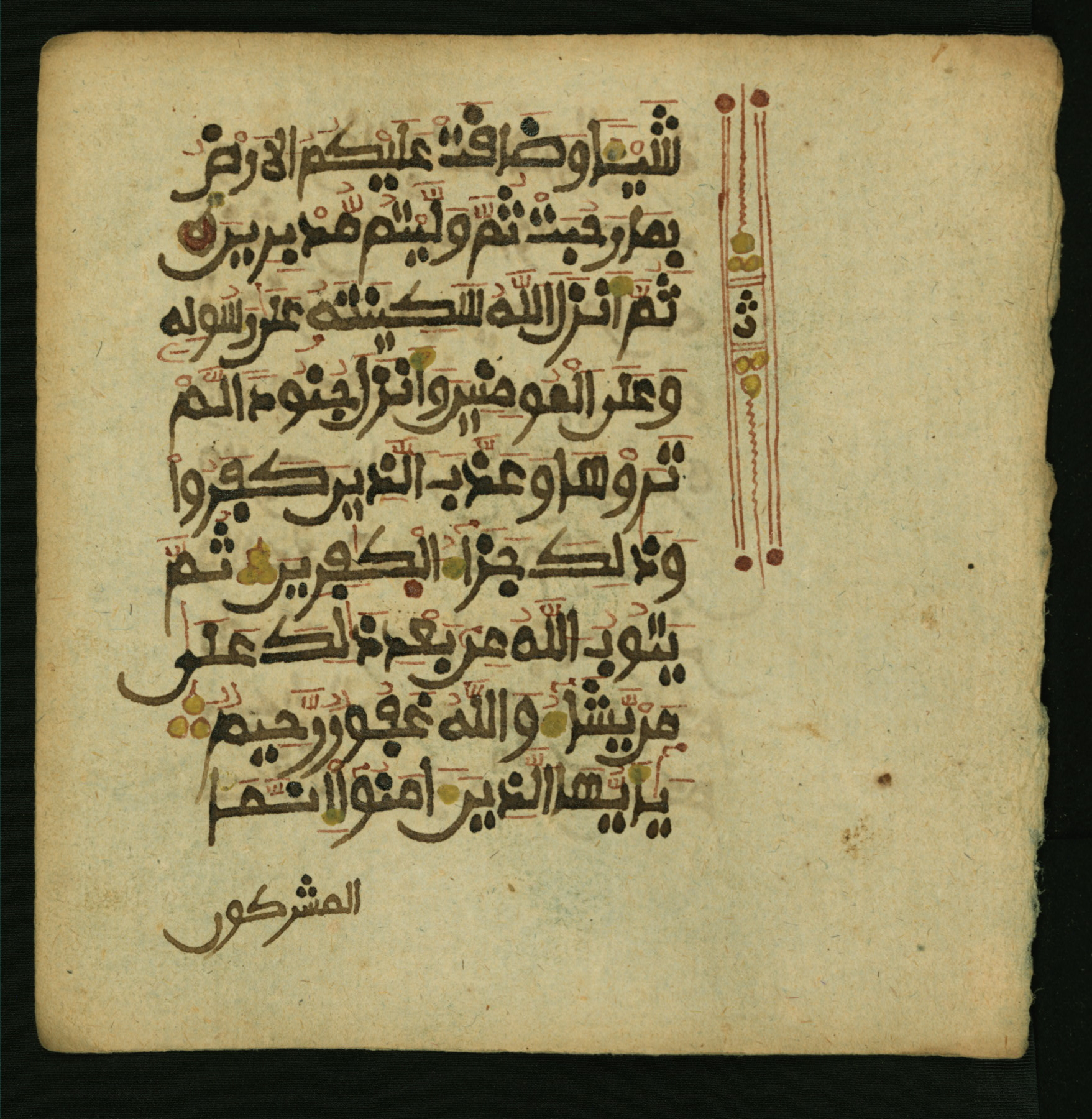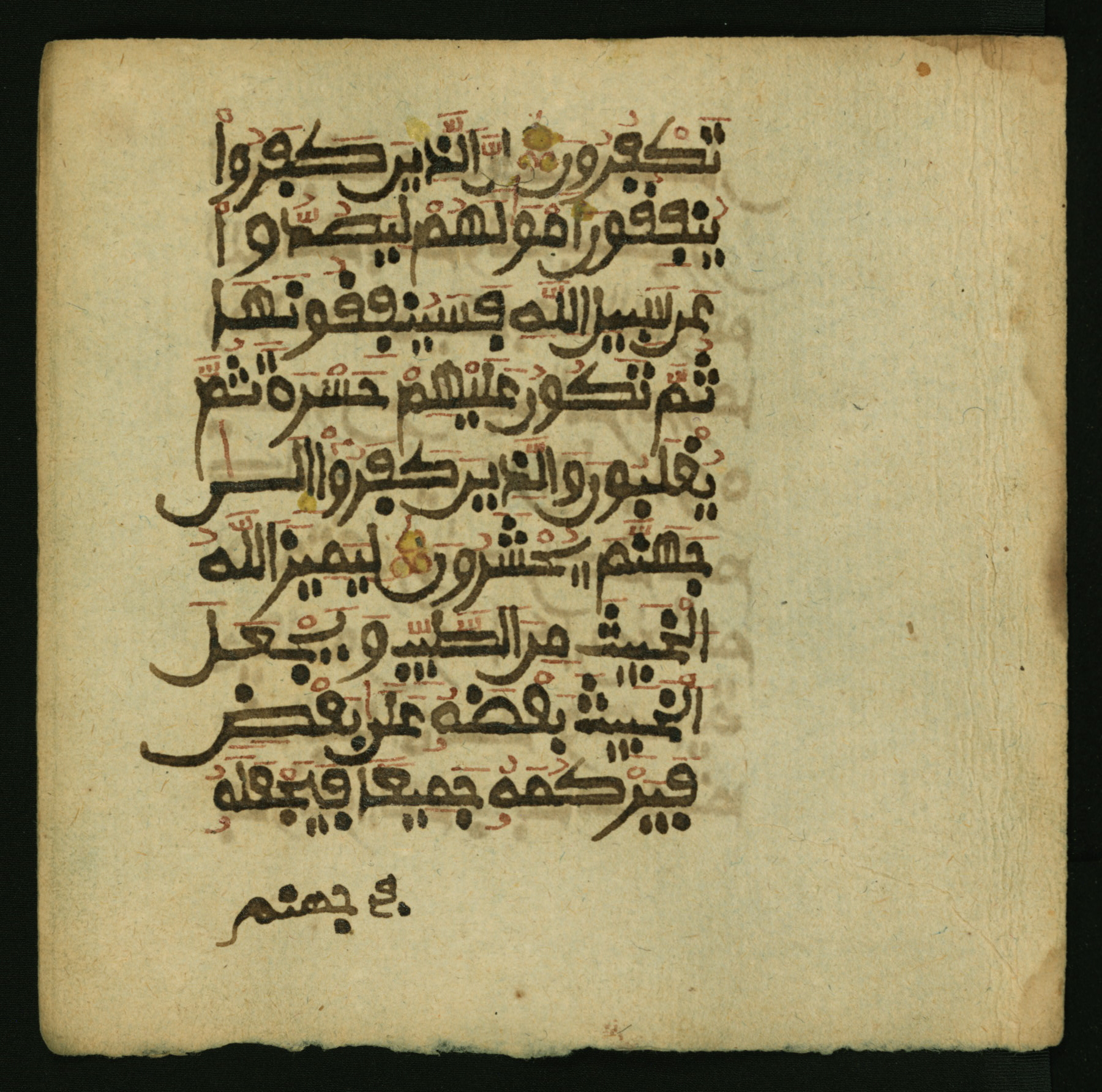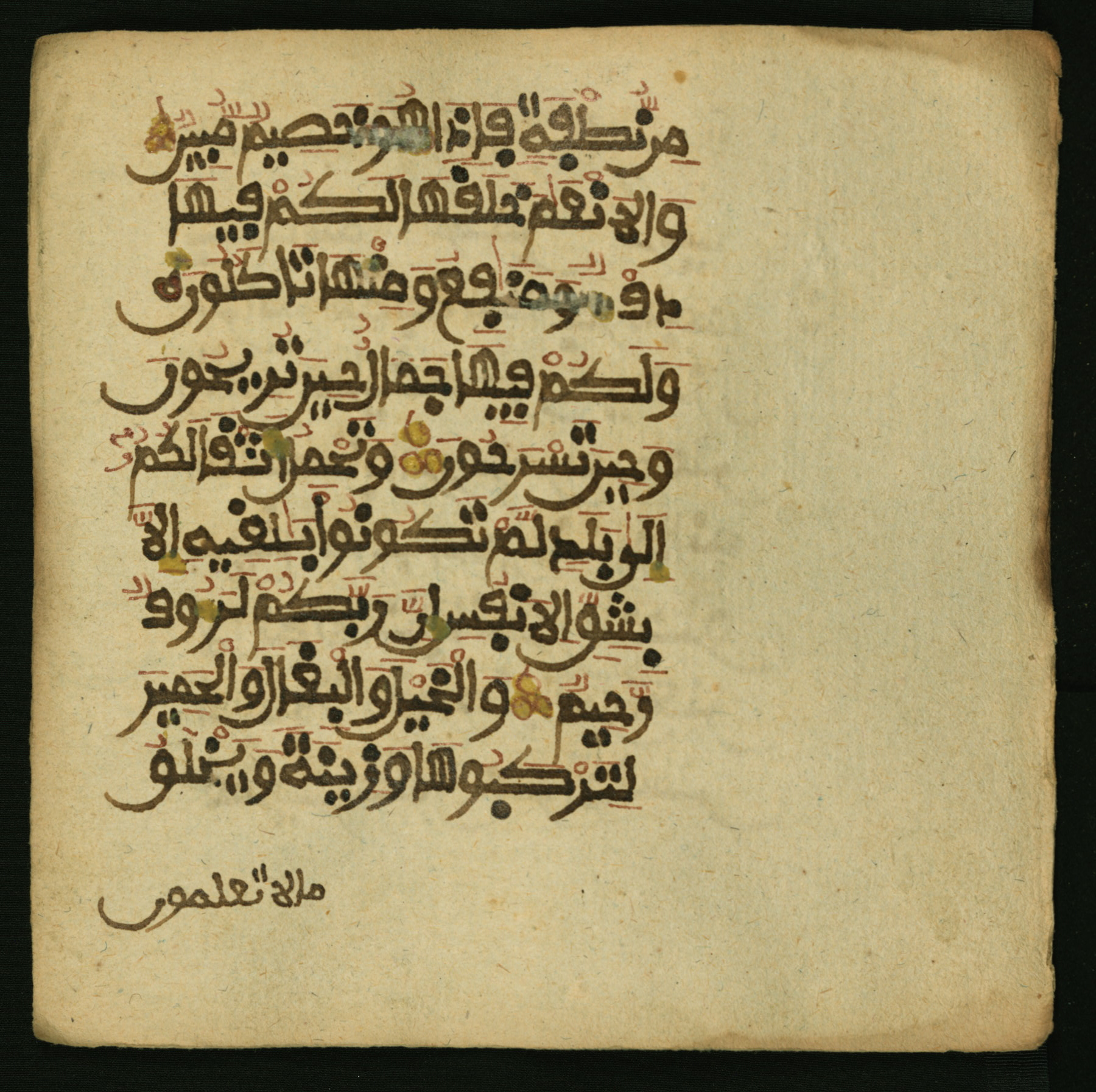 This square-format manuscript is volume 1, containing chapters 1-18 (Sūrat al-fātiḥah through Sūrat al-kahf), of an illuminated two-volume Qur'an produced in Sub-Saharan (West) Africa in the thirteenth century AH / nineteenth CE. The text is written in Sūdānī script in dark brown ink with vocalization in red on loose leaves. Chapter headings are in reddish-brown ink. Three yellow dots outlined in red arranged in a triangular form separate verses. Polychrome circular medallions as well as square and rectangular devices in a variety of patterns and colors mark textual divisions. The leaves of the text are organized between two decorated boards with geometric compositions. The pages and boards are housed in a leather pouch (satchel).