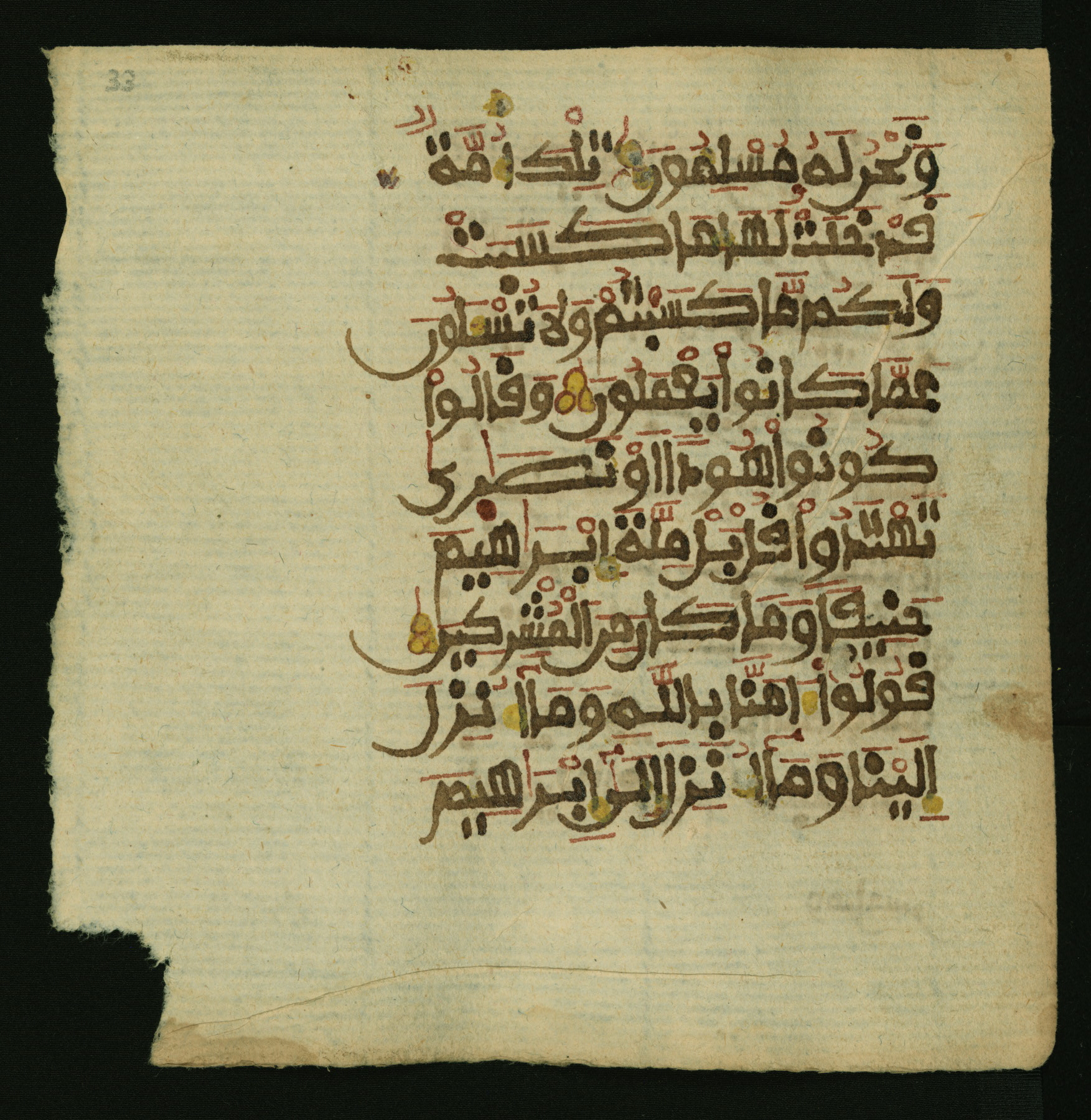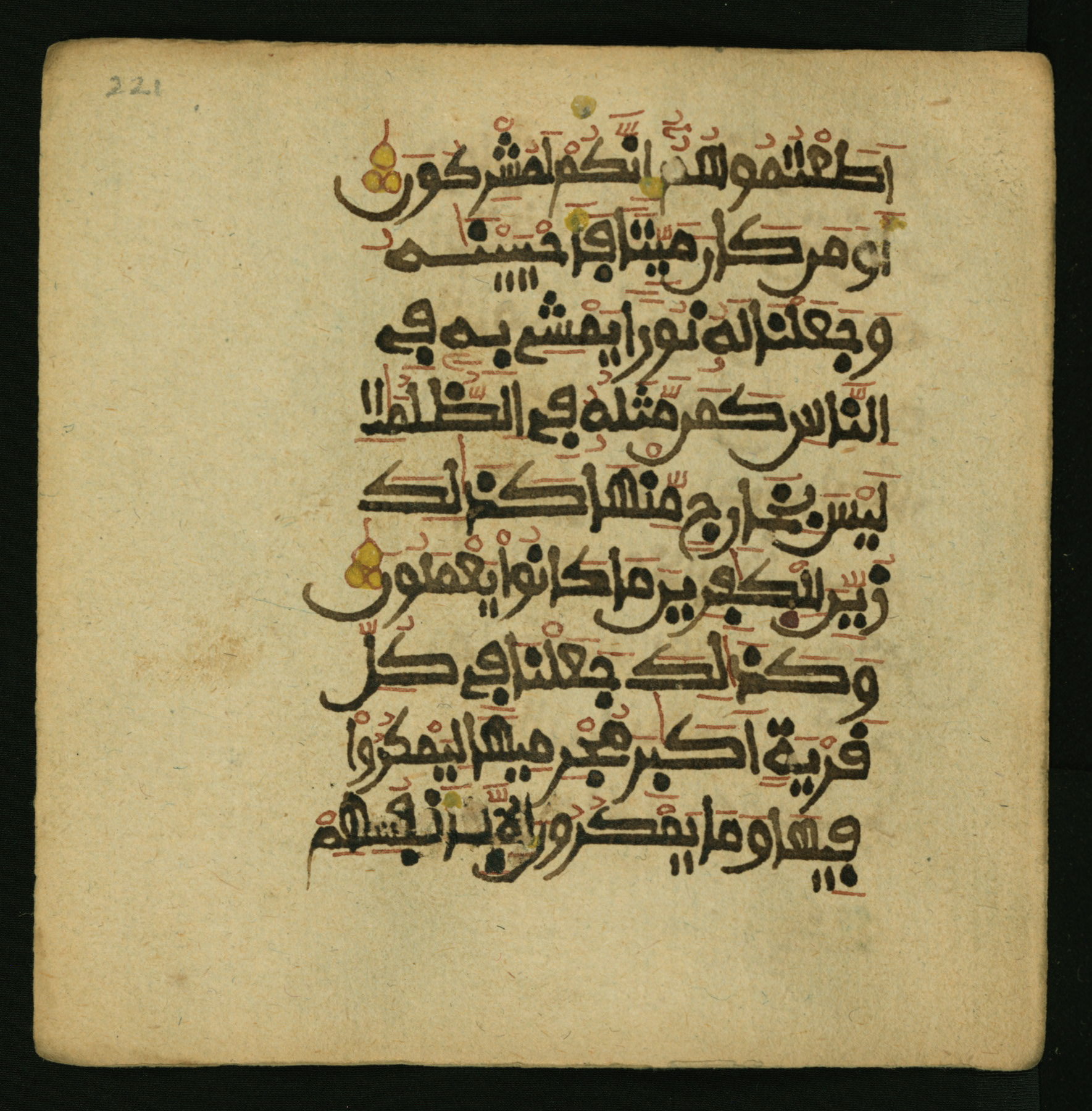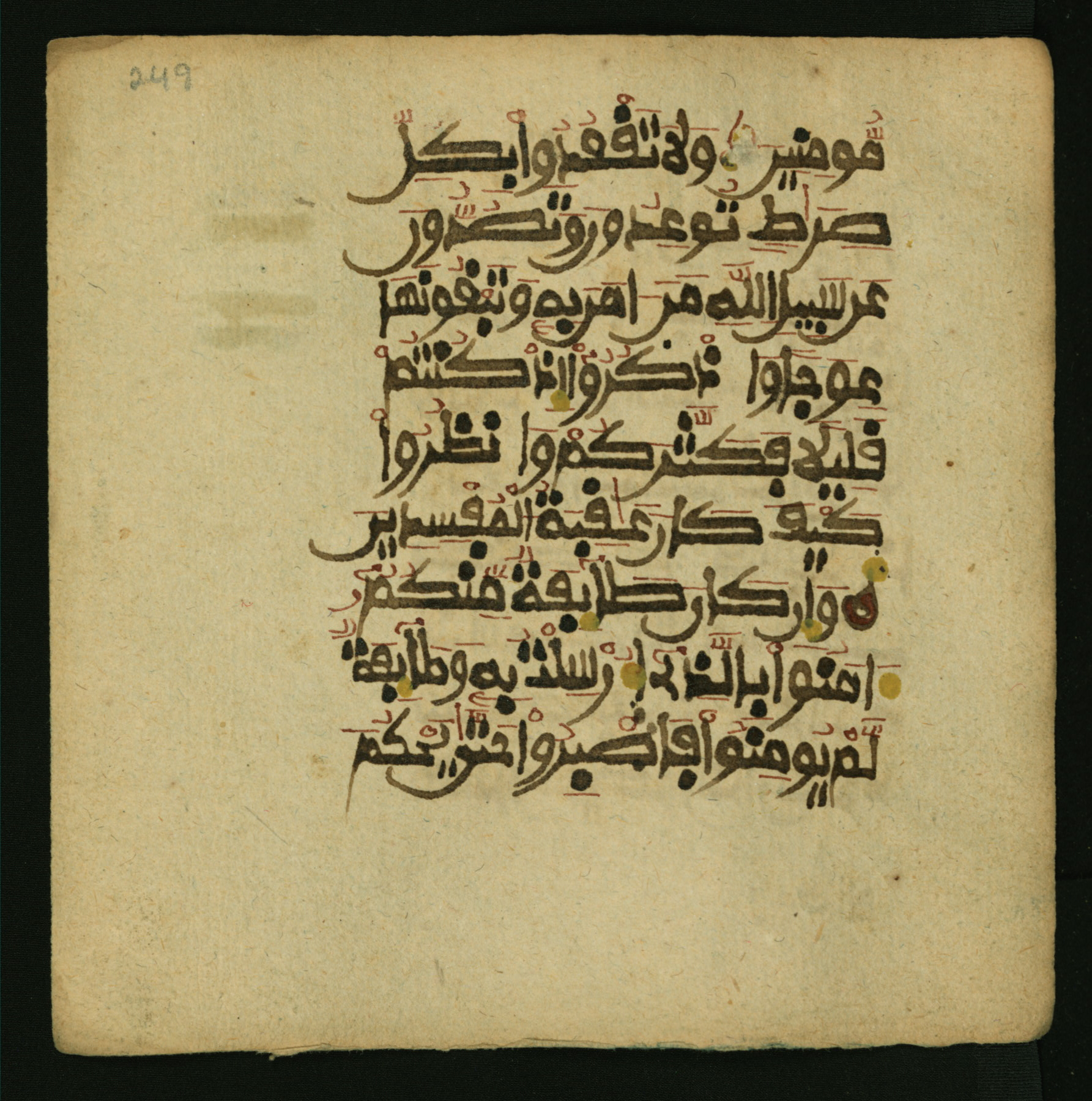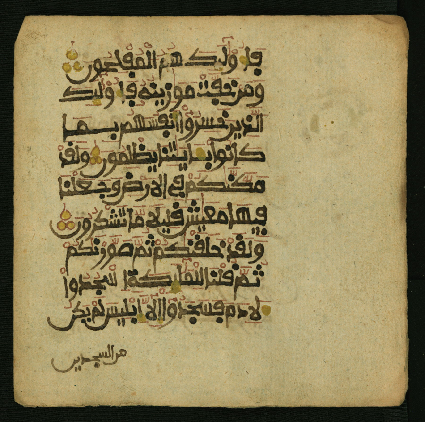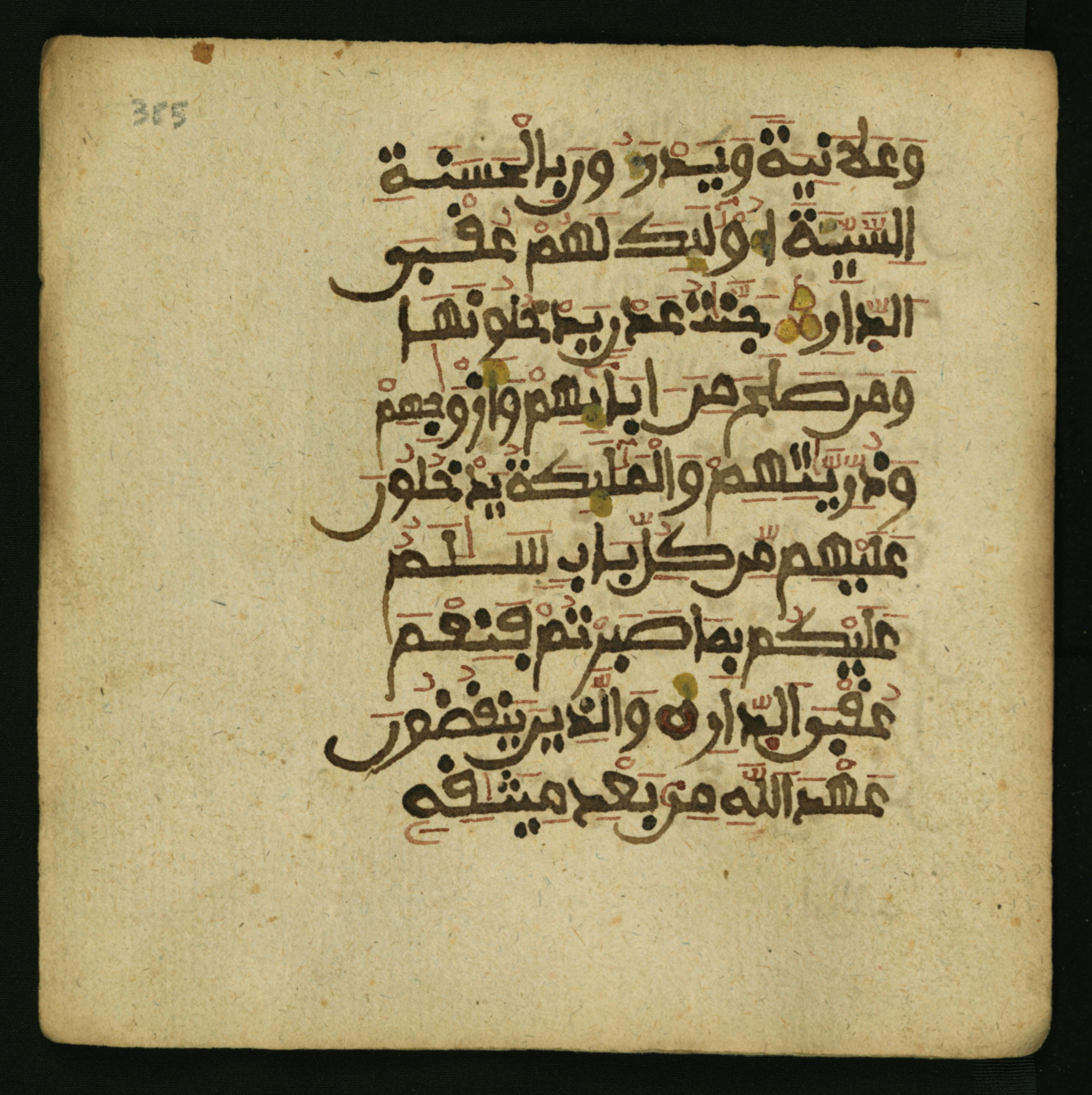 This square-format manuscript is volume 1, containing chapters 1-18 (Sūrat al-fātiḥah through Sūrat al-kahf), of an illuminated two-volume Qur'an produced in Sub-Saharan (West) Africa in the thirteenth century AH / nineteenth CE. The text is written in Sūdānī script in dark brown ink with vocalization in red on loose leaves. Chapter headings are in reddish-brown ink. Three yellow dots outlined in red arranged in a triangular form separate verses. Polychrome circular medallions as well as square and rectangular devices in a variety of patterns and colors mark textual divisions. The leaves of the text are organized between two decorated boards with geometric compositions. The pages and boards are housed in a leather pouch (satchel).