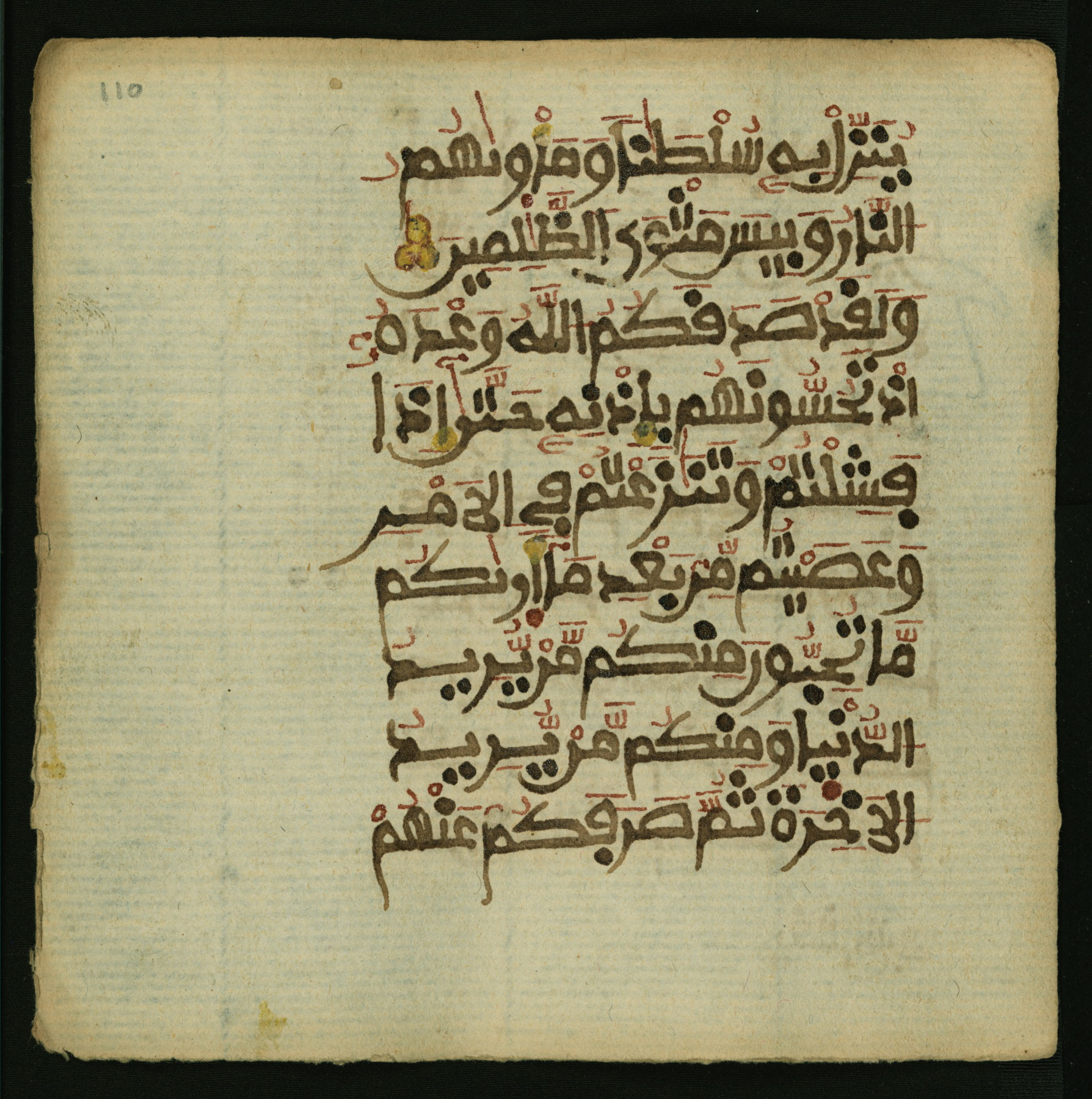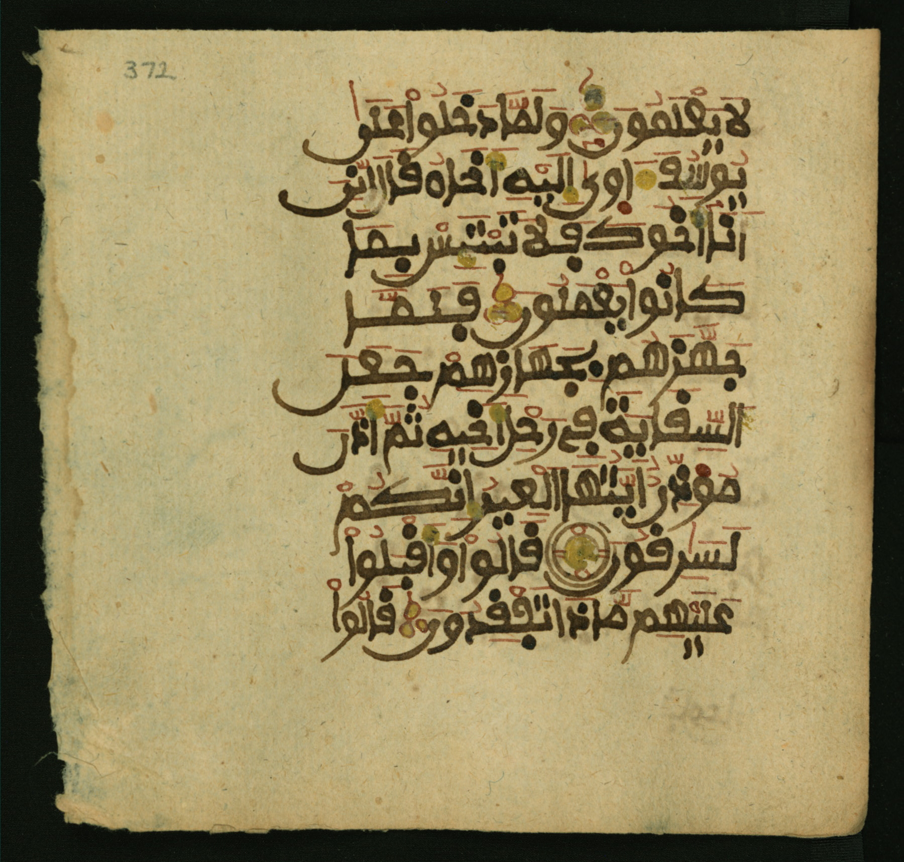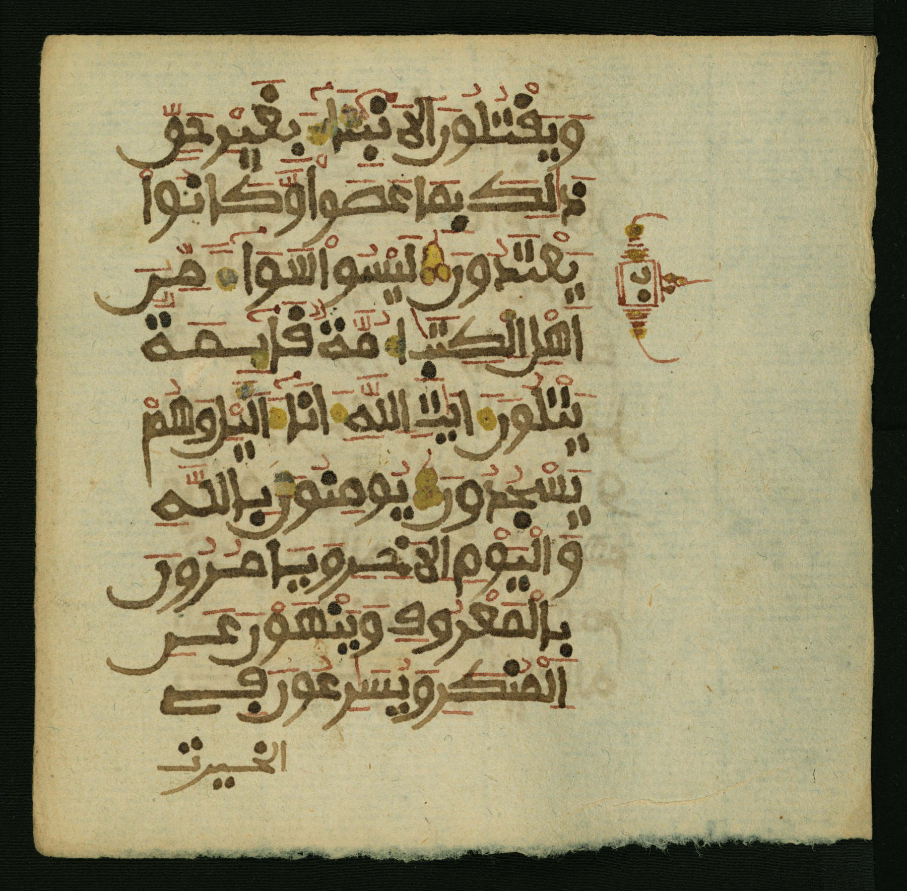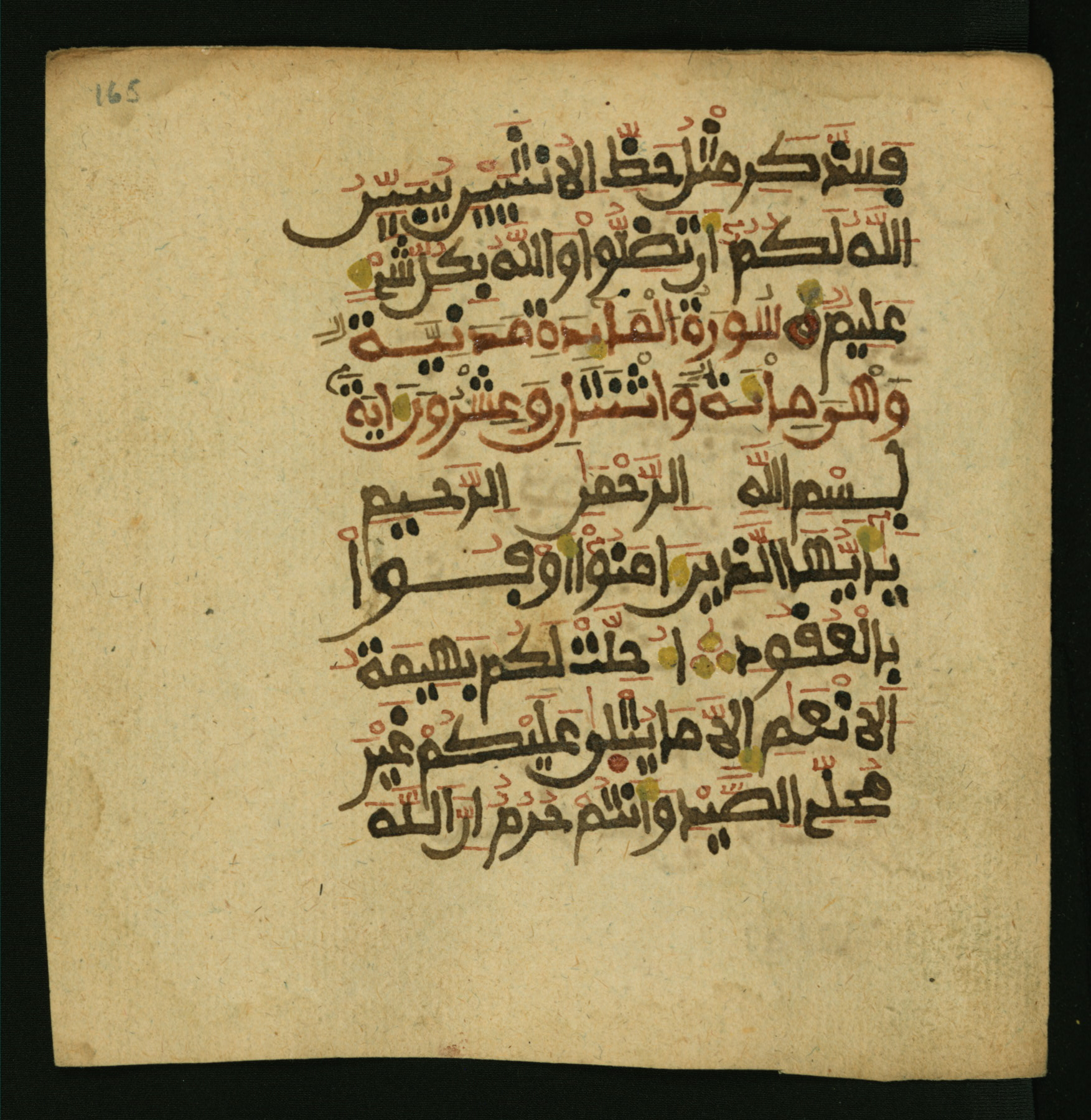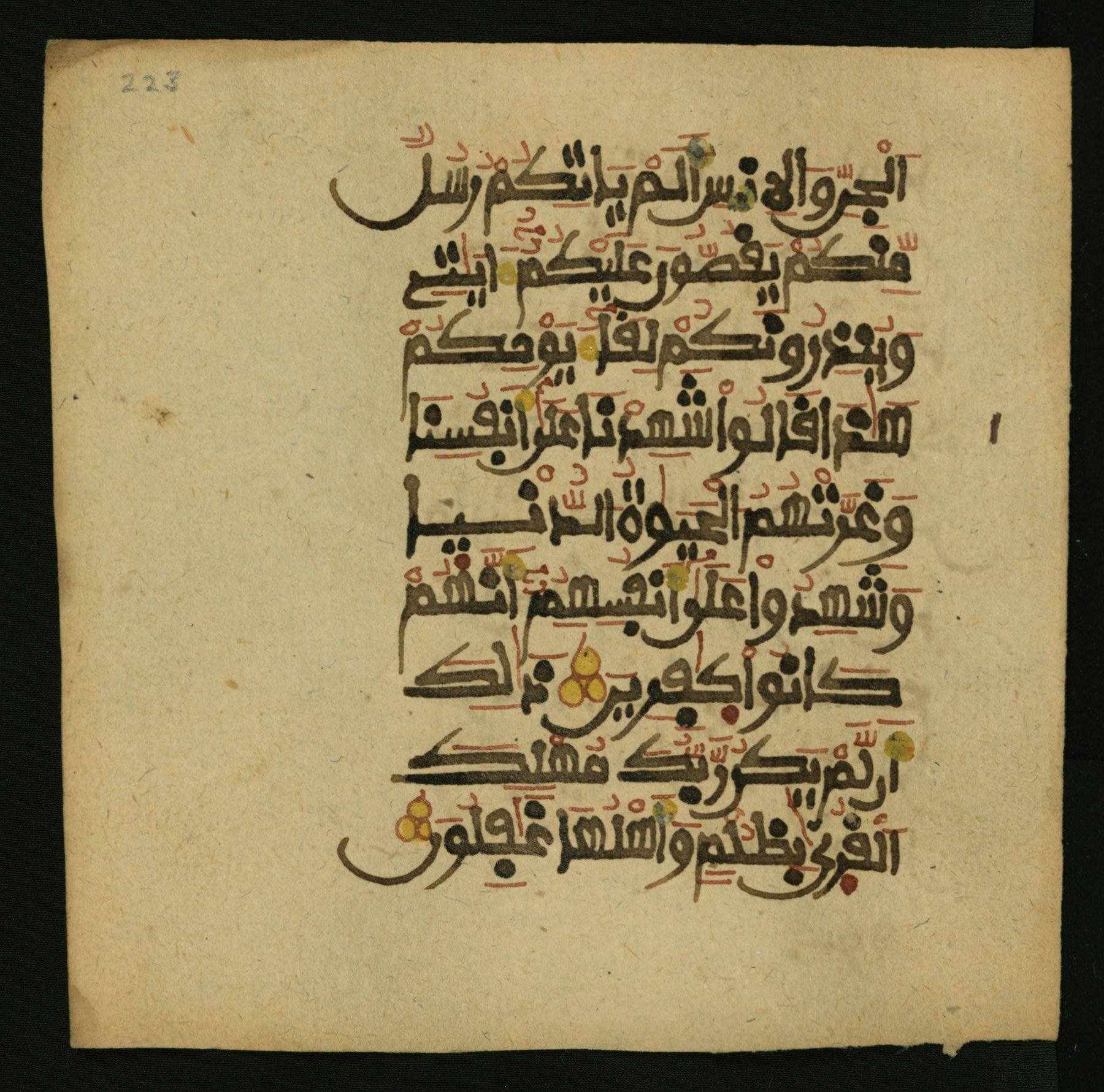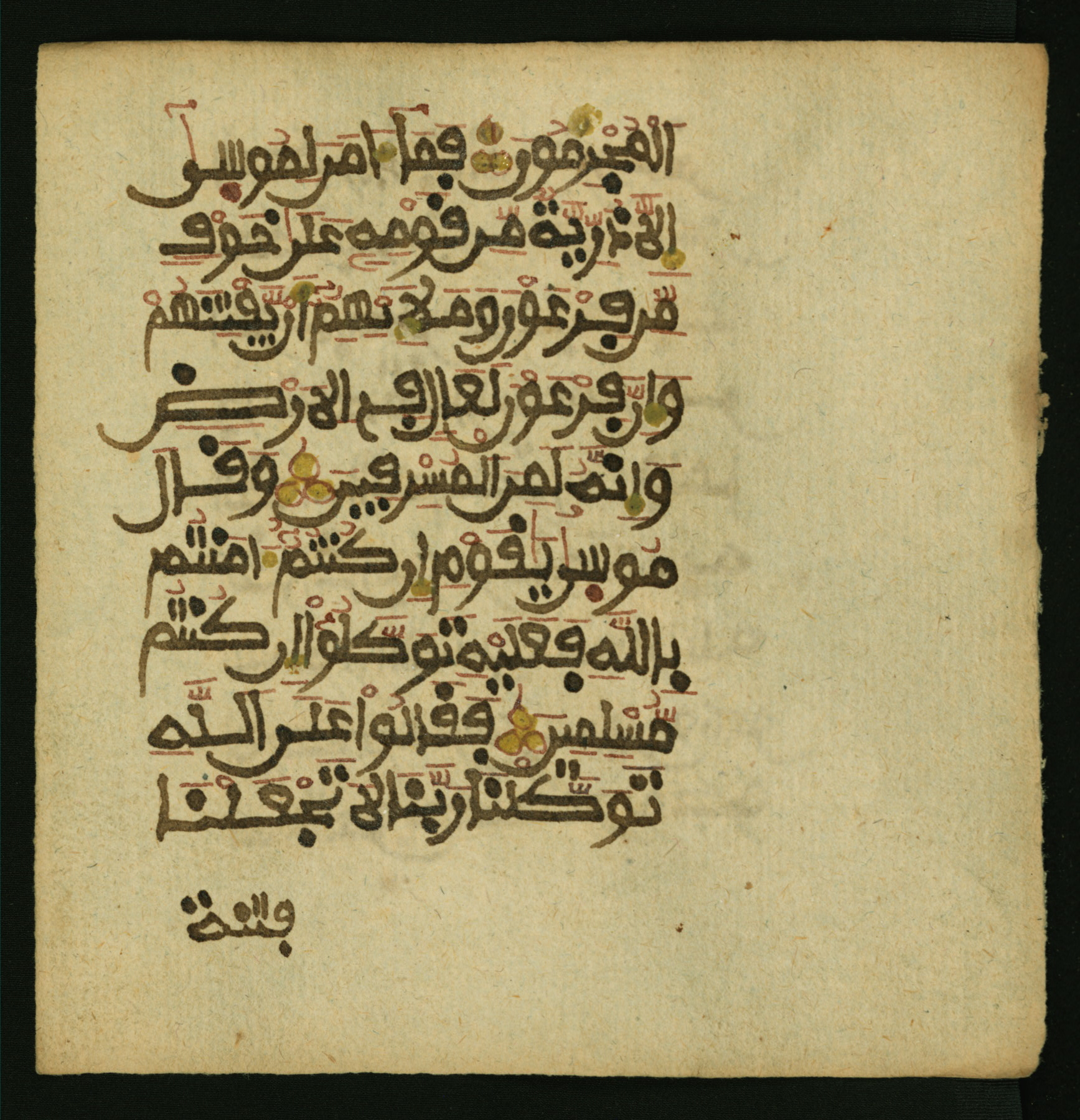 This square-format manuscript is volume 1, containing chapters 1-18 (Sūrat al-fātiḥah through Sūrat al-kahf), of an illuminated two-volume Qur'an produced in Sub-Saharan (West) Africa in the thirteenth century AH / nineteenth CE. The text is written in Sūdānī script in dark brown ink with vocalization in red on loose leaves. Chapter headings are in reddish-brown ink. Three yellow dots outlined in red arranged in a triangular form separate verses. Polychrome circular medallions as well as square and rectangular devices in a variety of patterns and colors mark textual divisions. The leaves of the text are organized between two decorated boards with geometric compositions. The pages and boards are housed in a leather pouch (satchel).