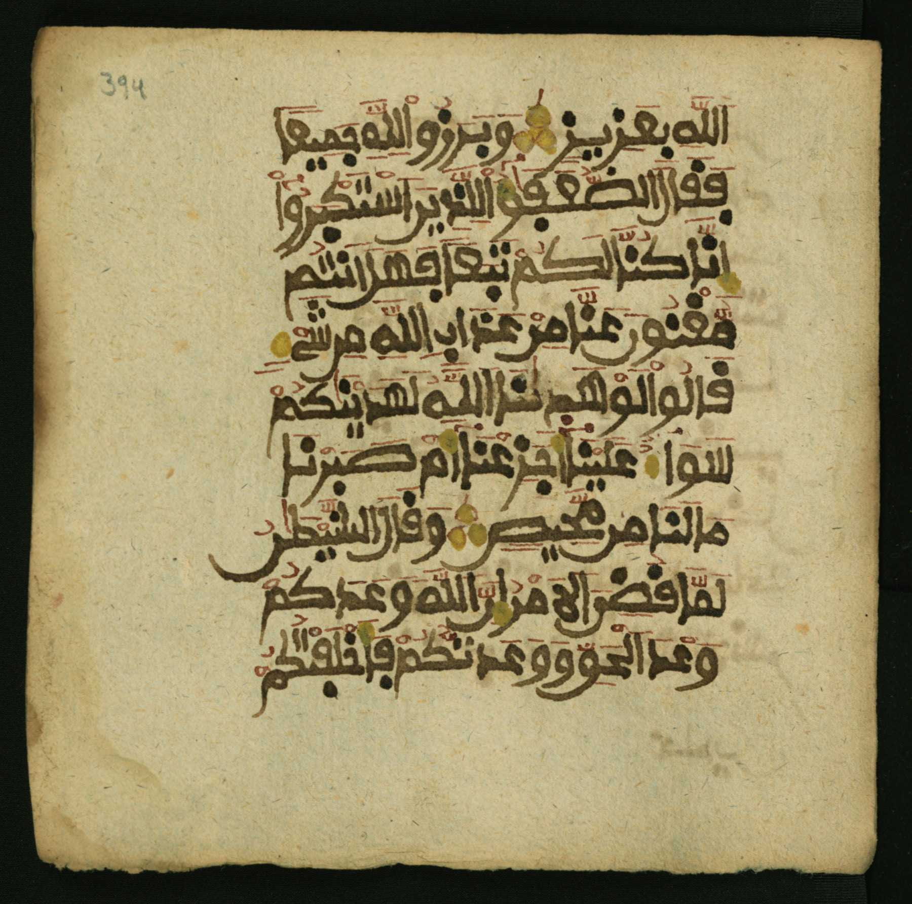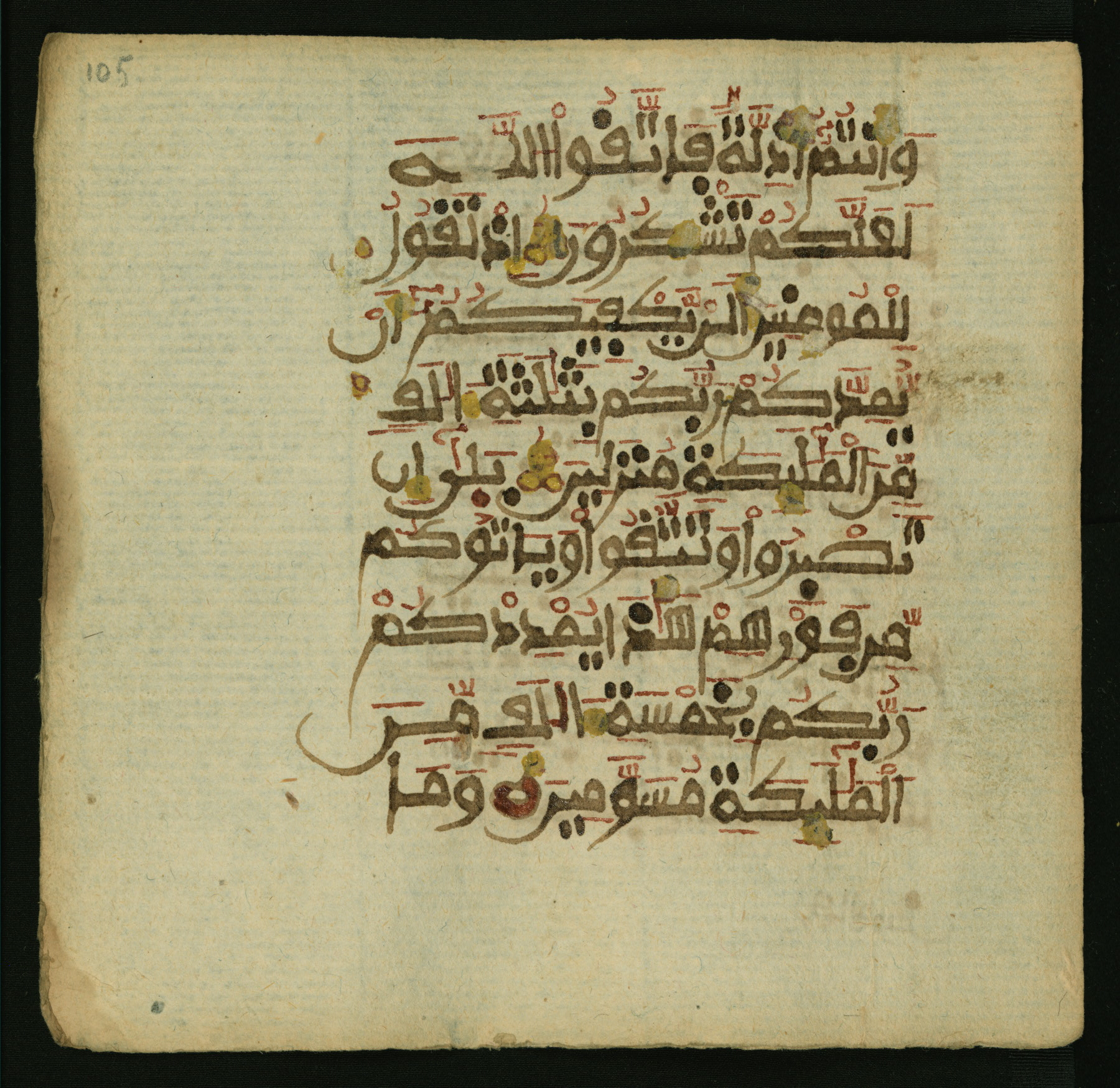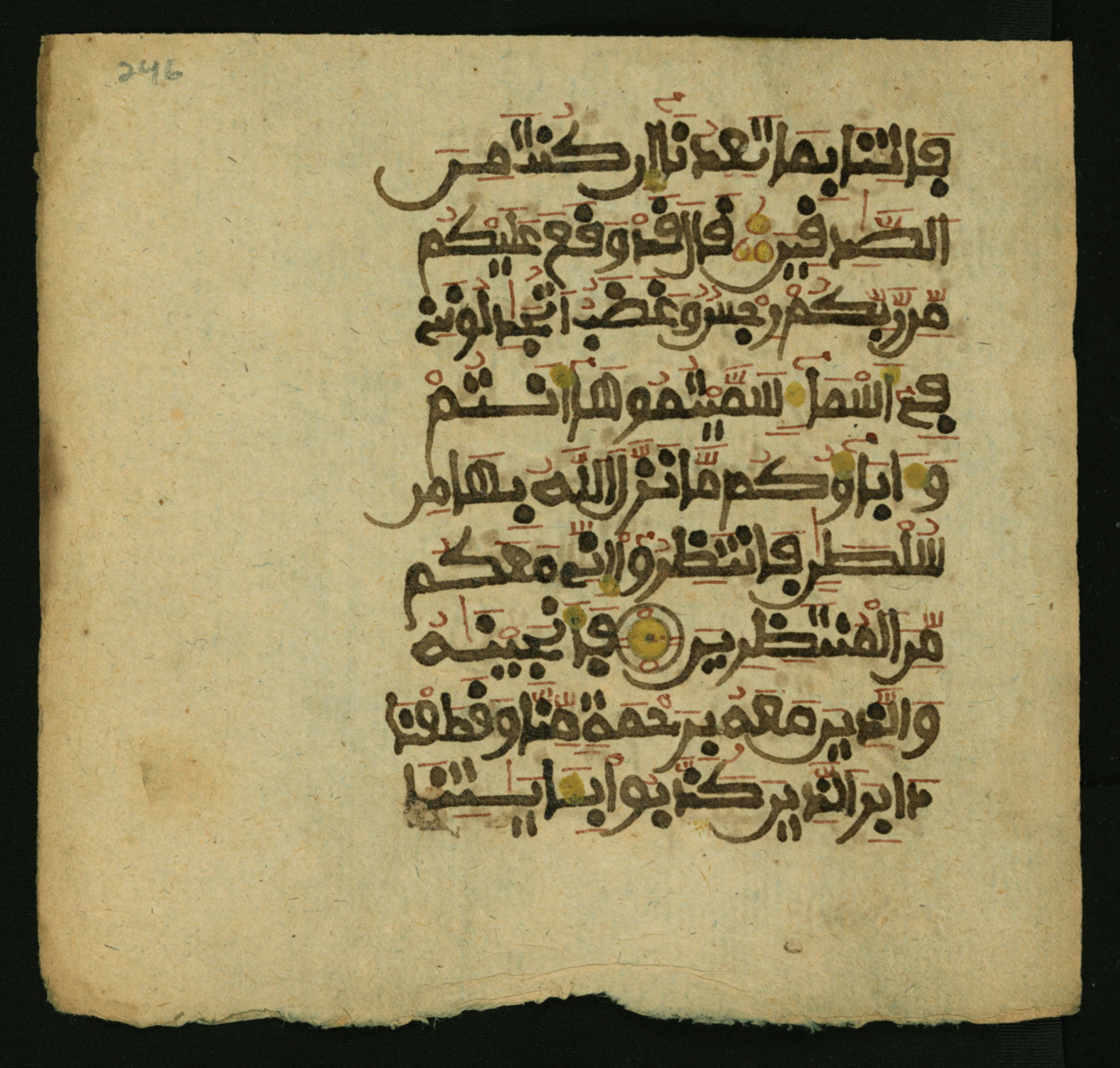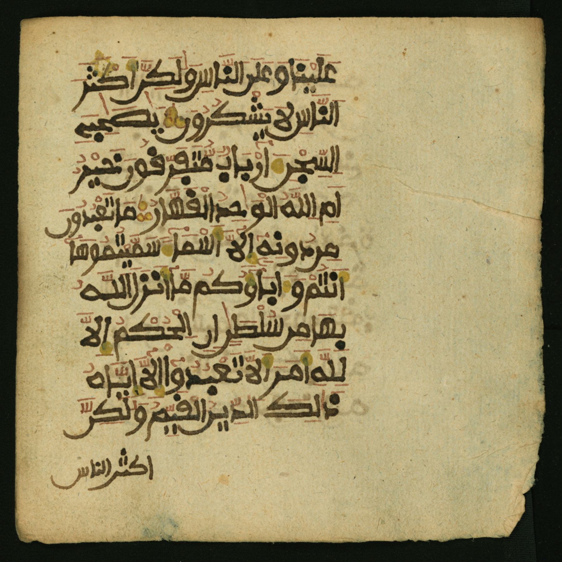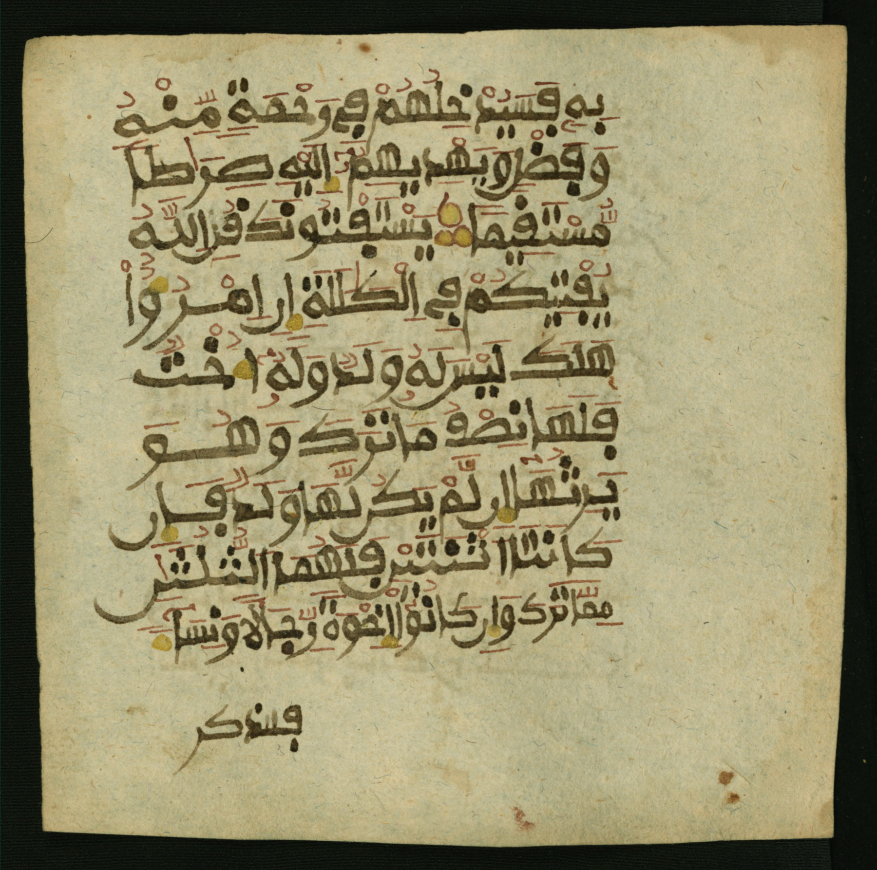 This square-format manuscript is volume 1, containing chapters 1-18 (Sūrat al-fātiḥah through Sūrat al-kahf), of an illuminated two-volume Qur'an produced in Sub-Saharan (West) Africa in the thirteenth century AH / nineteenth CE. The text is written in Sūdānī script in dark brown ink with vocalization in red on loose leaves. Chapter headings are in reddish-brown ink. Three yellow dots outlined in red arranged in a triangular form separate verses. Polychrome circular medallions as well as square and rectangular devices in a variety of patterns and colors mark textual divisions. The leaves of the text are organized between two decorated boards with geometric compositions. The pages and boards are housed in a leather pouch (satchel).