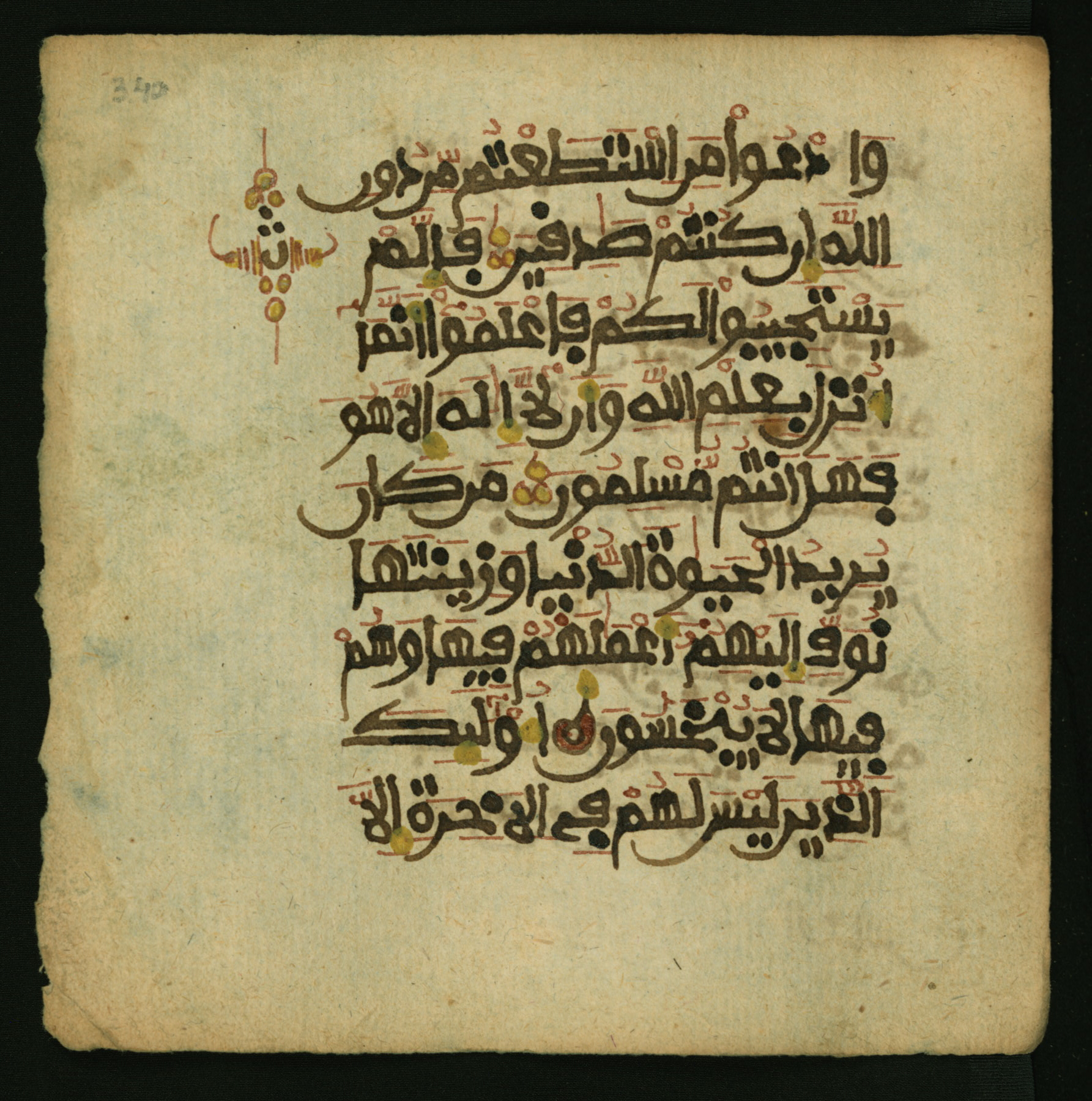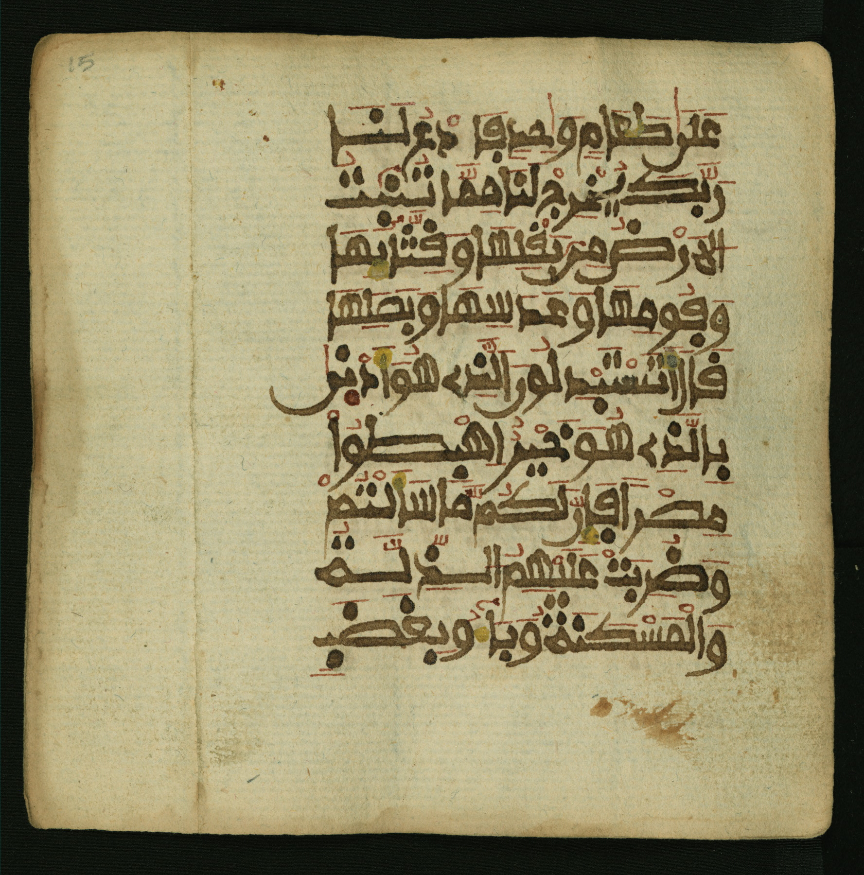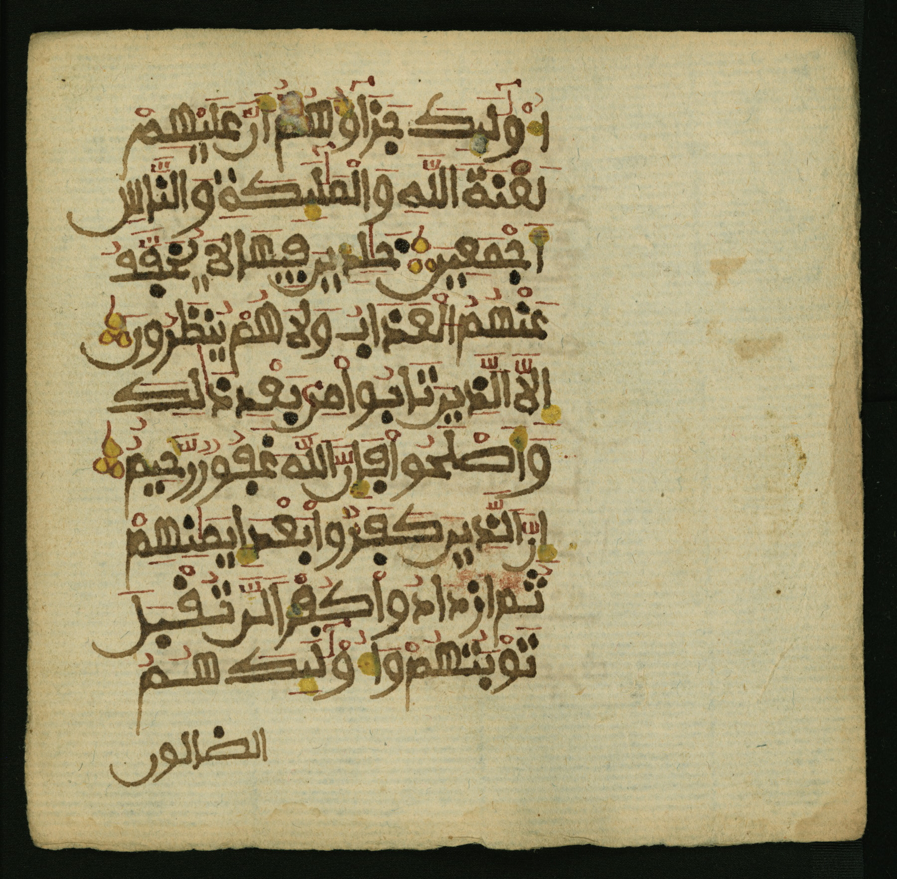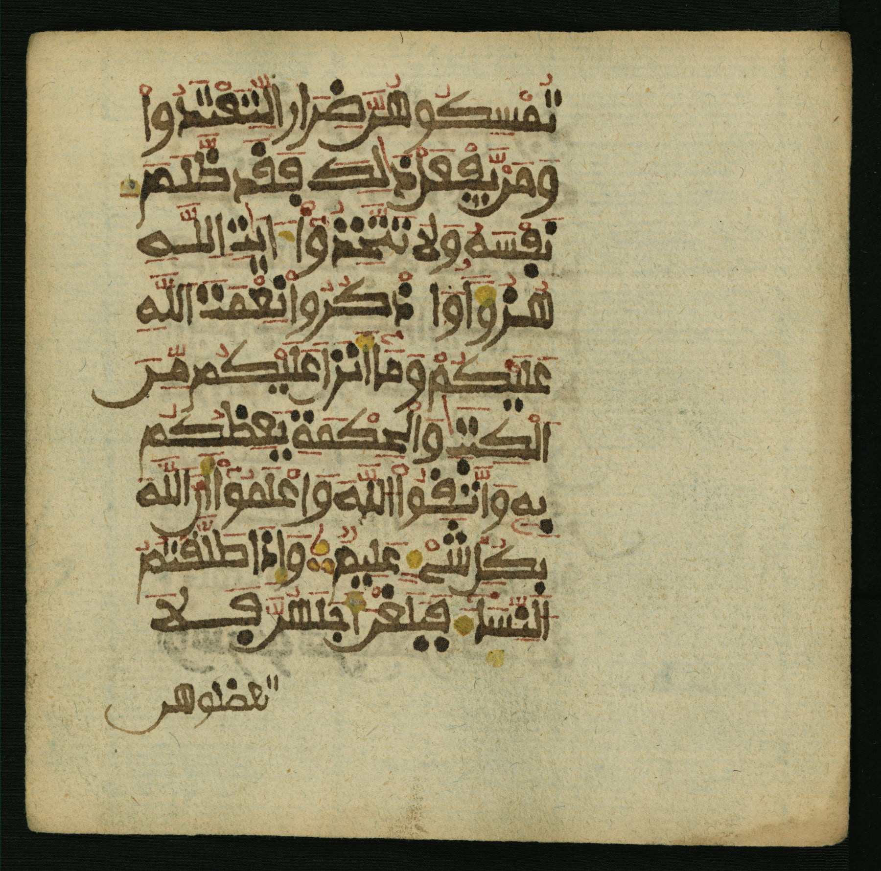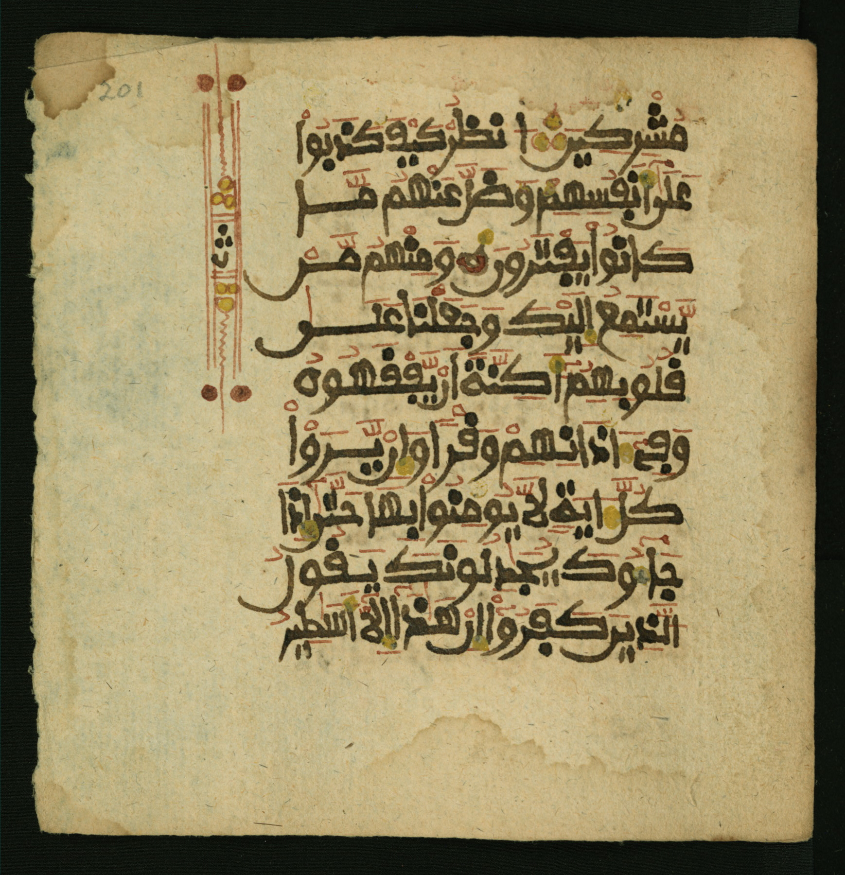 This square-format manuscript is volume 1, containing chapters 1-18 (Sūrat al-fātiḥah through Sūrat al-kahf), of an illuminated two-volume Qur'an produced in Sub-Saharan (West) Africa in the thirteenth century AH / nineteenth CE. The text is written in Sūdānī script in dark brown ink with vocalization in red on loose leaves. Chapter headings are in reddish-brown ink. Three yellow dots outlined in red arranged in a triangular form separate verses. Polychrome circular medallions as well as square and rectangular devices in a variety of patterns and colors mark textual divisions. The leaves of the text are organized between two decorated boards with geometric compositions. The pages and boards are housed in a leather pouch (satchel).