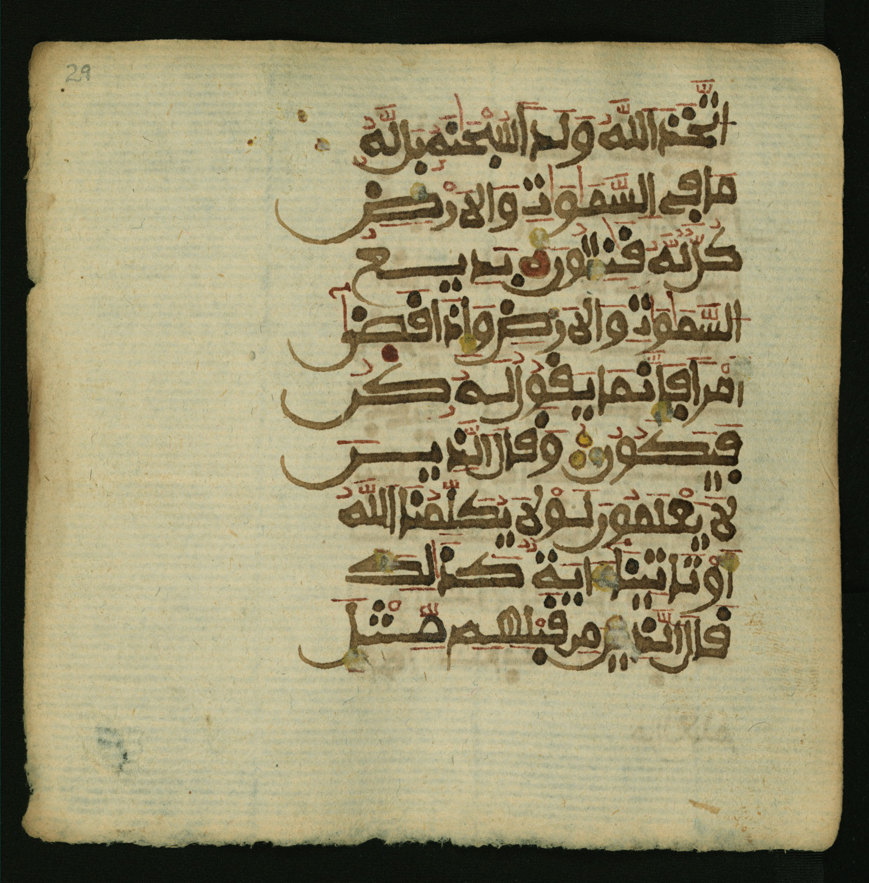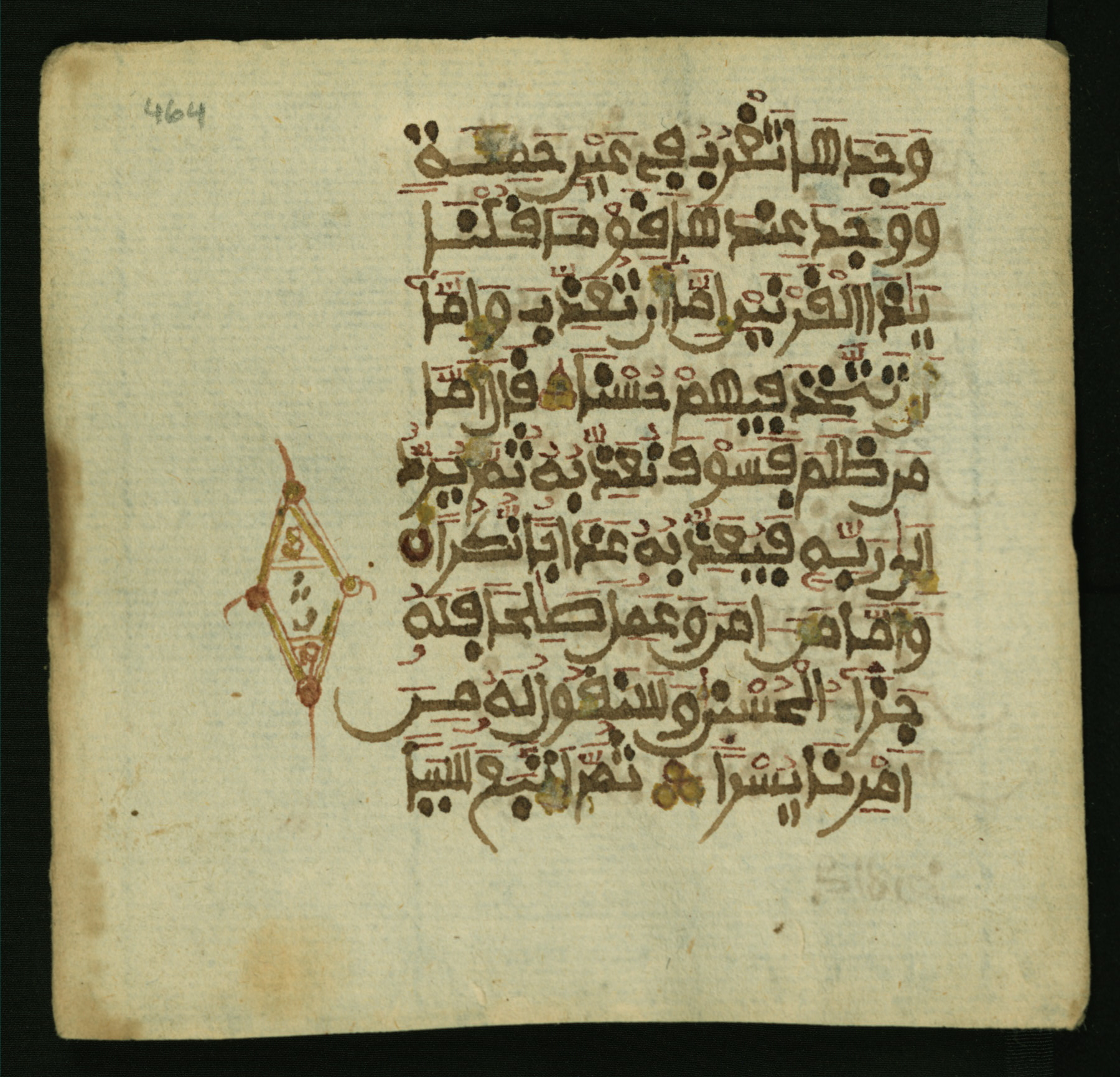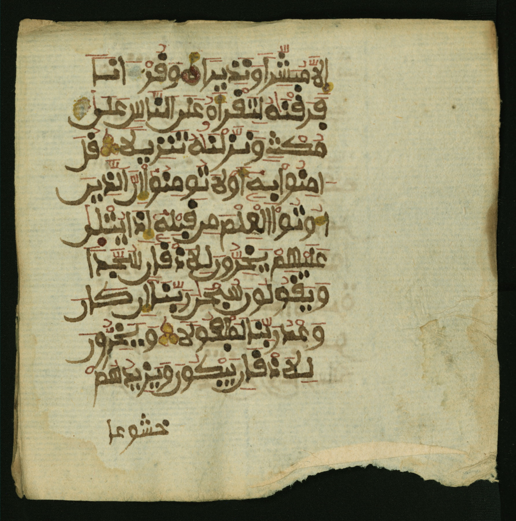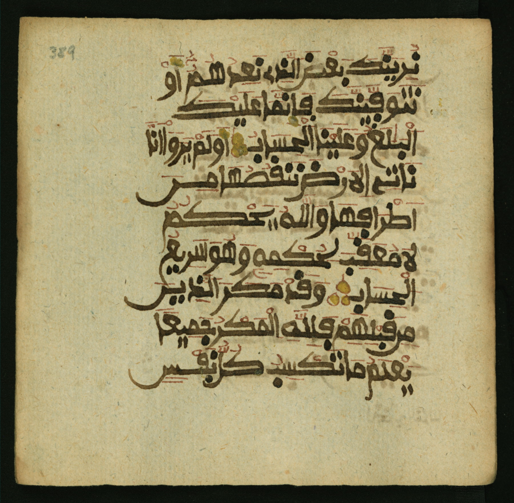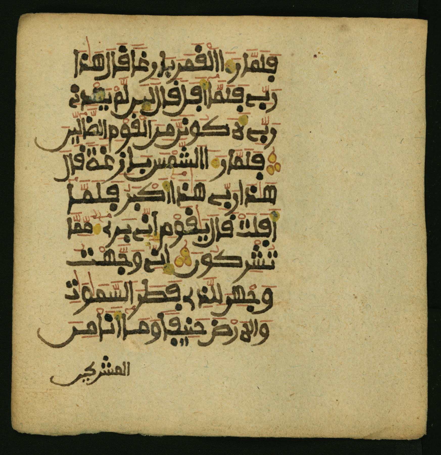 This square-format manuscript is volume 1, containing chapters 1-18 (Sūrat al-fātiḥah through Sūrat al-kahf), of an illuminated two-volume Qur'an produced in Sub-Saharan (West) Africa in the thirteenth century AH / nineteenth CE. The text is written in Sūdānī script in dark brown ink with vocalization in red on loose leaves. Chapter headings are in reddish-brown ink. Three yellow dots outlined in red arranged in a triangular form separate verses. Polychrome circular medallions as well as square and rectangular devices in a variety of patterns and colors mark textual divisions. The leaves of the text are organized between two decorated boards with geometric compositions. The pages and boards are housed in a leather pouch (satchel).