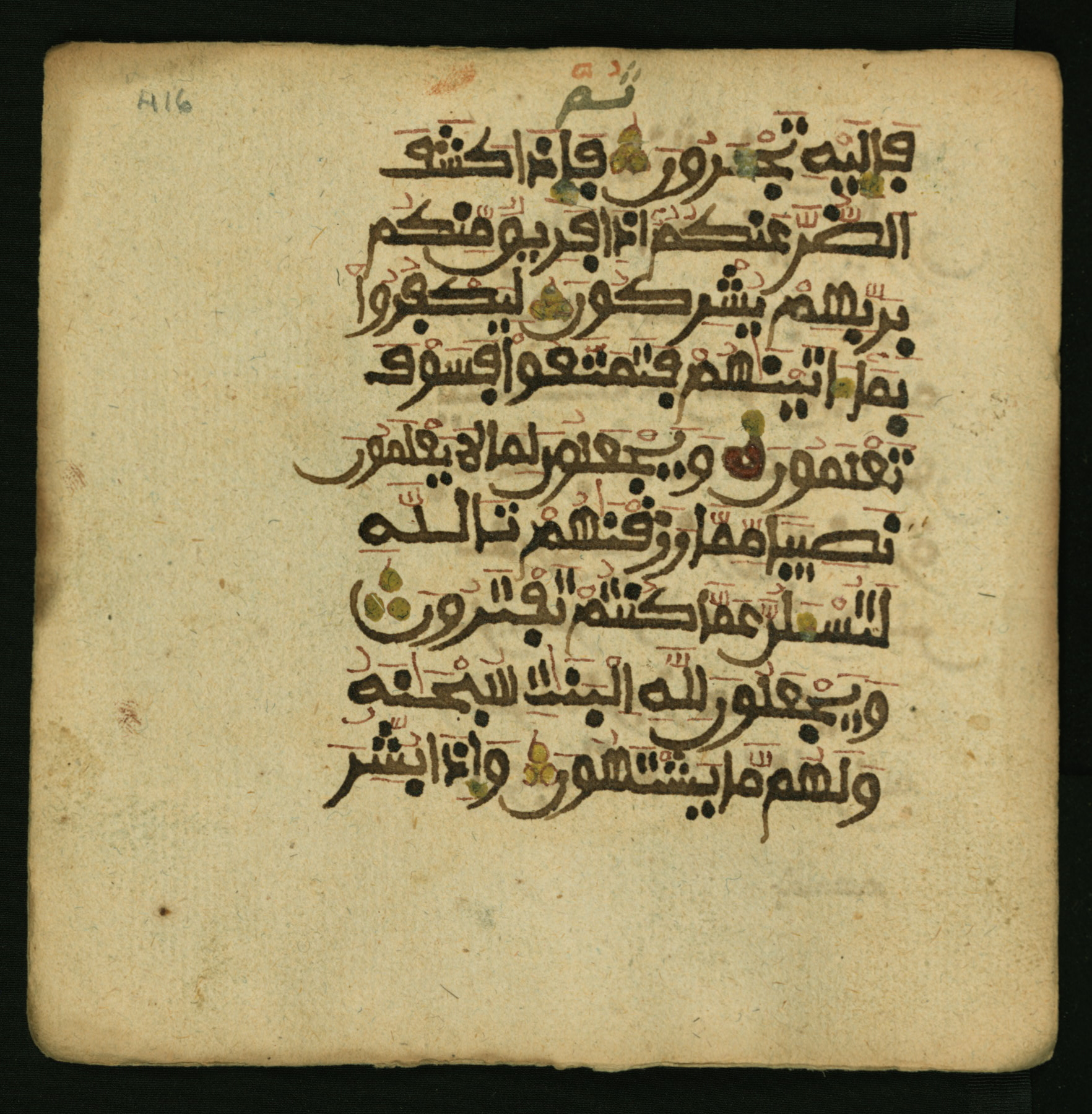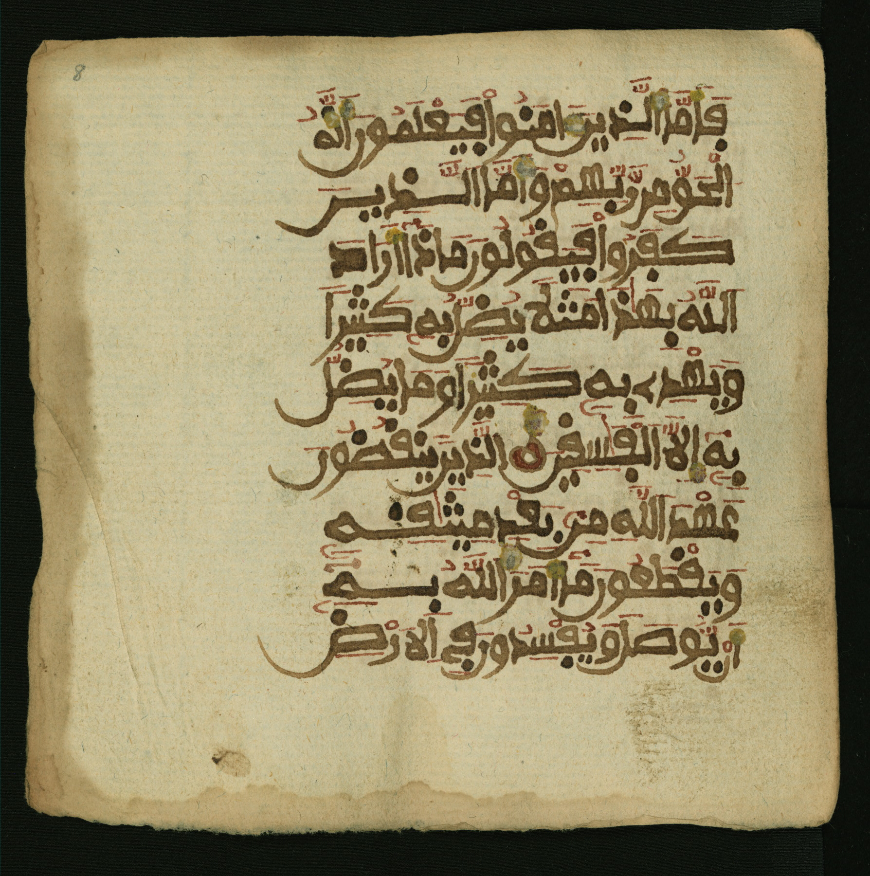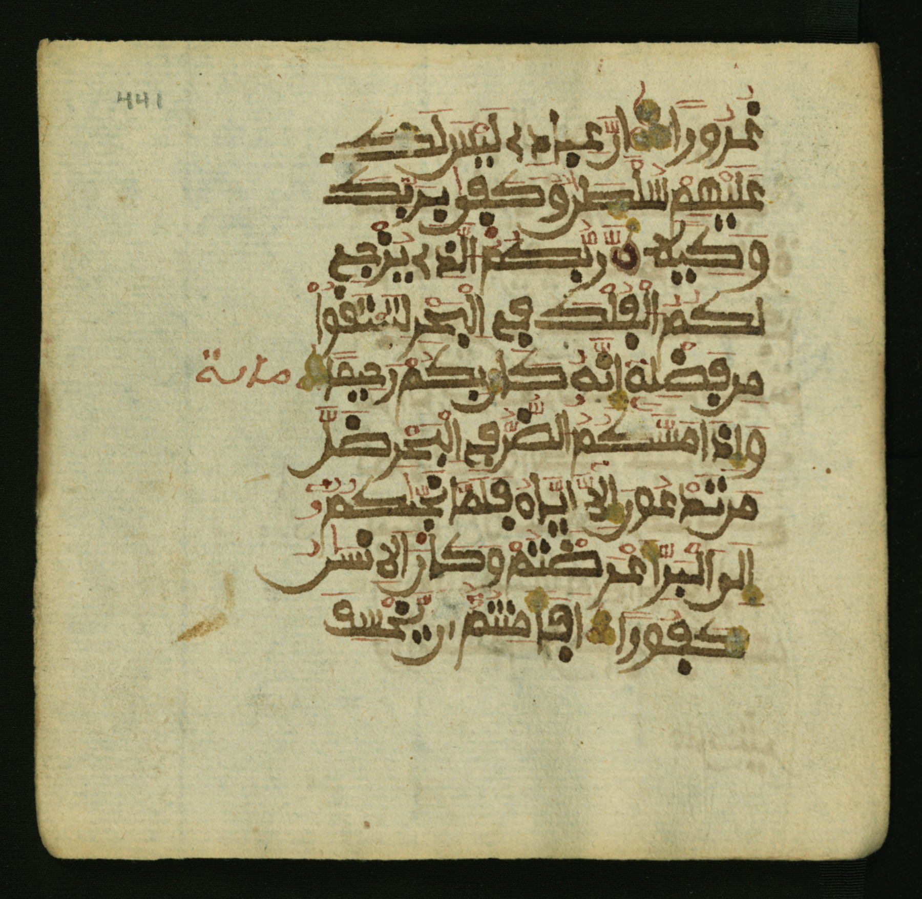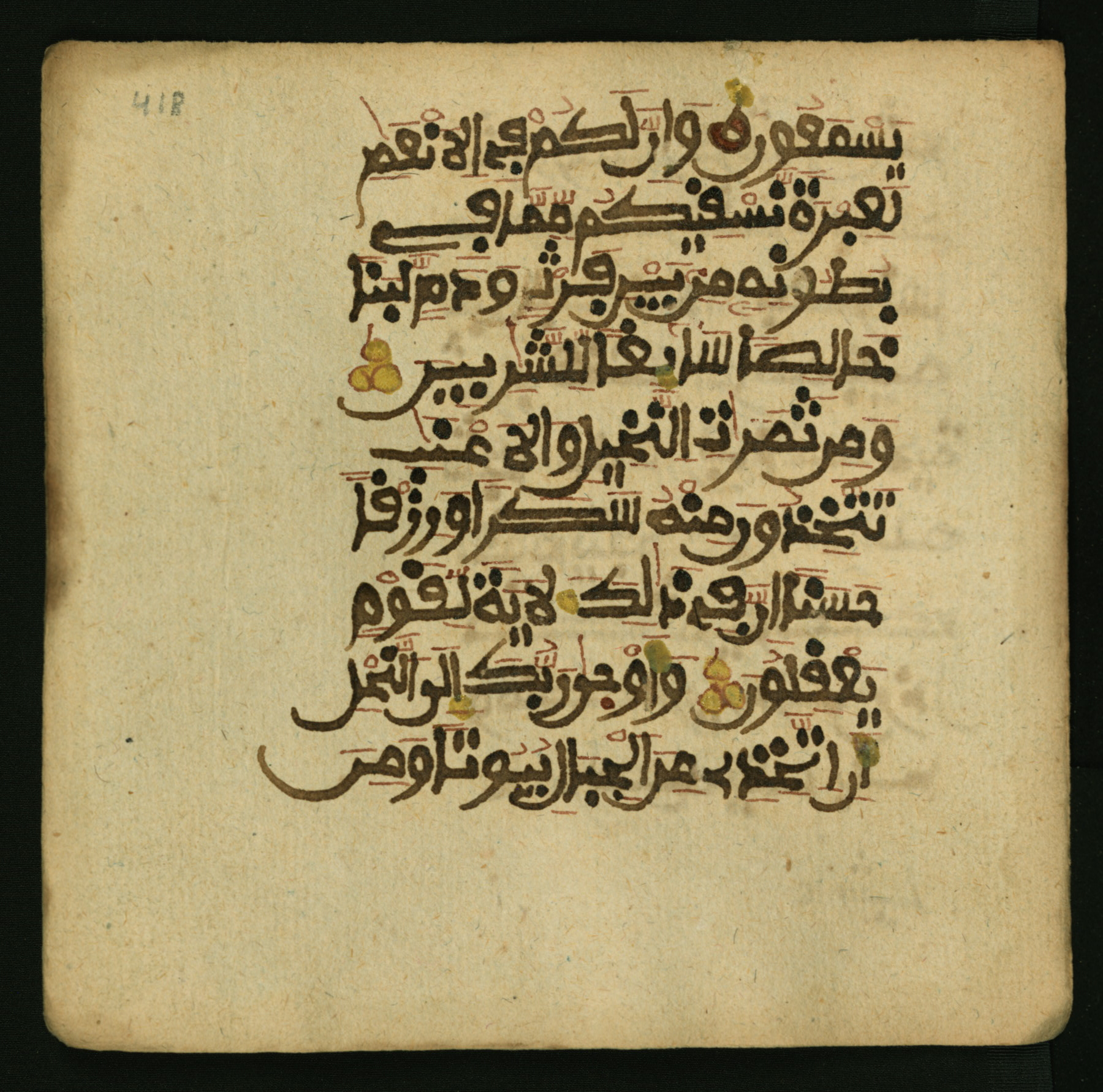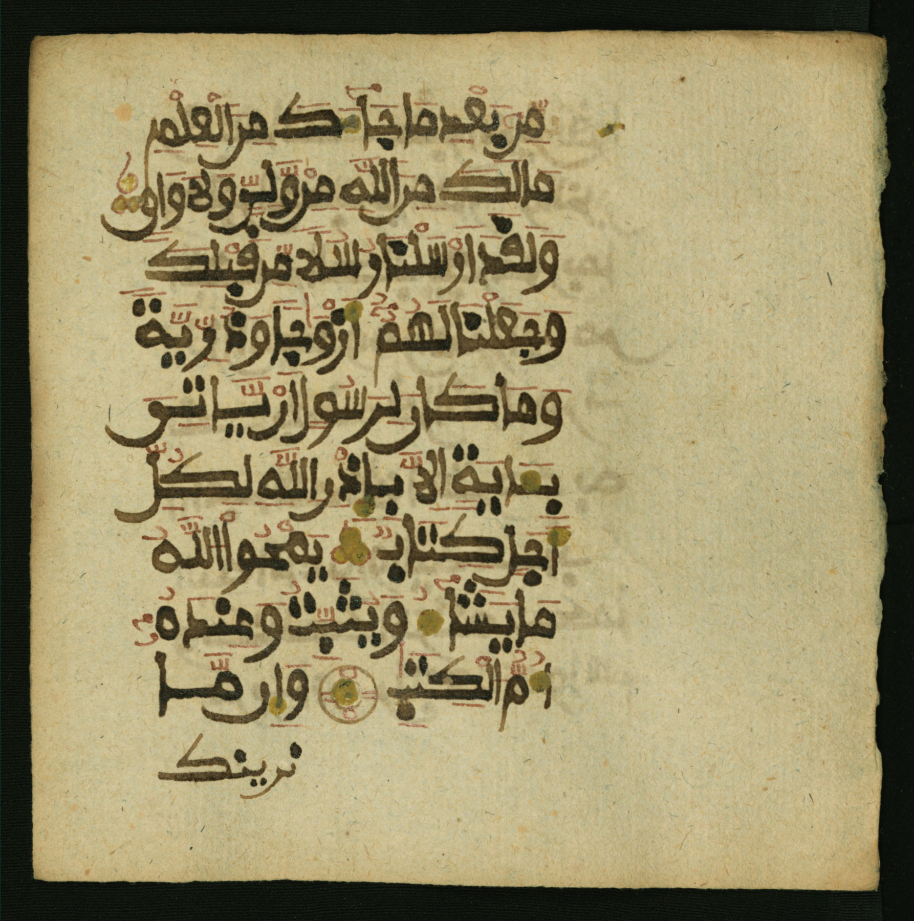 This square-format manuscript is volume 1, containing chapters 1-18 (Sūrat al-fātiḥah through Sūrat al-kahf), of an illuminated two-volume Qur'an produced in Sub-Saharan (West) Africa in the thirteenth century AH / nineteenth CE. The text is written in Sūdānī script in dark brown ink with vocalization in red on loose leaves. Chapter headings are in reddish-brown ink. Three yellow dots outlined in red arranged in a triangular form separate verses. Polychrome circular medallions as well as square and rectangular devices in a variety of patterns and colors mark textual divisions. The leaves of the text are organized between two decorated boards with geometric compositions. The pages and boards are housed in a leather pouch (satchel).