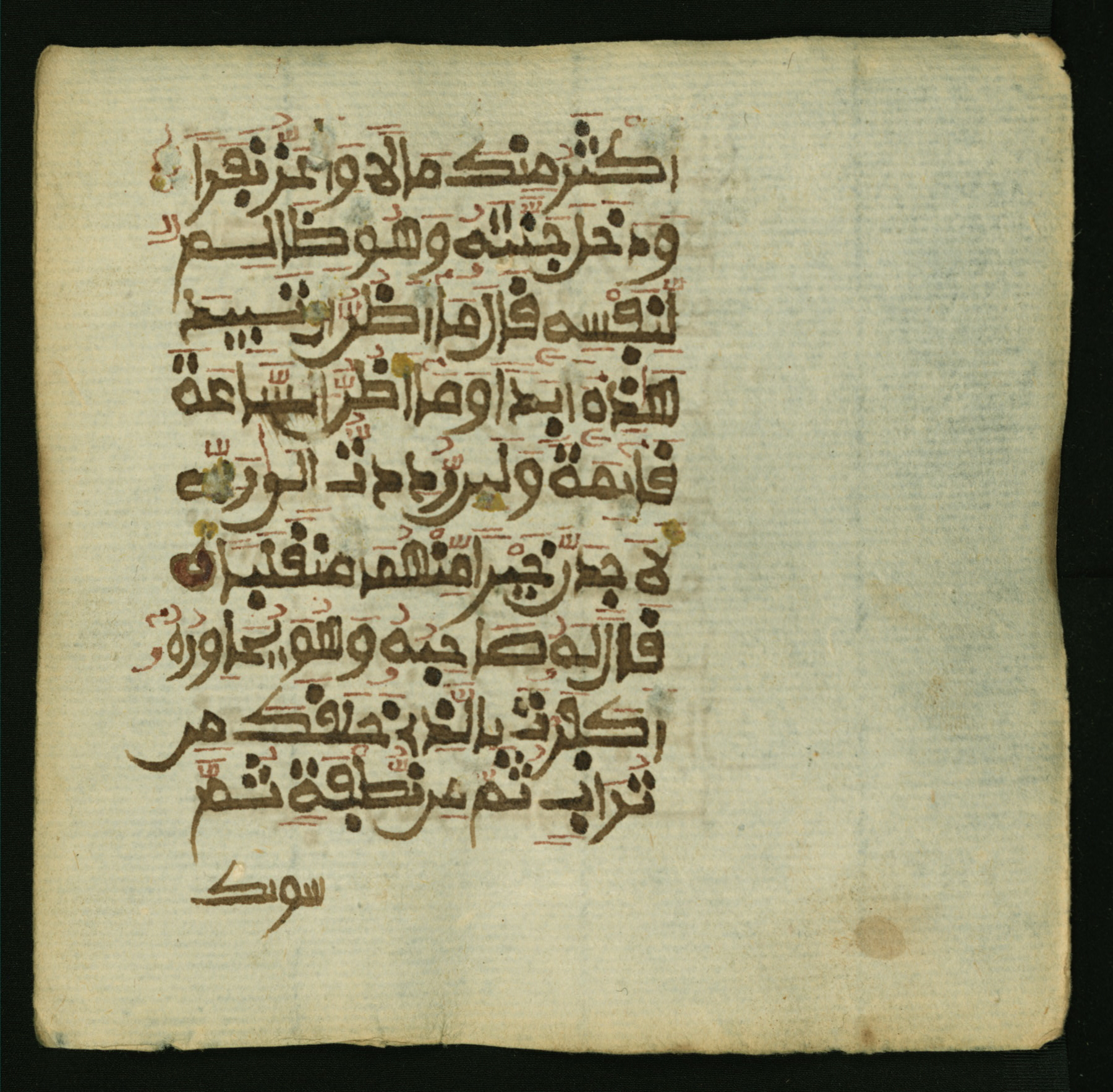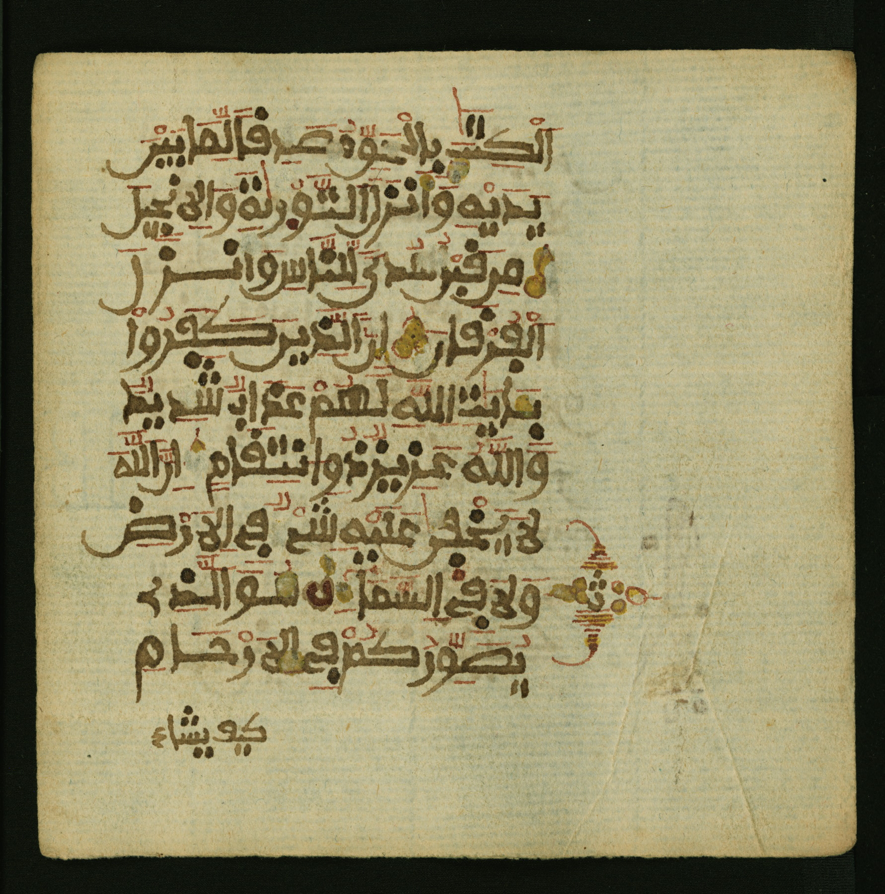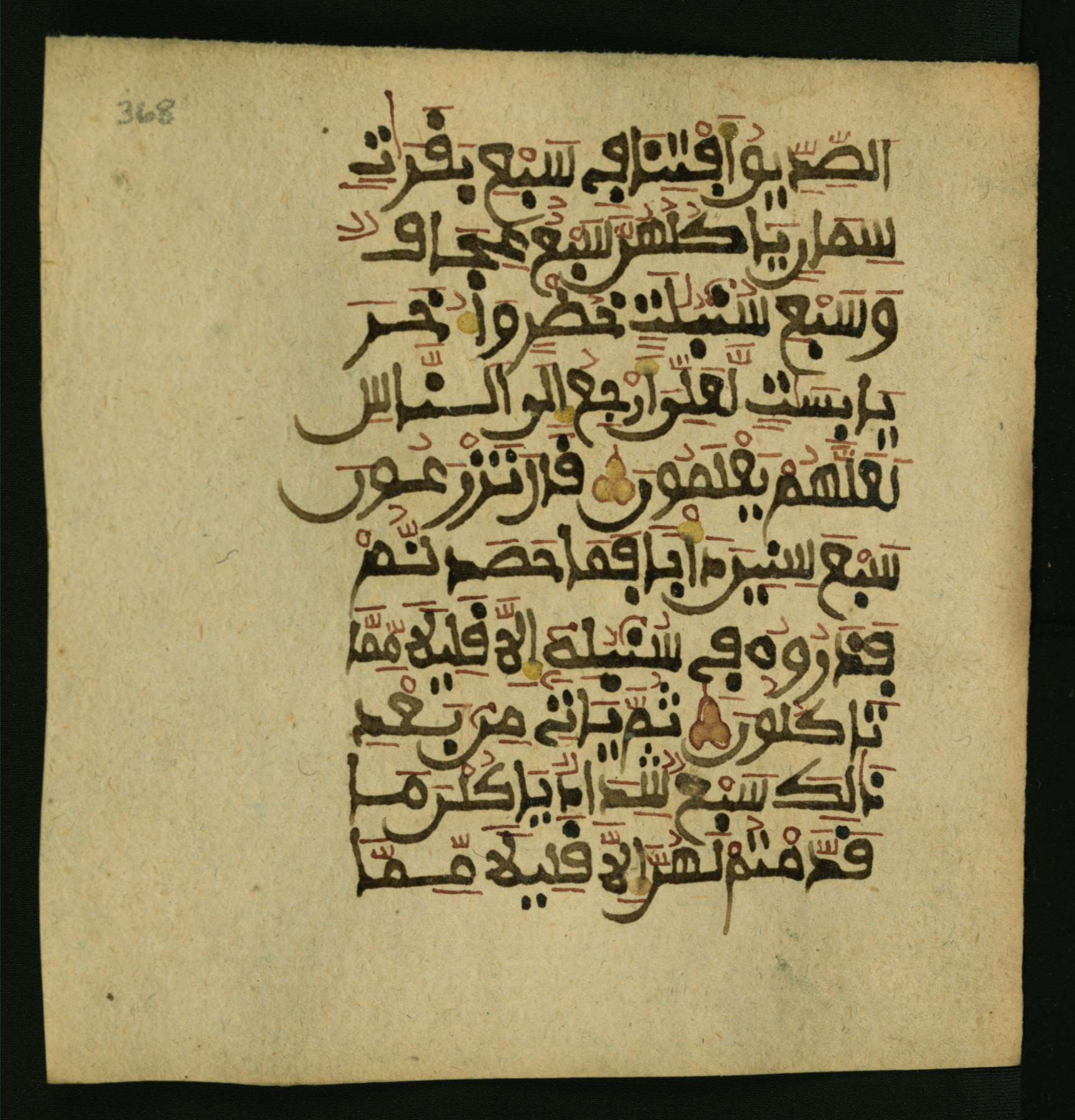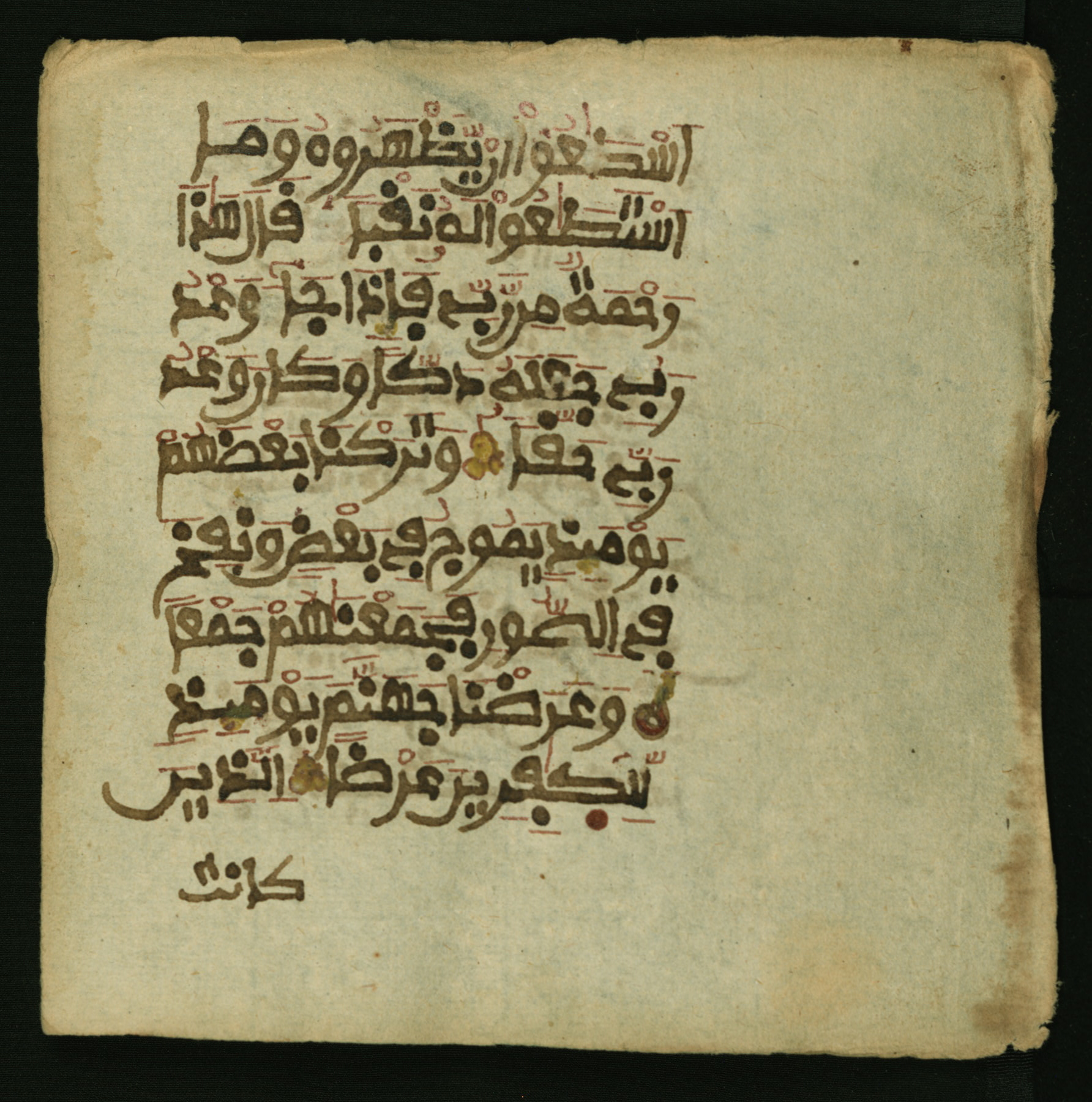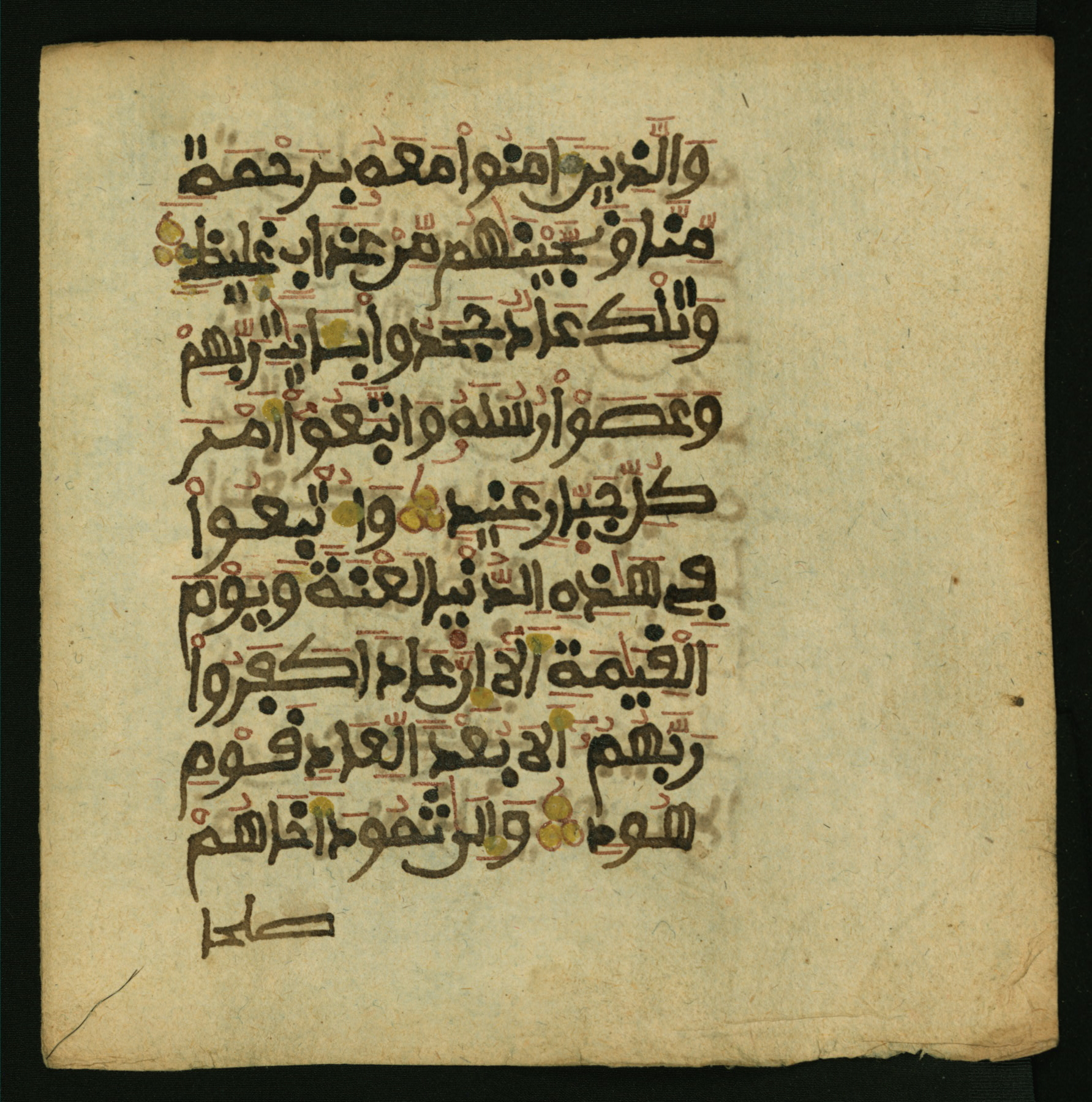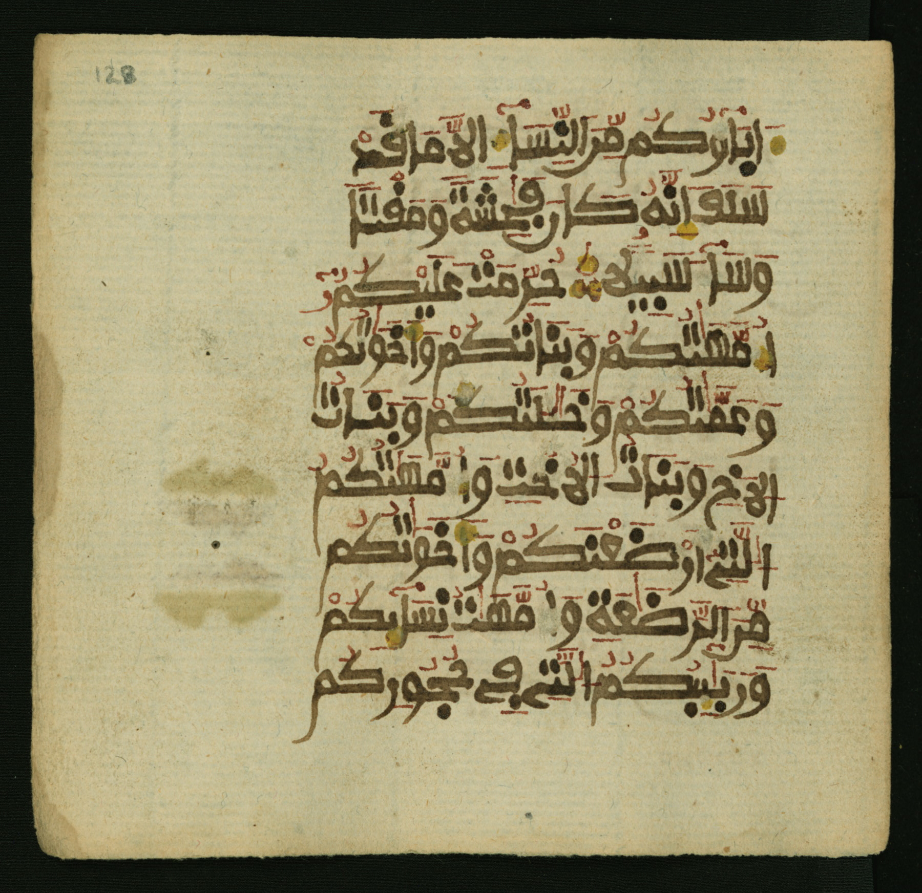 This square-format manuscript is volume 1, containing chapters 1-18 (Sūrat al-fātiḥah through Sūrat al-kahf), of an illuminated two-volume Qur'an produced in Sub-Saharan (West) Africa in the thirteenth century AH / nineteenth CE. The text is written in Sūdānī script in dark brown ink with vocalization in red on loose leaves. Chapter headings are in reddish-brown ink. Three yellow dots outlined in red arranged in a triangular form separate verses. Polychrome circular medallions as well as square and rectangular devices in a variety of patterns and colors mark textual divisions. The leaves of the text are organized between two decorated boards with geometric compositions. The pages and boards are housed in a leather pouch (satchel).