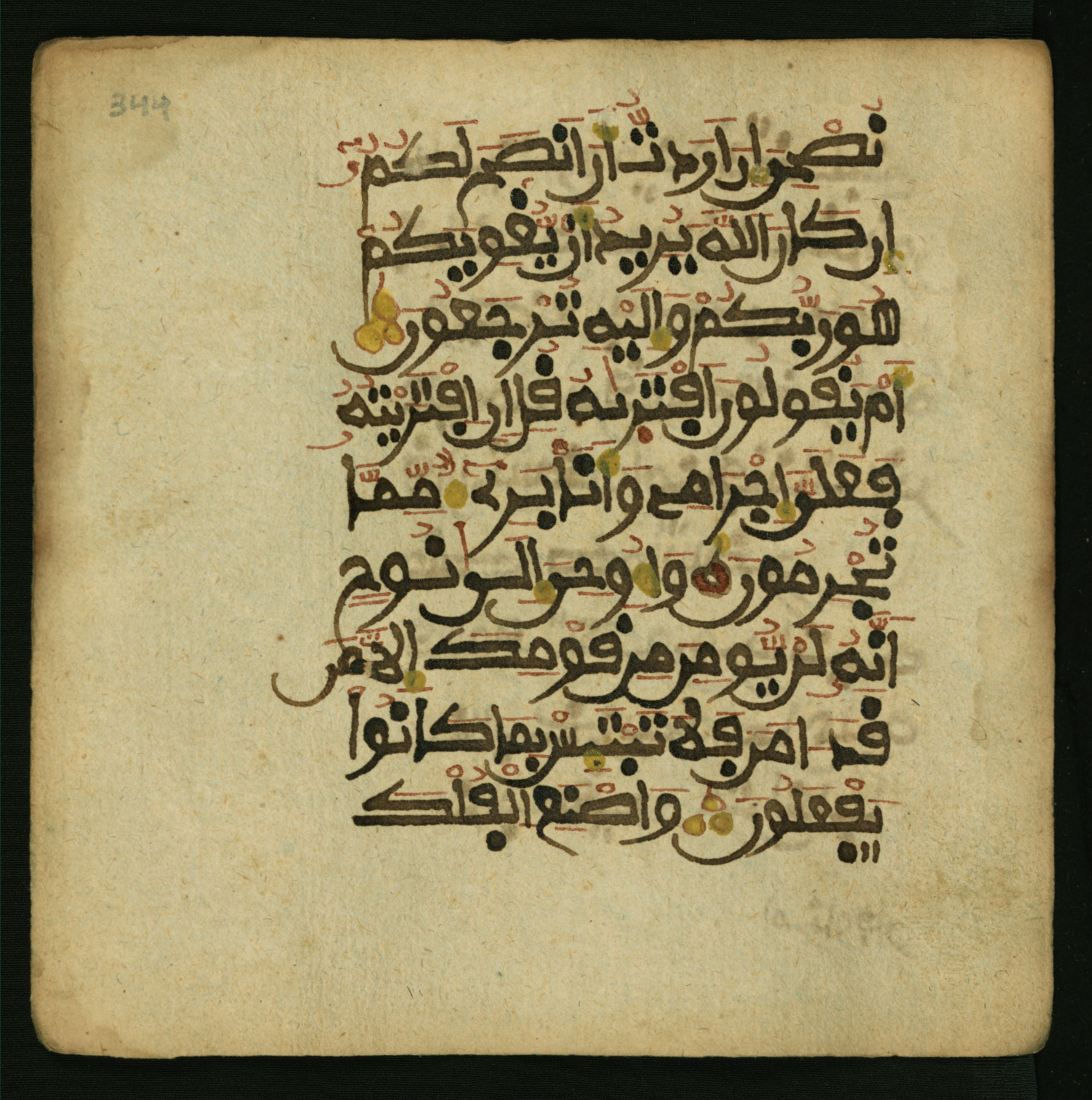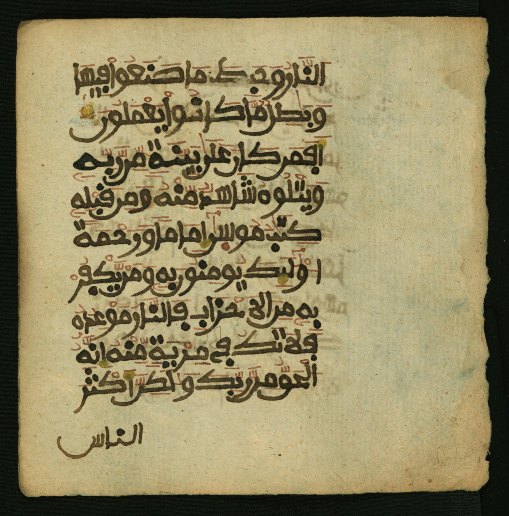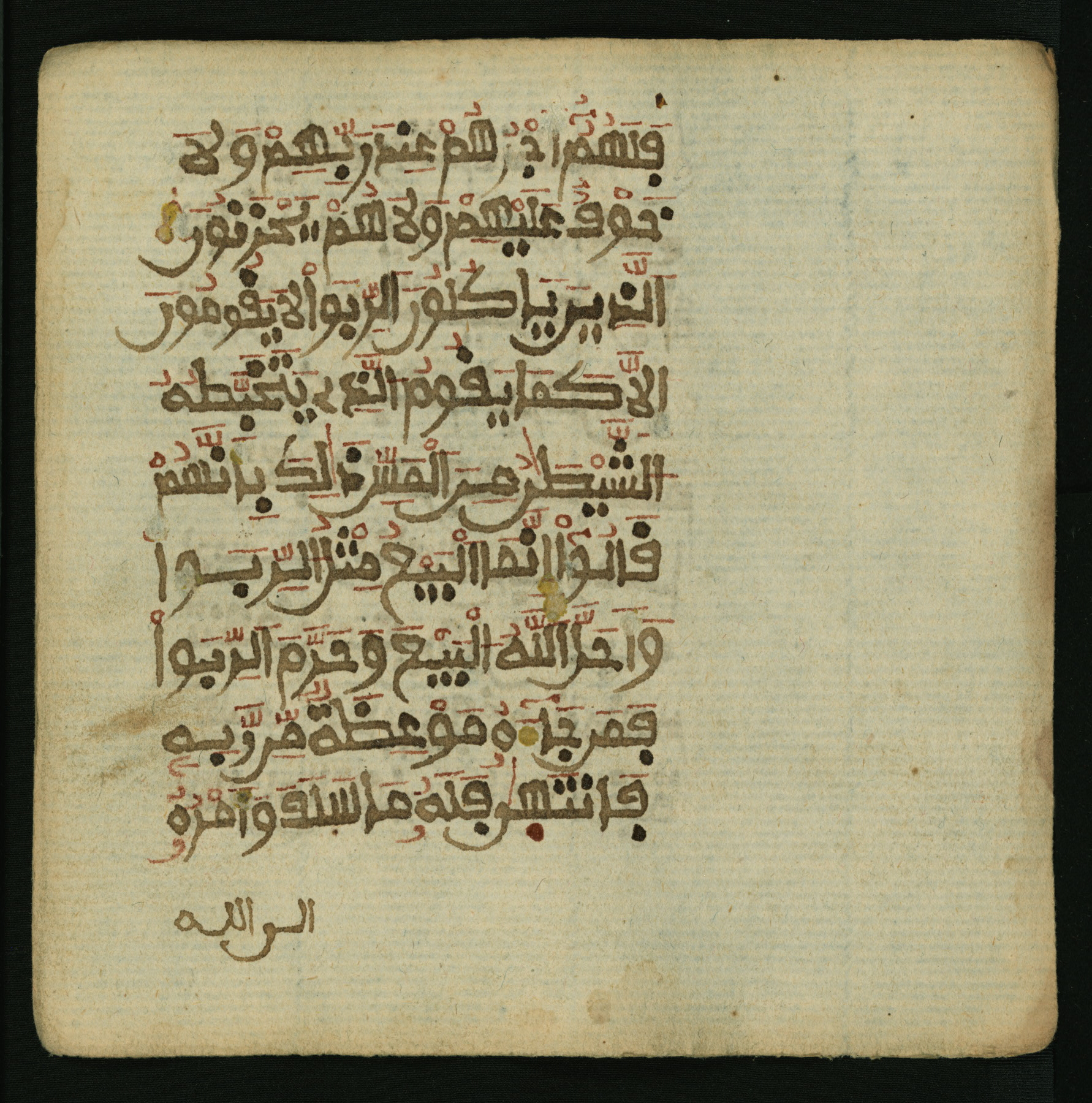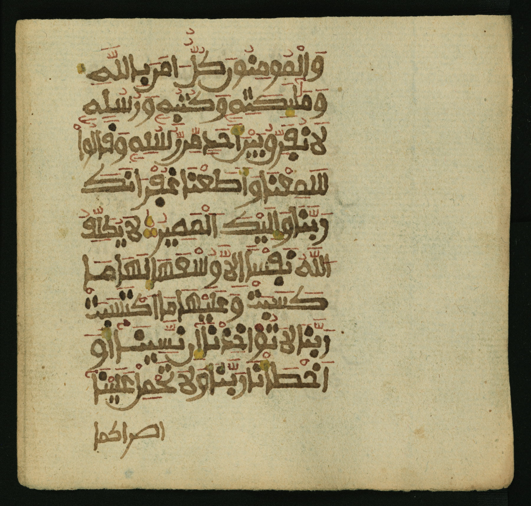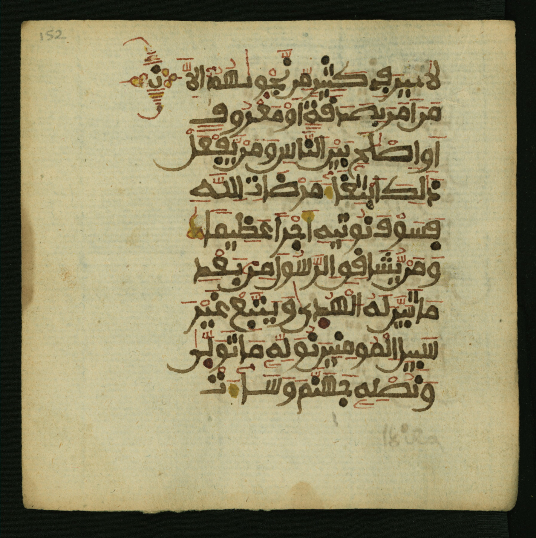 This square-format manuscript is volume 1, containing chapters 1-18 (Sūrat al-fātiḥah through Sūrat al-kahf), of an illuminated two-volume Qur'an produced in Sub-Saharan (West) Africa in the thirteenth century AH / nineteenth CE. The text is written in Sūdānī script in dark brown ink with vocalization in red on loose leaves. Chapter headings are in reddish-brown ink. Three yellow dots outlined in red arranged in a triangular form separate verses. Polychrome circular medallions as well as square and rectangular devices in a variety of patterns and colors mark textual divisions. The leaves of the text are organized between two decorated boards with geometric compositions. The pages and boards are housed in a leather pouch (satchel).