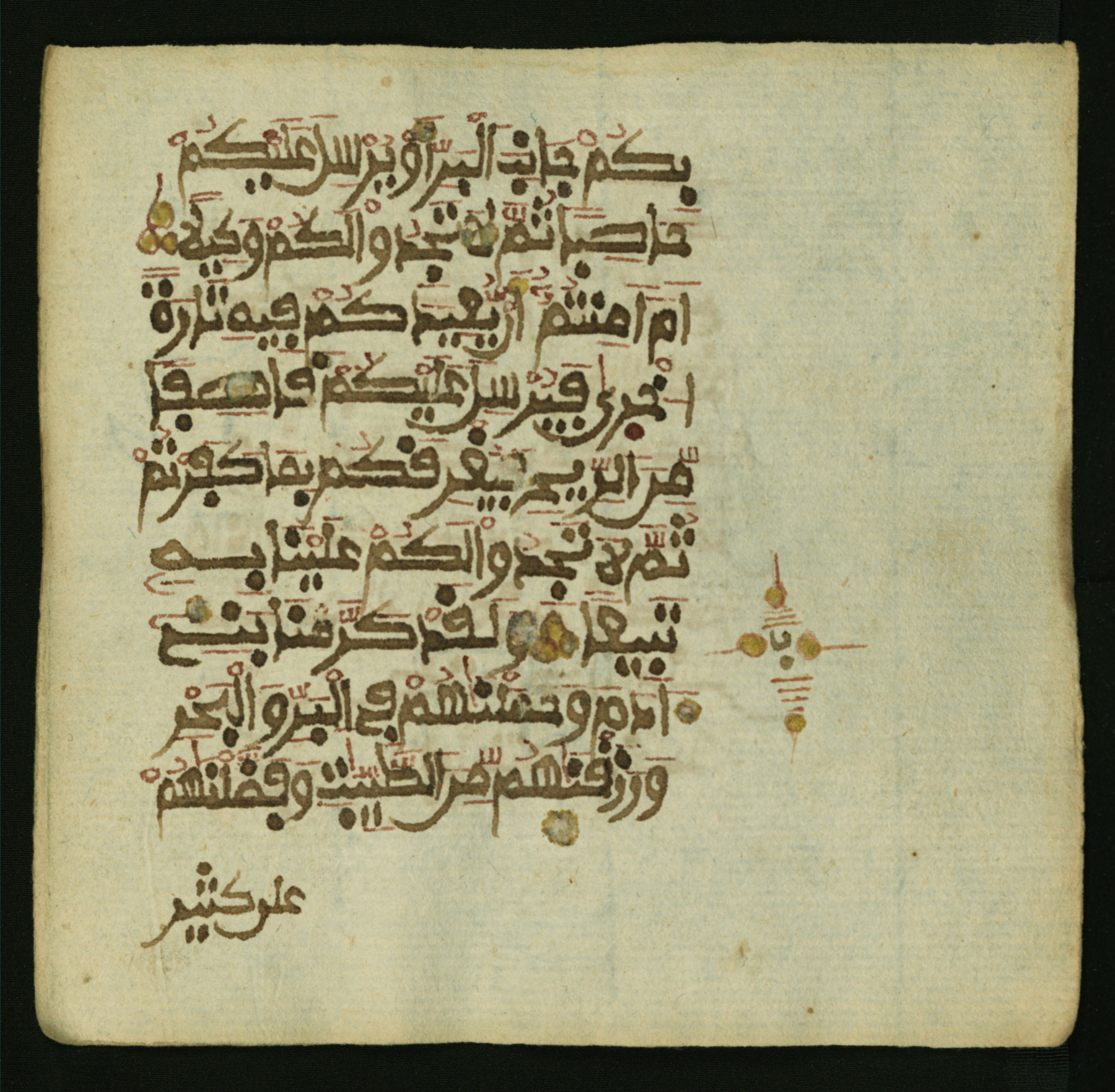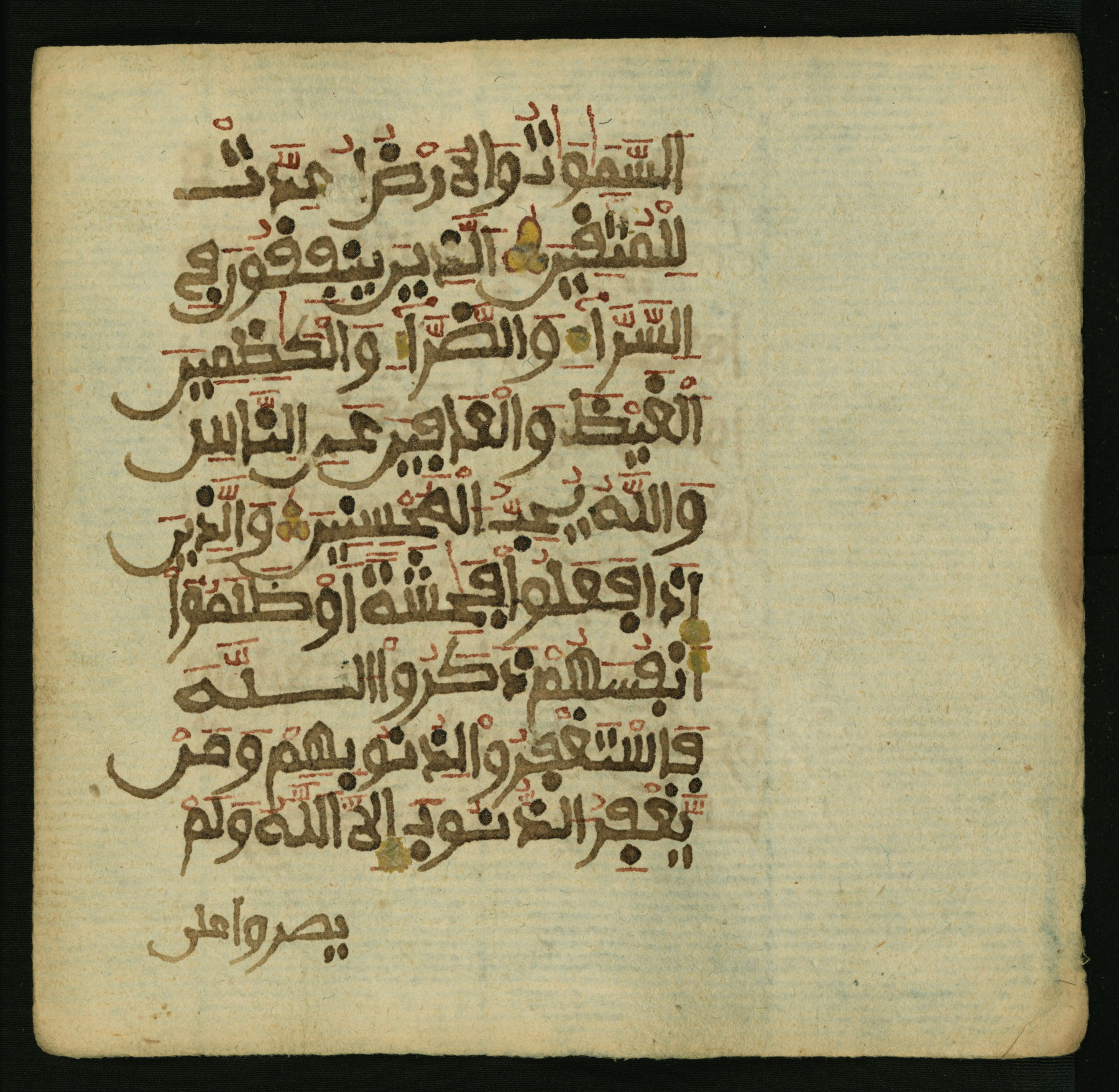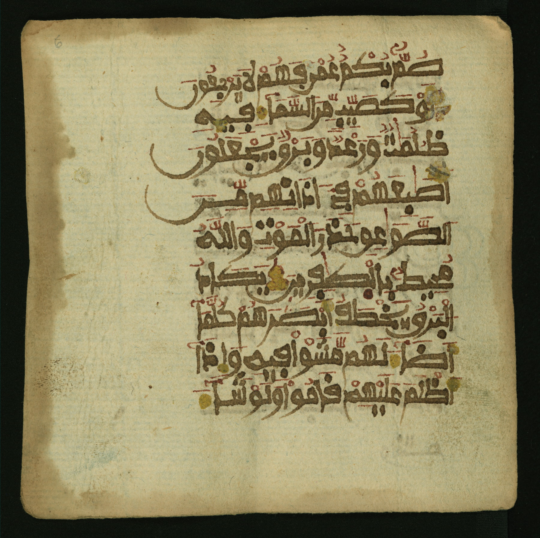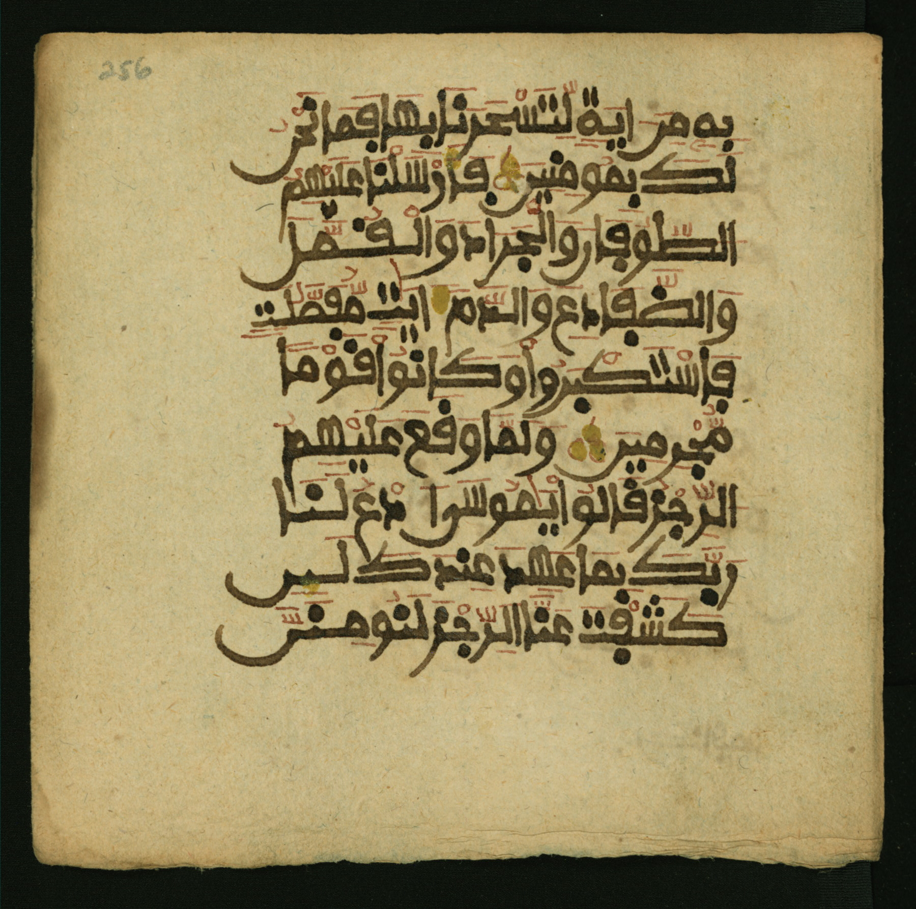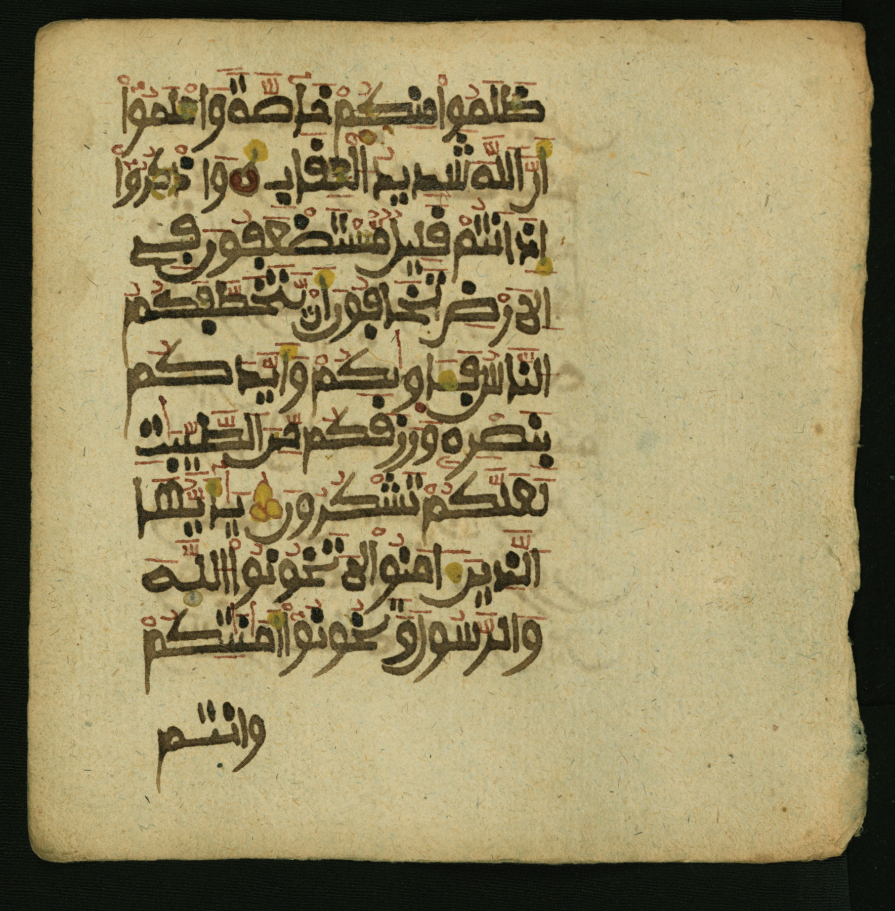 This square-format manuscript is volume 1, containing chapters 1-18 (Sūrat al-fātiḥah through Sūrat al-kahf), of an illuminated two-volume Qur'an produced in Sub-Saharan (West) Africa in the thirteenth century AH / nineteenth CE. The text is written in Sūdānī script in dark brown ink with vocalization in red on loose leaves. Chapter headings are in reddish-brown ink. Three yellow dots outlined in red arranged in a triangular form separate verses. Polychrome circular medallions as well as square and rectangular devices in a variety of patterns and colors mark textual divisions. The leaves of the text are organized between two decorated boards with geometric compositions. The pages and boards are housed in a leather pouch (satchel).