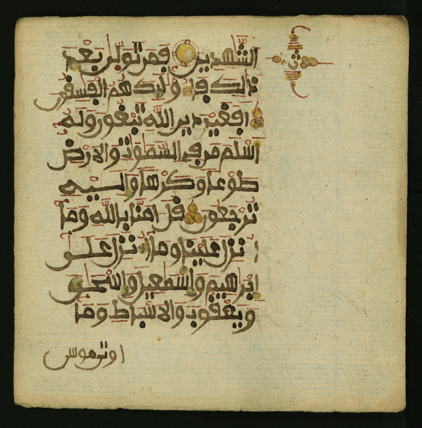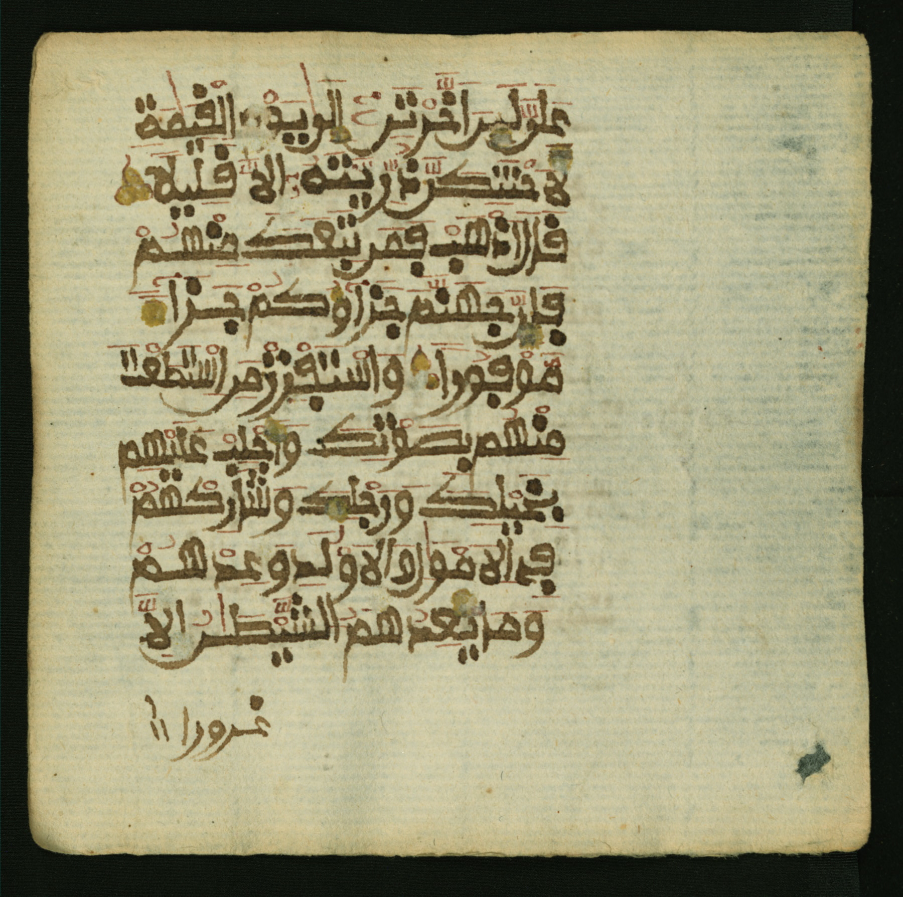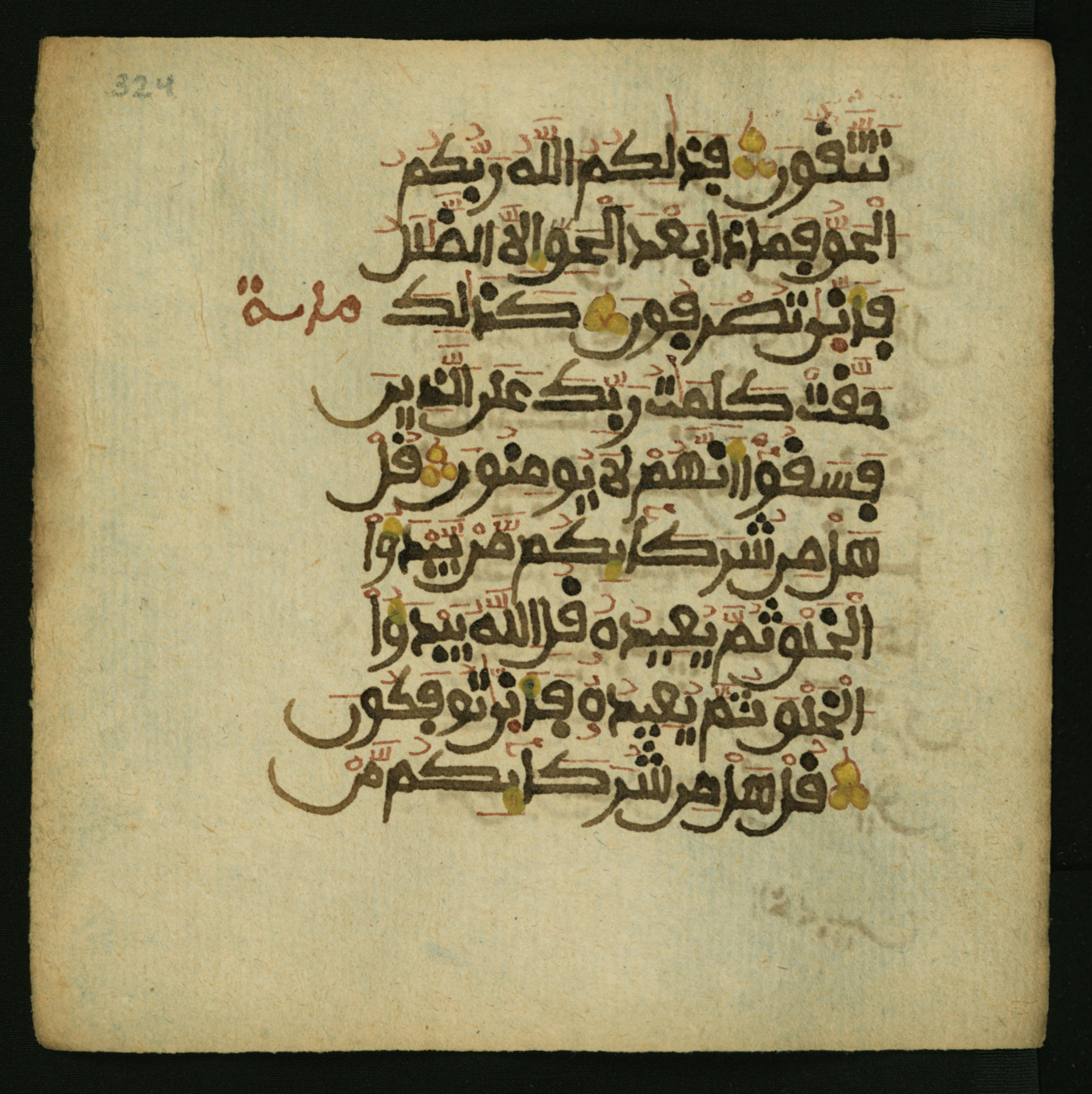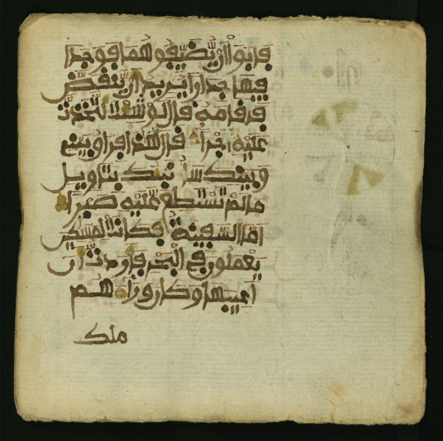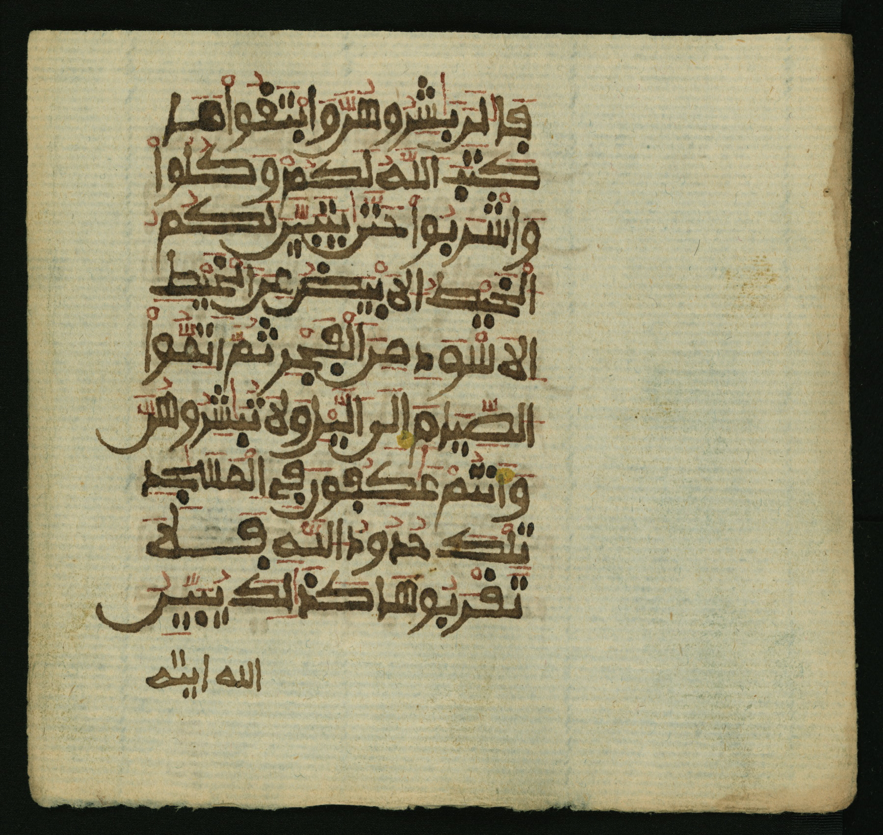 This square-format manuscript is volume 1, containing chapters 1-18 (Sūrat al-fātiḥah through Sūrat al-kahf), of an illuminated two-volume Qur'an produced in Sub-Saharan (West) Africa in the thirteenth century AH / nineteenth CE. The text is written in Sūdānī script in dark brown ink with vocalization in red on loose leaves. Chapter headings are in reddish-brown ink. Three yellow dots outlined in red arranged in a triangular form separate verses. Polychrome circular medallions as well as square and rectangular devices in a variety of patterns and colors mark textual divisions. The leaves of the text are organized between two decorated boards with geometric compositions. The pages and boards are housed in a leather pouch (satchel).