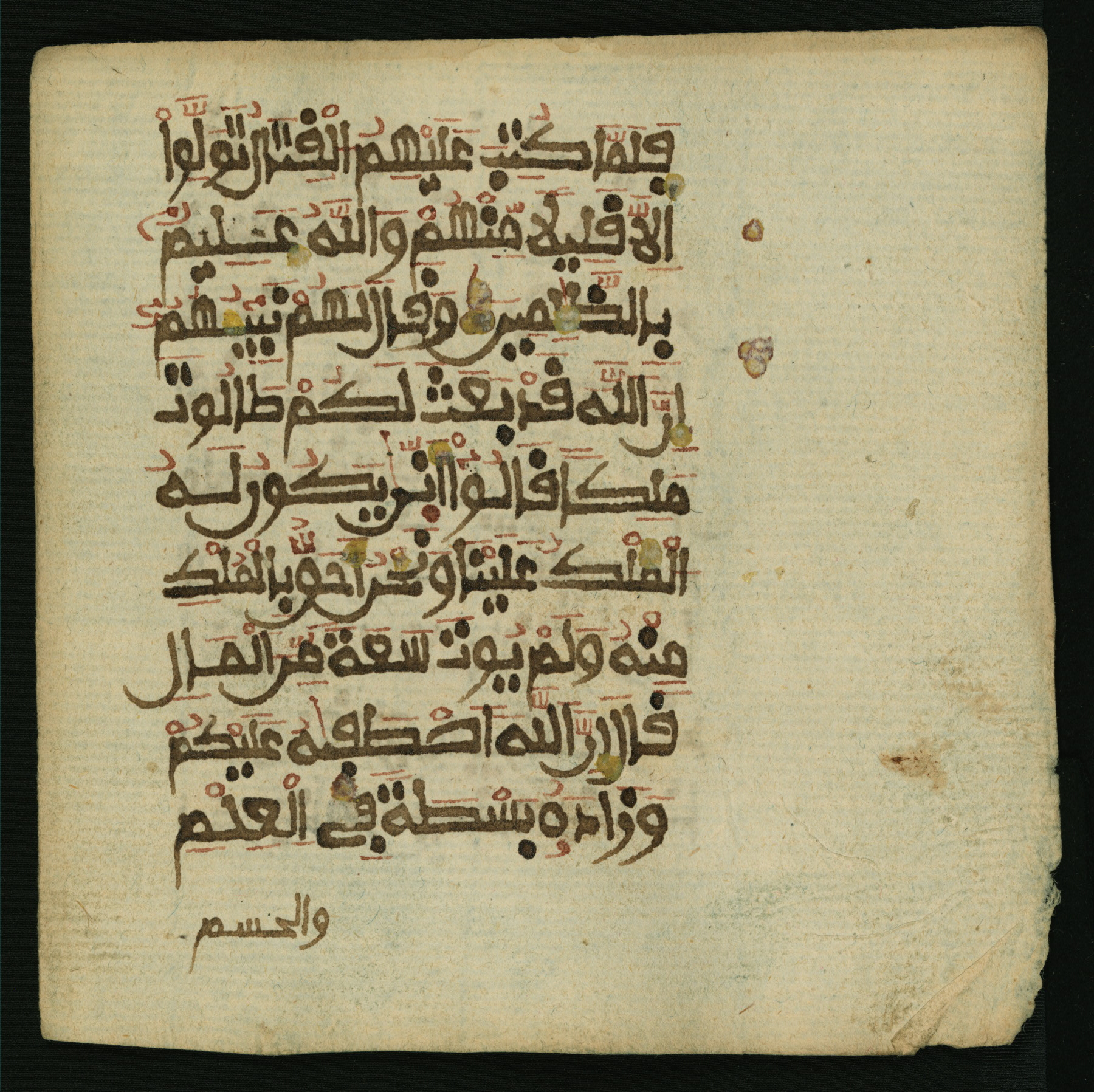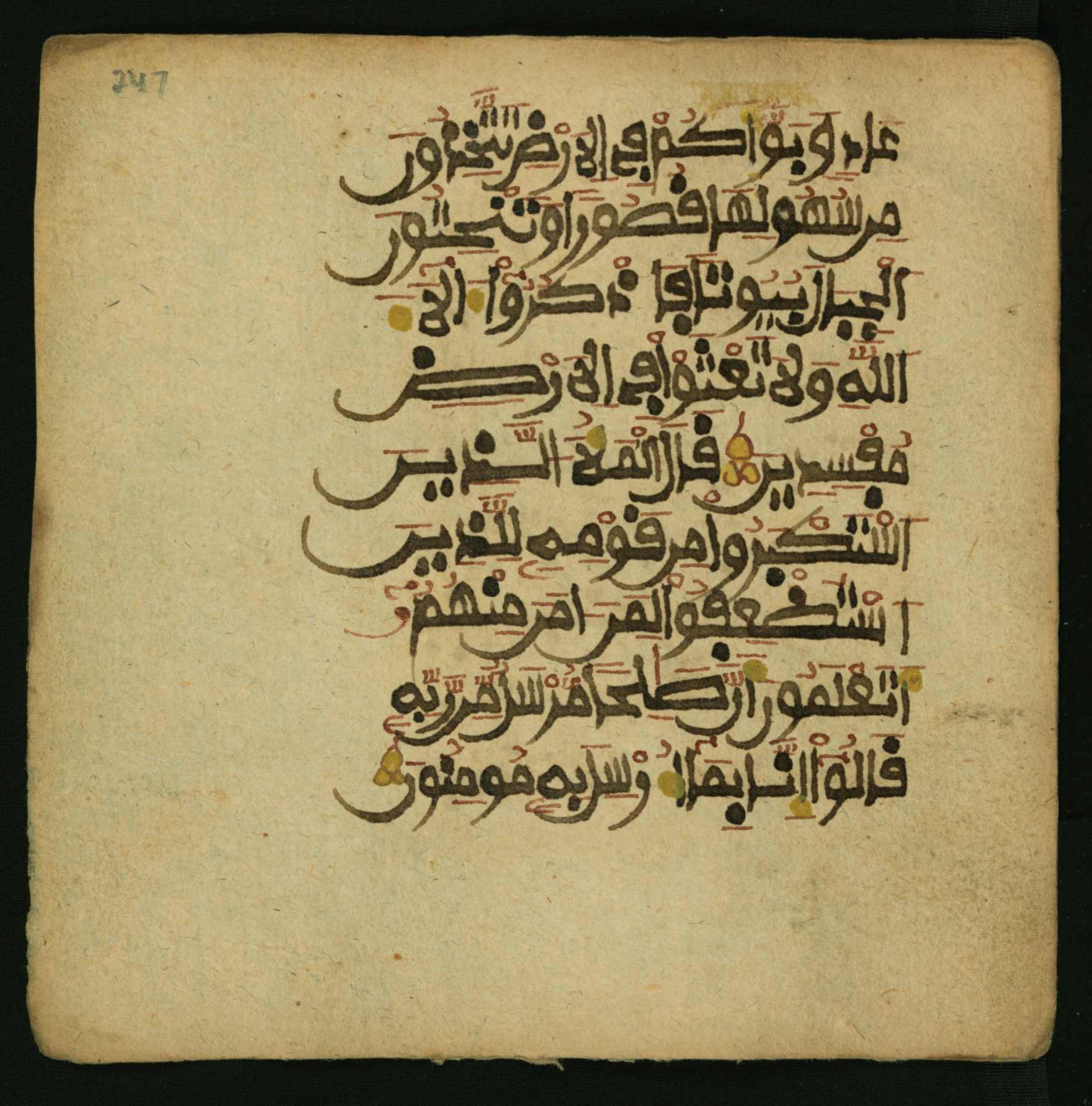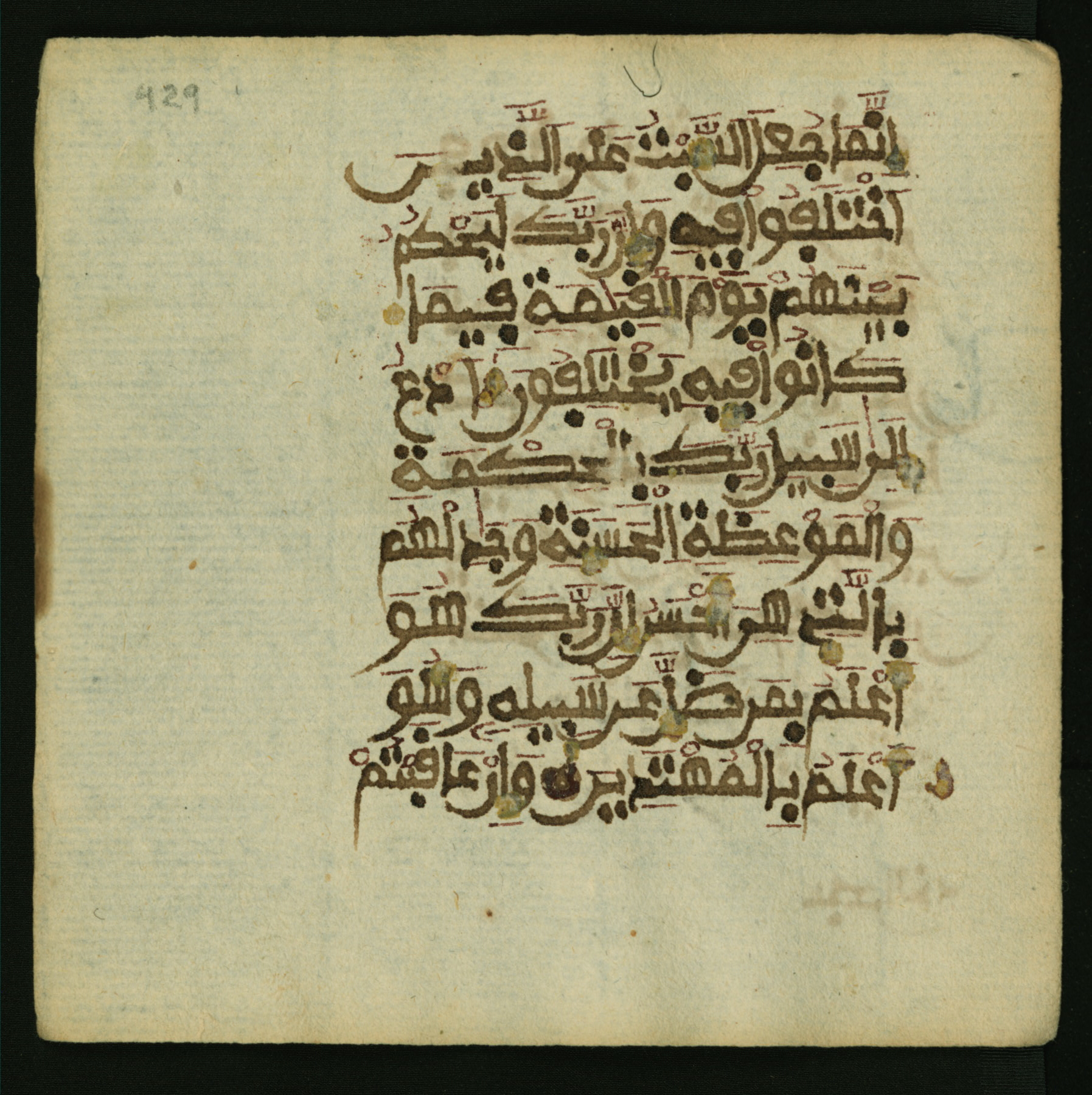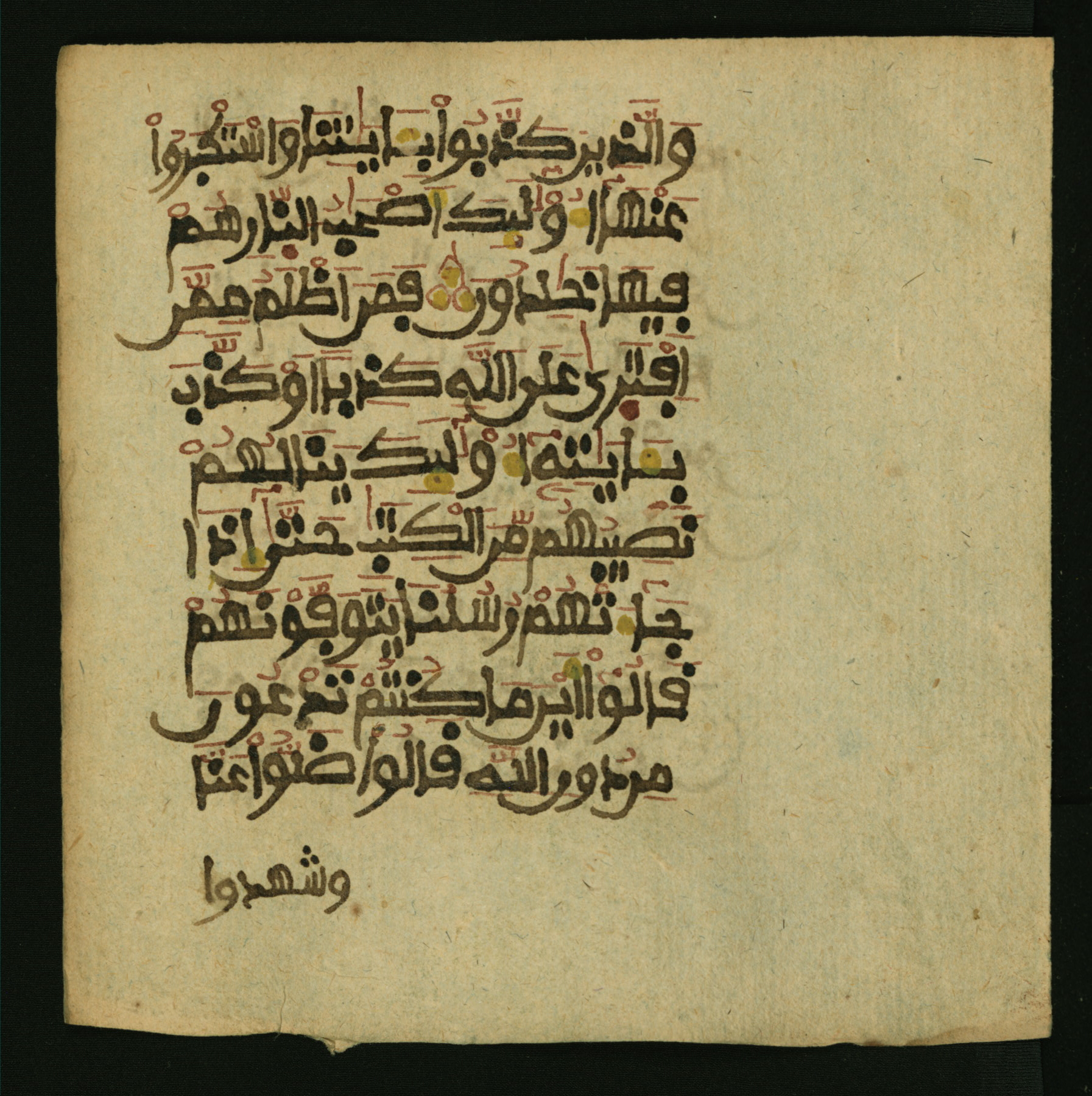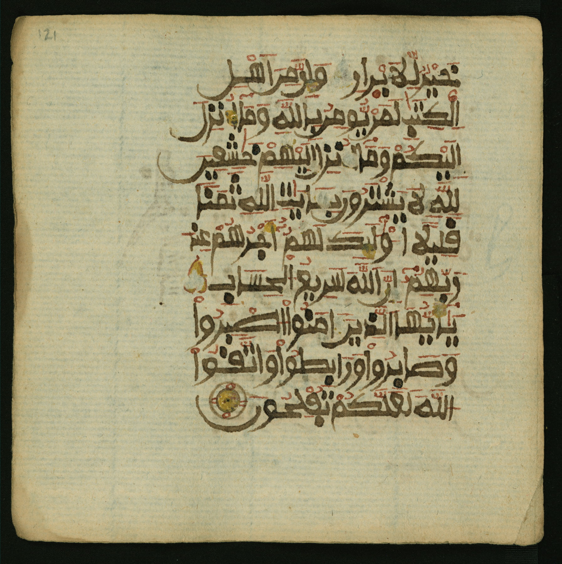 This square-format manuscript is volume 1, containing chapters 1-18 (Sūrat al-fātiḥah through Sūrat al-kahf), of an illuminated two-volume Qur'an produced in Sub-Saharan (West) Africa in the thirteenth century AH / nineteenth CE. The text is written in Sūdānī script in dark brown ink with vocalization in red on loose leaves. Chapter headings are in reddish-brown ink. Three yellow dots outlined in red arranged in a triangular form separate verses. Polychrome circular medallions as well as square and rectangular devices in a variety of patterns and colors mark textual divisions. The leaves of the text are organized between two decorated boards with geometric compositions. The pages and boards are housed in a leather pouch (satchel).