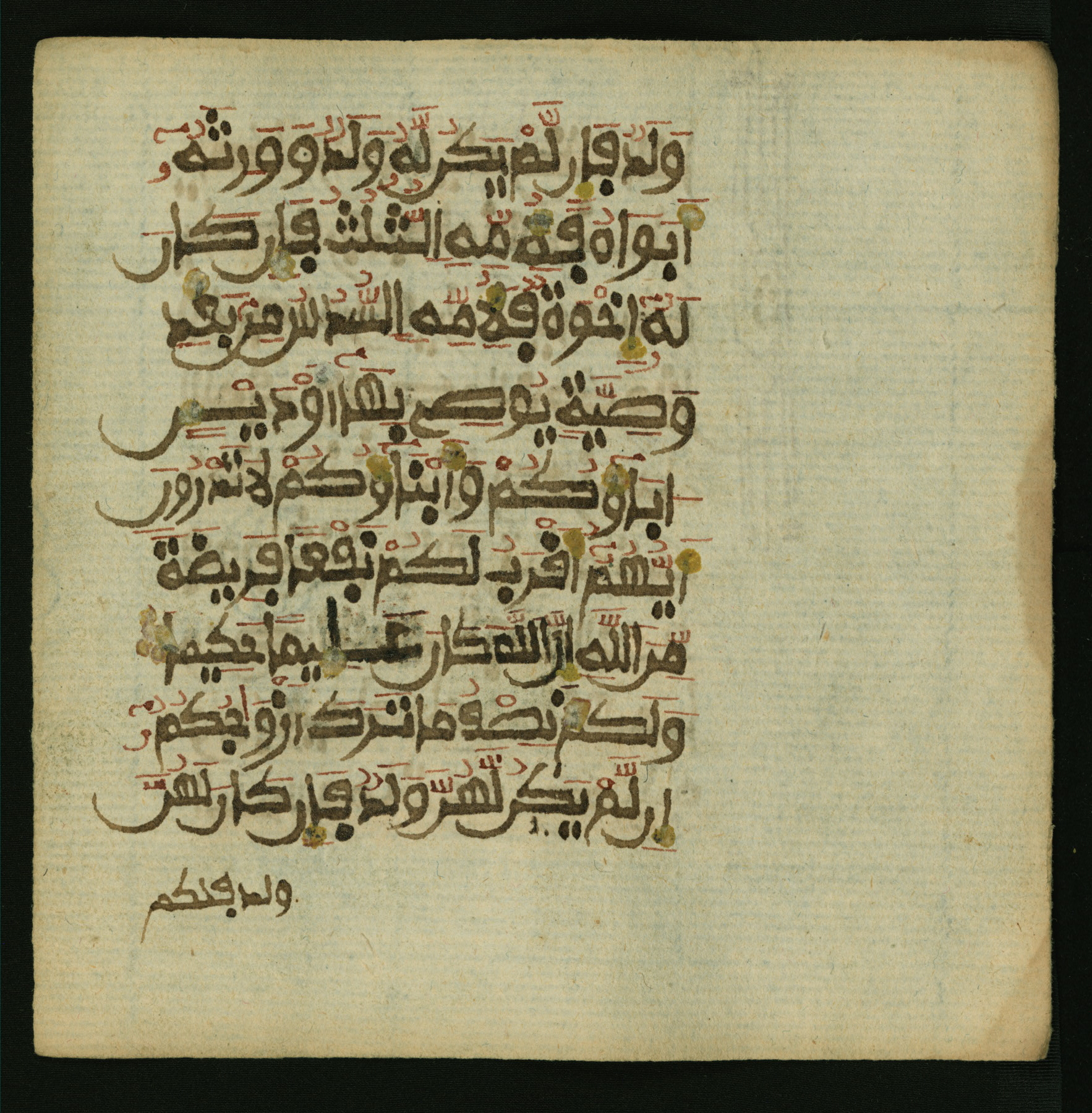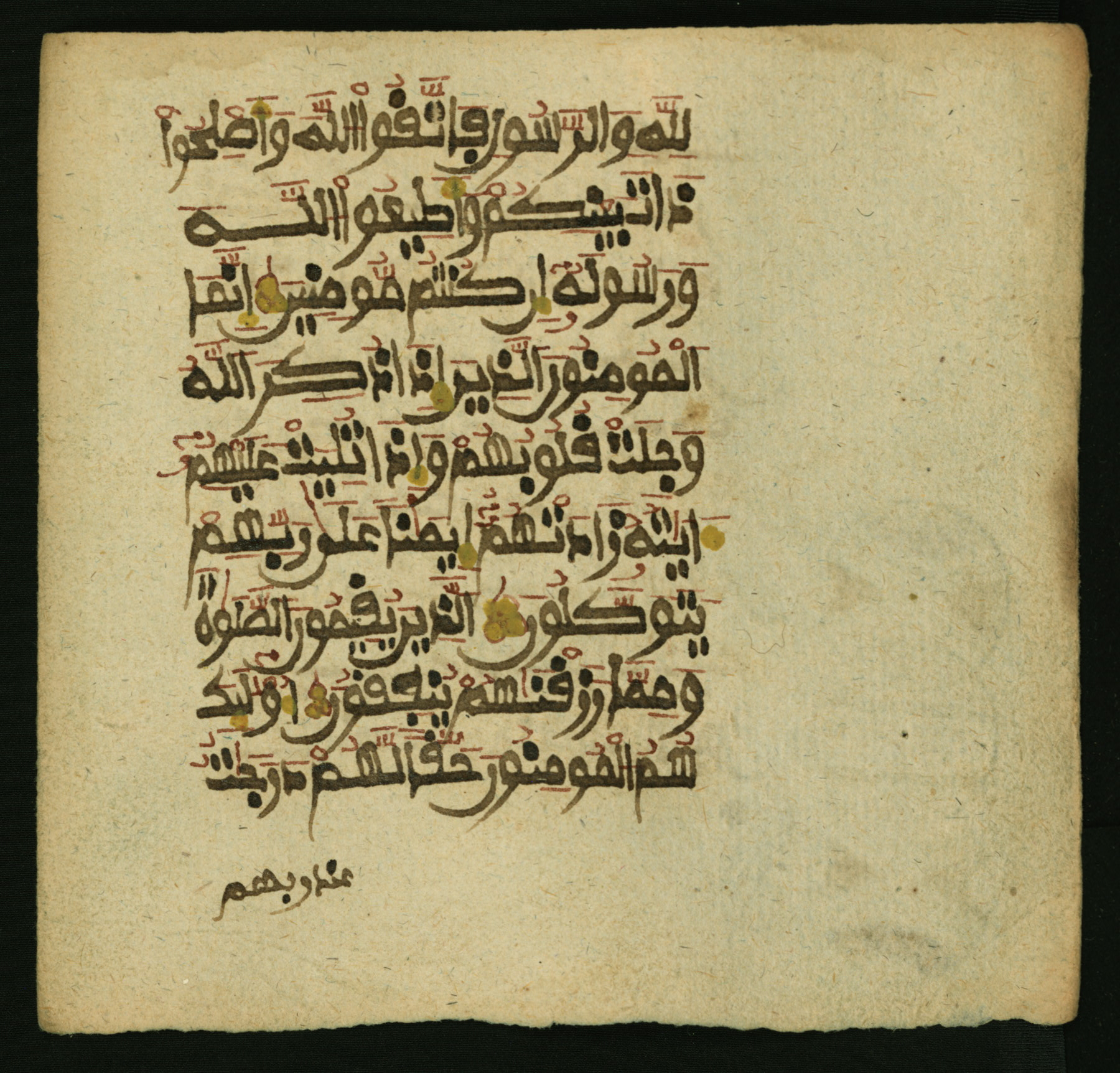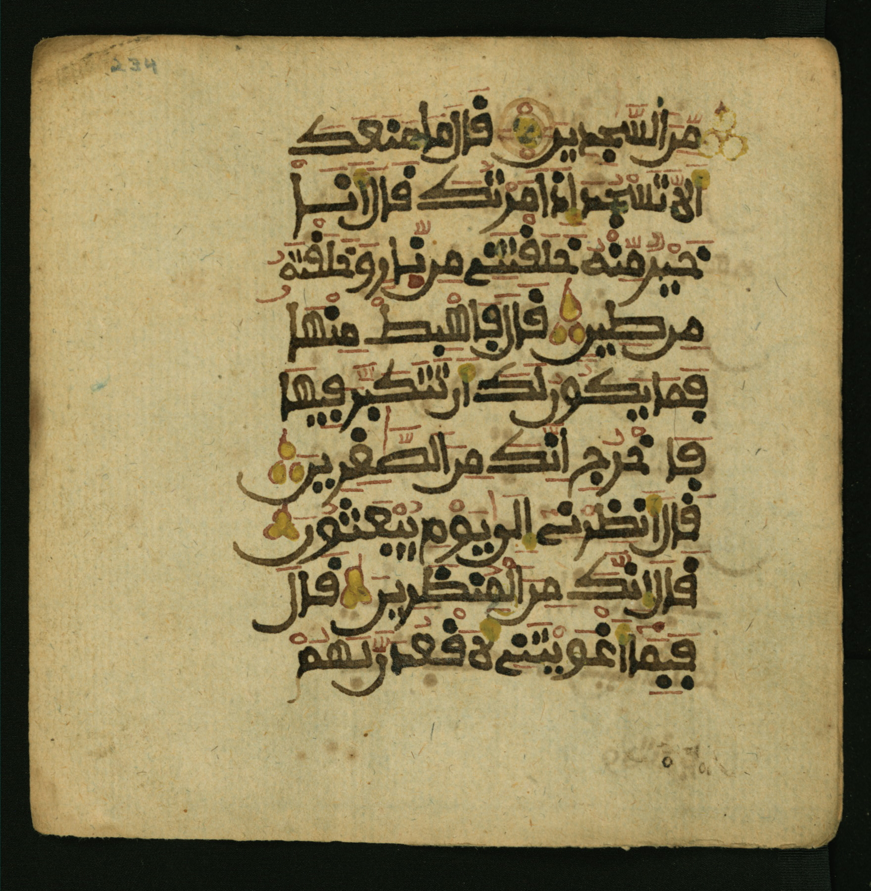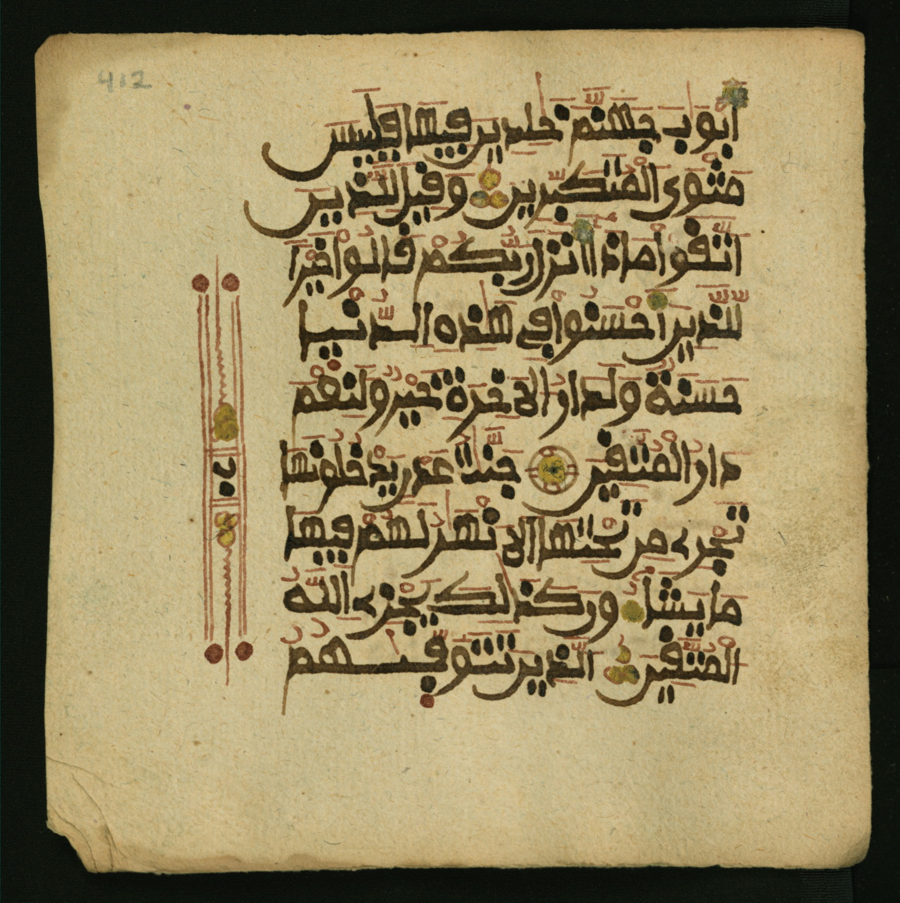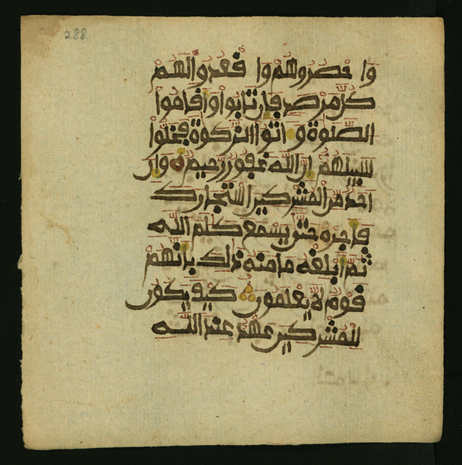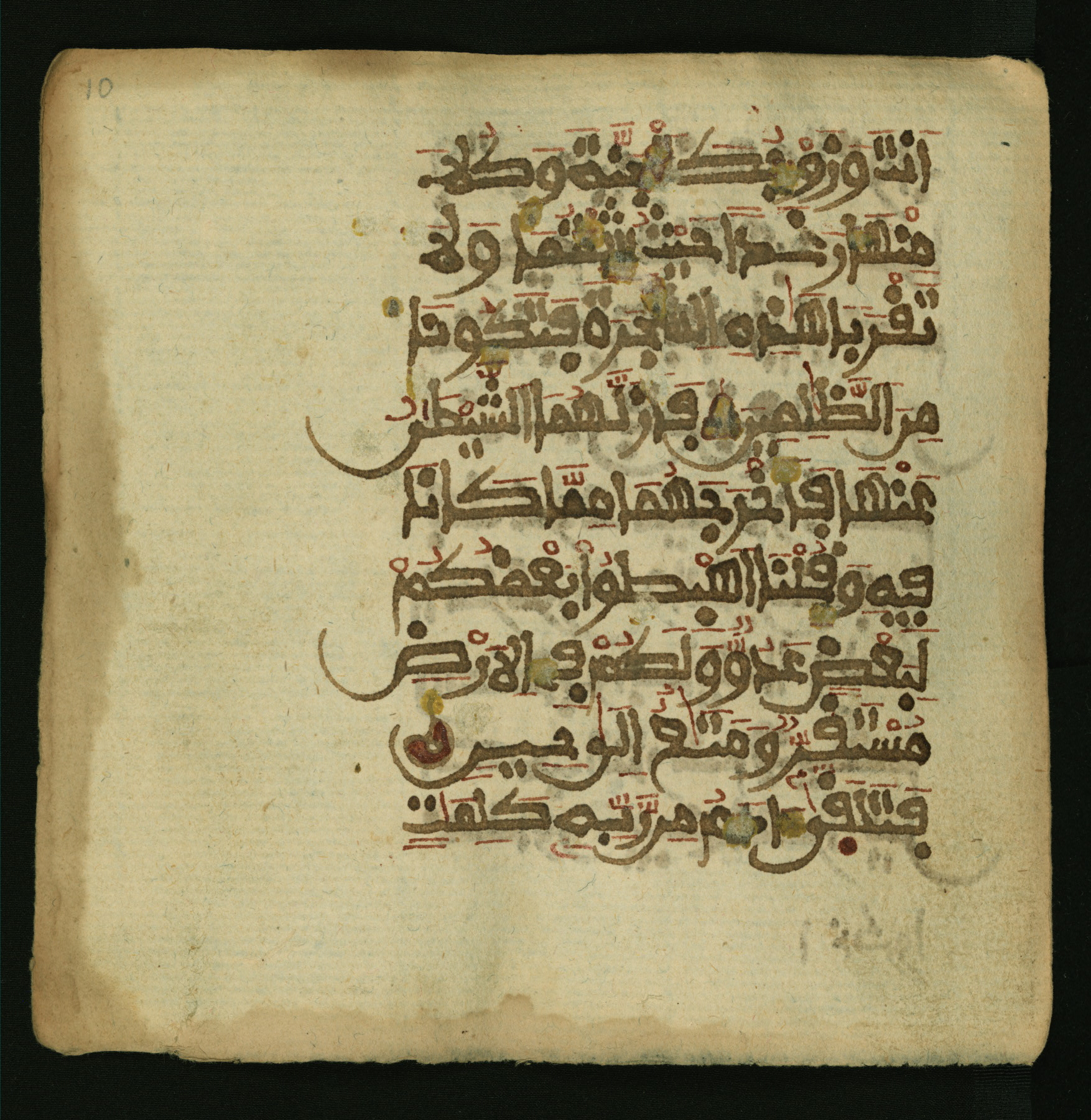 This square-format manuscript is volume 1, containing chapters 1-18 (Sūrat al-fātiḥah through Sūrat al-kahf), of an illuminated two-volume Qur'an produced in Sub-Saharan (West) Africa in the thirteenth century AH / nineteenth CE. The text is written in Sūdānī script in dark brown ink with vocalization in red on loose leaves. Chapter headings are in reddish-brown ink. Three yellow dots outlined in red arranged in a triangular form separate verses. Polychrome circular medallions as well as square and rectangular devices in a variety of patterns and colors mark textual divisions. The leaves of the text are organized between two decorated boards with geometric compositions. The pages and boards are housed in a leather pouch (satchel).