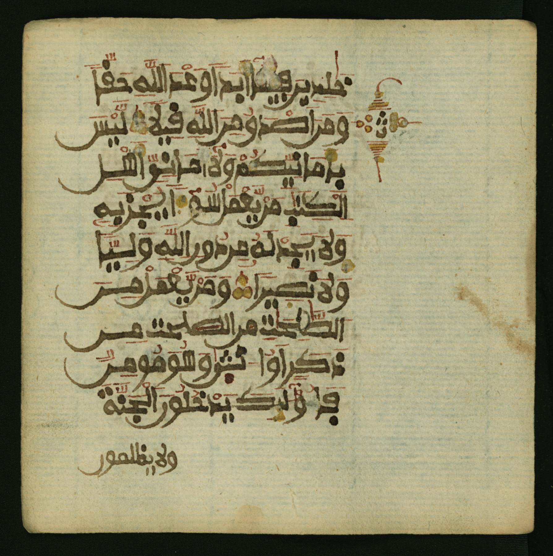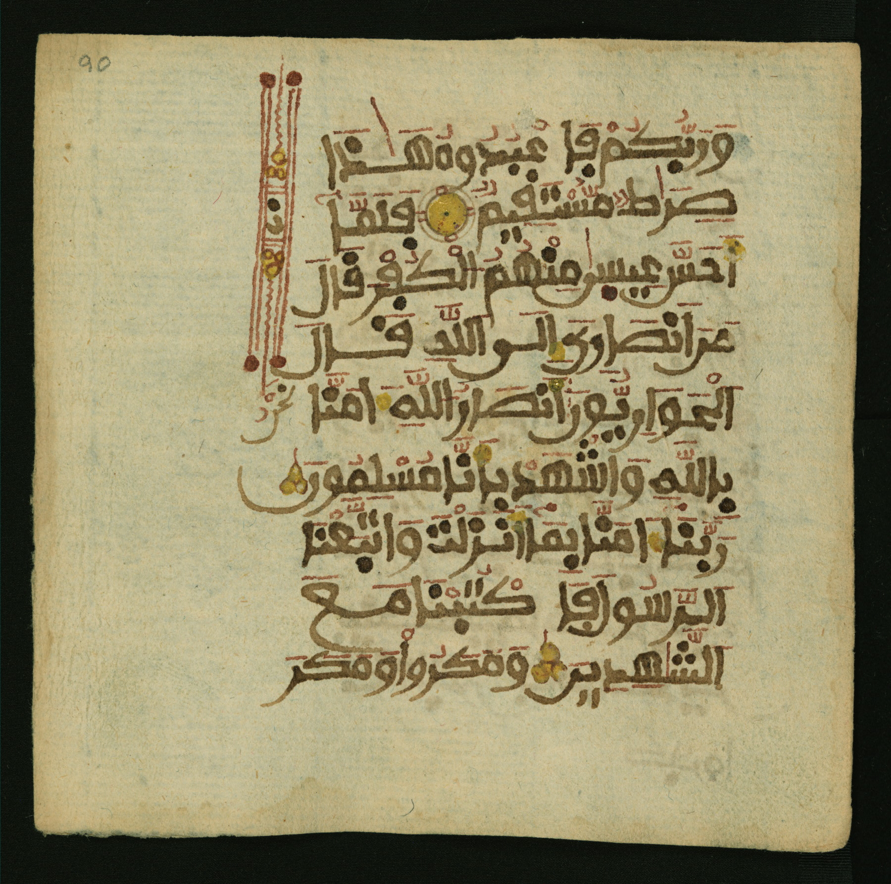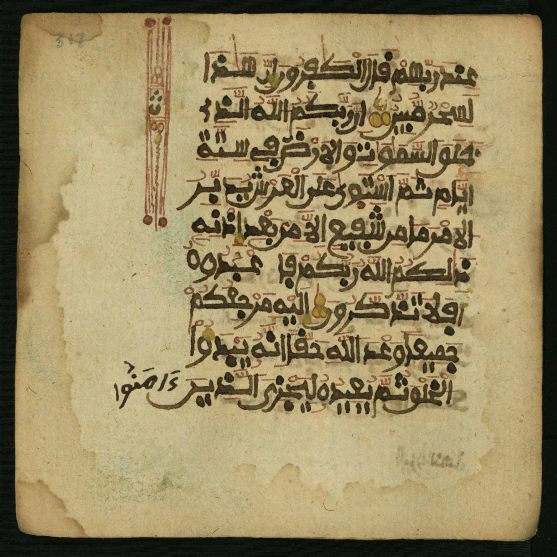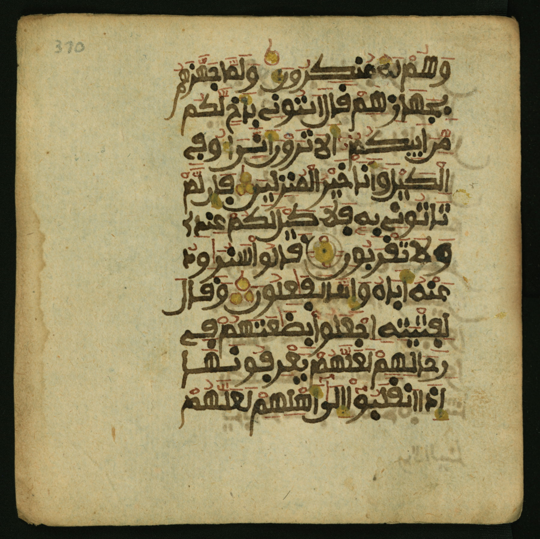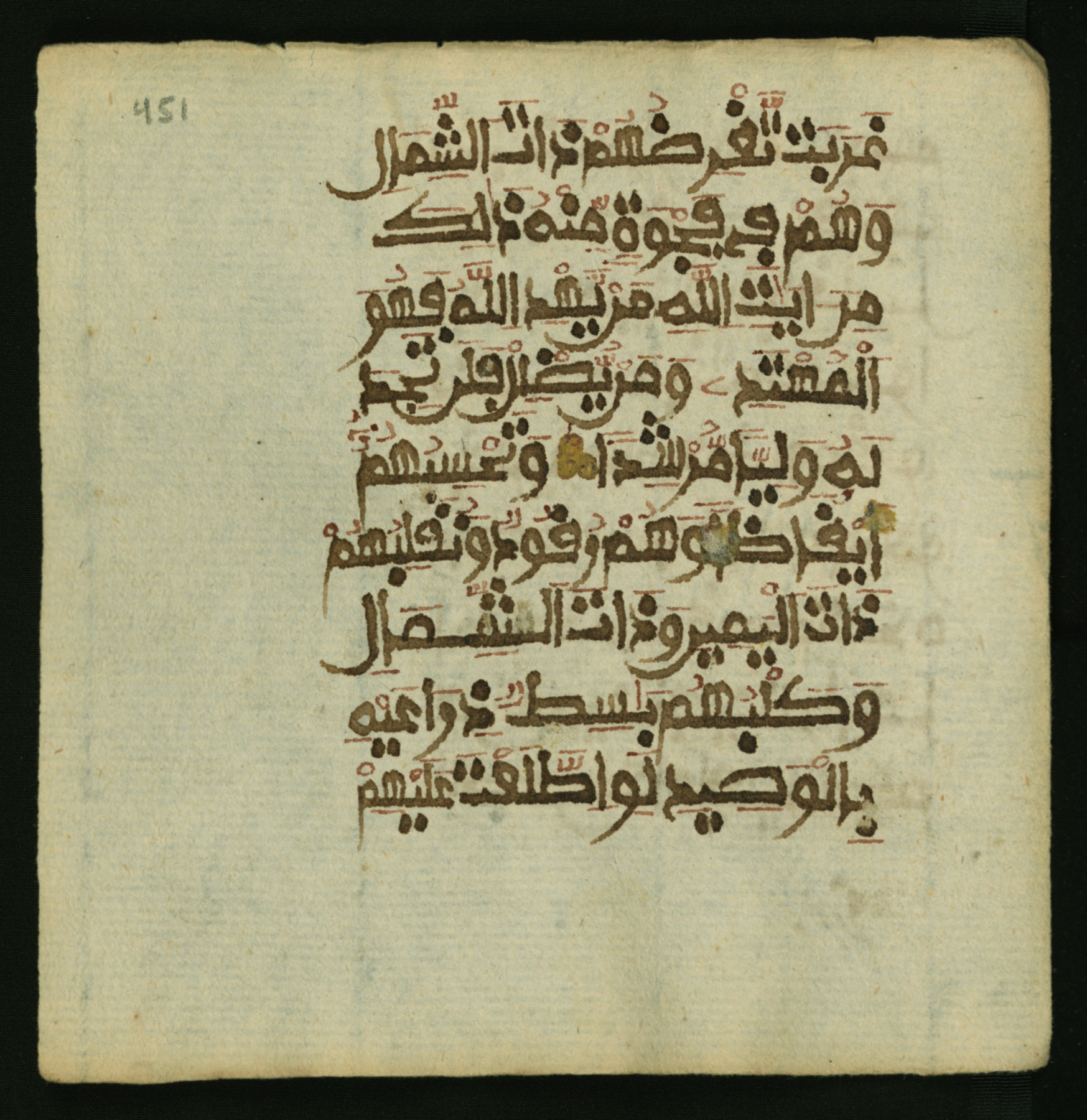 This square-format manuscript is volume 1, containing chapters 1-18 (Sūrat al-fātiḥah through Sūrat al-kahf), of an illuminated two-volume Qur'an produced in Sub-Saharan (West) Africa in the thirteenth century AH / nineteenth CE. The text is written in Sūdānī script in dark brown ink with vocalization in red on loose leaves. Chapter headings are in reddish-brown ink. Three yellow dots outlined in red arranged in a triangular form separate verses. Polychrome circular medallions as well as square and rectangular devices in a variety of patterns and colors mark textual divisions. The leaves of the text are organized between two decorated boards with geometric compositions. The pages and boards are housed in a leather pouch (satchel).