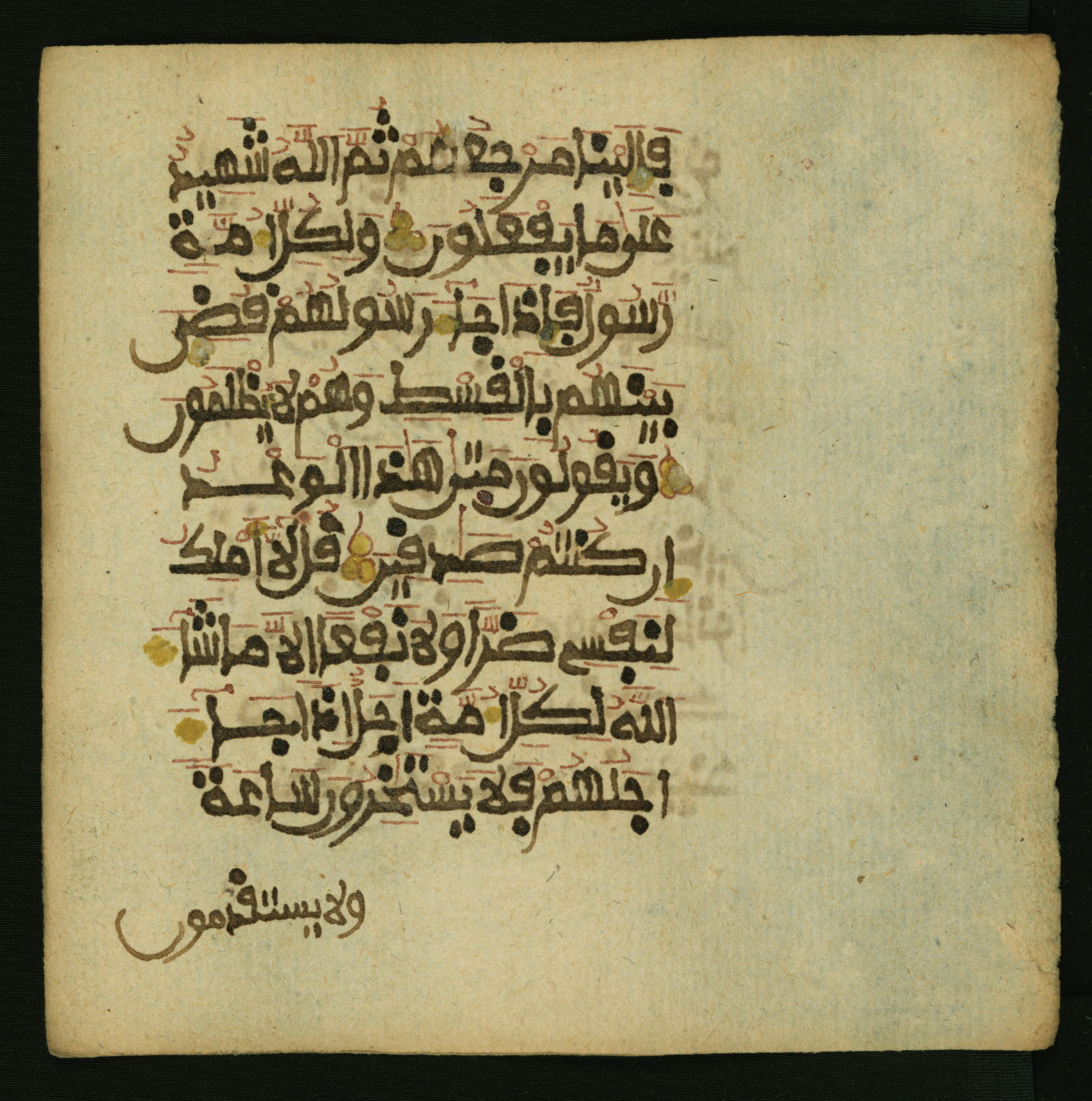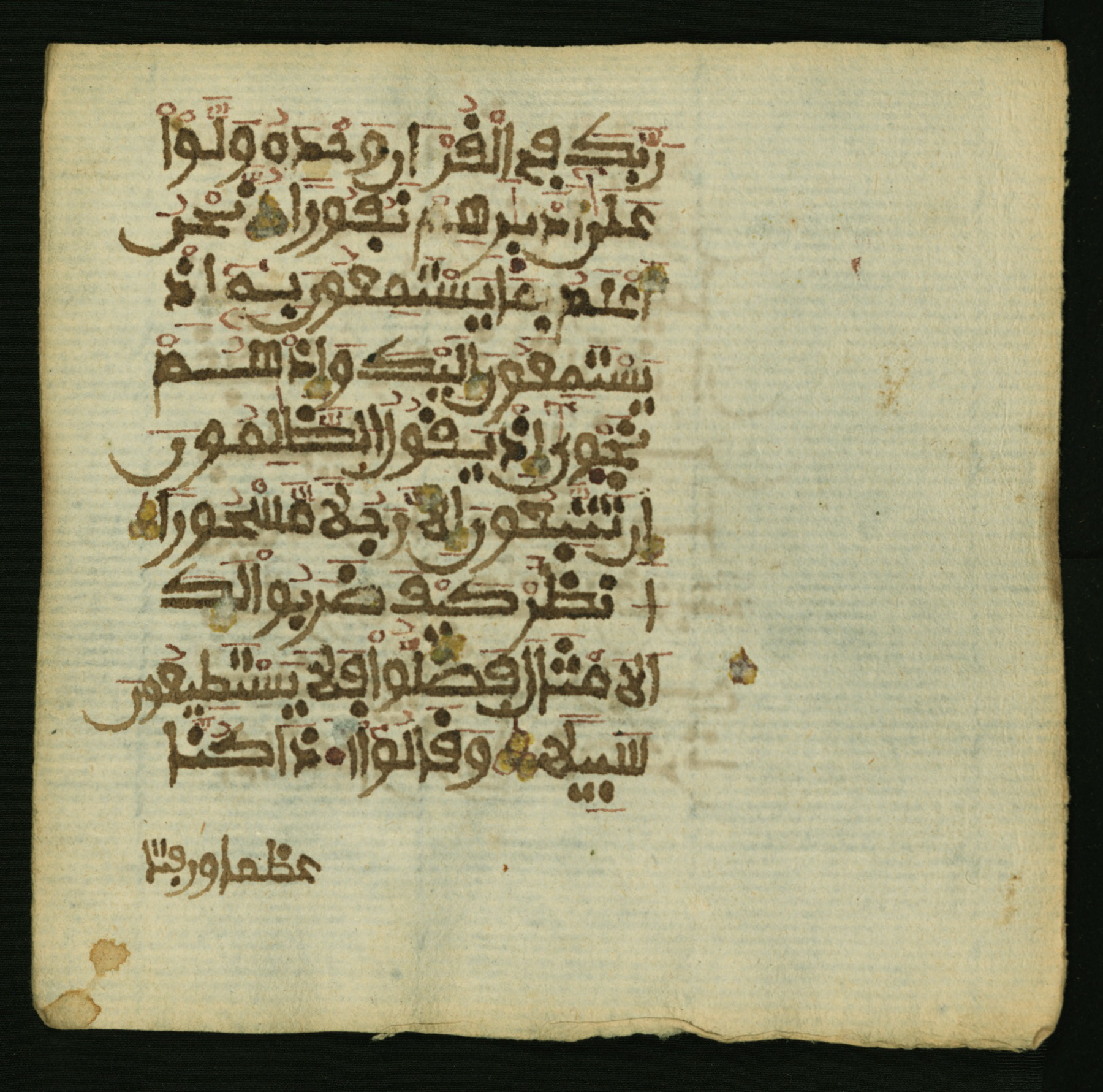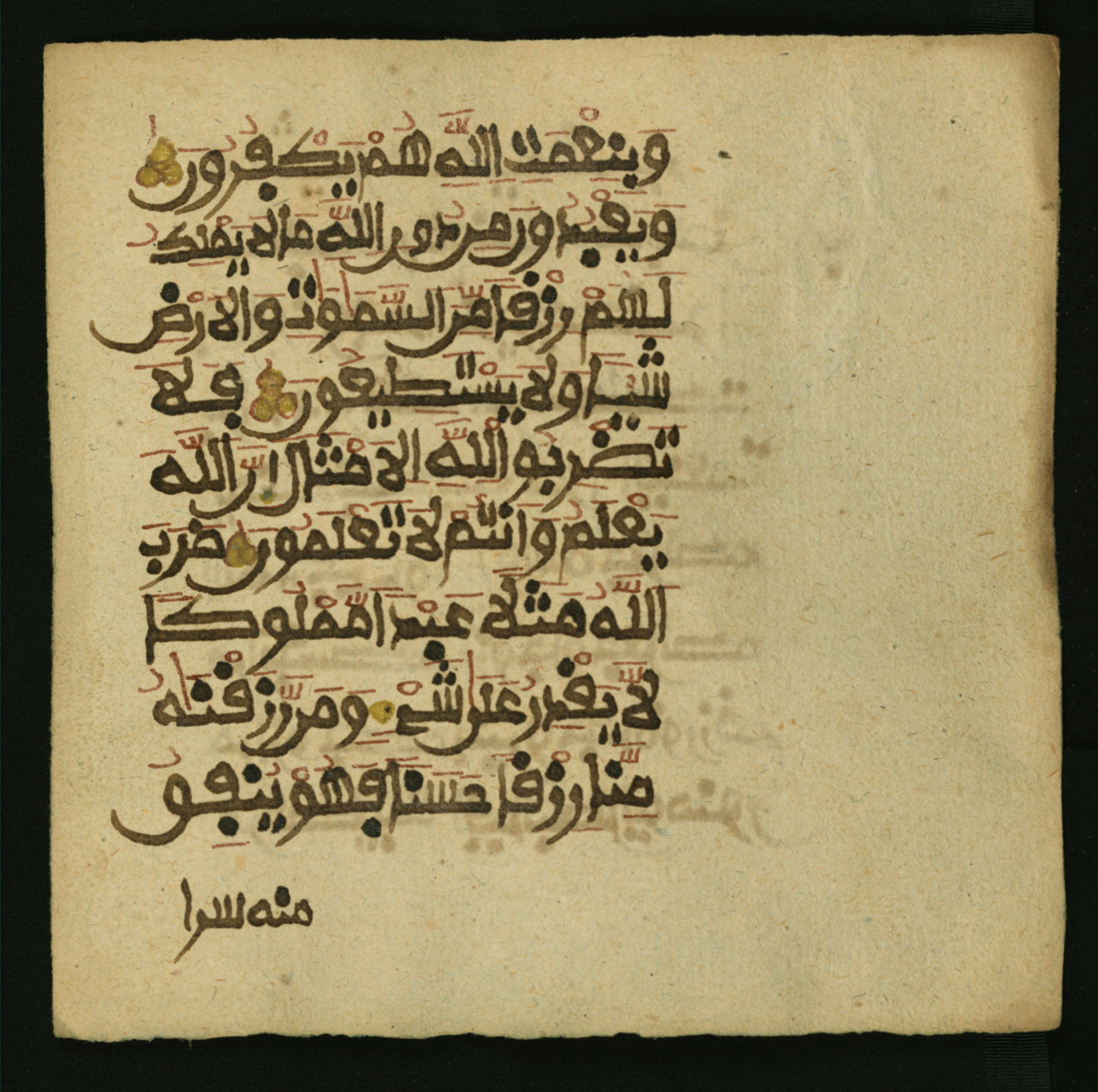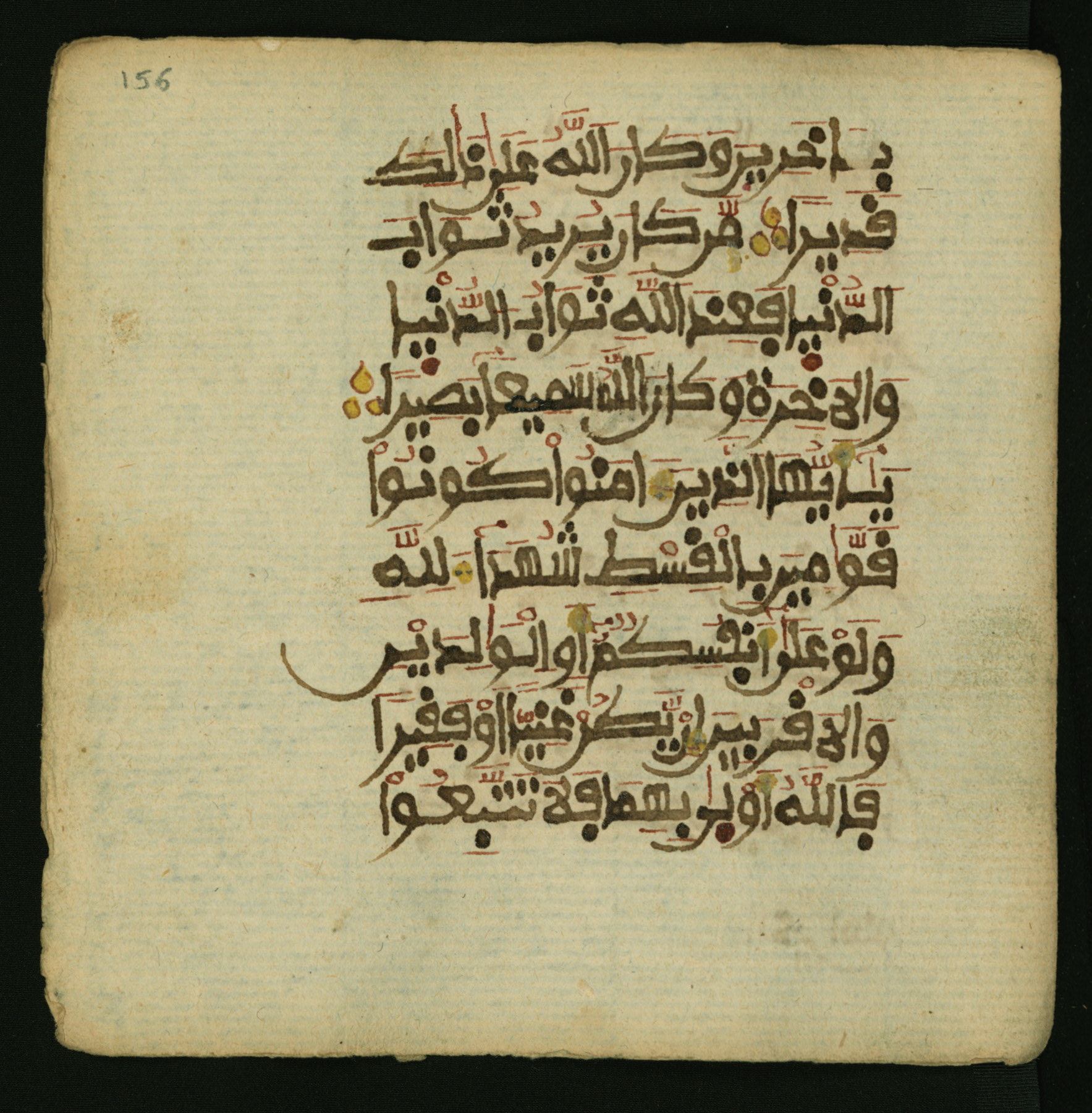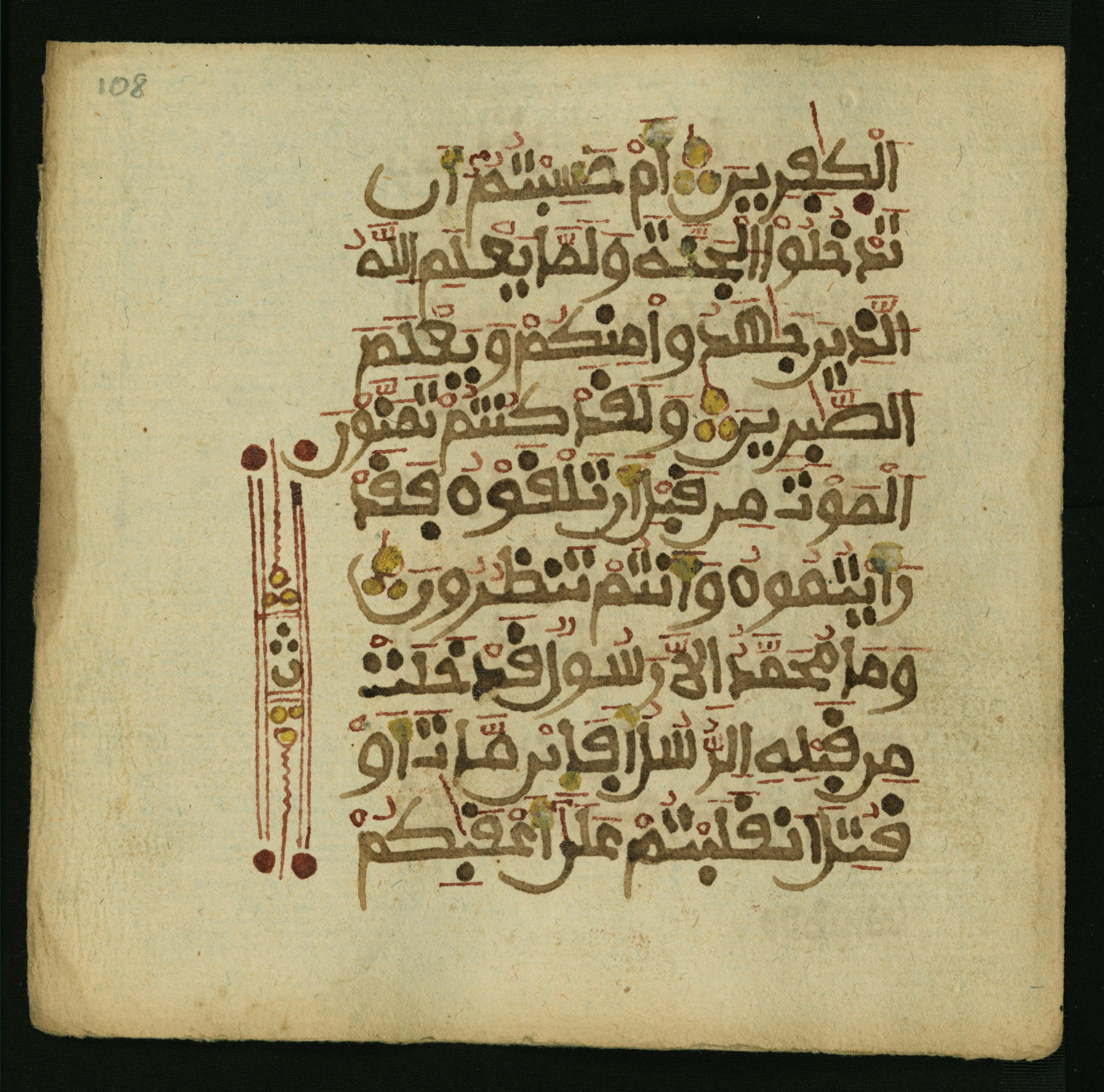This square-format manuscript is volume 1, containing chapters 1-18 (Sūrat al-fātiḥah through Sūrat al-kahf), of an illuminated two-volume Qur'an produced in Sub-Saharan (West) Africa in the thirteenth century AH / nineteenth CE. The text is written in Sūdānī script in dark brown ink with vocalization in red on loose leaves. Chapter headings are in reddish-brown ink. Three yellow dots outlined in red arranged in a triangular form separate verses. Polychrome circular medallions as well as square and rectangular devices in a variety of patterns and colors mark textual divisions. The leaves of the text are organized between two decorated boards with geometric compositions. The pages and boards are housed in a leather pouch (satchel).