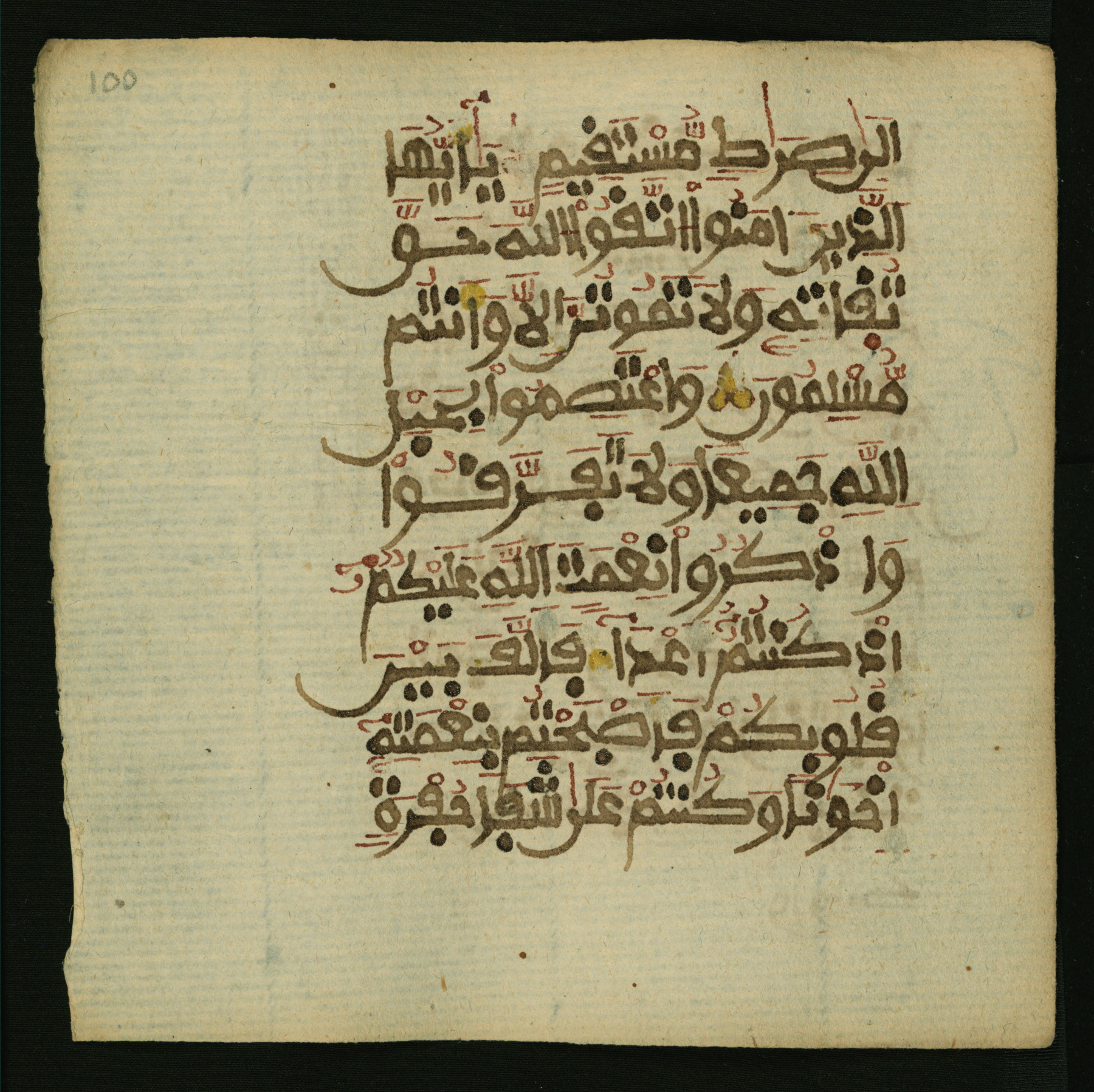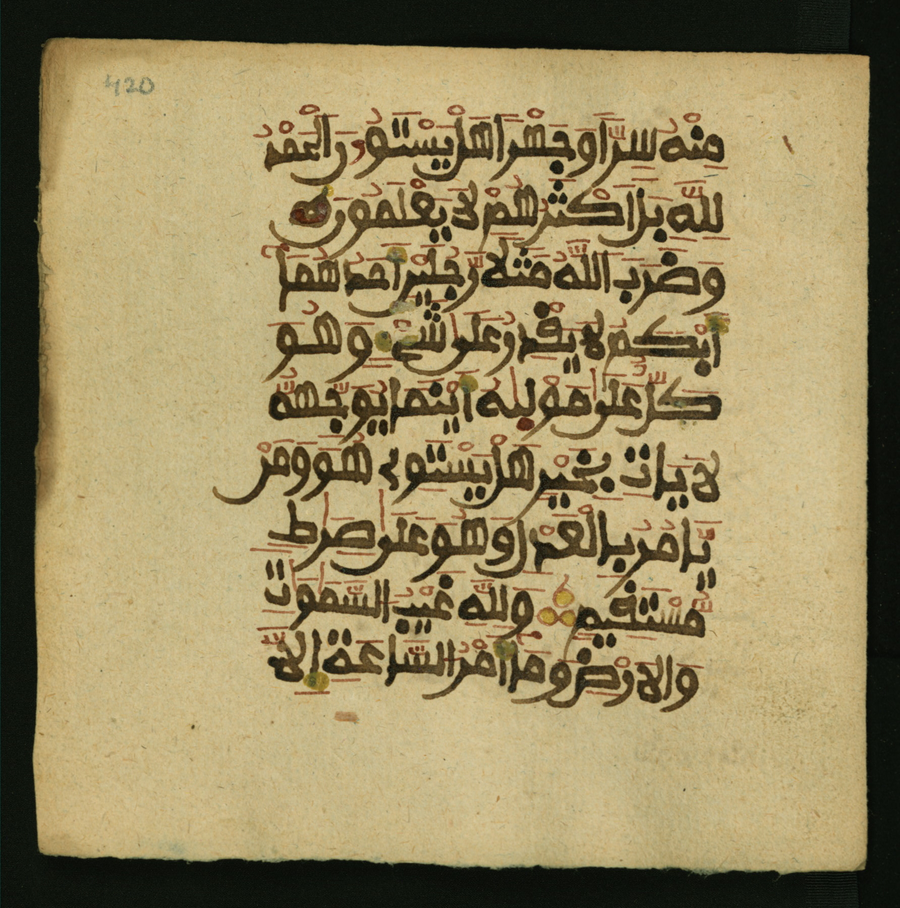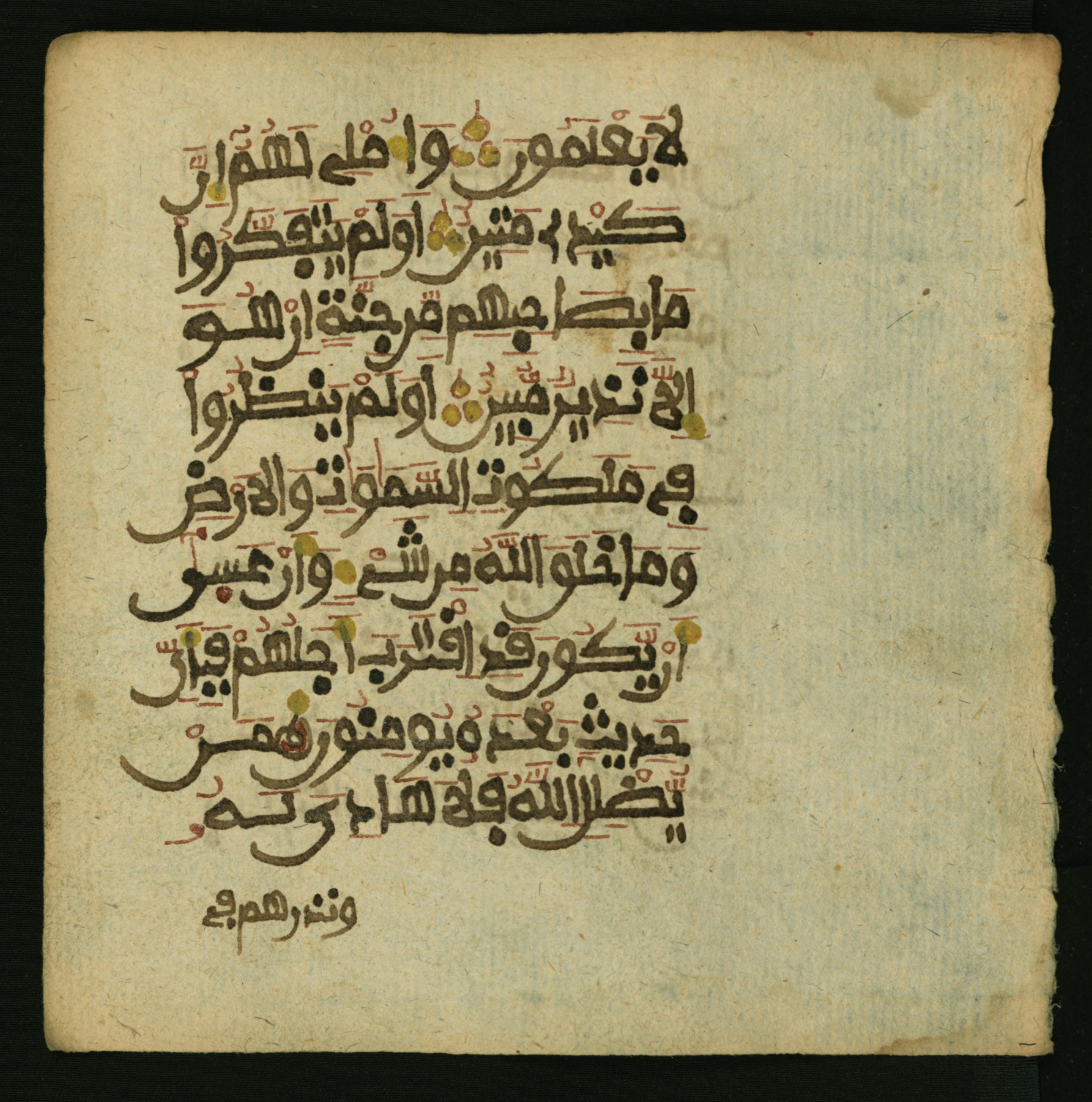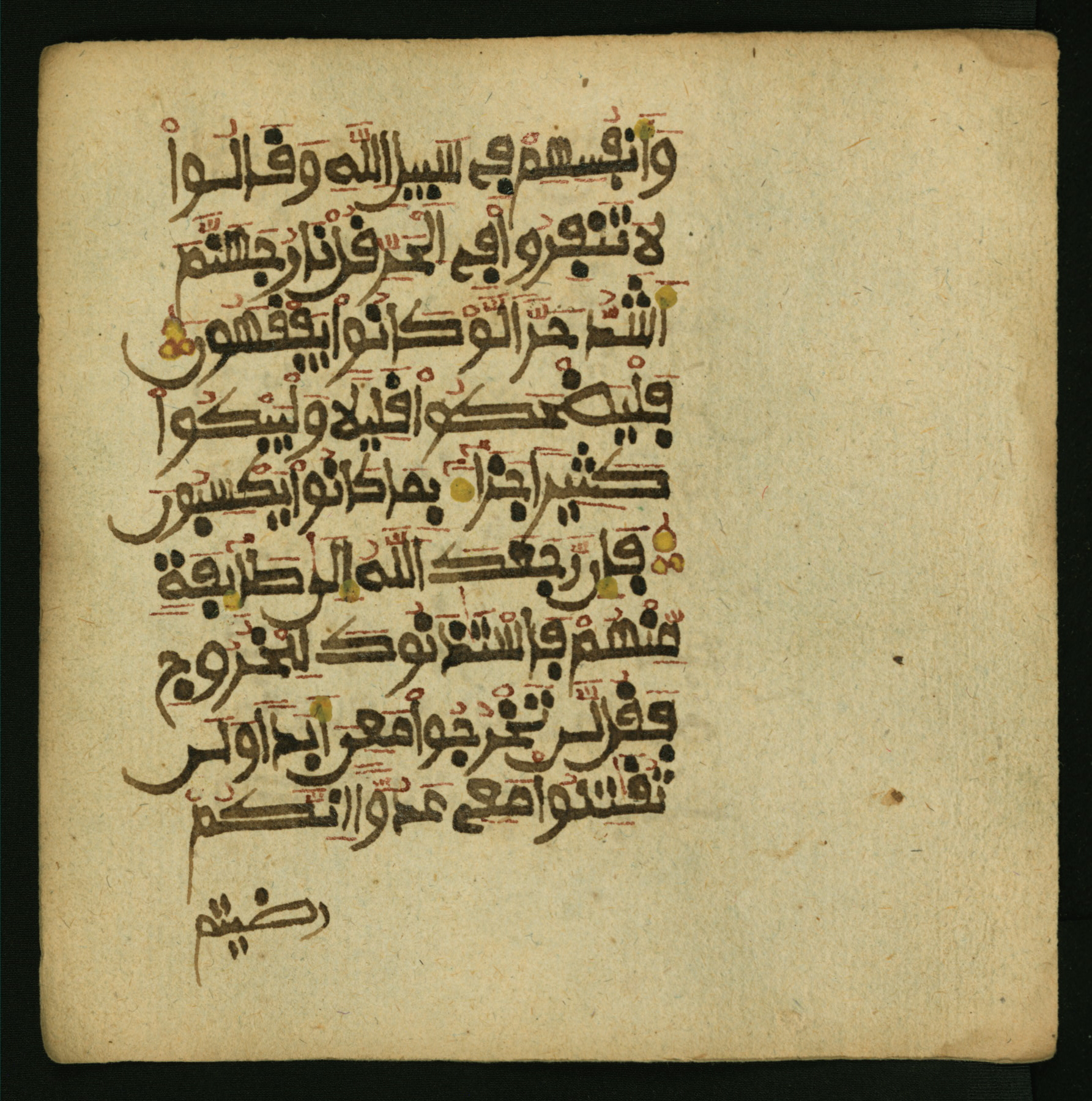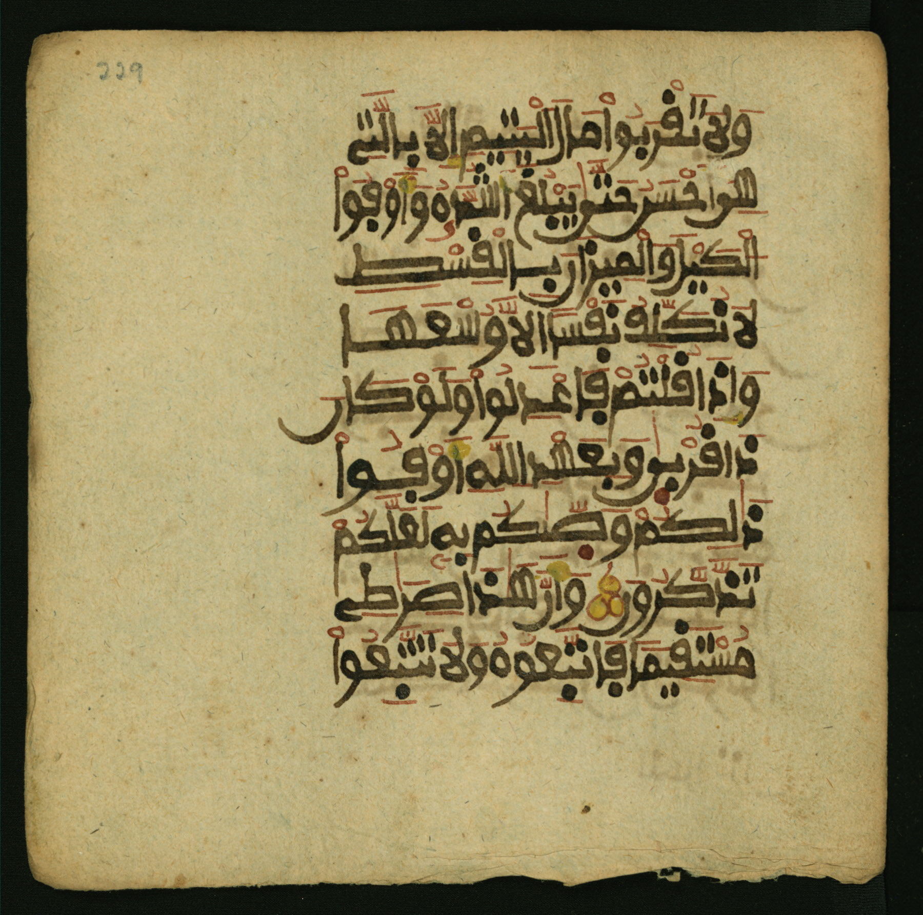 This square-format manuscript is volume 1, containing chapters 1-18 (Sūrat al-fātiḥah through Sūrat al-kahf), of an illuminated two-volume Qur'an produced in Sub-Saharan (West) Africa in the thirteenth century AH / nineteenth CE. The text is written in Sūdānī script in dark brown ink with vocalization in red on loose leaves. Chapter headings are in reddish-brown ink. Three yellow dots outlined in red arranged in a triangular form separate verses. Polychrome circular medallions as well as square and rectangular devices in a variety of patterns and colors mark textual divisions. The leaves of the text are organized between two decorated boards with geometric compositions. The pages and boards are housed in a leather pouch (satchel).