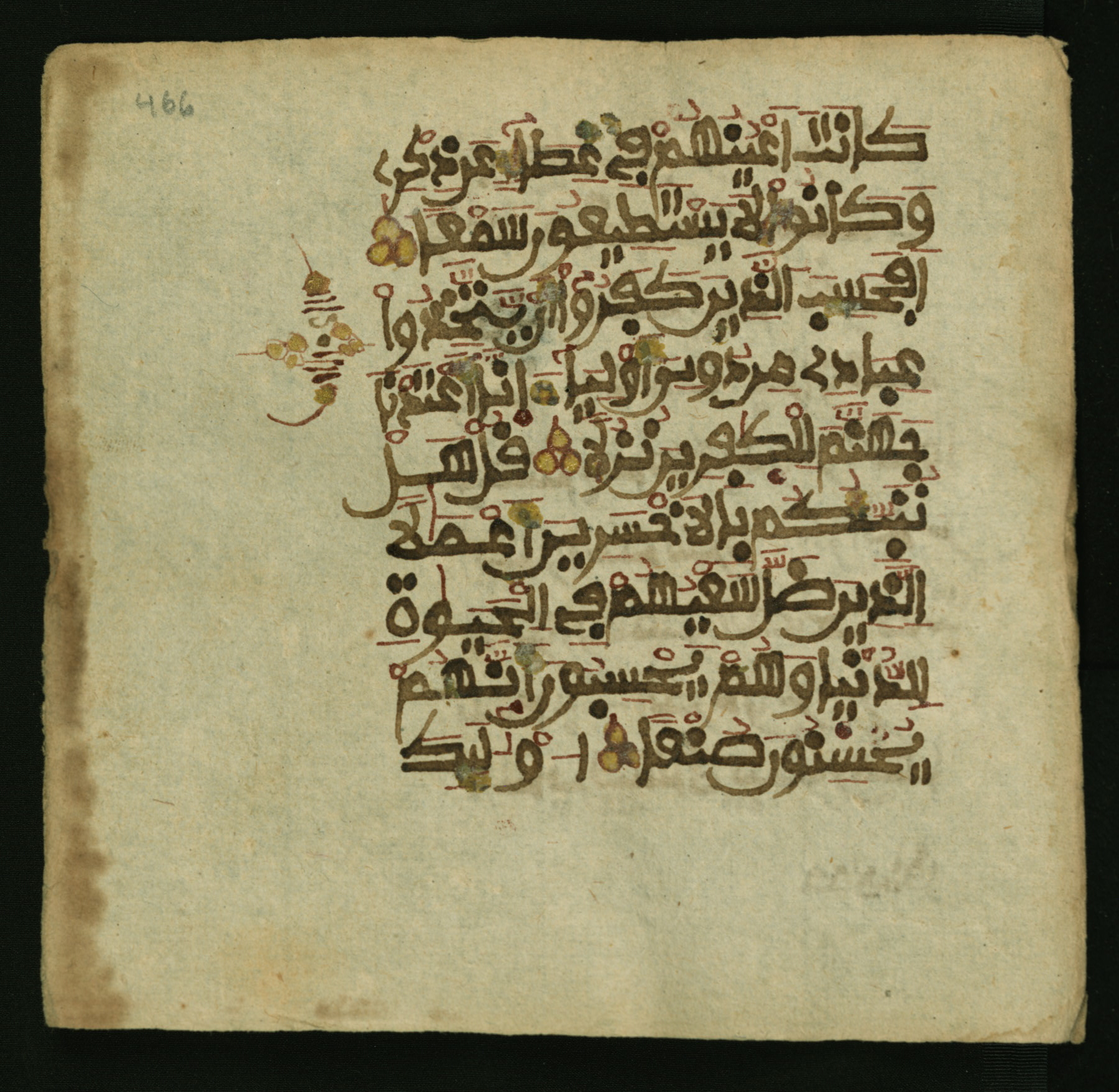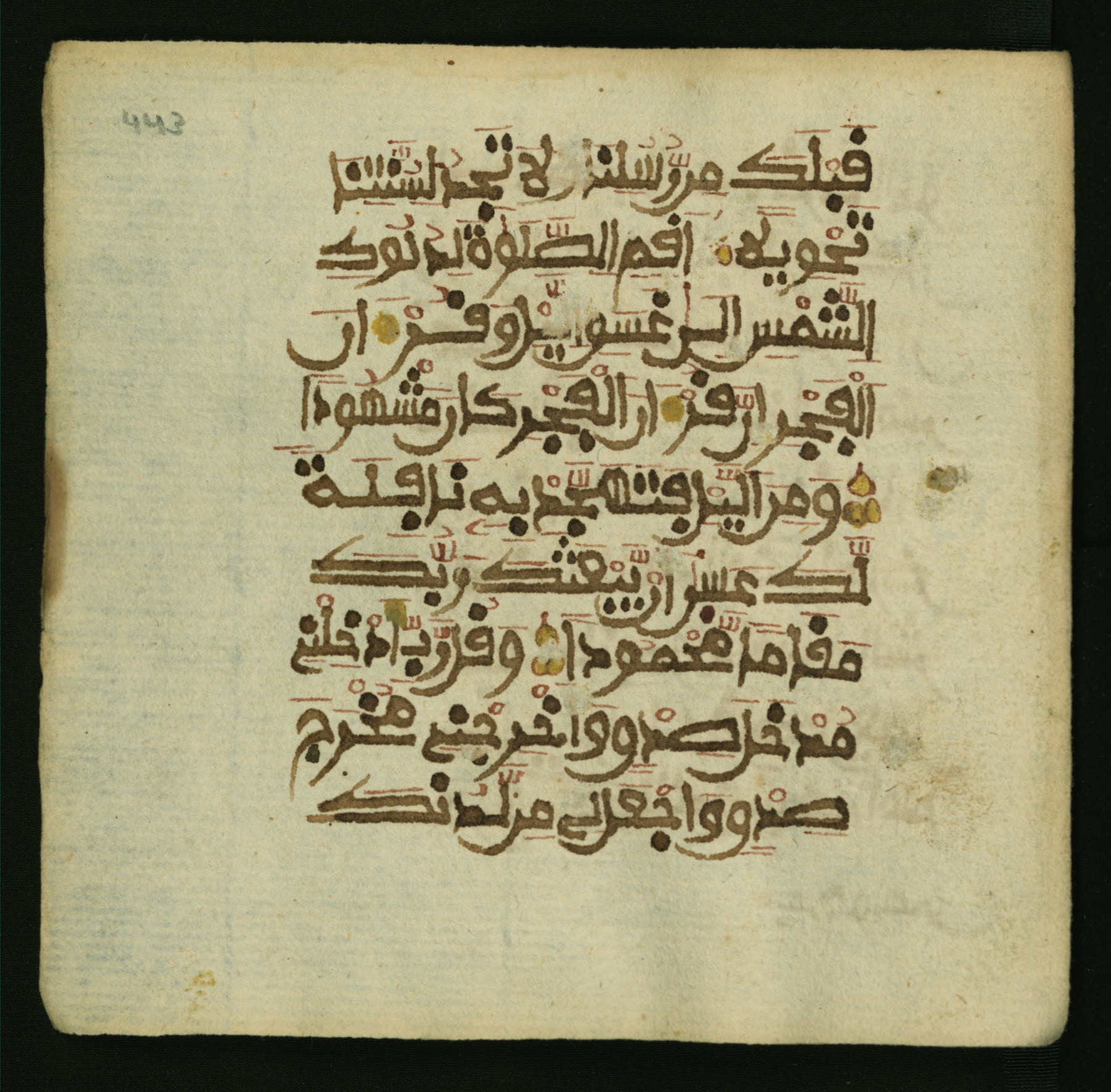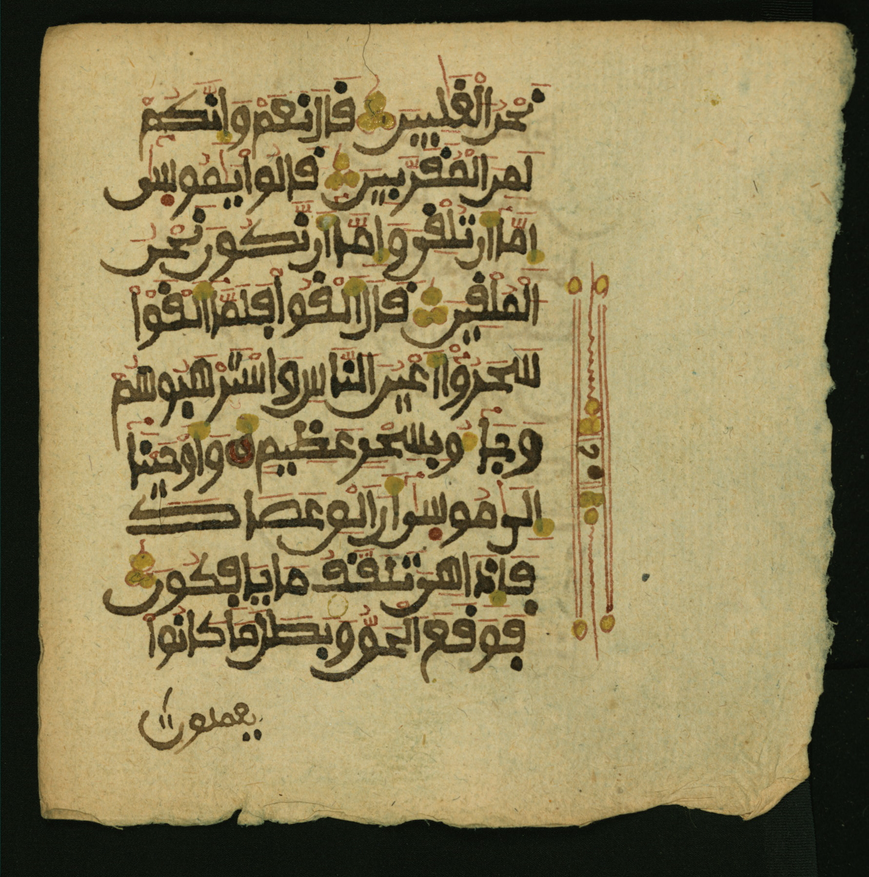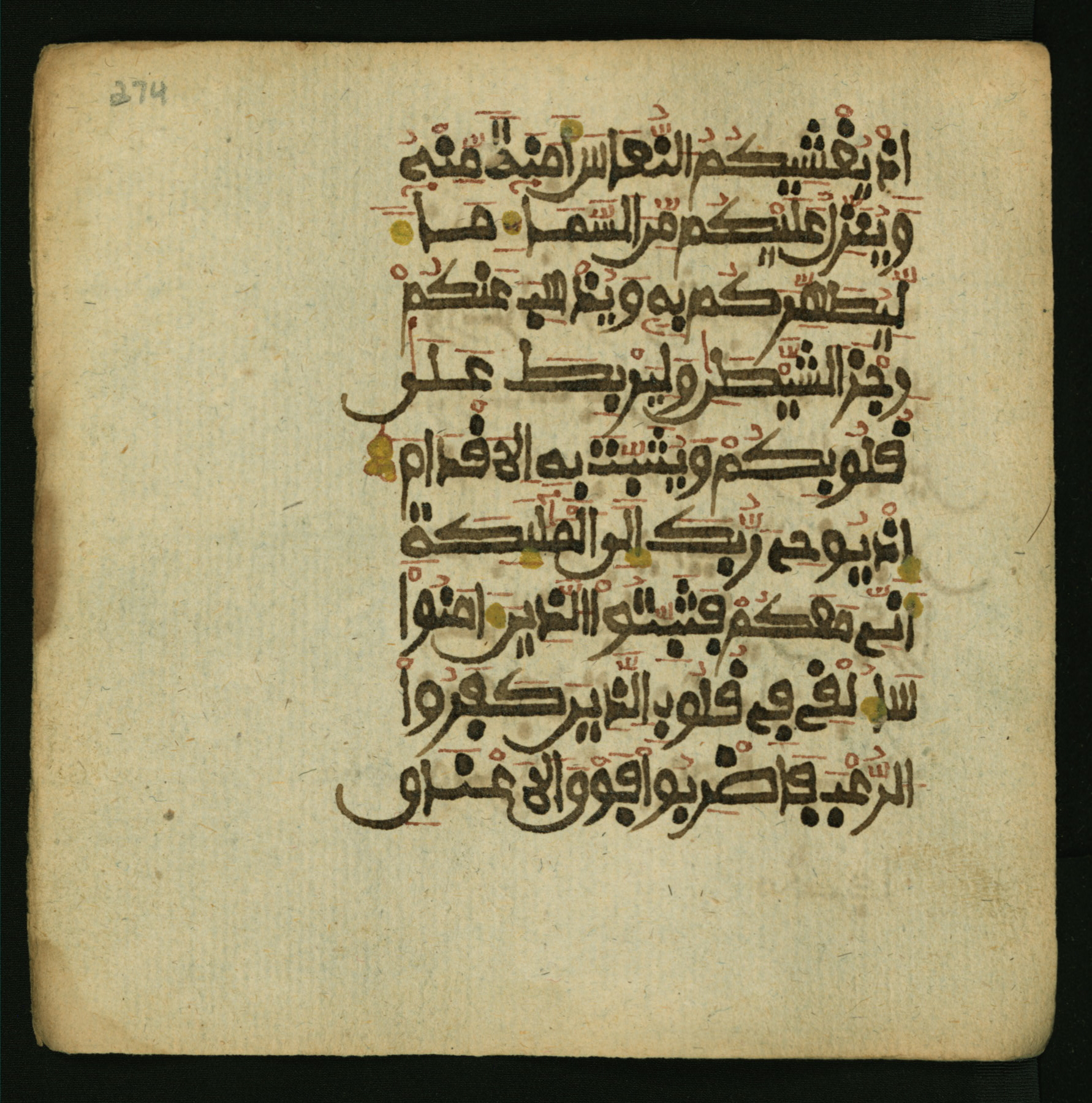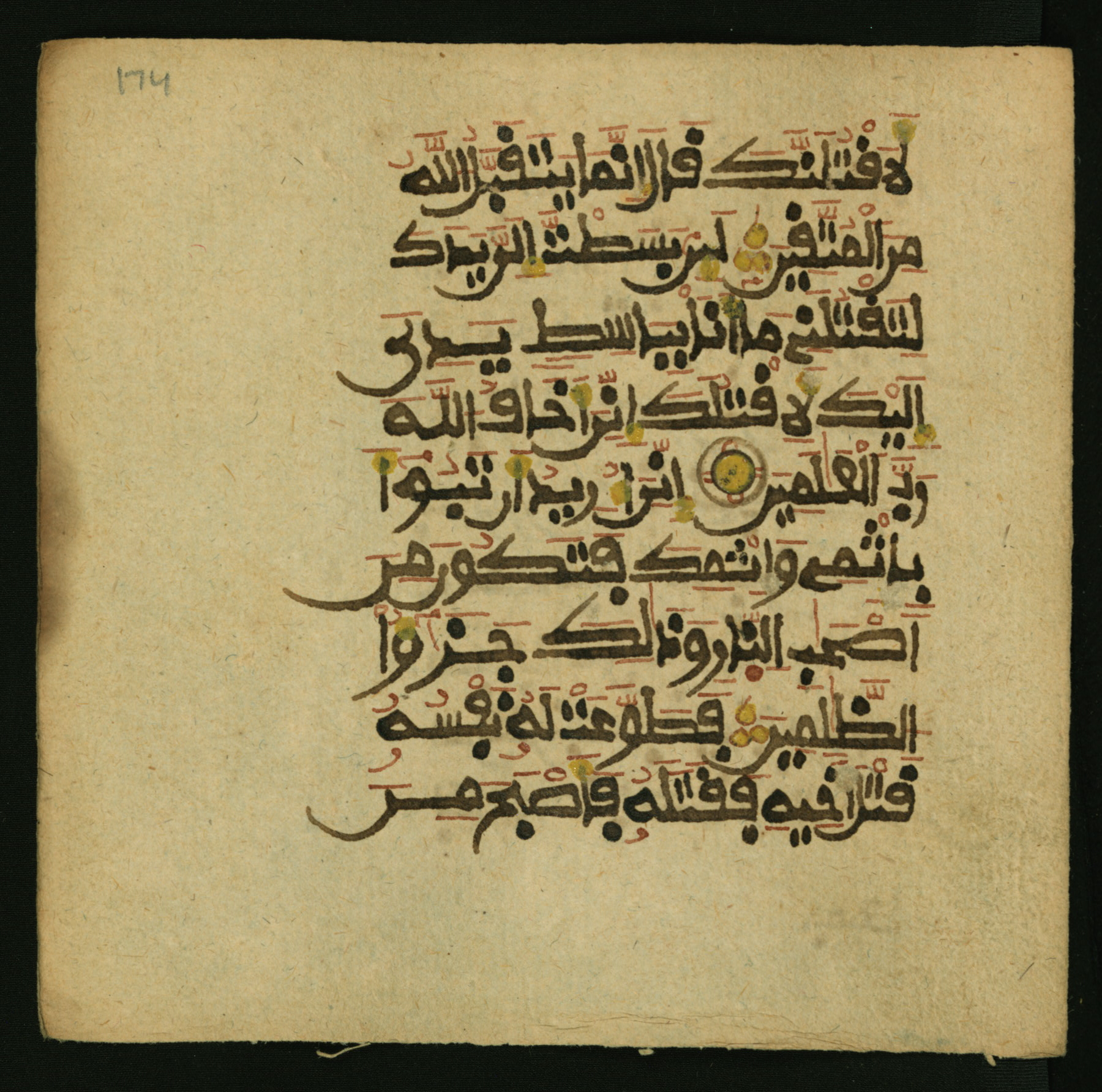 This square-format manuscript is volume 1, containing chapters 1-18 (Sūrat al-fātiḥah through Sūrat al-kahf), of an illuminated two-volume Qur'an produced in Sub-Saharan (West) Africa in the thirteenth century AH / nineteenth CE. The text is written in Sūdānī script in dark brown ink with vocalization in red on loose leaves. Chapter headings are in reddish-brown ink. Three yellow dots outlined in red arranged in a triangular form separate verses. Polychrome circular medallions as well as square and rectangular devices in a variety of patterns and colors mark textual divisions. The leaves of the text are organized between two decorated boards with geometric compositions. The pages and boards are housed in a leather pouch (satchel).