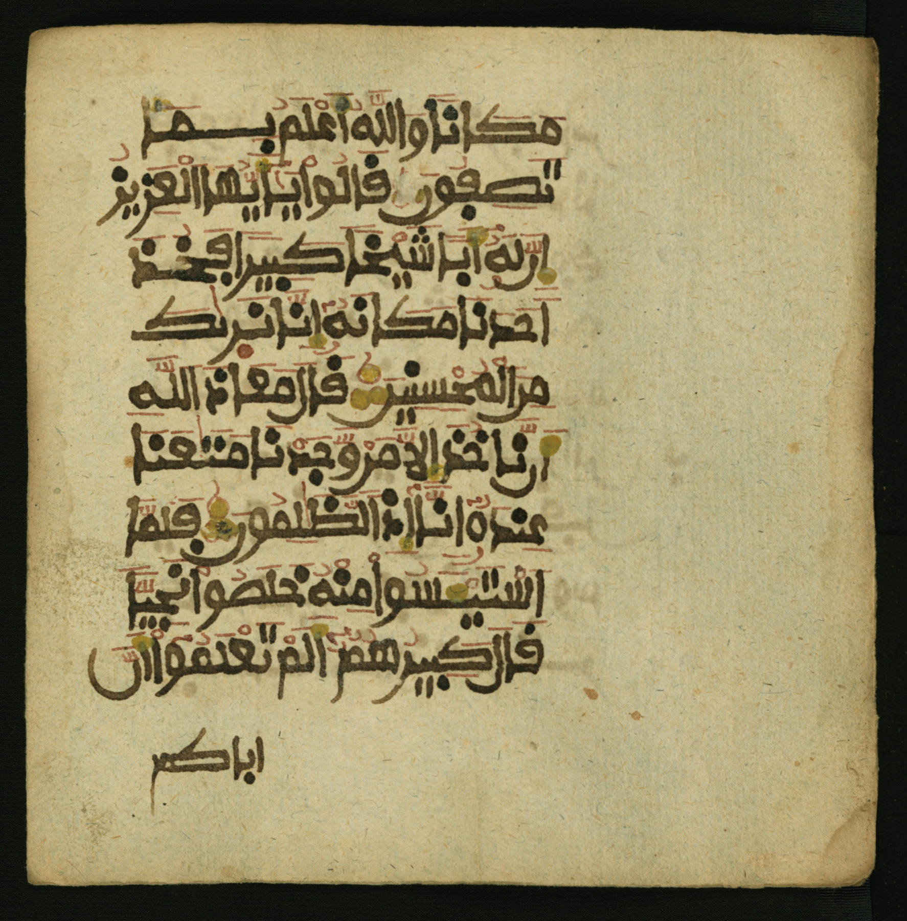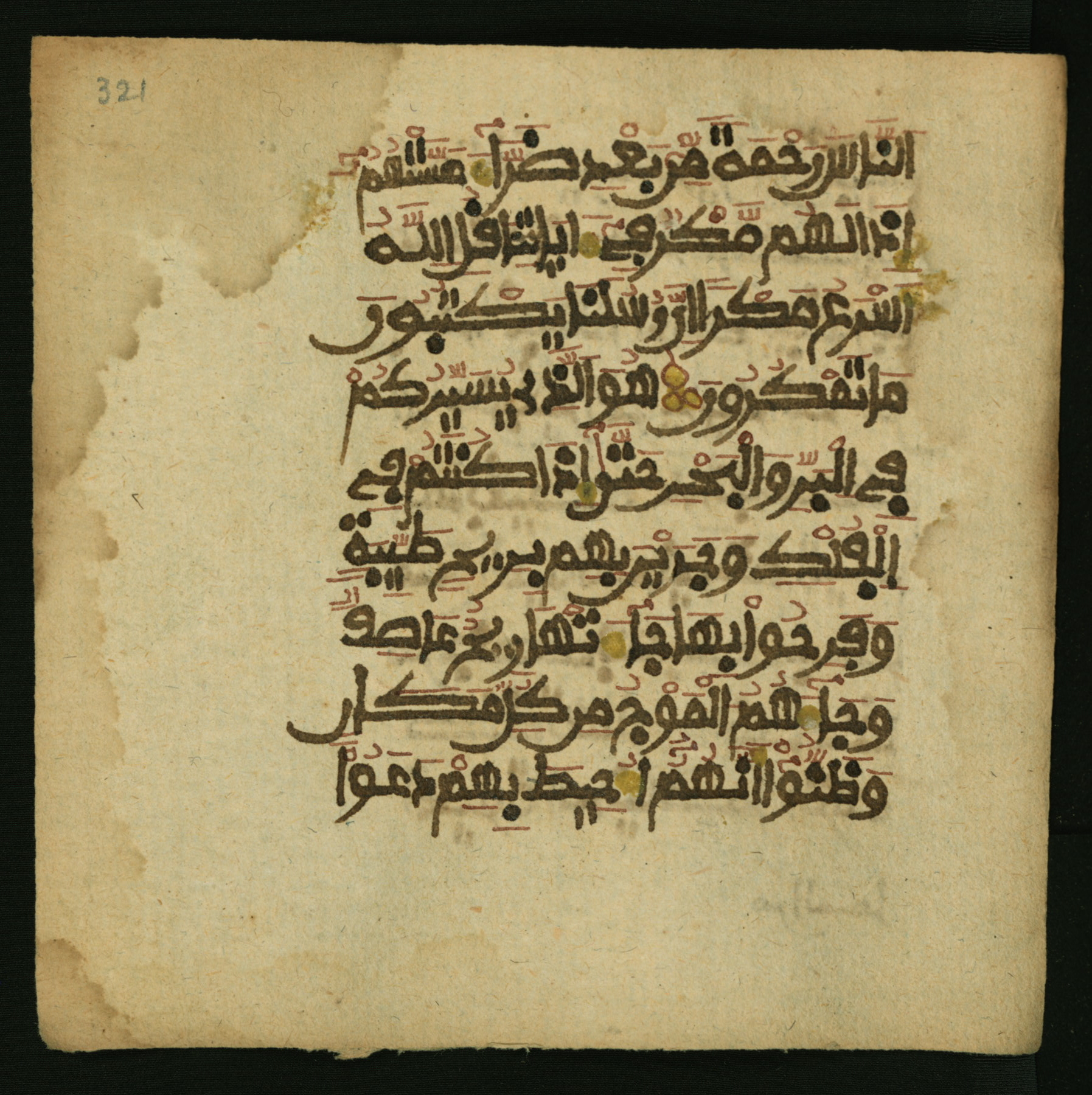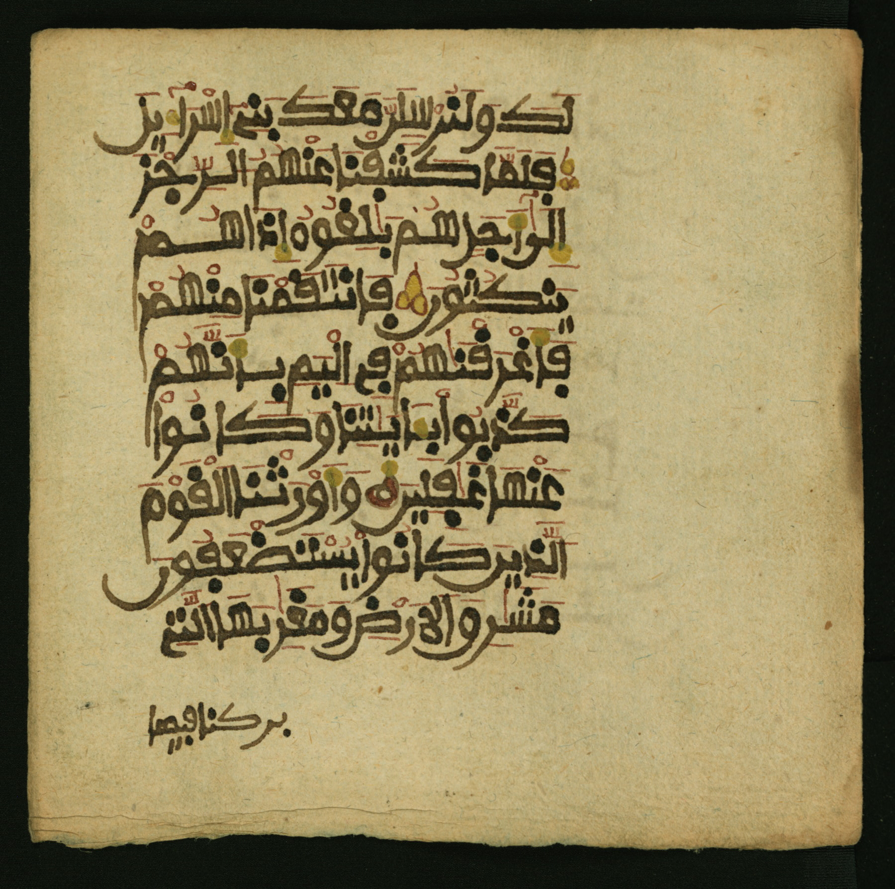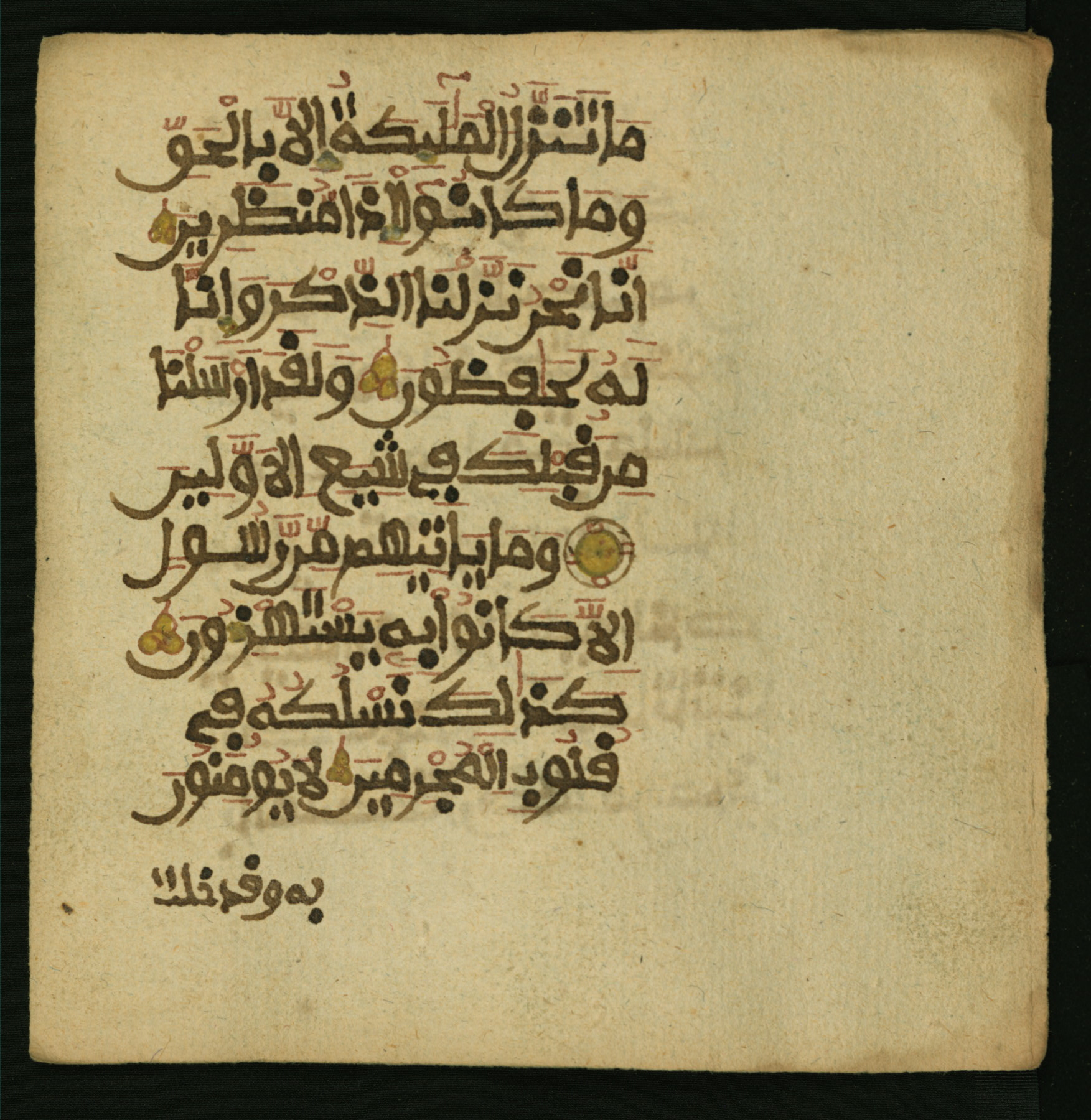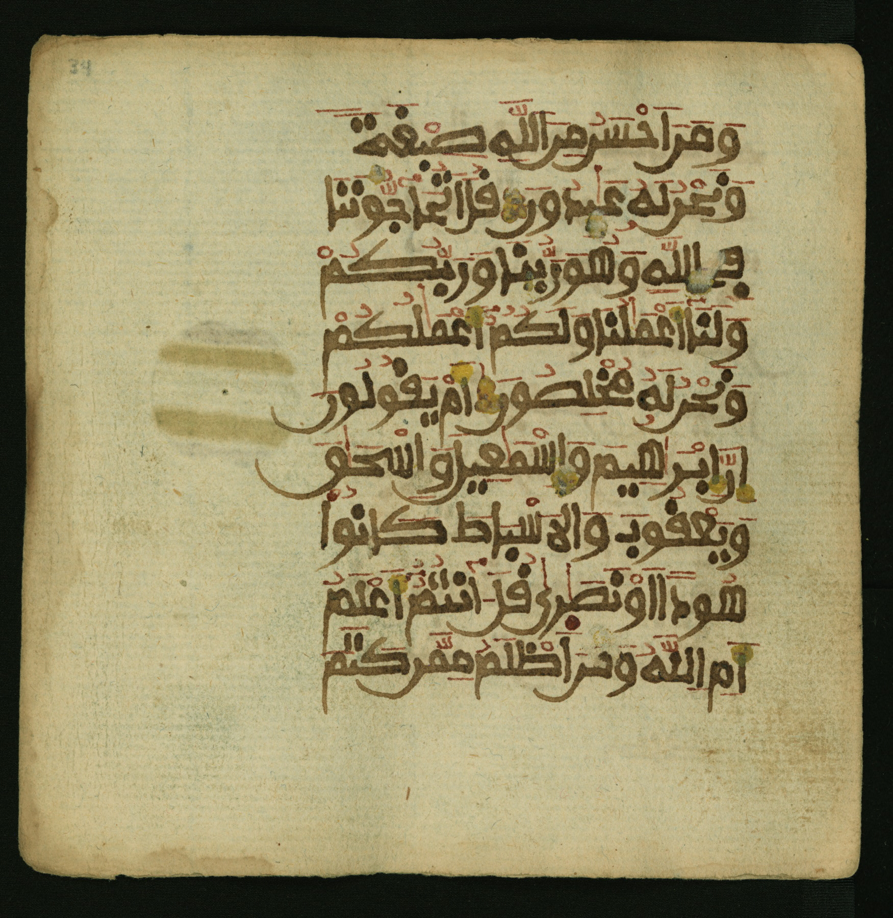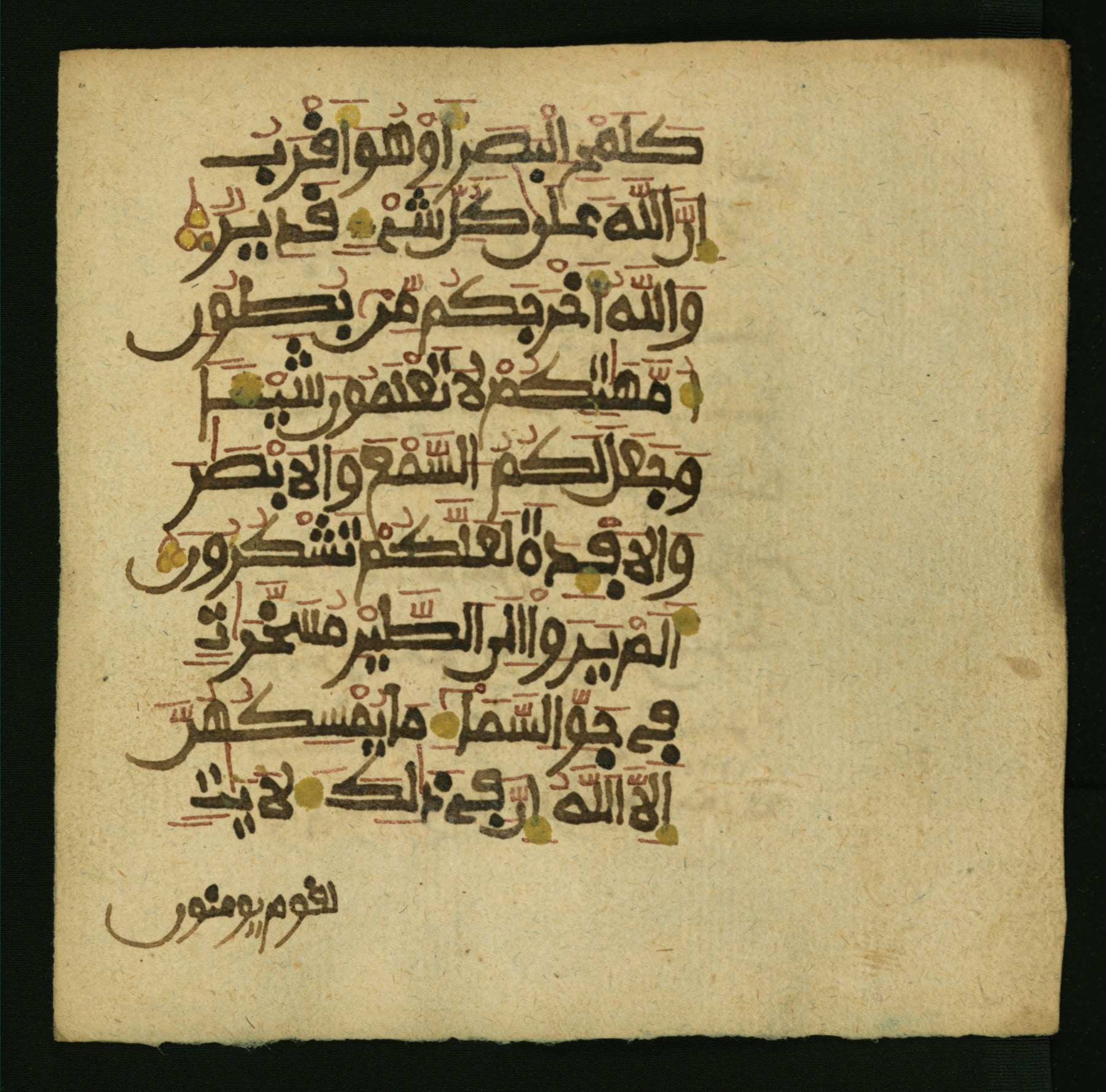 This square-format manuscript is volume 1, containing chapters 1-18 (Sūrat al-fātiḥah through Sūrat al-kahf), of an illuminated two-volume Qur'an produced in Sub-Saharan (West) Africa in the thirteenth century AH / nineteenth CE. The text is written in Sūdānī script in dark brown ink with vocalization in red on loose leaves. Chapter headings are in reddish-brown ink. Three yellow dots outlined in red arranged in a triangular form separate verses. Polychrome circular medallions as well as square and rectangular devices in a variety of patterns and colors mark textual divisions. The leaves of the text are organized between two decorated boards with geometric compositions. The pages and boards are housed in a leather pouch (satchel).