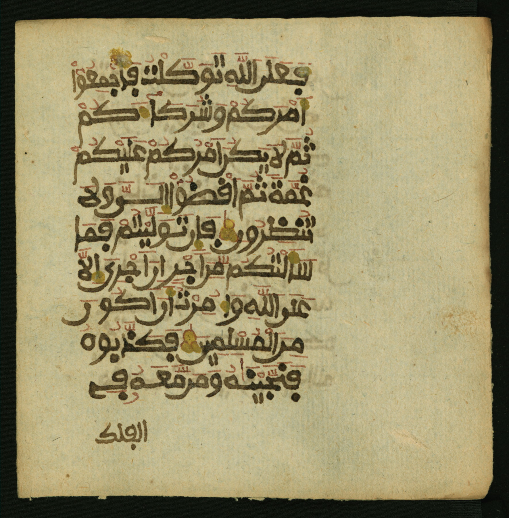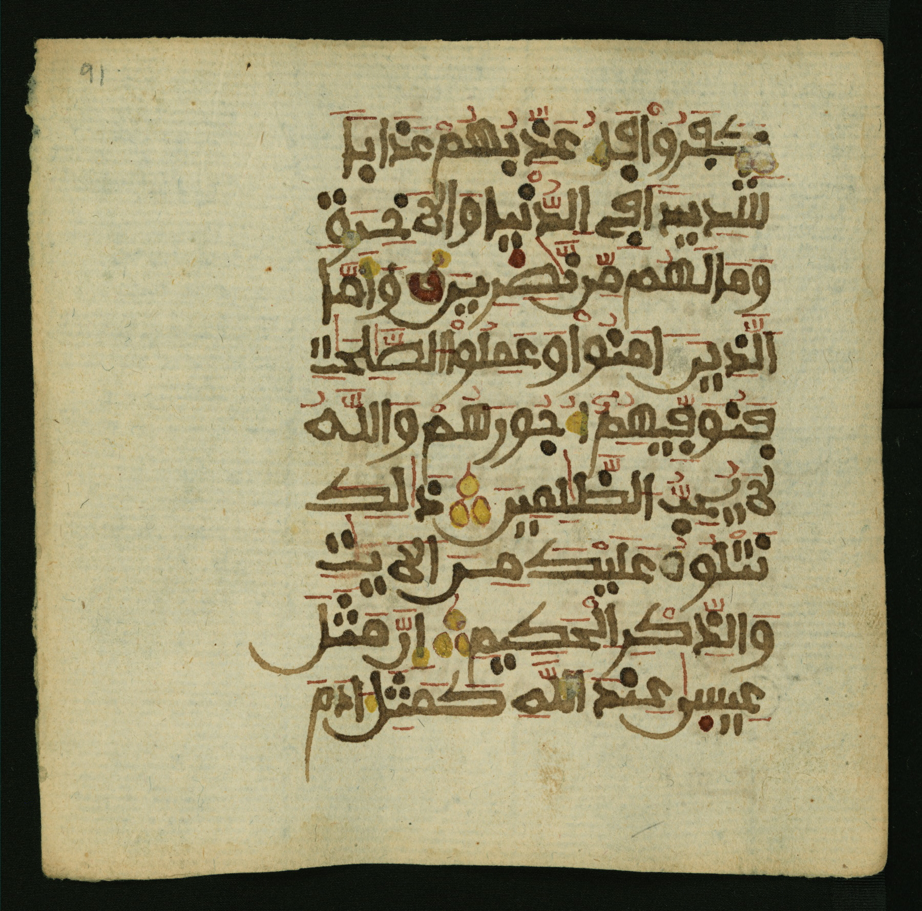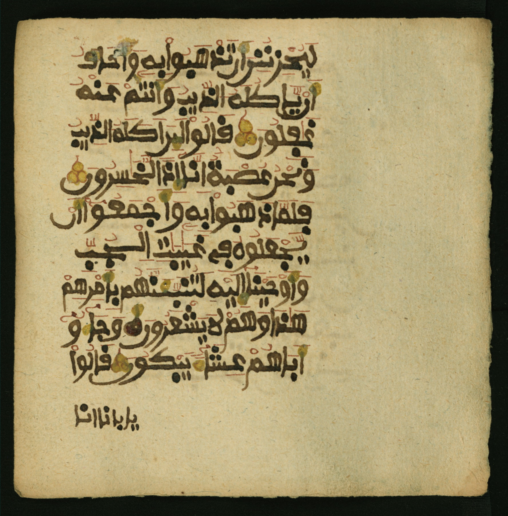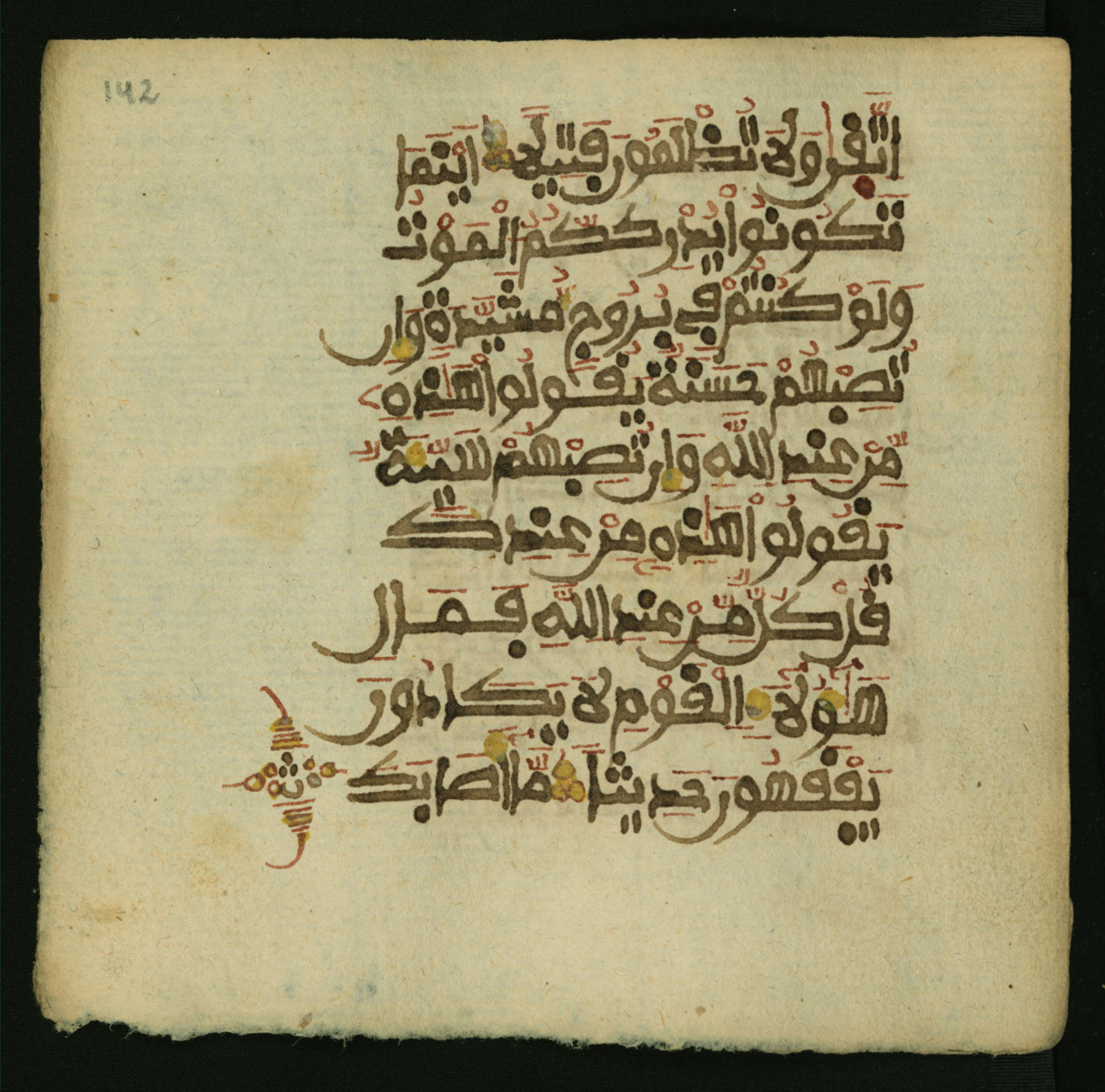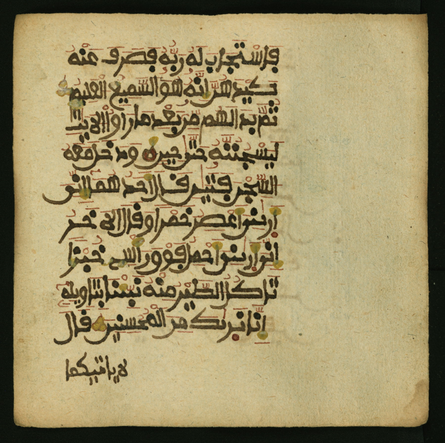 This square-format manuscript is volume 1, containing chapters 1-18 (Sūrat al-fātiḥah through Sūrat al-kahf), of an illuminated two-volume Qur'an produced in Sub-Saharan (West) Africa in the thirteenth century AH / nineteenth CE. The text is written in Sūdānī script in dark brown ink with vocalization in red on loose leaves. Chapter headings are in reddish-brown ink. Three yellow dots outlined in red arranged in a triangular form separate verses. Polychrome circular medallions as well as square and rectangular devices in a variety of patterns and colors mark textual divisions. The leaves of the text are organized between two decorated boards with geometric compositions. The pages and boards are housed in a leather pouch (satchel).
