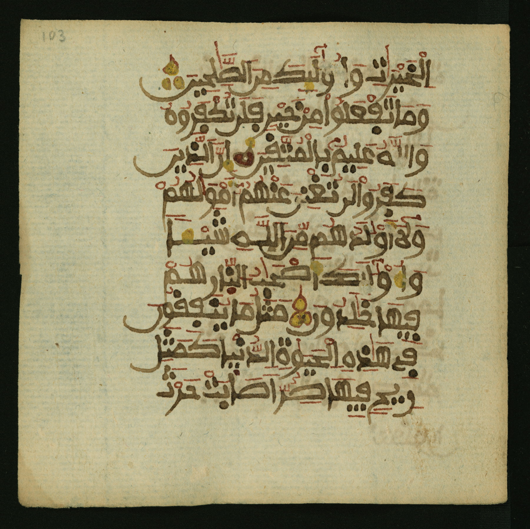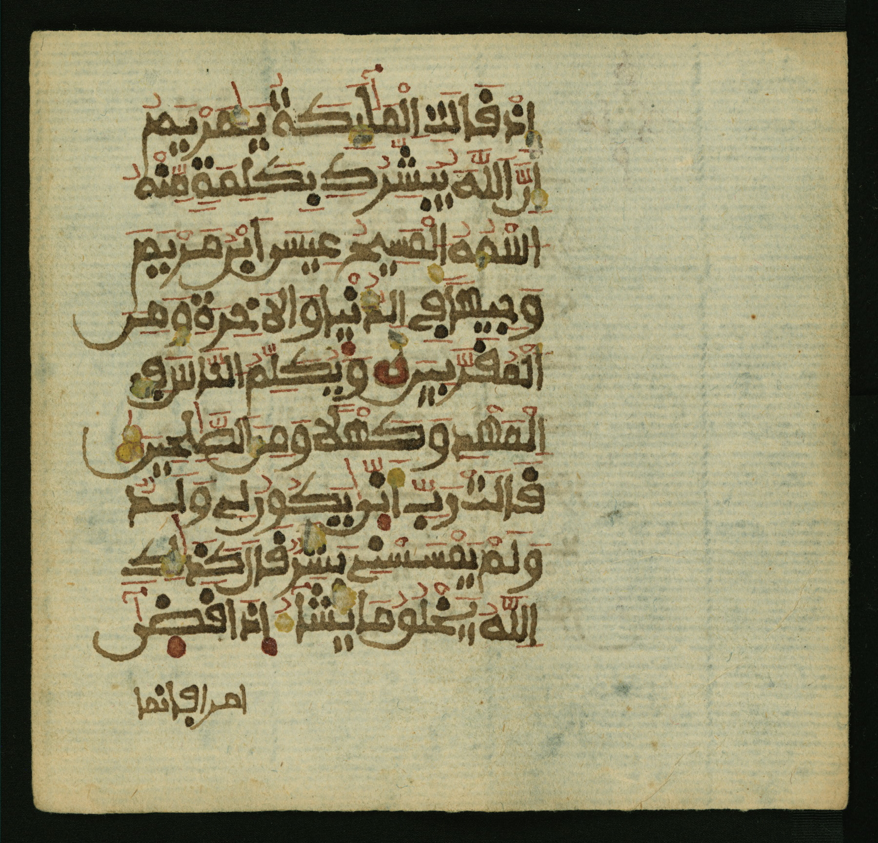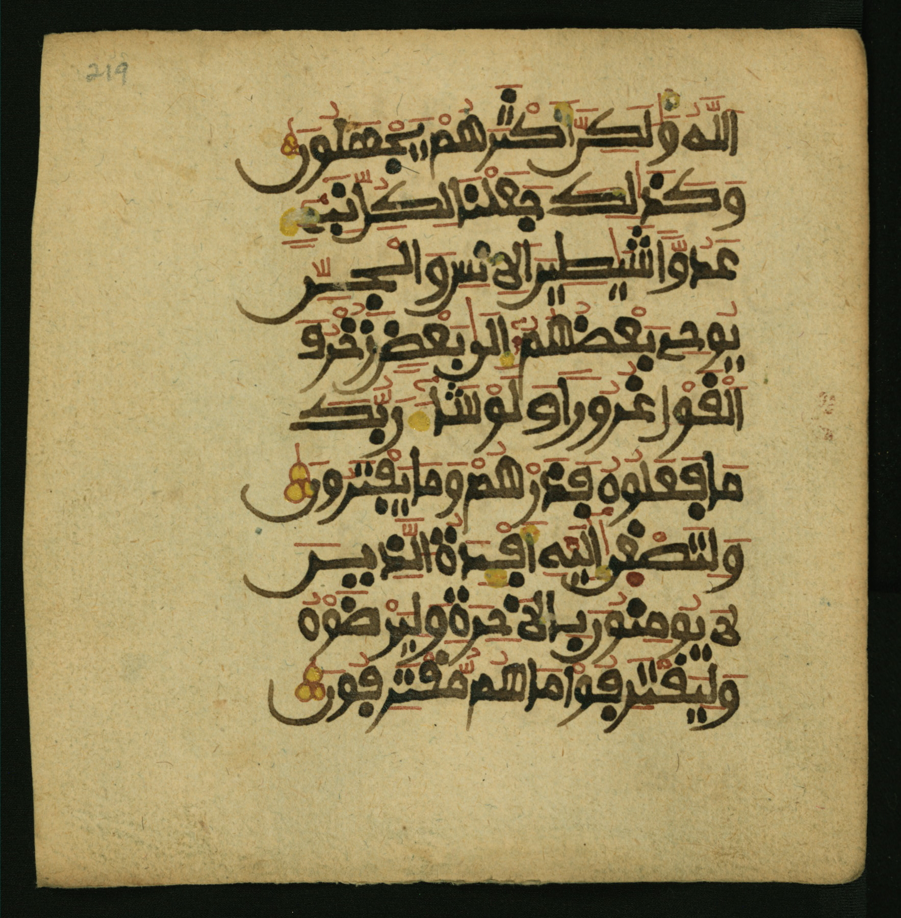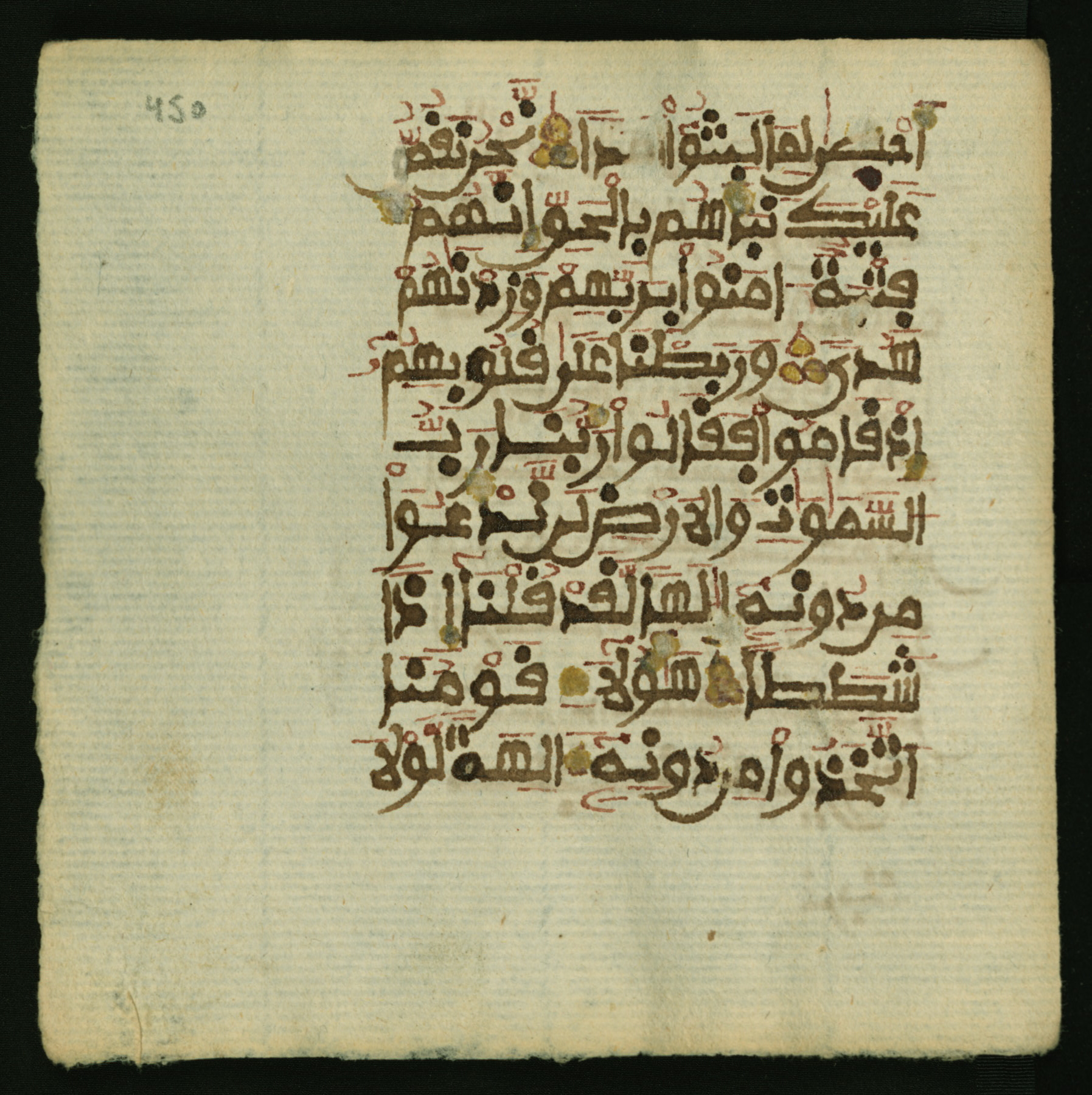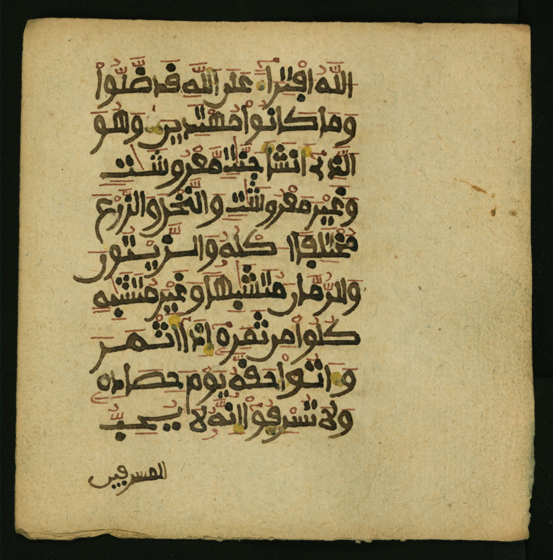 This square-format manuscript is volume 1, containing chapters 1-18 (Sūrat al-fātiḥah through Sūrat al-kahf), of an illuminated two-volume Qur'an produced in Sub-Saharan (West) Africa in the thirteenth century AH / nineteenth CE. The text is written in Sūdānī script in dark brown ink with vocalization in red on loose leaves. Chapter headings are in reddish-brown ink. Three yellow dots outlined in red arranged in a triangular form separate verses. Polychrome circular medallions as well as square and rectangular devices in a variety of patterns and colors mark textual divisions. The leaves of the text are organized between two decorated boards with geometric compositions. The pages and boards are housed in a leather pouch (satchel).