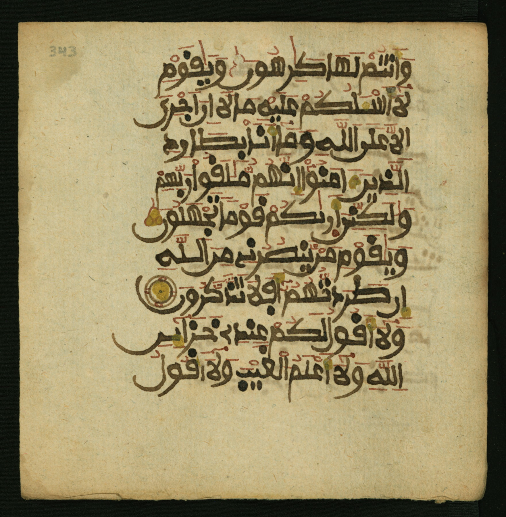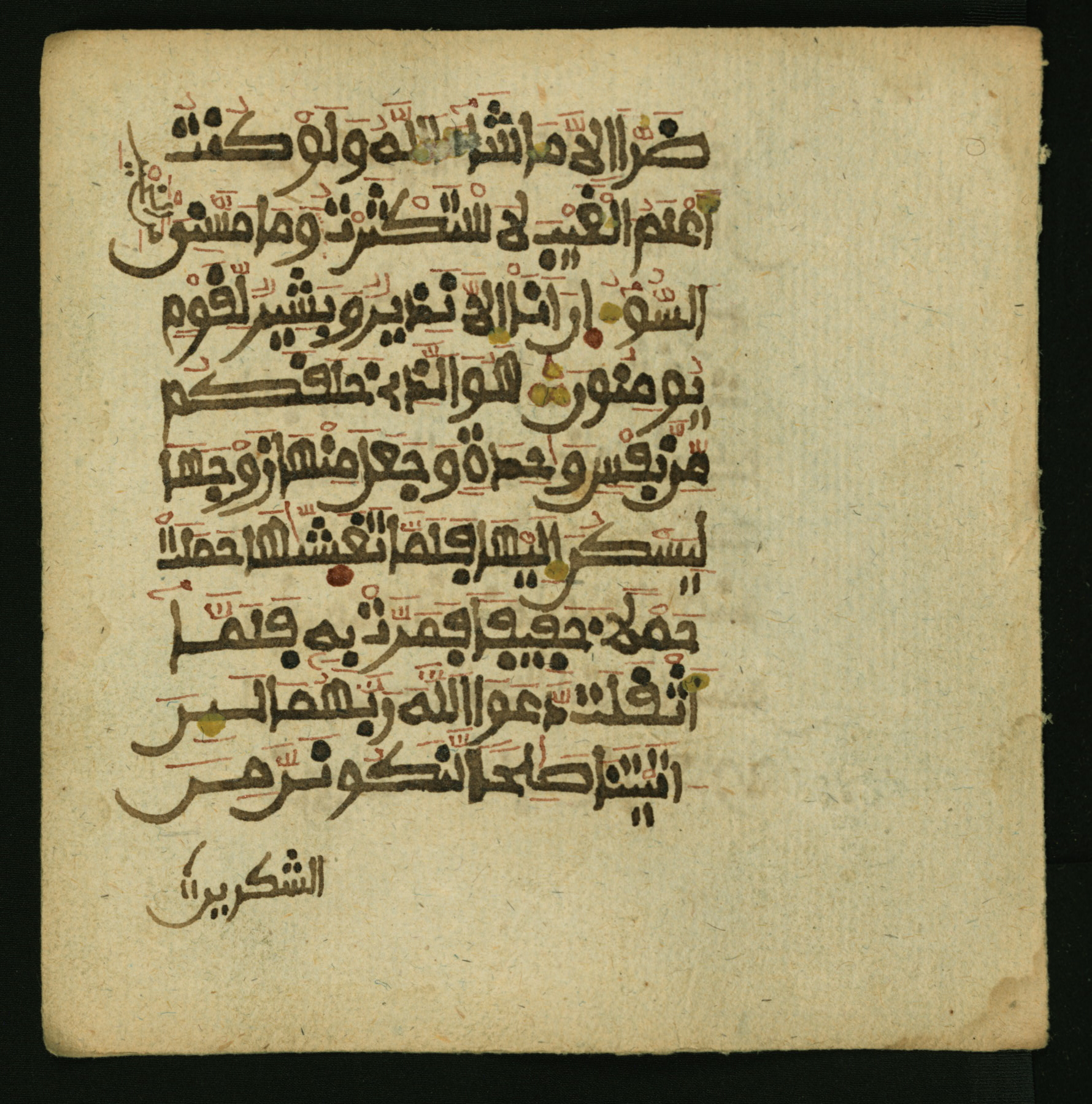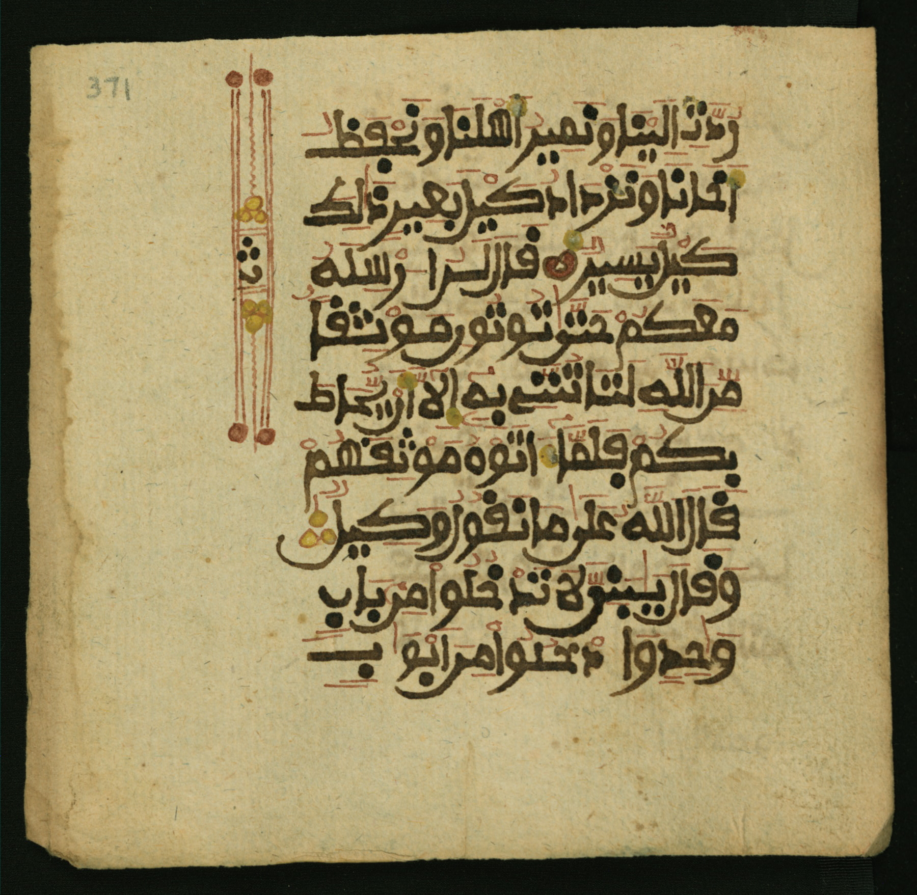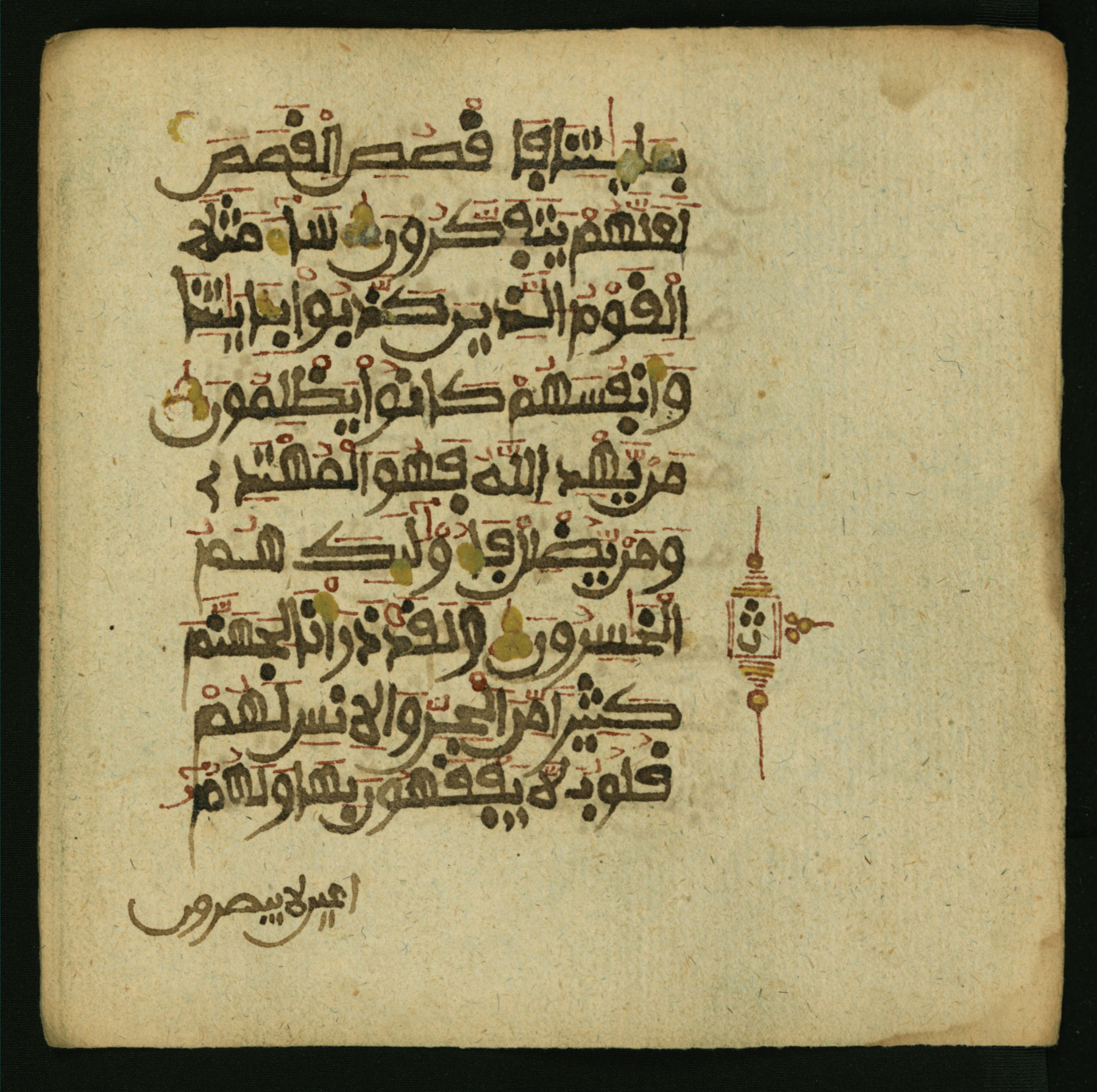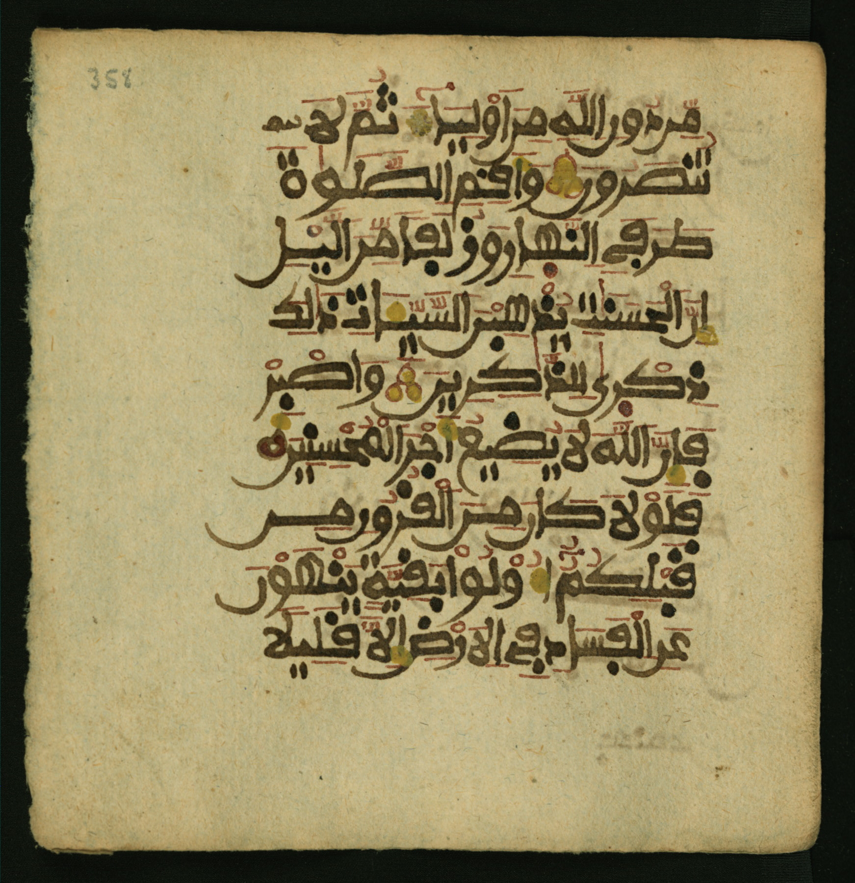 This square-format manuscript is volume 1, containing chapters 1-18 (Sūrat al-fātiḥah through Sūrat al-kahf), of an illuminated two-volume Qur'an produced in Sub-Saharan (West) Africa in the thirteenth century AH / nineteenth CE. The text is written in Sūdānī script in dark brown ink with vocalization in red on loose leaves. Chapter headings are in reddish-brown ink. Three yellow dots outlined in red arranged in a triangular form separate verses. Polychrome circular medallions as well as square and rectangular devices in a variety of patterns and colors mark textual divisions. The leaves of the text are organized between two decorated boards with geometric compositions. The pages and boards are housed in a leather pouch (satchel).