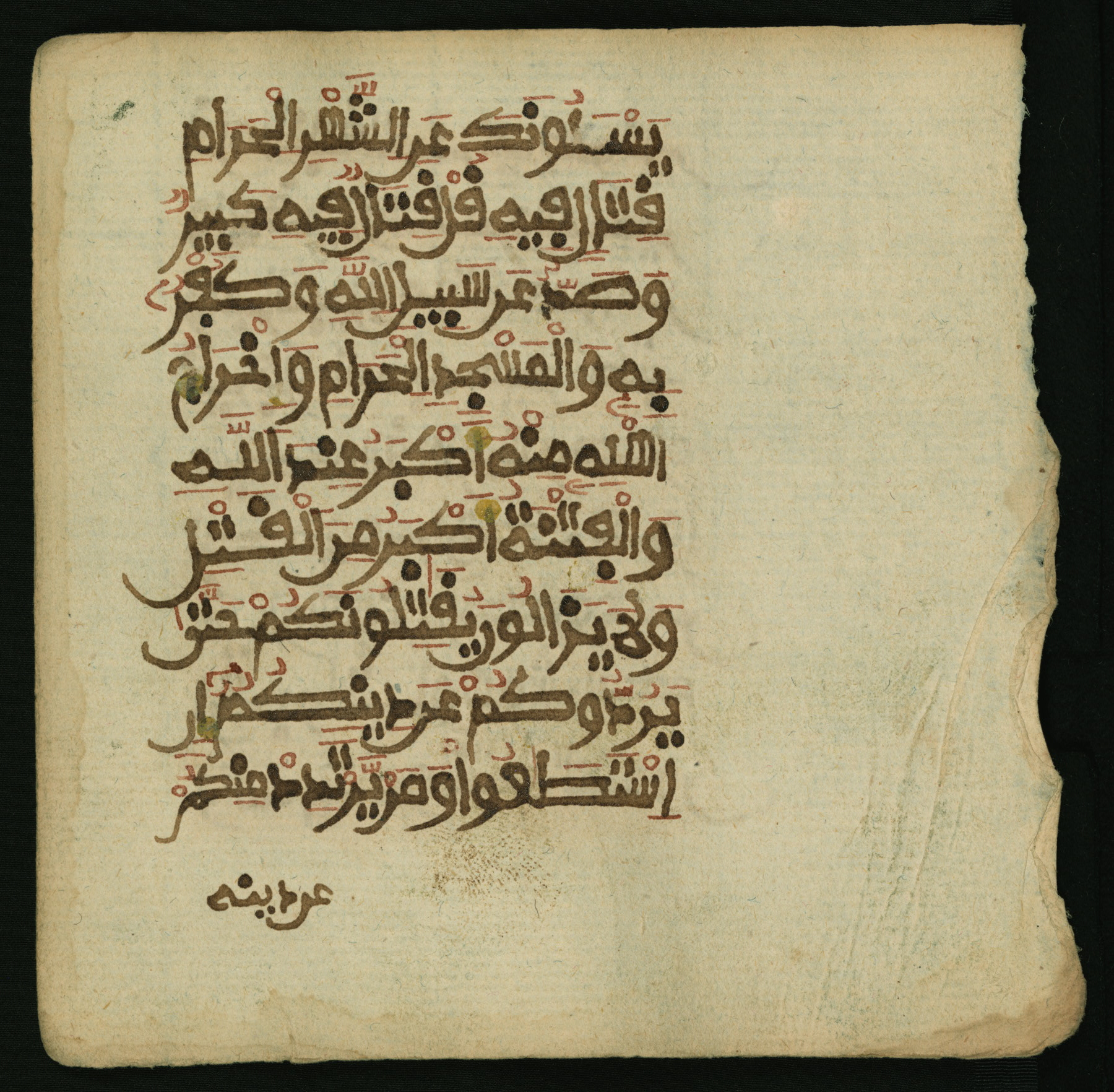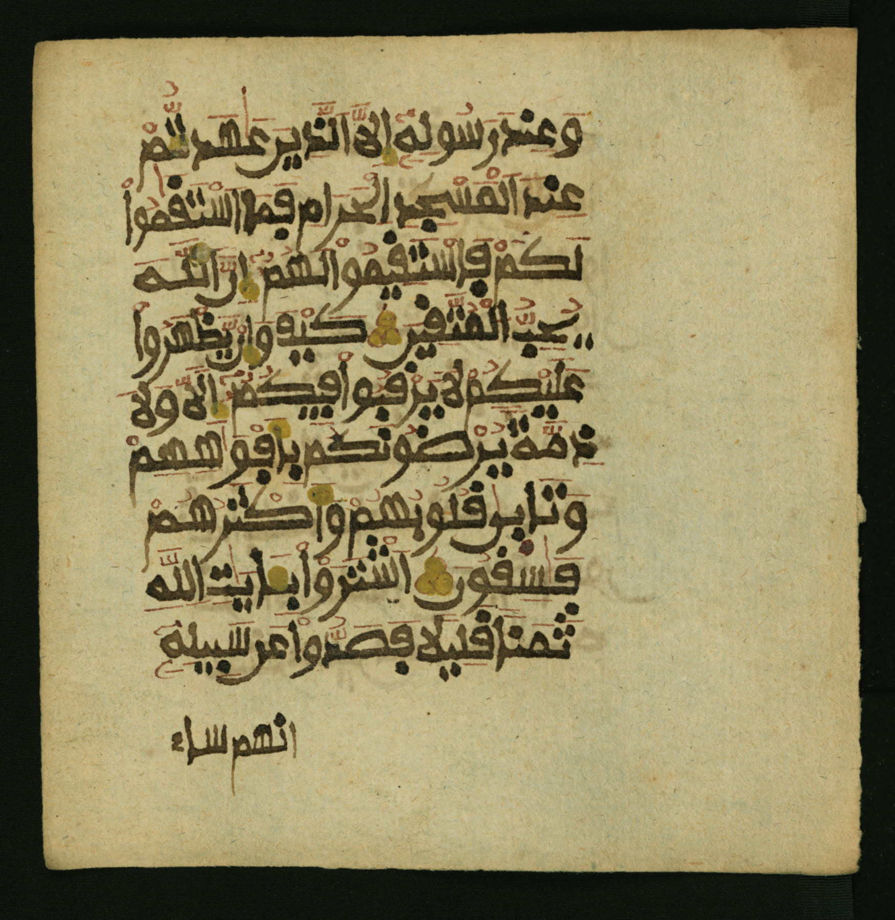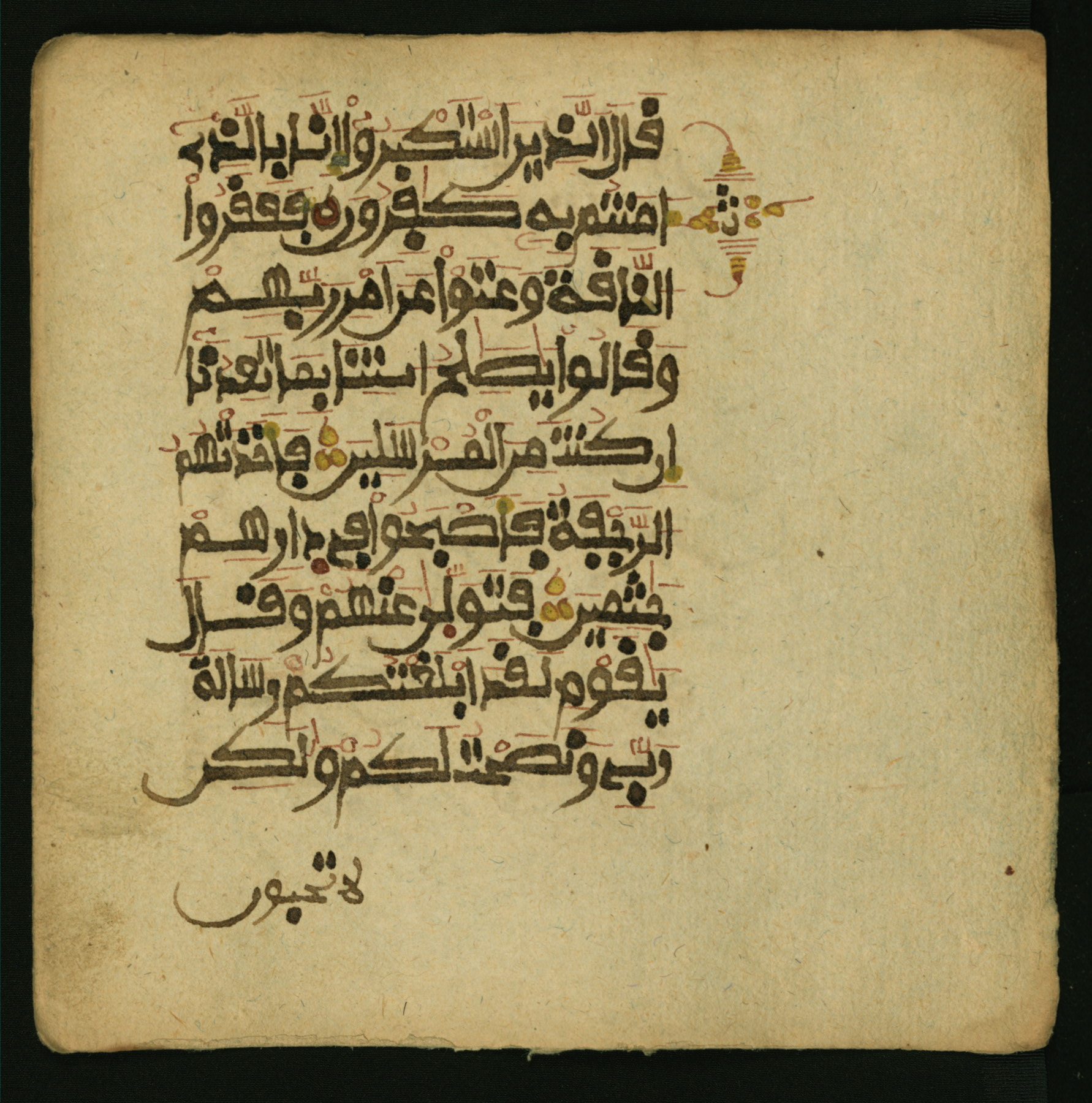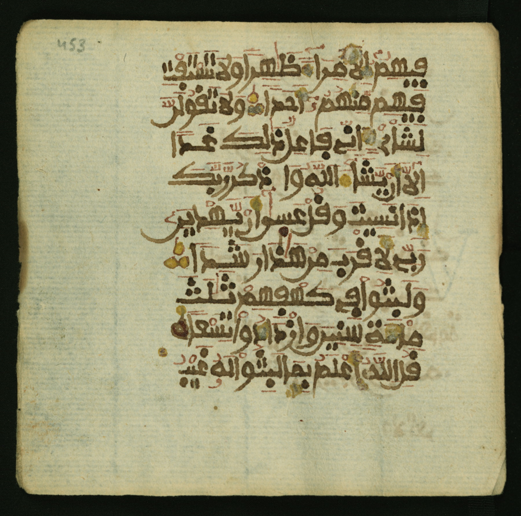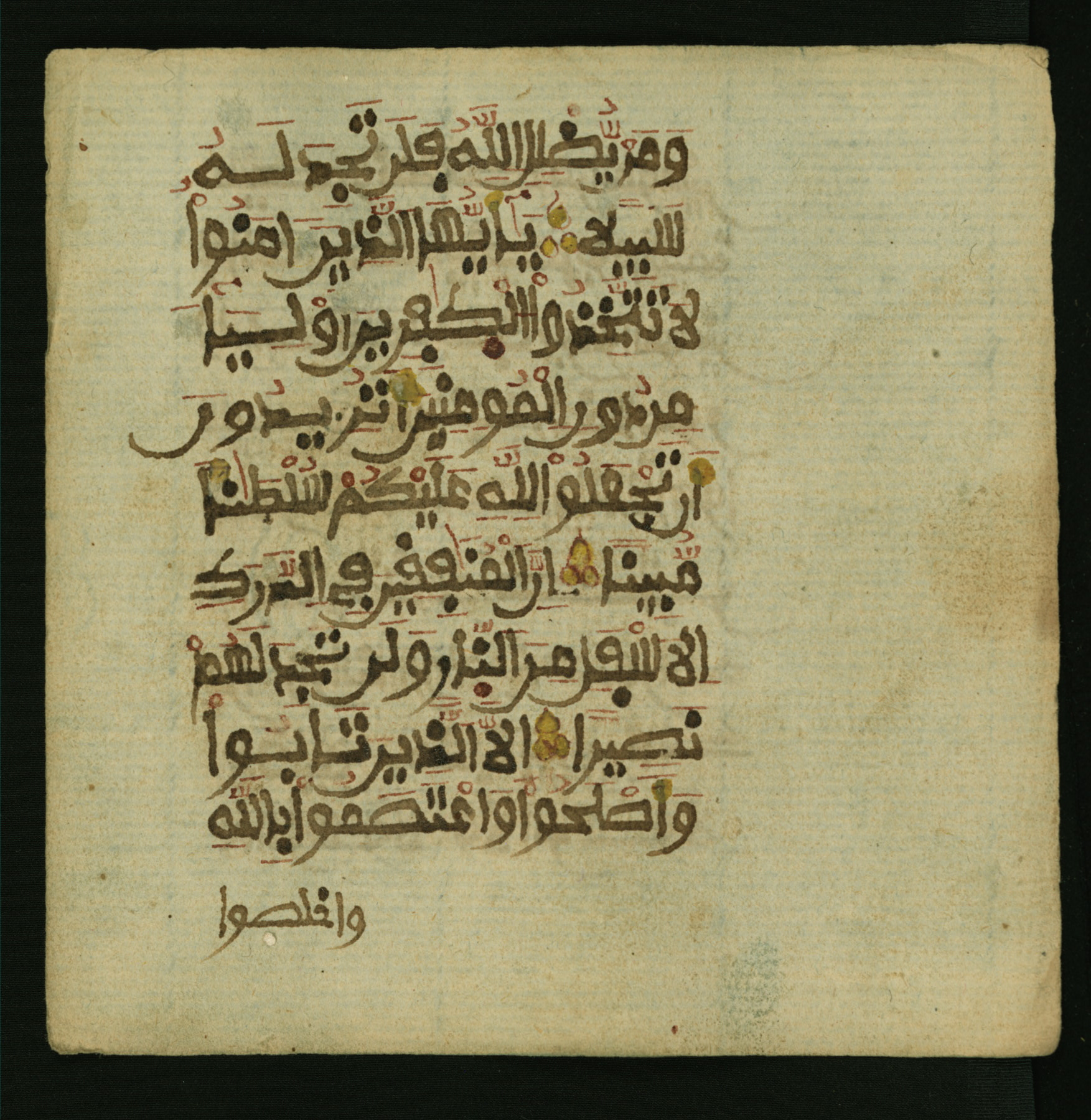 This square-format manuscript is volume 1, containing chapters 1-18 (Sūrat al-fātiḥah through Sūrat al-kahf), of an illuminated two-volume Qur'an produced in Sub-Saharan (West) Africa in the thirteenth century AH / nineteenth CE. The text is written in Sūdānī script in dark brown ink with vocalization in red on loose leaves. Chapter headings are in reddish-brown ink. Three yellow dots outlined in red arranged in a triangular form separate verses. Polychrome circular medallions as well as square and rectangular devices in a variety of patterns and colors mark textual divisions. The leaves of the text are organized between two decorated boards with geometric compositions. The pages and boards are housed in a leather pouch (satchel).