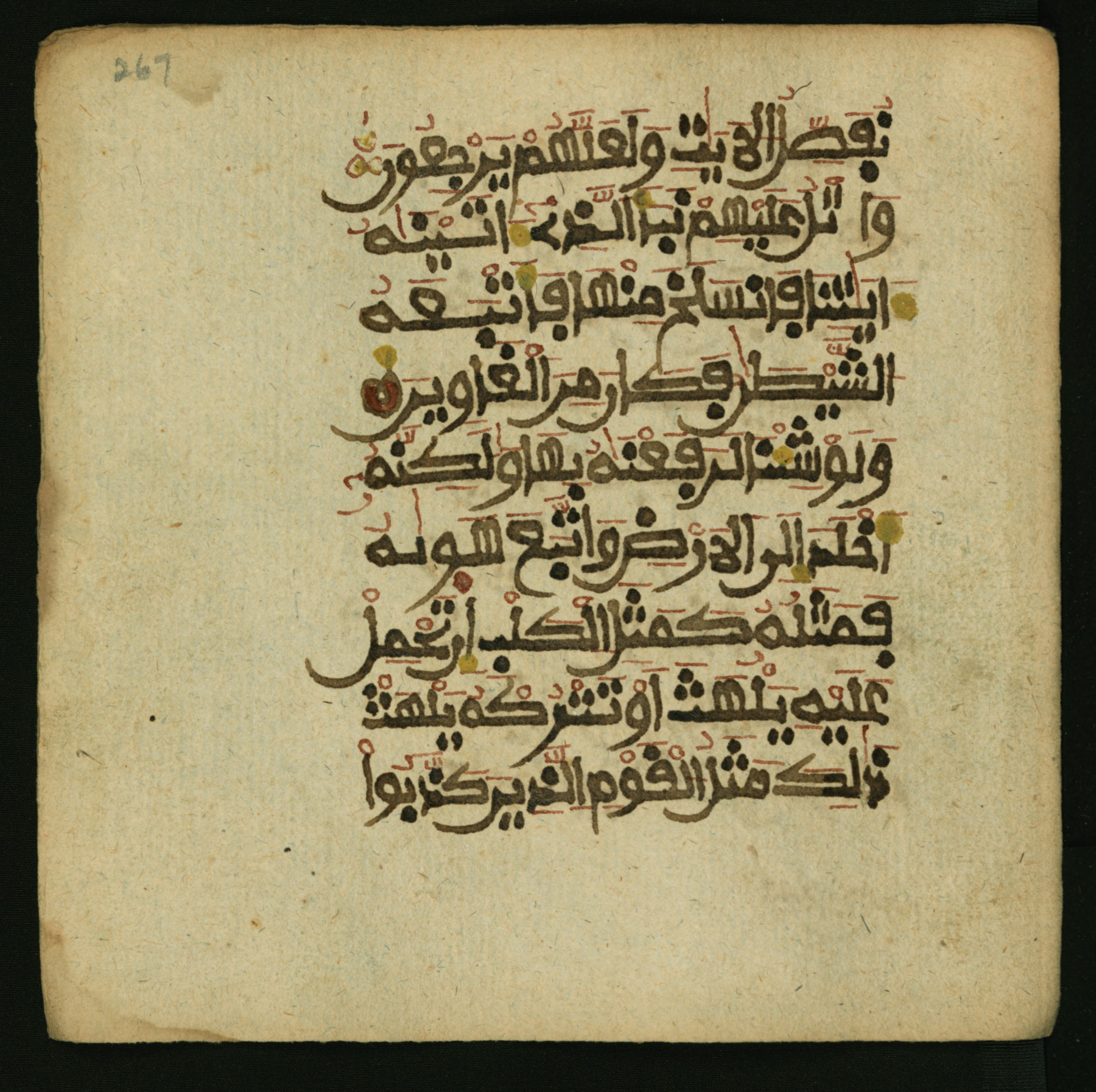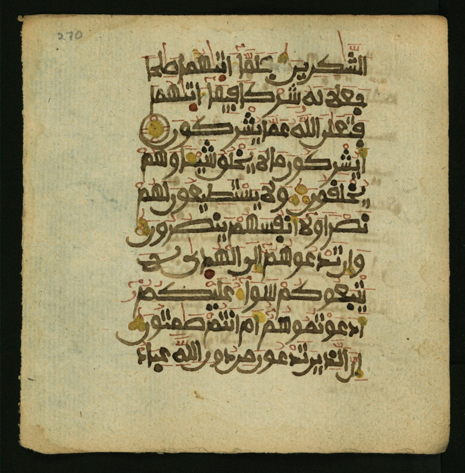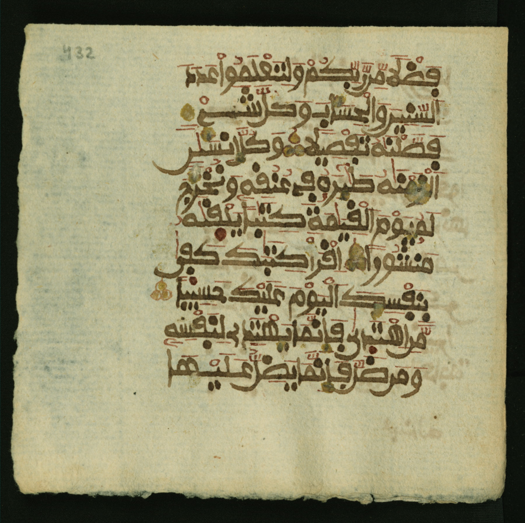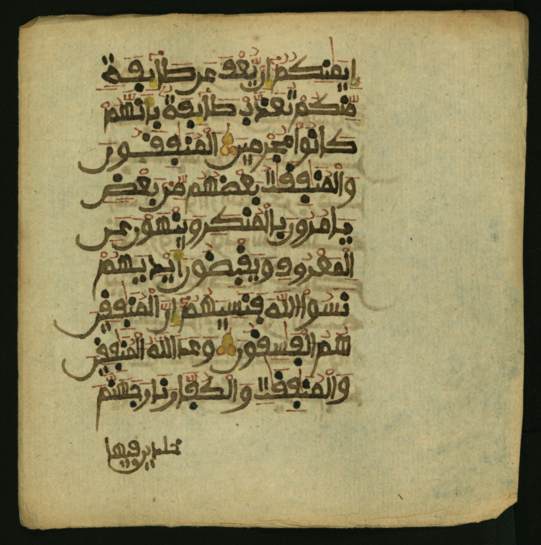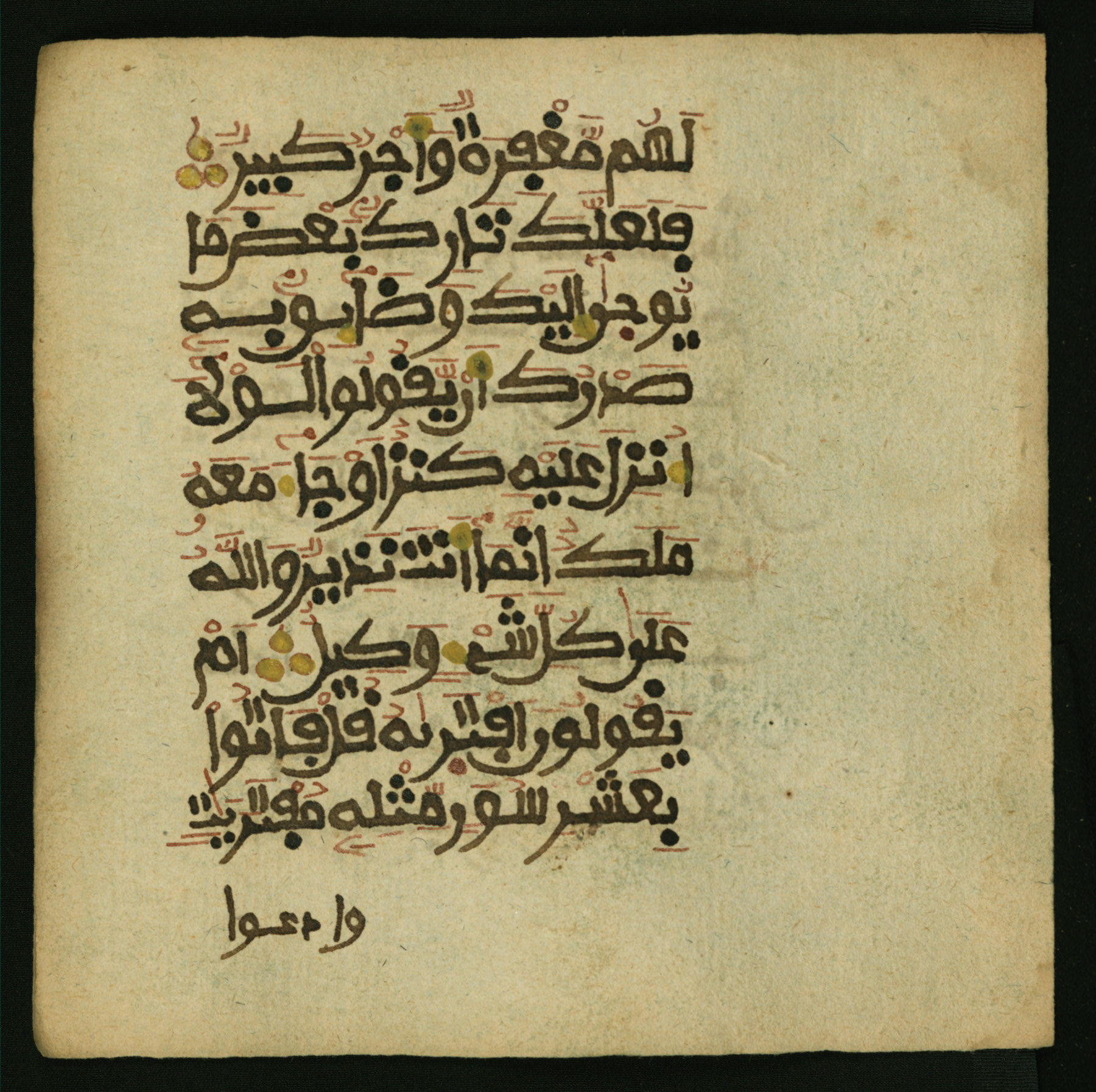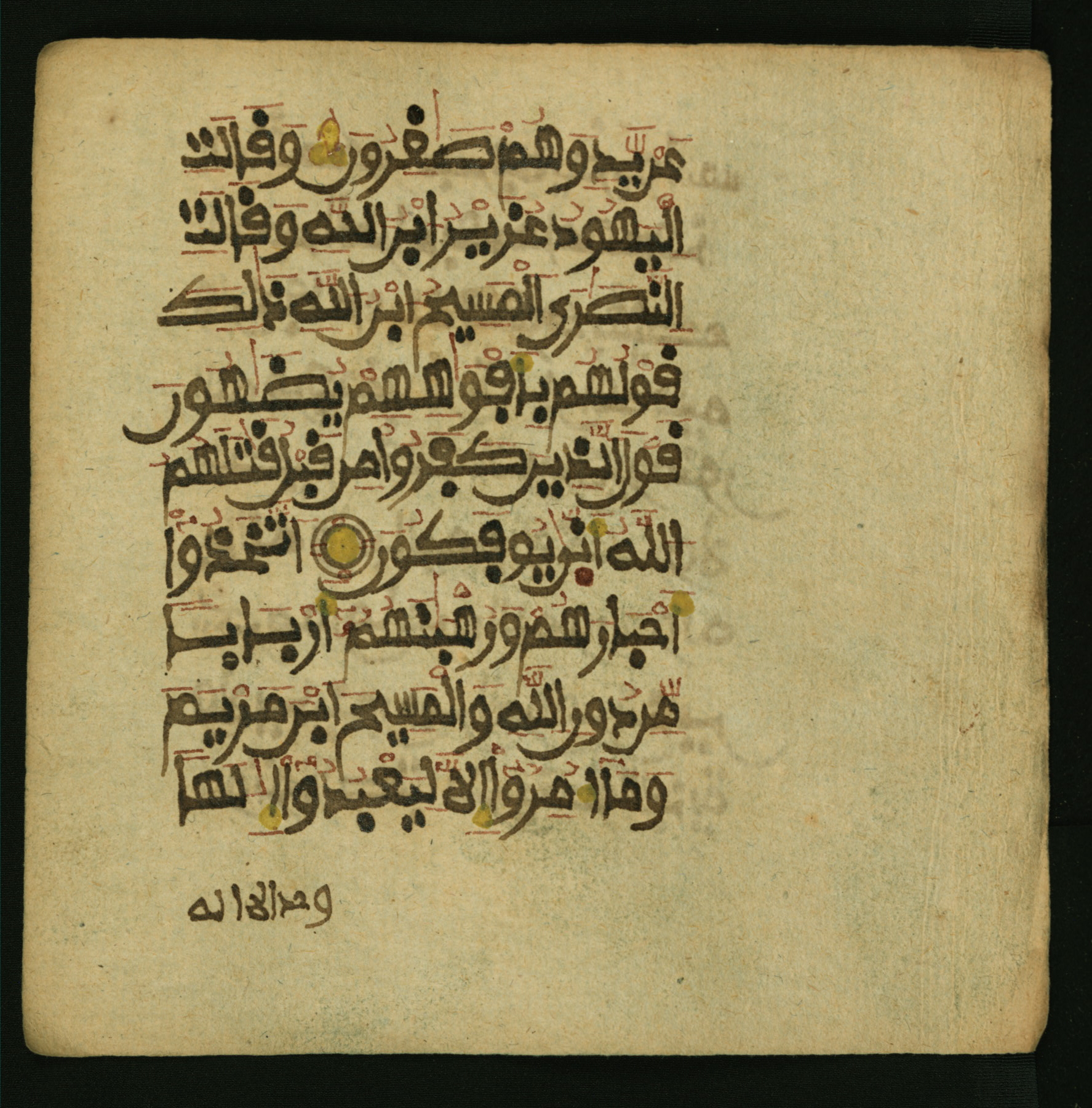 This square-format manuscript is volume 1, containing chapters 1-18 (Sūrat al-fātiḥah through Sūrat al-kahf), of an illuminated two-volume Qur'an produced in Sub-Saharan (West) Africa in the thirteenth century AH / nineteenth CE. The text is written in Sūdānī script in dark brown ink with vocalization in red on loose leaves. Chapter headings are in reddish-brown ink. Three yellow dots outlined in red arranged in a triangular form separate verses. Polychrome circular medallions as well as square and rectangular devices in a variety of patterns and colors mark textual divisions. The leaves of the text are organized between two decorated boards with geometric compositions. The pages and boards are housed in a leather pouch (satchel).