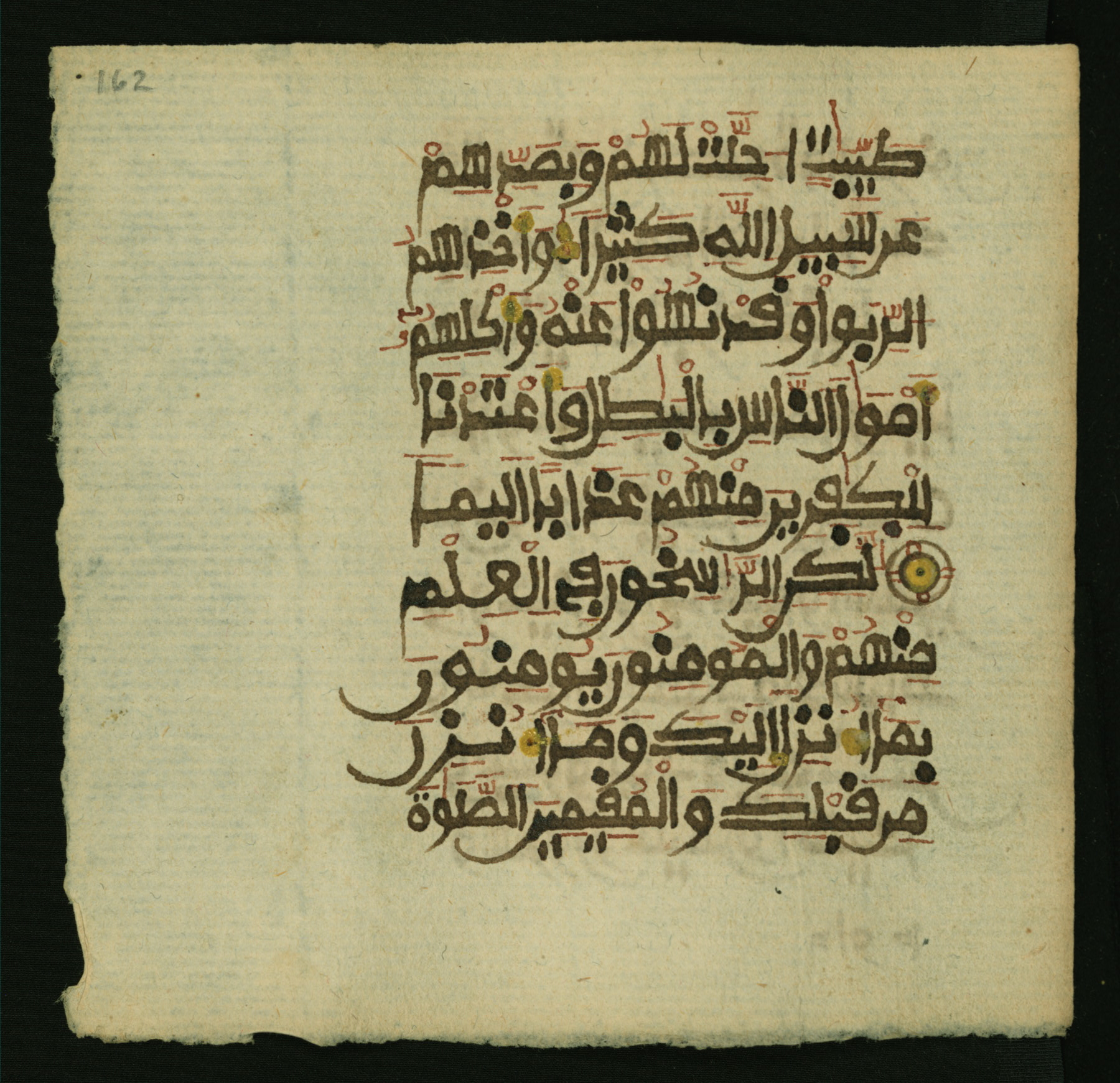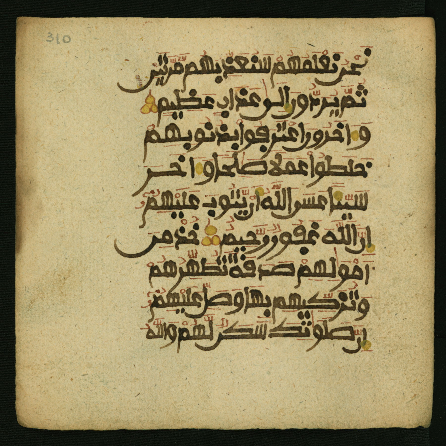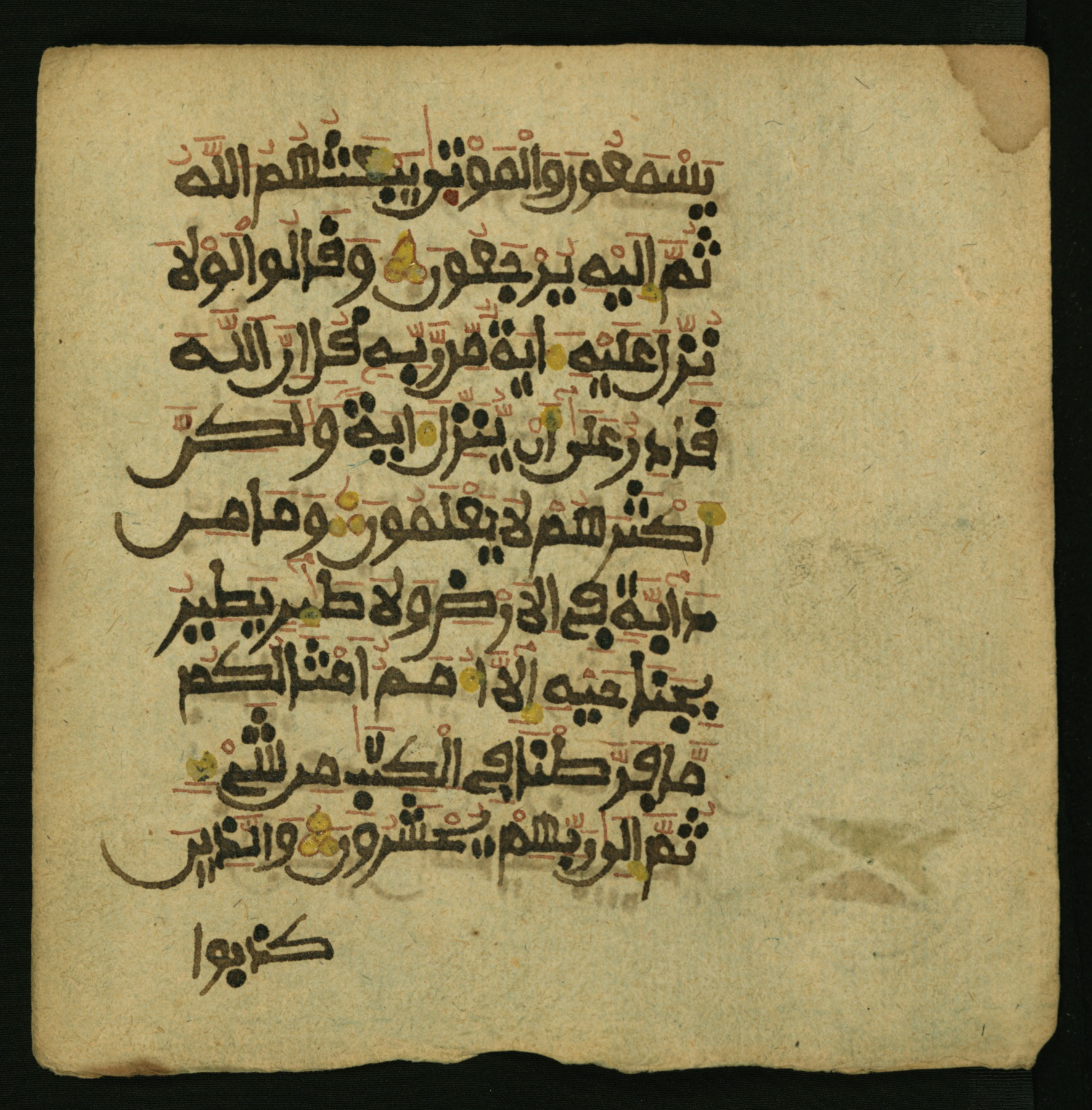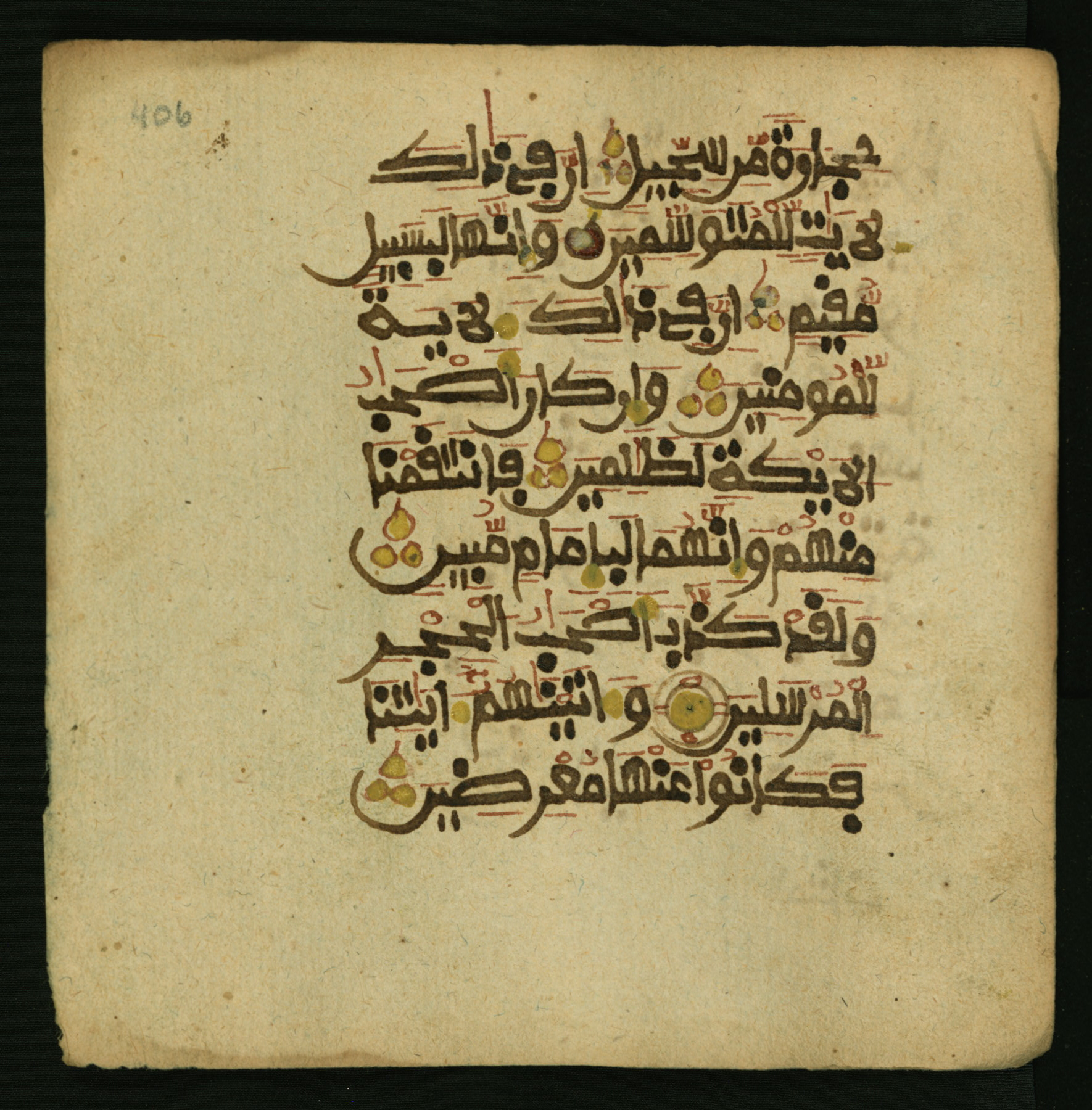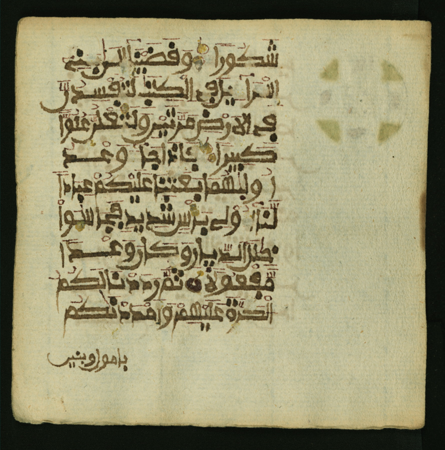 This square-format manuscript is volume 1, containing chapters 1-18 (Sūrat al-fātiḥah through Sūrat al-kahf), of an illuminated two-volume Qur'an produced in Sub-Saharan (West) Africa in the thirteenth century AH / nineteenth CE. The text is written in Sūdānī script in dark brown ink with vocalization in red on loose leaves. Chapter headings are in reddish-brown ink. Three yellow dots outlined in red arranged in a triangular form separate verses. Polychrome circular medallions as well as square and rectangular devices in a variety of patterns and colors mark textual divisions. The leaves of the text are organized between two decorated boards with geometric compositions. The pages and boards are housed in a leather pouch (satchel).