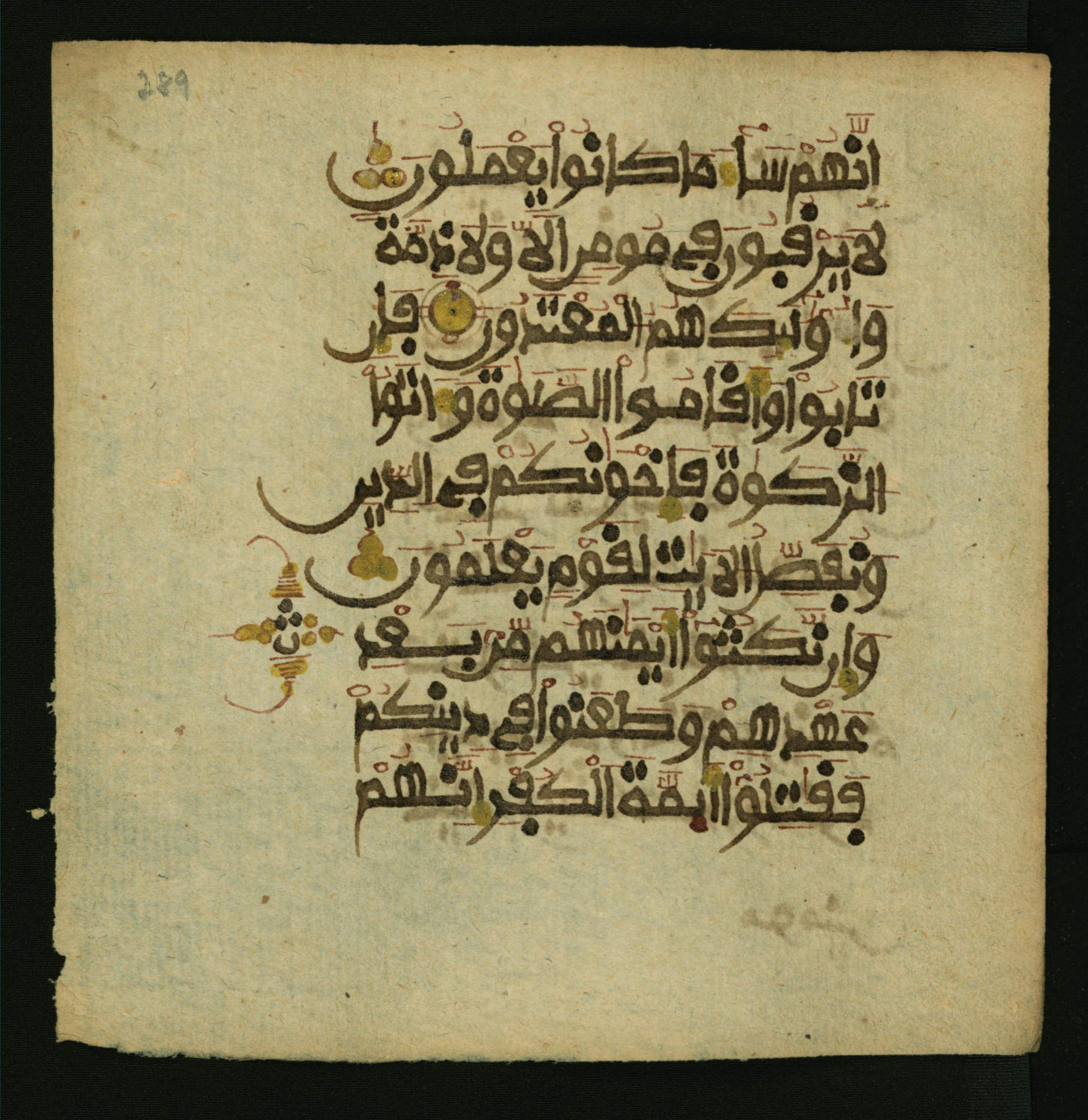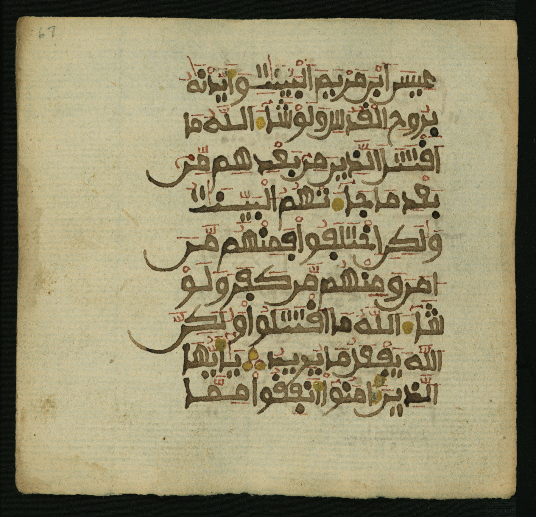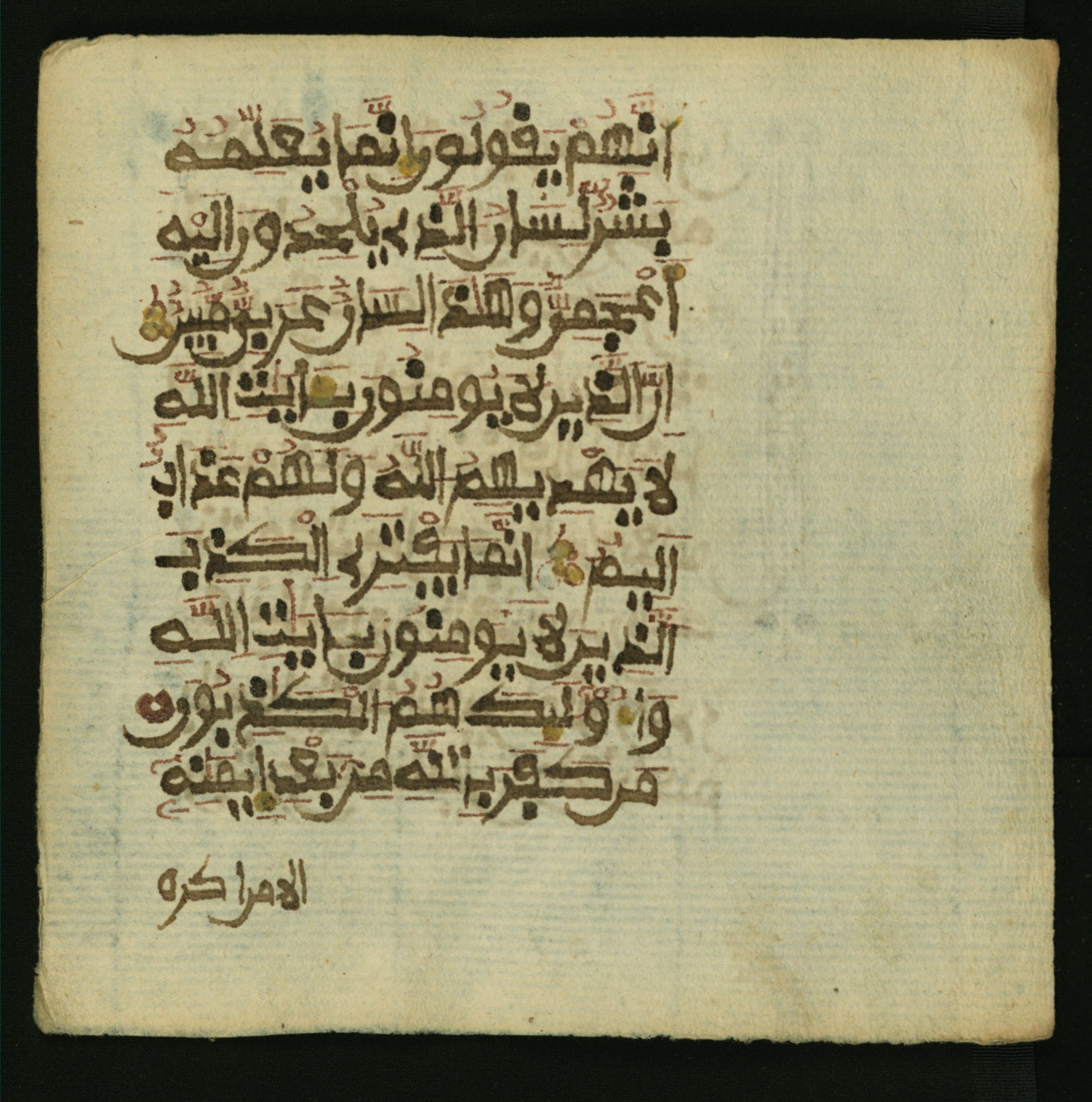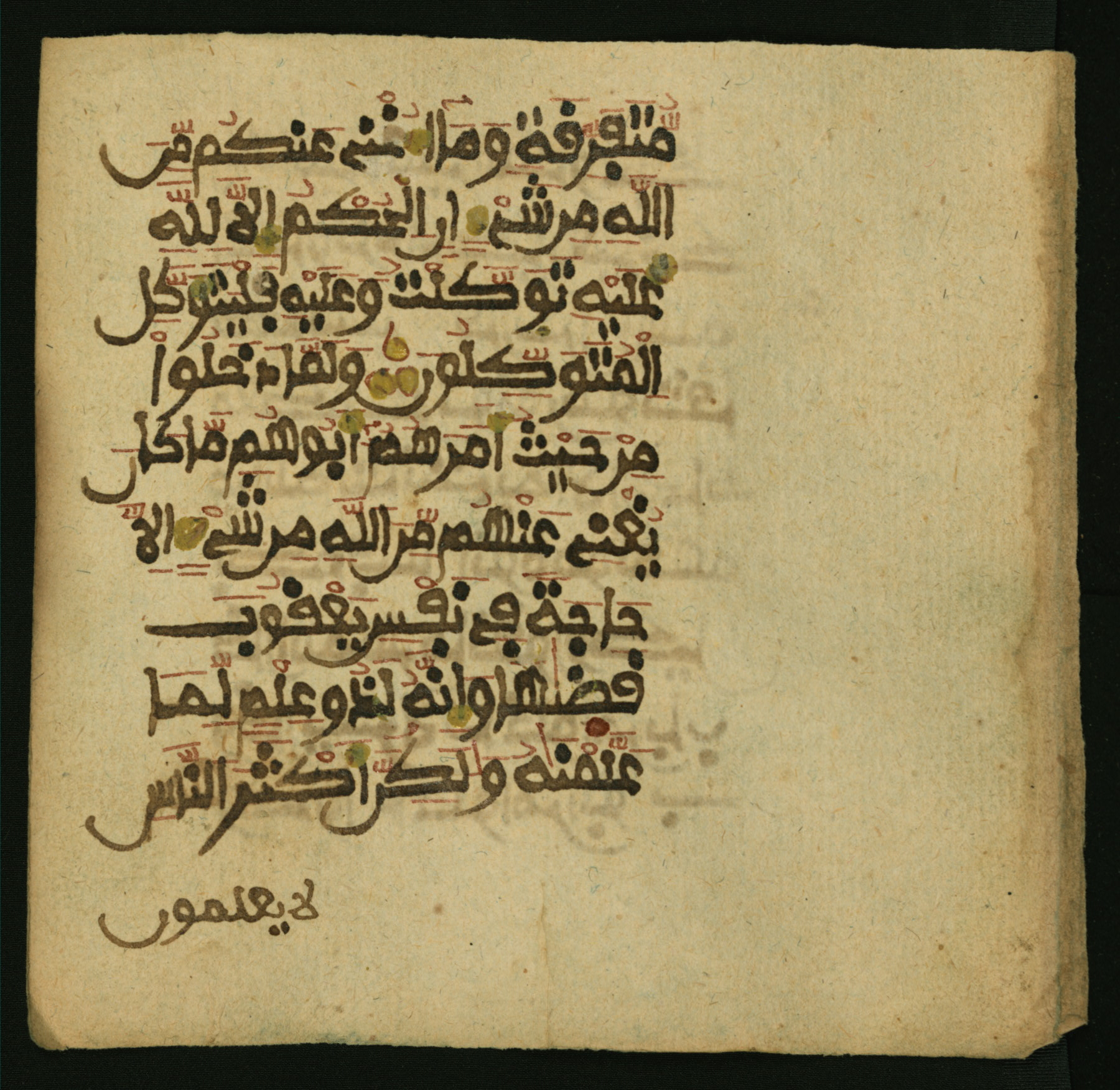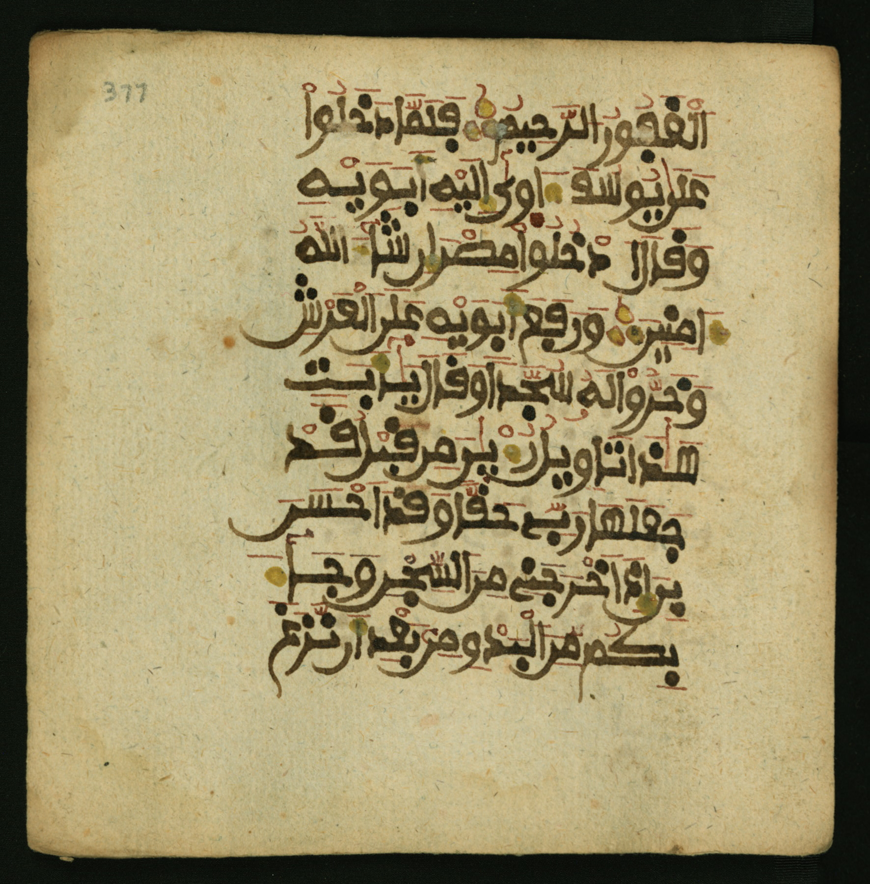 This square-format manuscript is volume 1, containing chapters 1-18 (Sūrat al-fātiḥah through Sūrat al-kahf), of an illuminated two-volume Qur'an produced in Sub-Saharan (West) Africa in the thirteenth century AH / nineteenth CE. The text is written in Sūdānī script in dark brown ink with vocalization in red on loose leaves. Chapter headings are in reddish-brown ink. Three yellow dots outlined in red arranged in a triangular form separate verses. Polychrome circular medallions as well as square and rectangular devices in a variety of patterns and colors mark textual divisions. The leaves of the text are organized between two decorated boards with geometric compositions. The pages and boards are housed in a leather pouch (satchel).