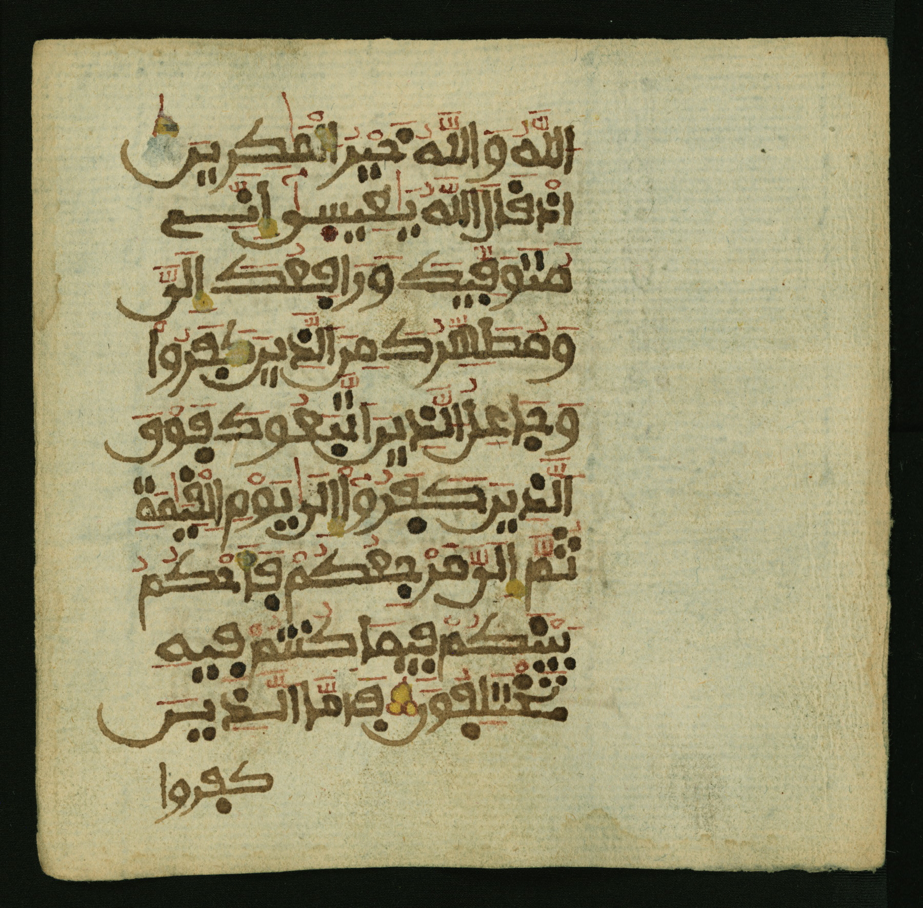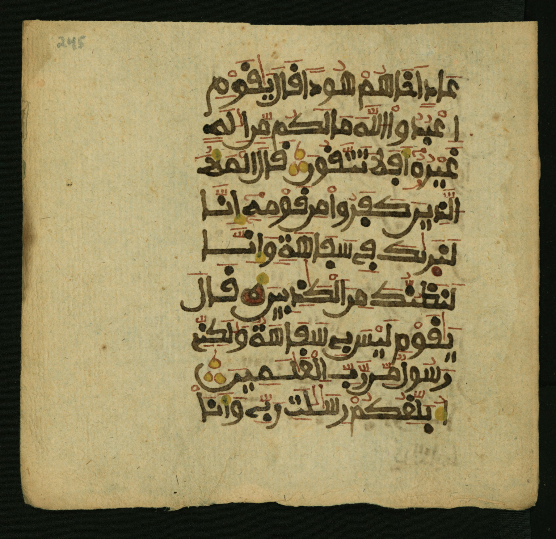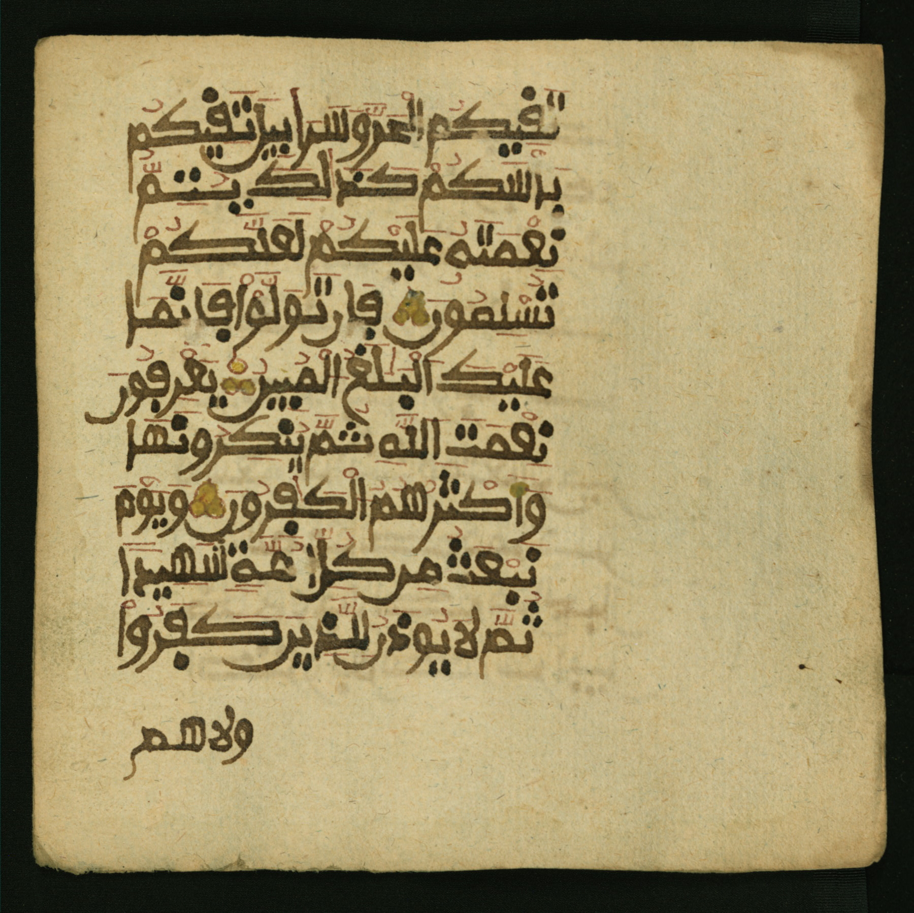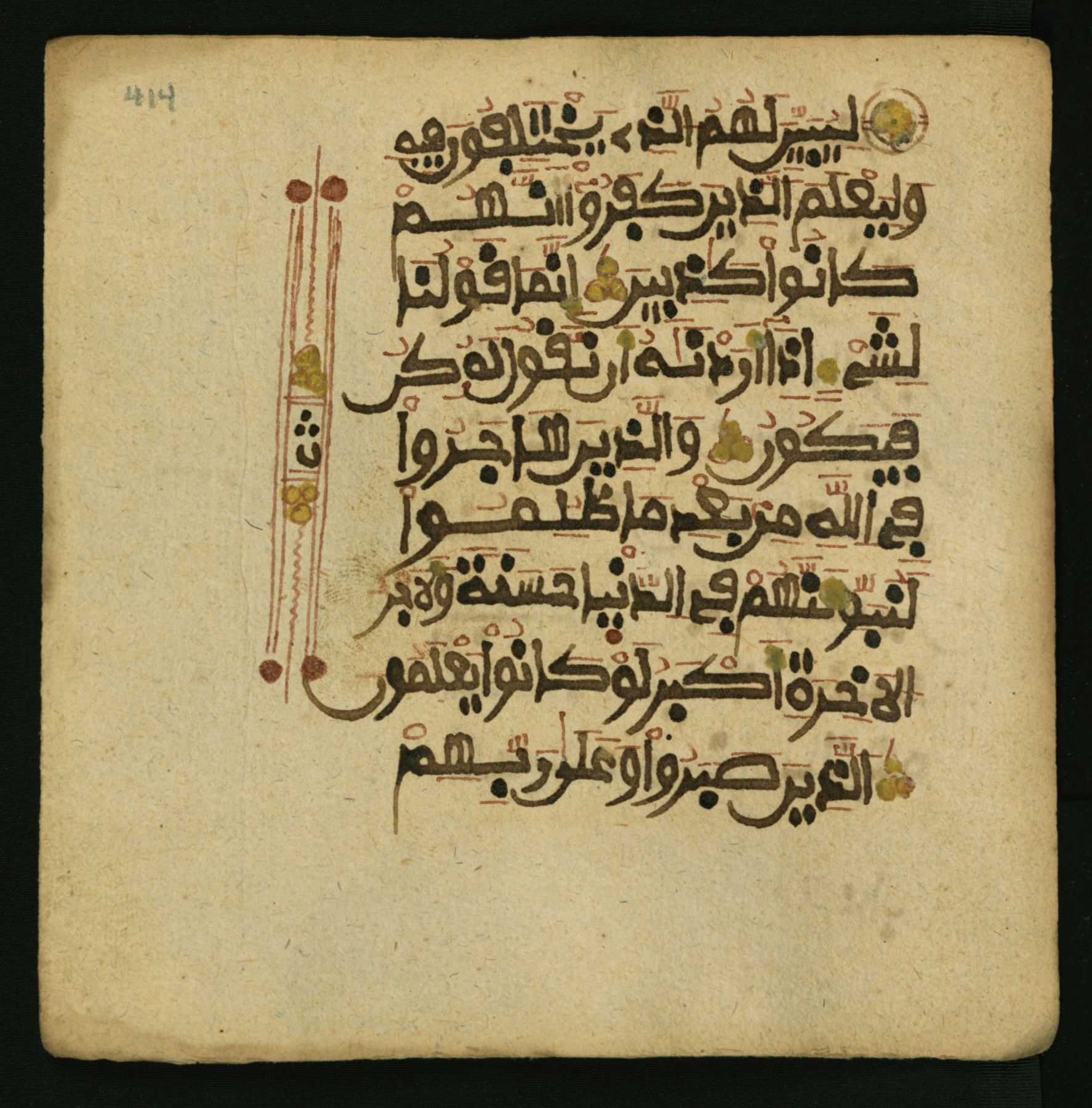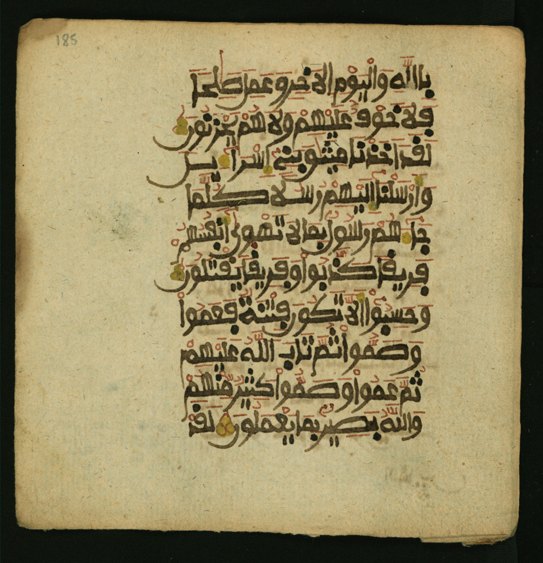 This square-format manuscript is volume 1, containing chapters 1-18 (Sūrat al-fātiḥah through Sūrat al-kahf), of an illuminated two-volume Qur'an produced in Sub-Saharan (West) Africa in the thirteenth century AH / nineteenth CE. The text is written in Sūdānī script in dark brown ink with vocalization in red on loose leaves. Chapter headings are in reddish-brown ink. Three yellow dots outlined in red arranged in a triangular form separate verses. Polychrome circular medallions as well as square and rectangular devices in a variety of patterns and colors mark textual divisions. The leaves of the text are organized between two decorated boards with geometric compositions. The pages and boards are housed in a leather pouch (satchel).