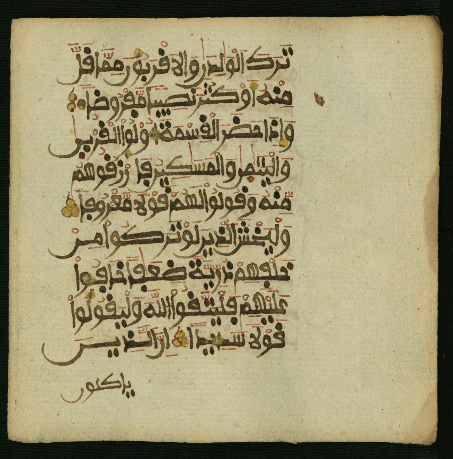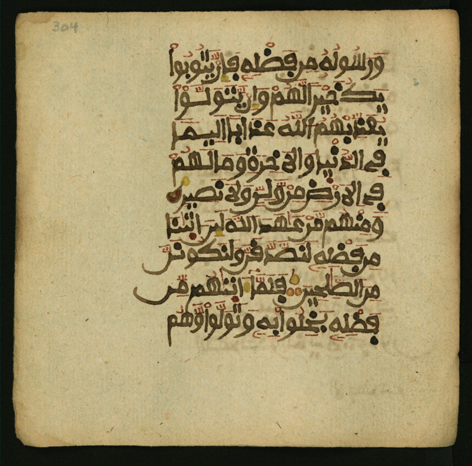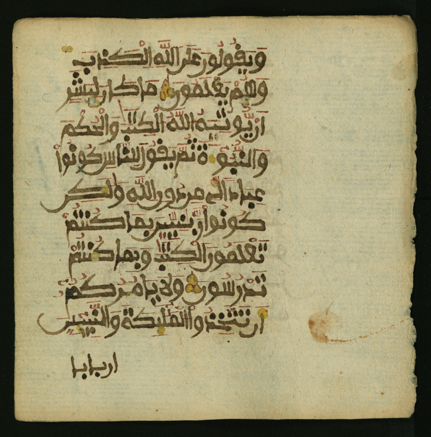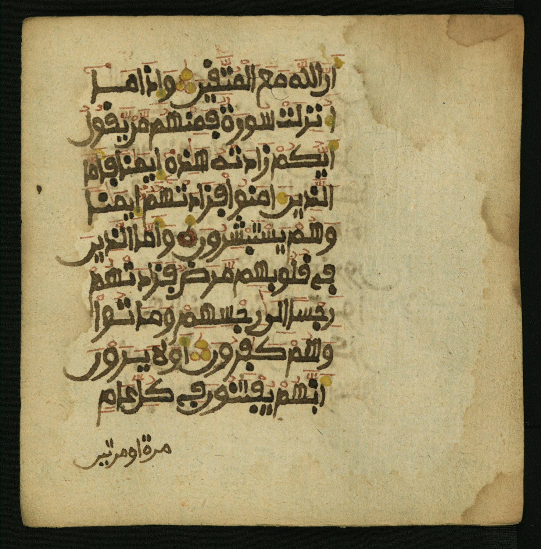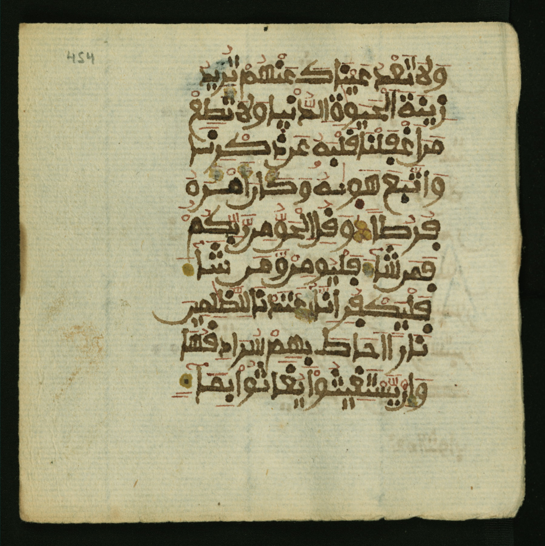 This square-format manuscript is volume 1, containing chapters 1-18 (Sūrat al-fātiḥah through Sūrat al-kahf), of an illuminated two-volume Qur'an produced in Sub-Saharan (West) Africa in the thirteenth century AH / nineteenth CE. The text is written in Sūdānī script in dark brown ink with vocalization in red on loose leaves. Chapter headings are in reddish-brown ink. Three yellow dots outlined in red arranged in a triangular form separate verses. Polychrome circular medallions as well as square and rectangular devices in a variety of patterns and colors mark textual divisions. The leaves of the text are organized between two decorated boards with geometric compositions. The pages and boards are housed in a leather pouch (satchel).