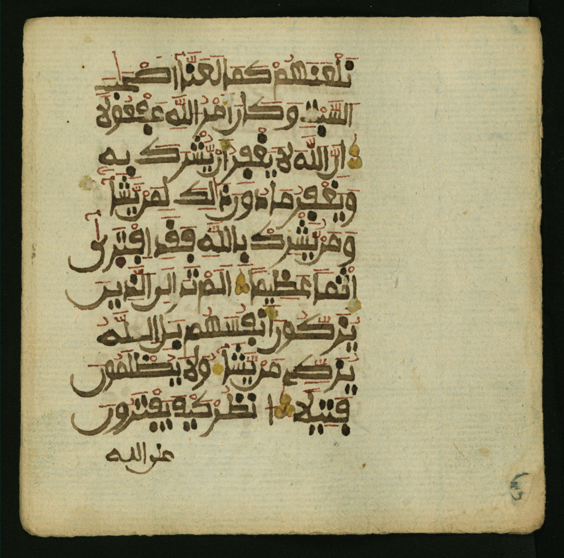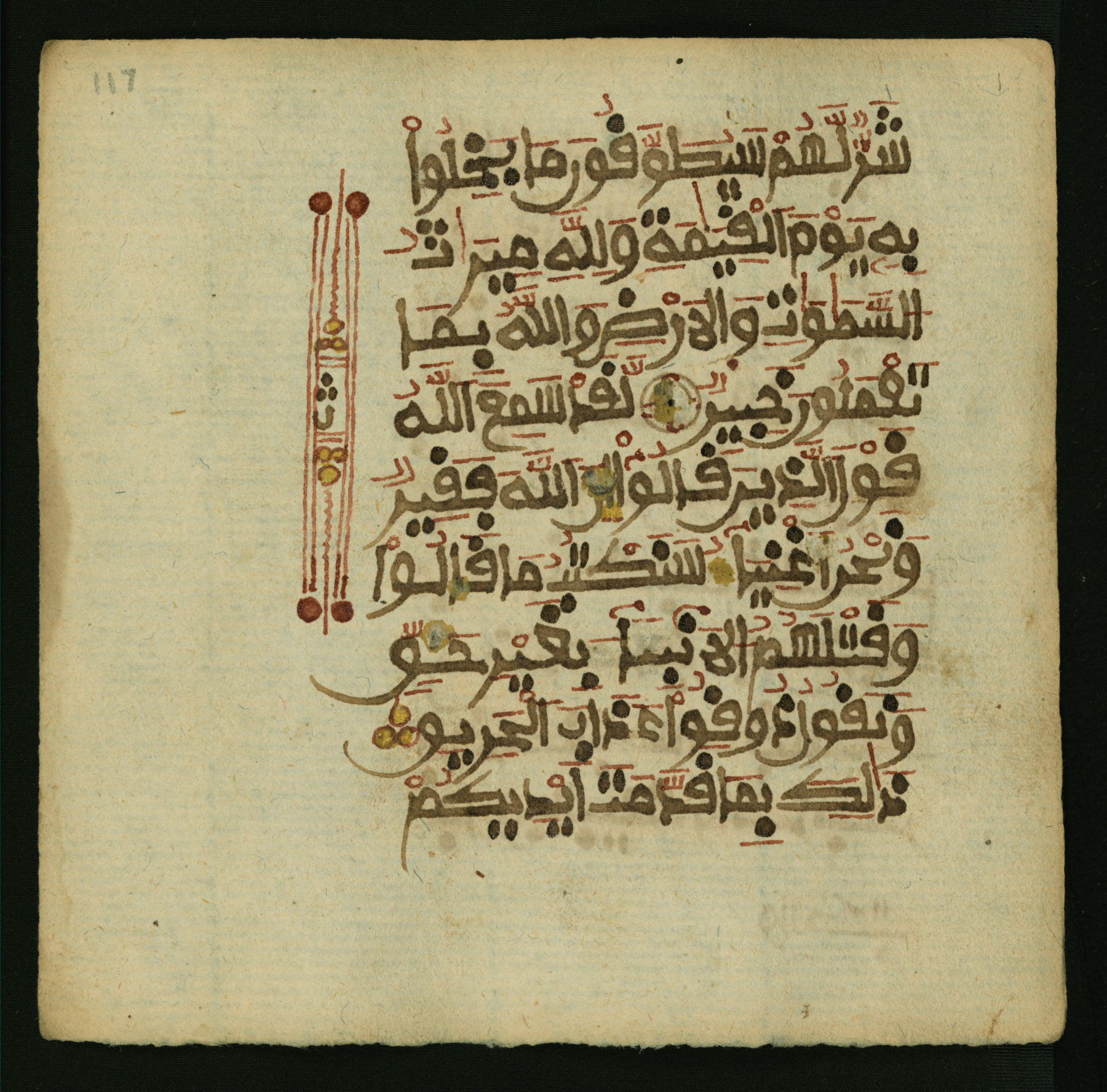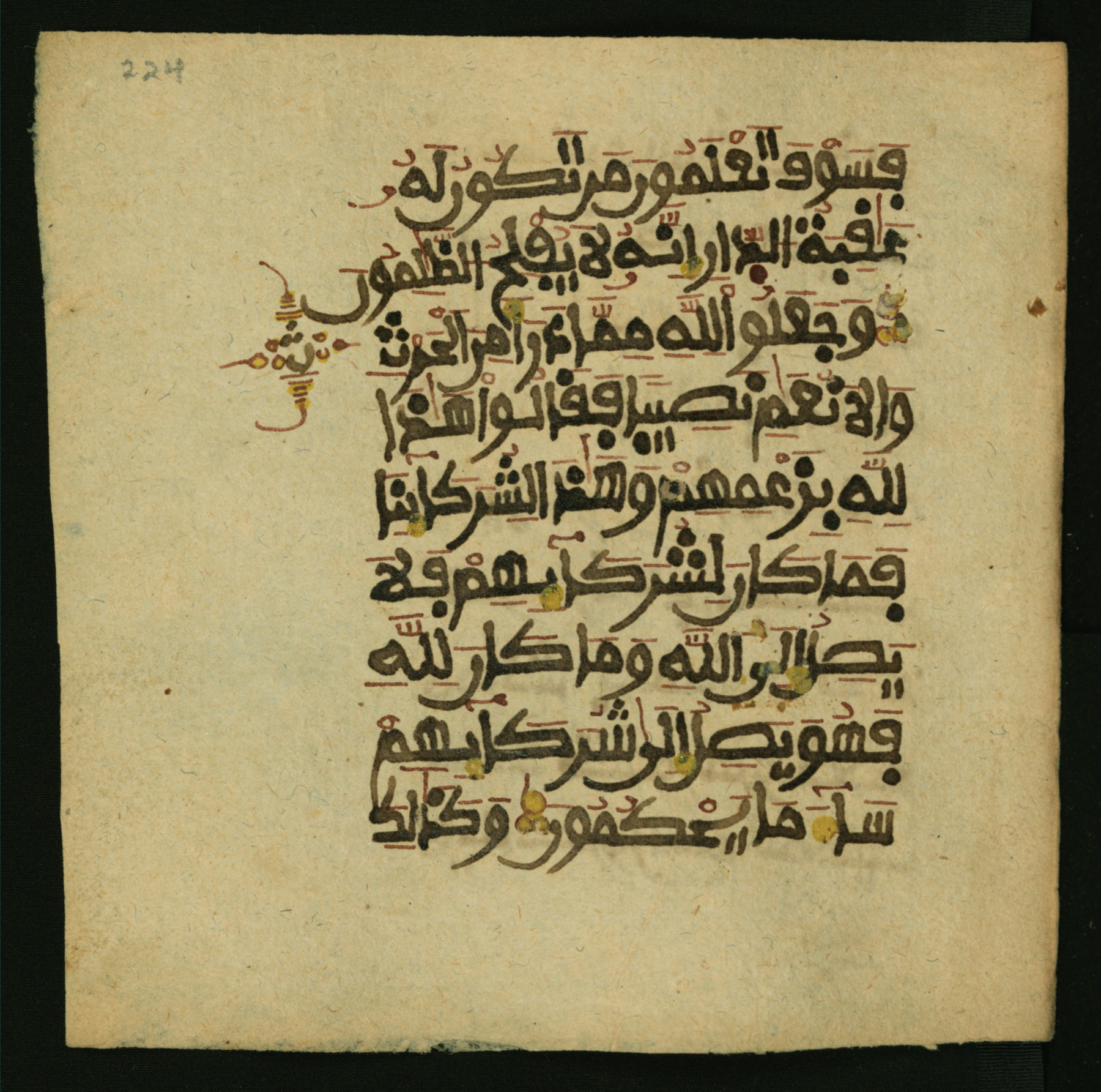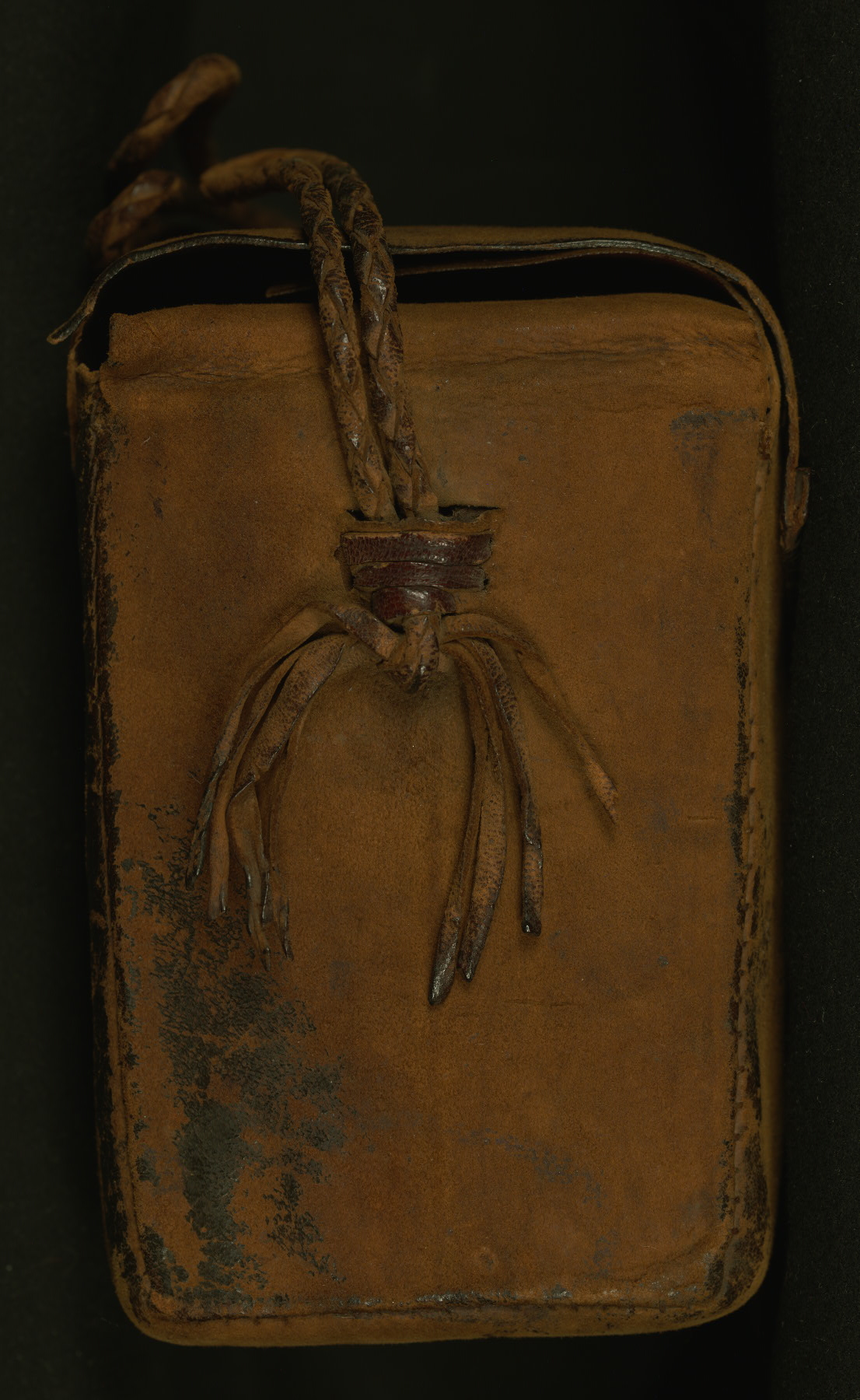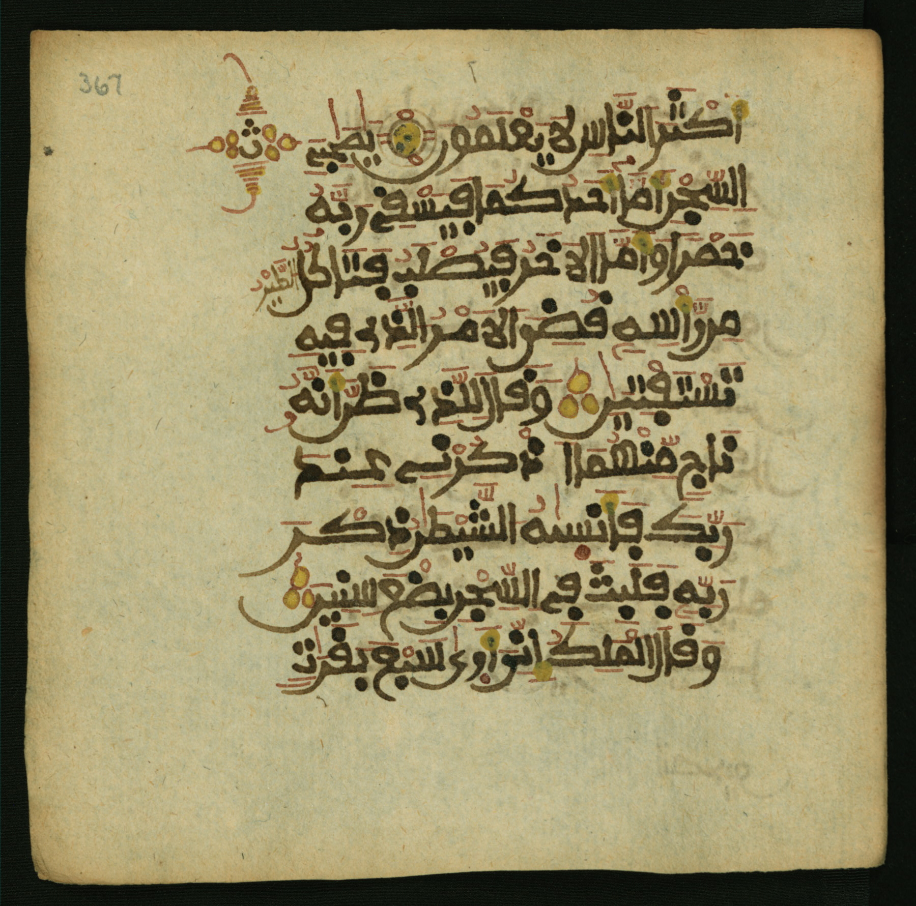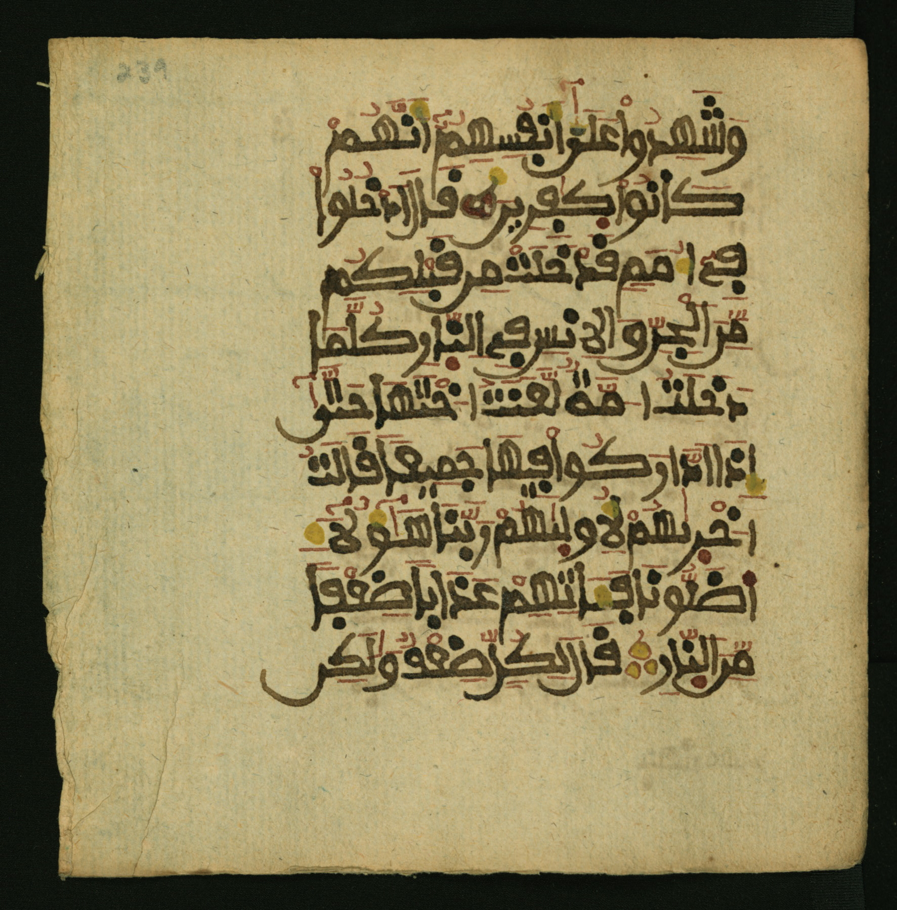 This square-format manuscript is volume 1, containing chapters 1-18 (Sūrat al-fātiḥah through Sūrat al-kahf), of an illuminated two-volume Qur'an produced in Sub-Saharan (West) Africa in the thirteenth century AH / nineteenth CE. The text is written in Sūdānī script in dark brown ink with vocalization in red on loose leaves. Chapter headings are in reddish-brown ink. Three yellow dots outlined in red arranged in a triangular form separate verses. Polychrome circular medallions as well as square and rectangular devices in a variety of patterns and colors mark textual divisions. The leaves of the text are organized between two decorated boards with geometric compositions. The pages and boards are housed in a leather pouch (satchel).