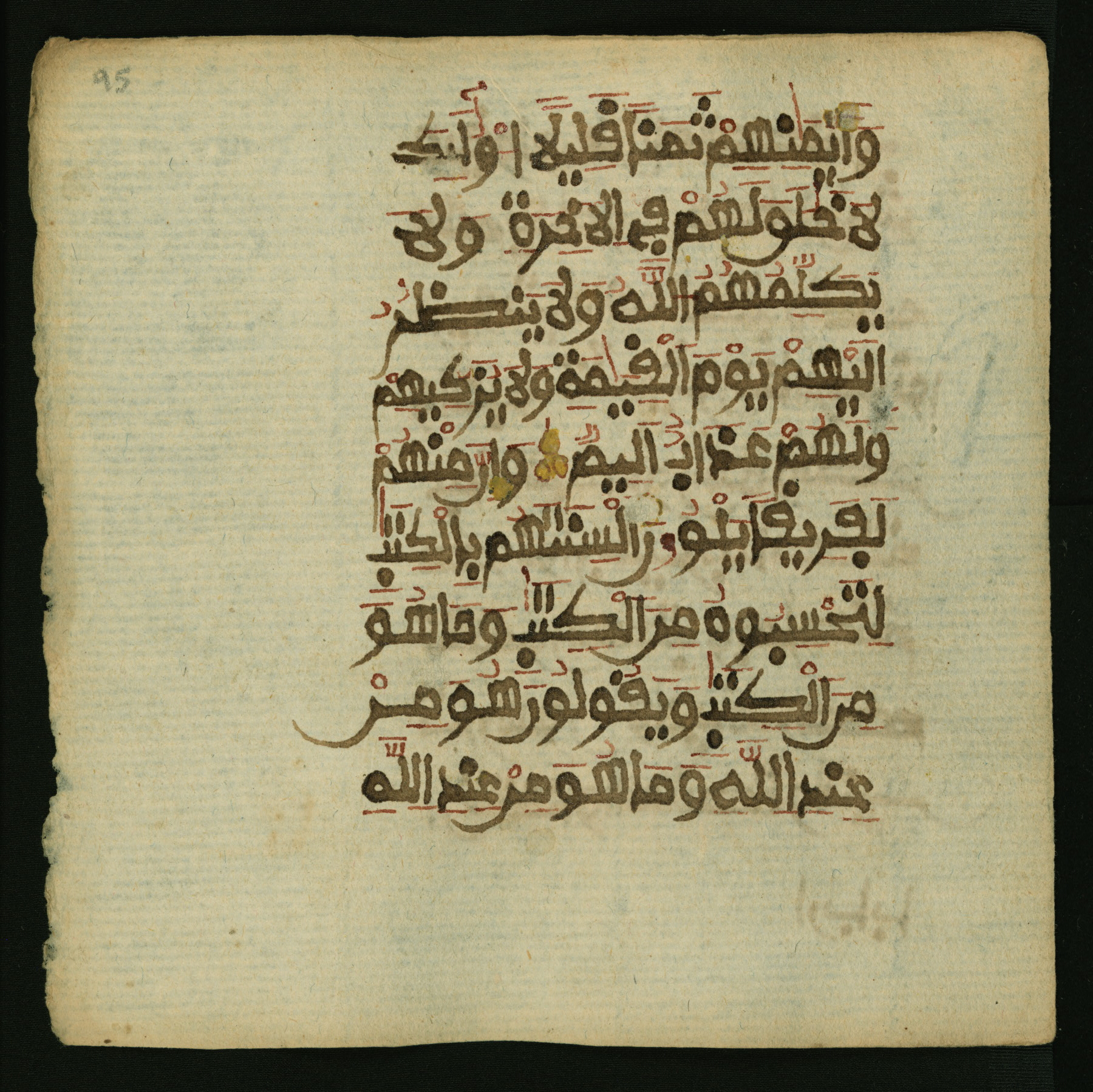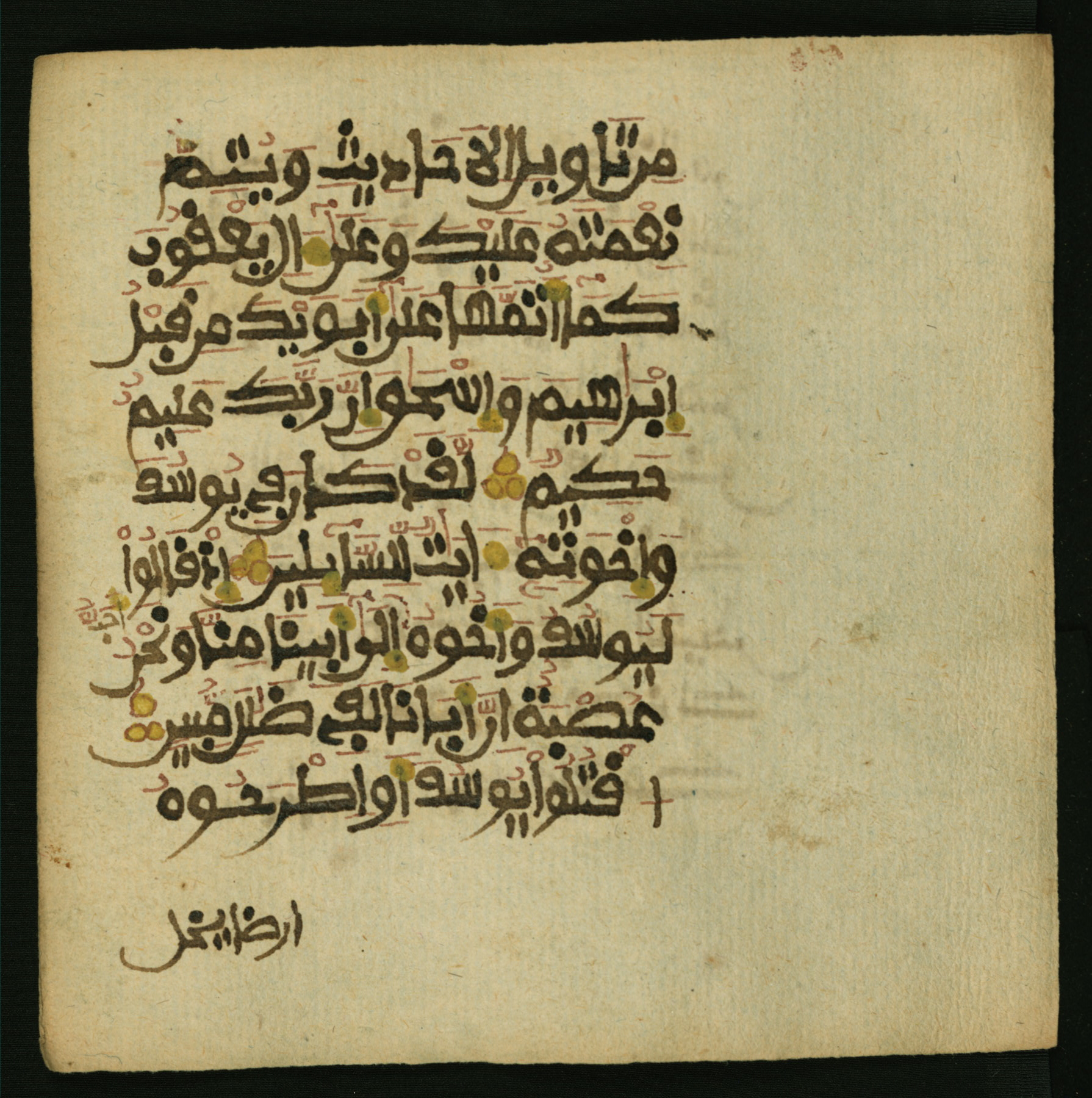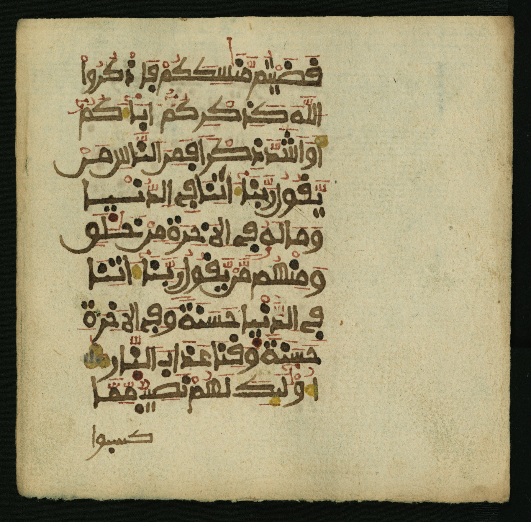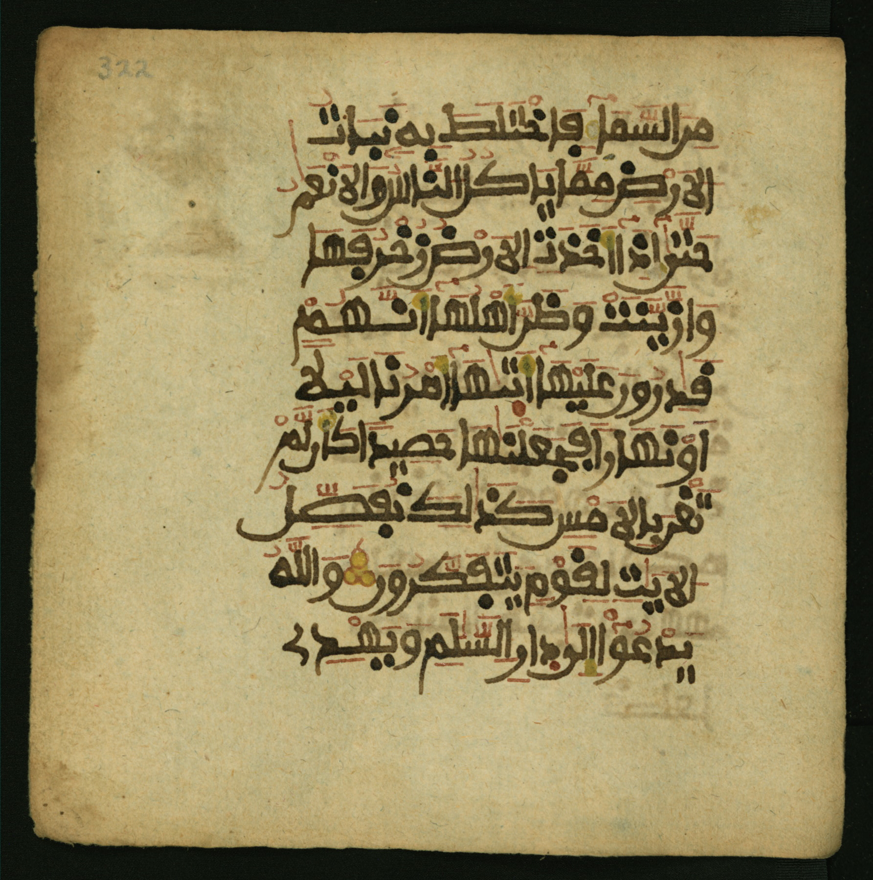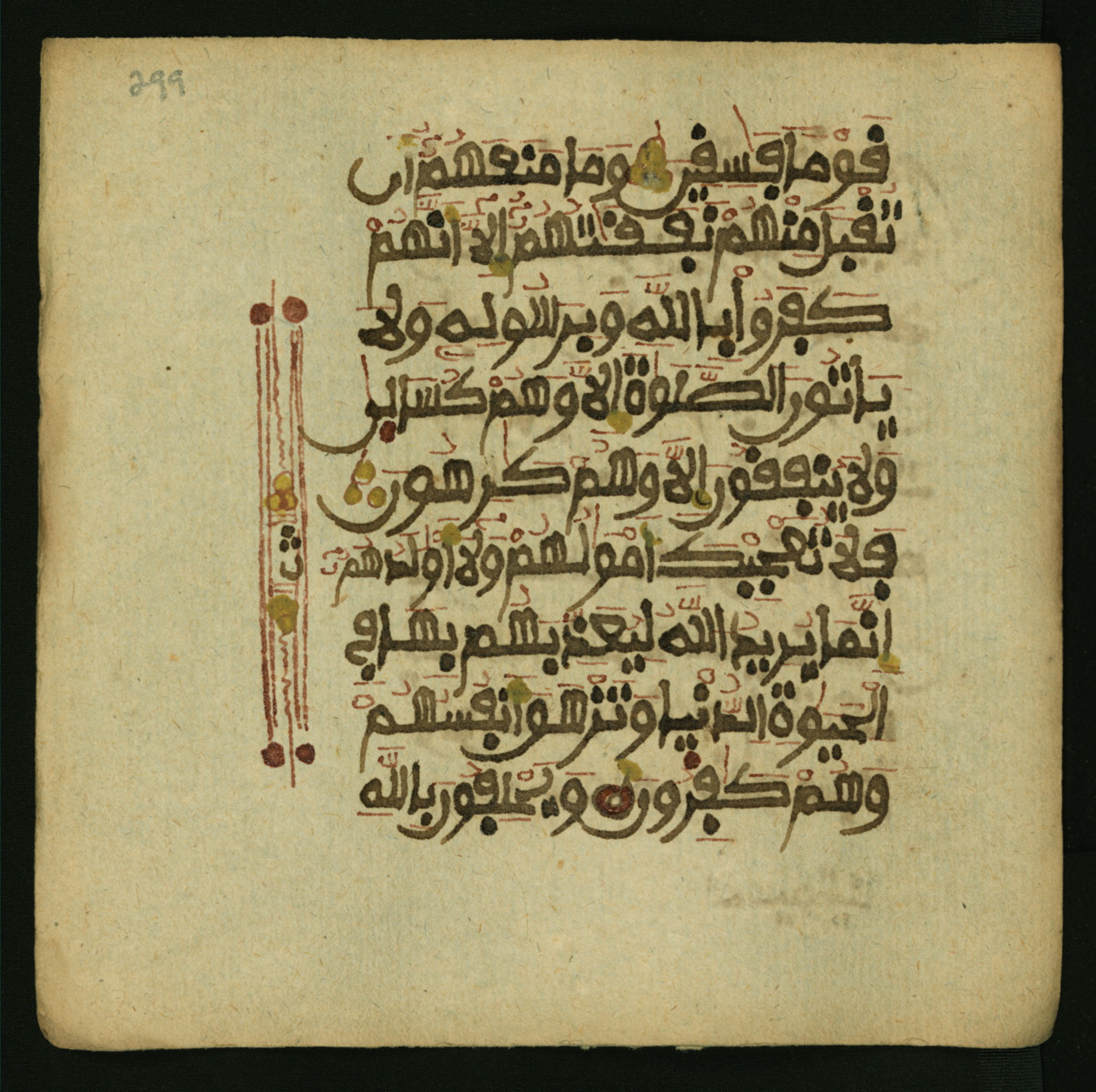 This square-format manuscript is volume 1, containing chapters 1-18 (Sūrat al-fātiḥah through Sūrat al-kahf), of an illuminated two-volume Qur'an produced in Sub-Saharan (West) Africa in the thirteenth century AH / nineteenth CE. The text is written in Sūdānī script in dark brown ink with vocalization in red on loose leaves. Chapter headings are in reddish-brown ink. Three yellow dots outlined in red arranged in a triangular form separate verses. Polychrome circular medallions as well as square and rectangular devices in a variety of patterns and colors mark textual divisions. The leaves of the text are organized between two decorated boards with geometric compositions. The pages and boards are housed in a leather pouch (satchel).
