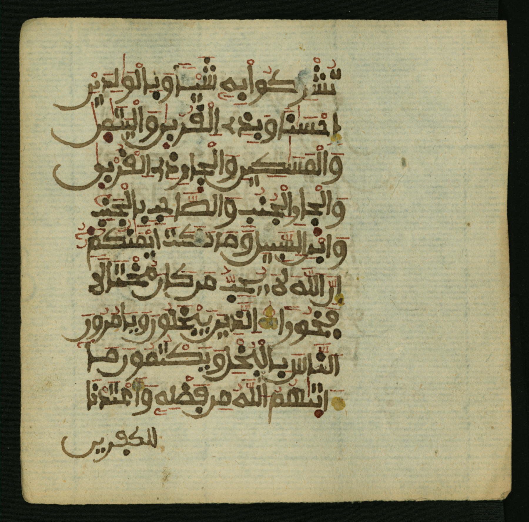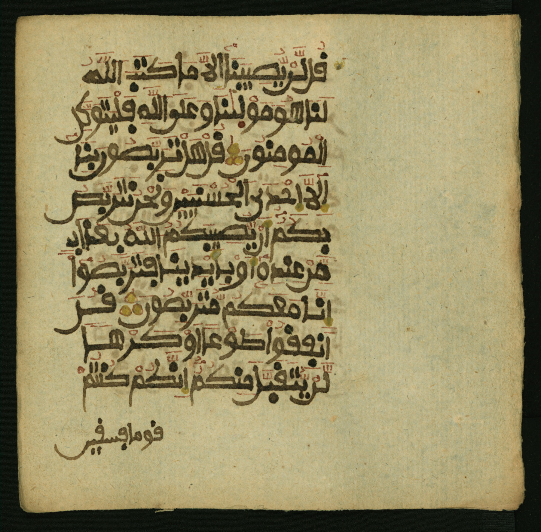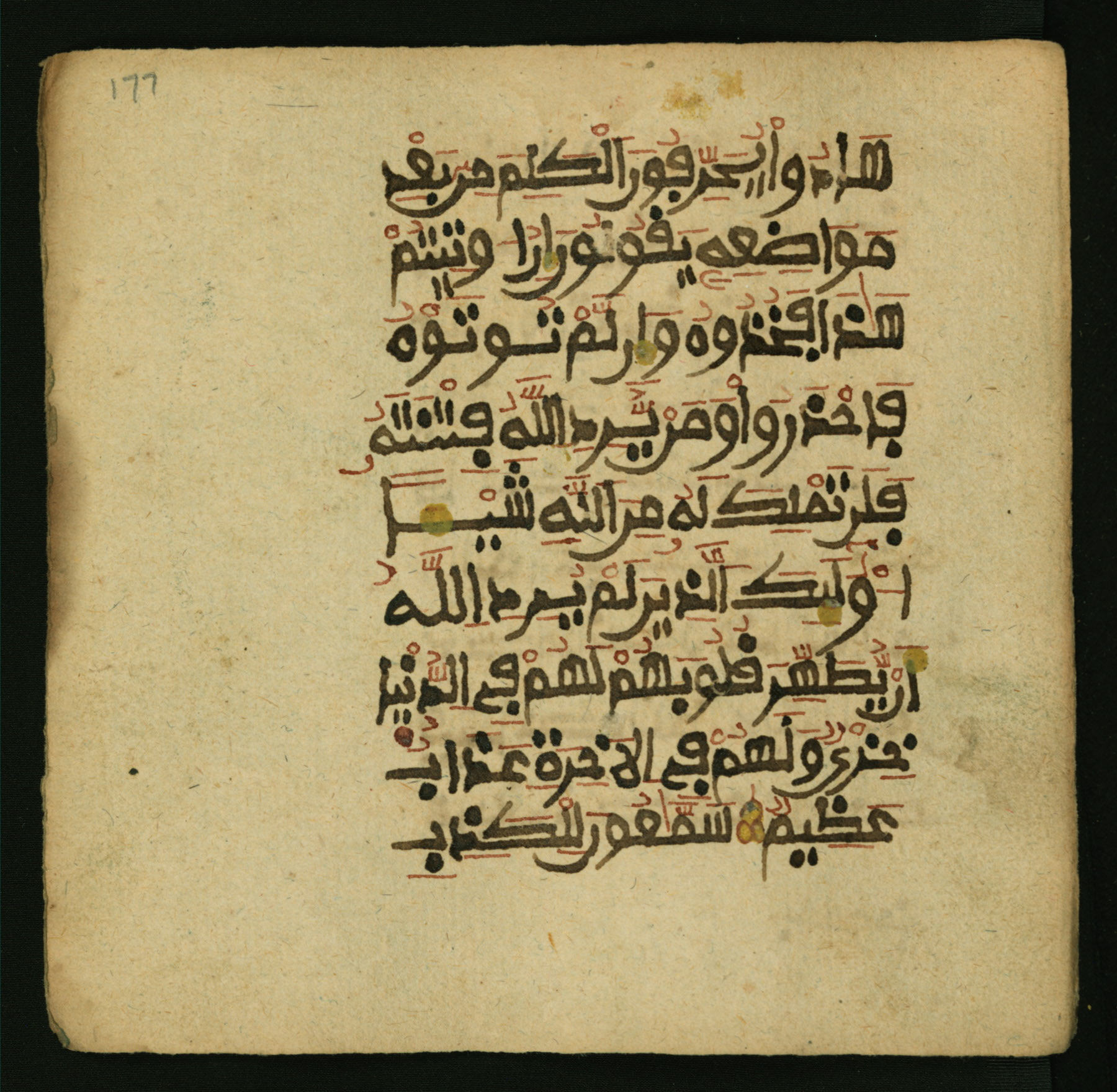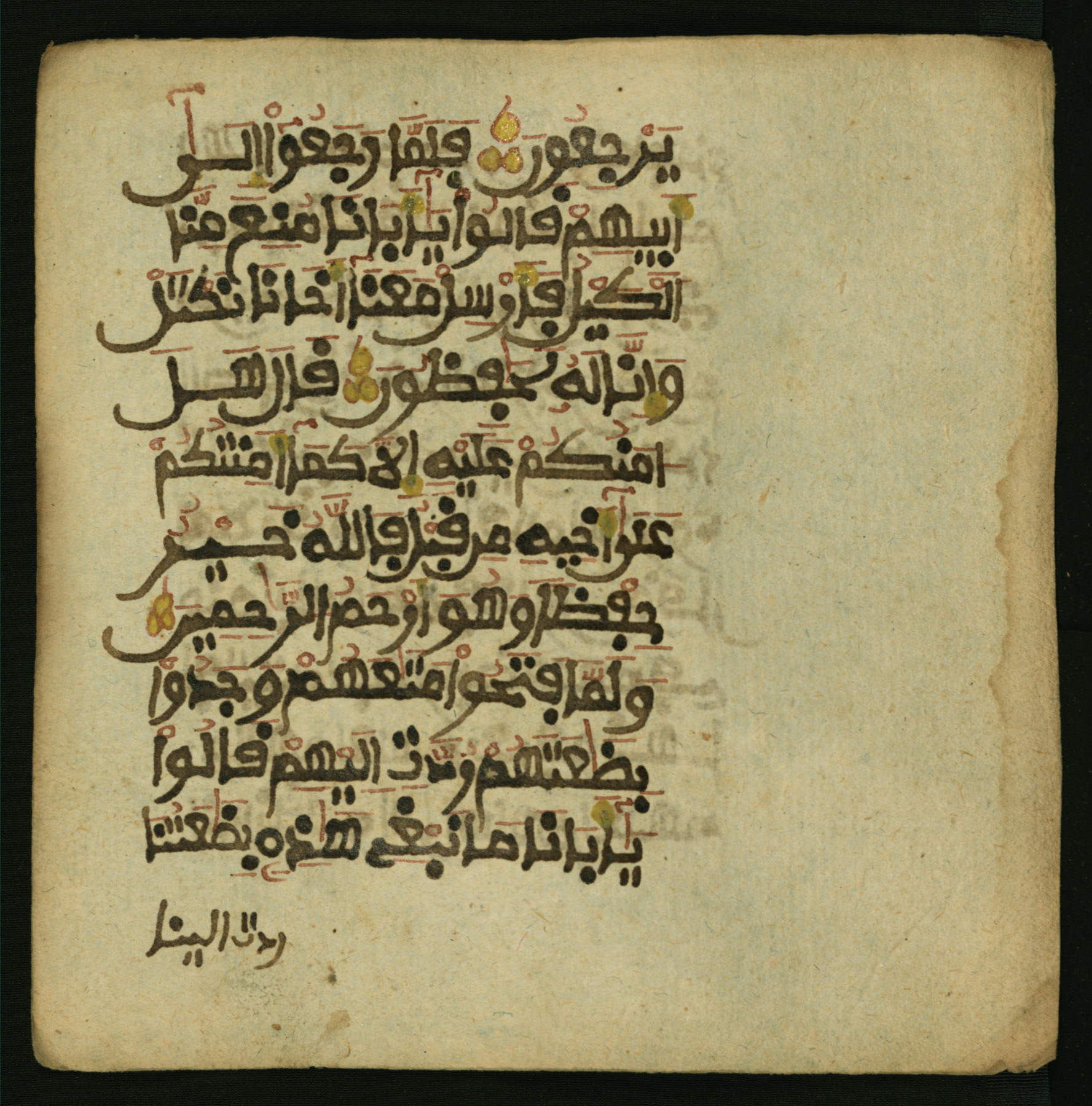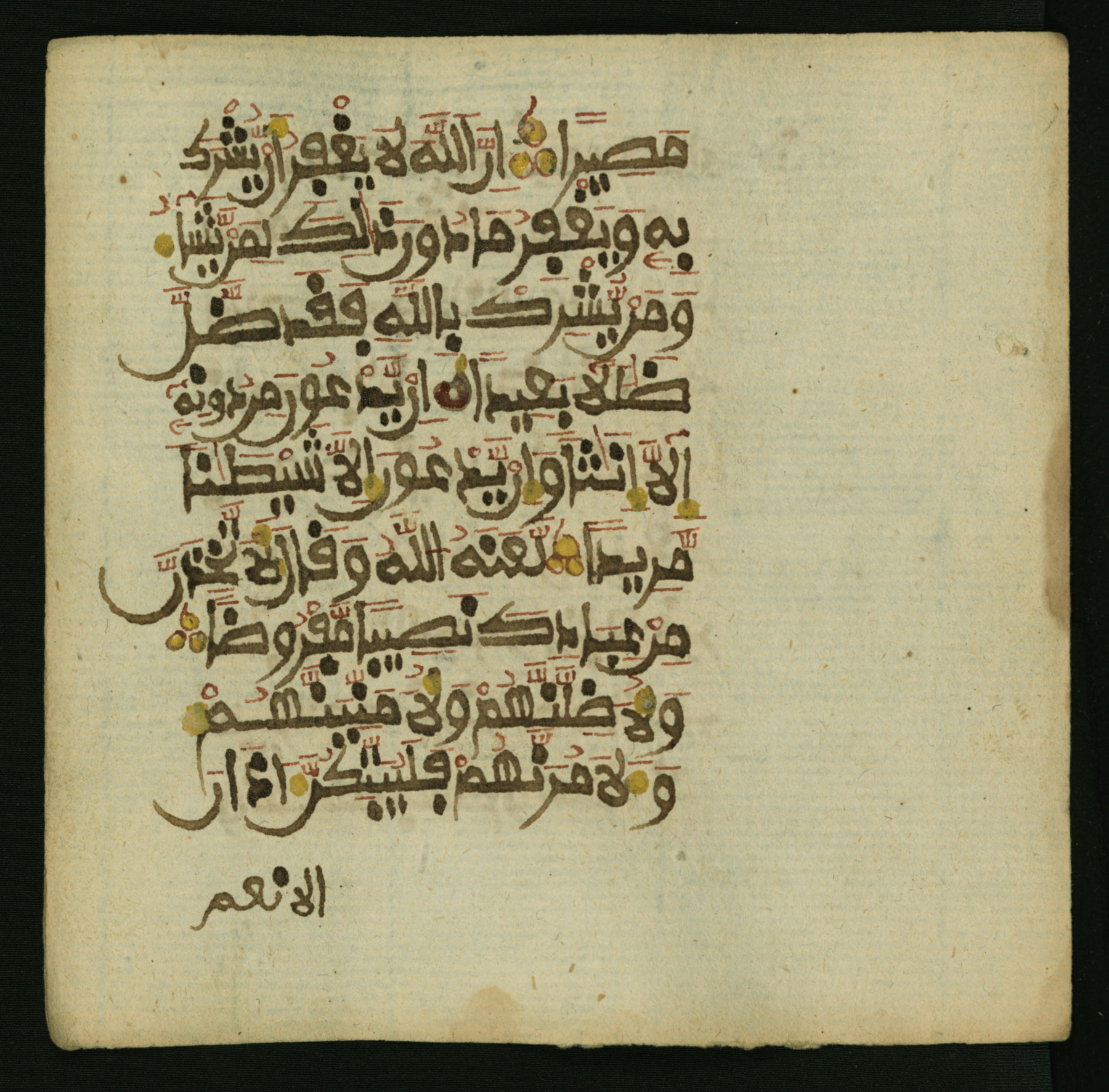This square-format manuscript is volume 1, containing chapters 1-18 (Sūrat al-fātiḥah through Sūrat al-kahf), of an illuminated two-volume Qur'an produced in Sub-Saharan (West) Africa in the thirteenth century AH / nineteenth CE. The text is written in Sūdānī script in dark brown ink with vocalization in red on loose leaves. Chapter headings are in reddish-brown ink. Three yellow dots outlined in red arranged in a triangular form separate verses. Polychrome circular medallions as well as square and rectangular devices in a variety of patterns and colors mark textual divisions. The leaves of the text are organized between two decorated boards with geometric compositions. The pages and boards are housed in a leather pouch (satchel).