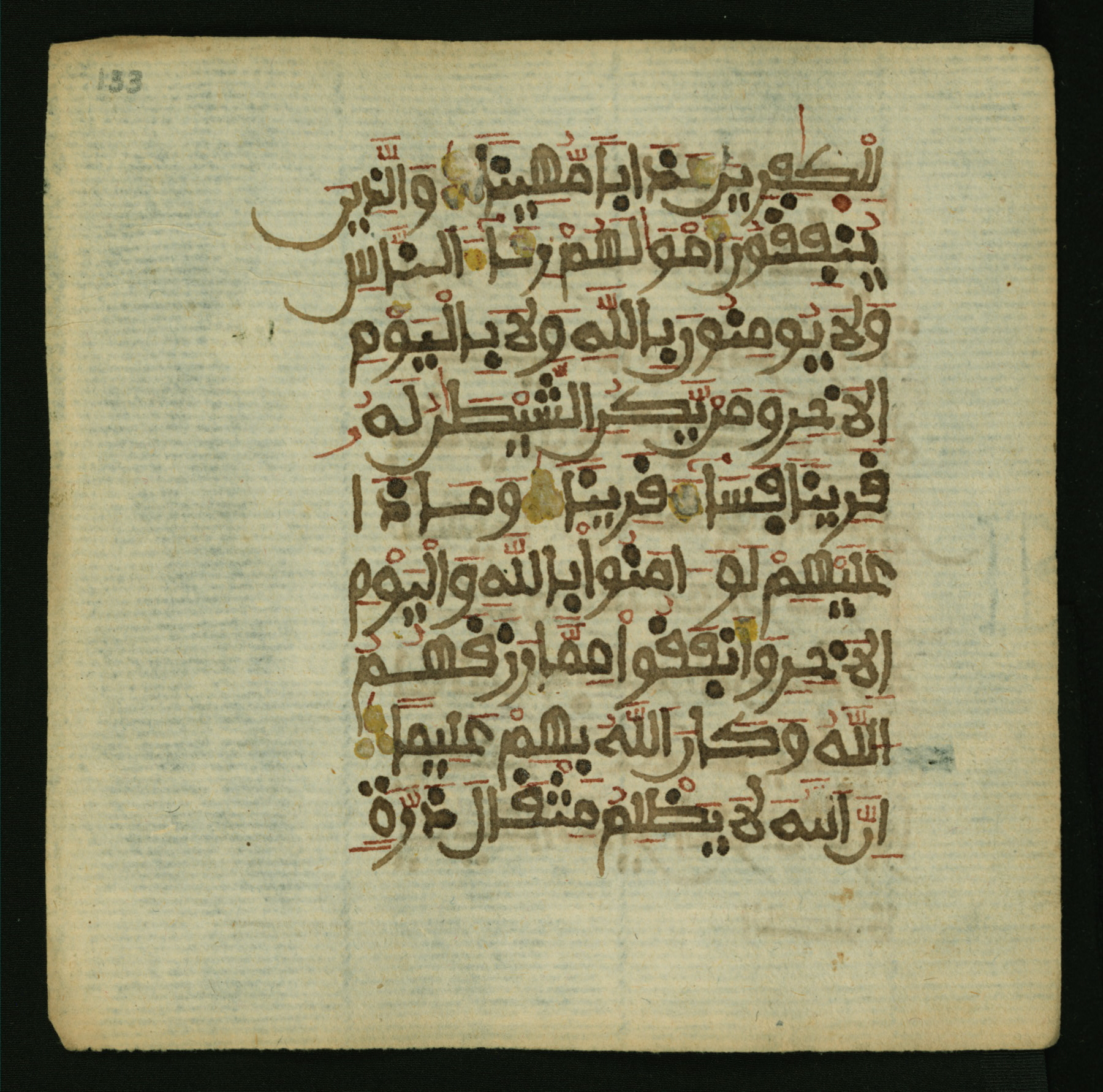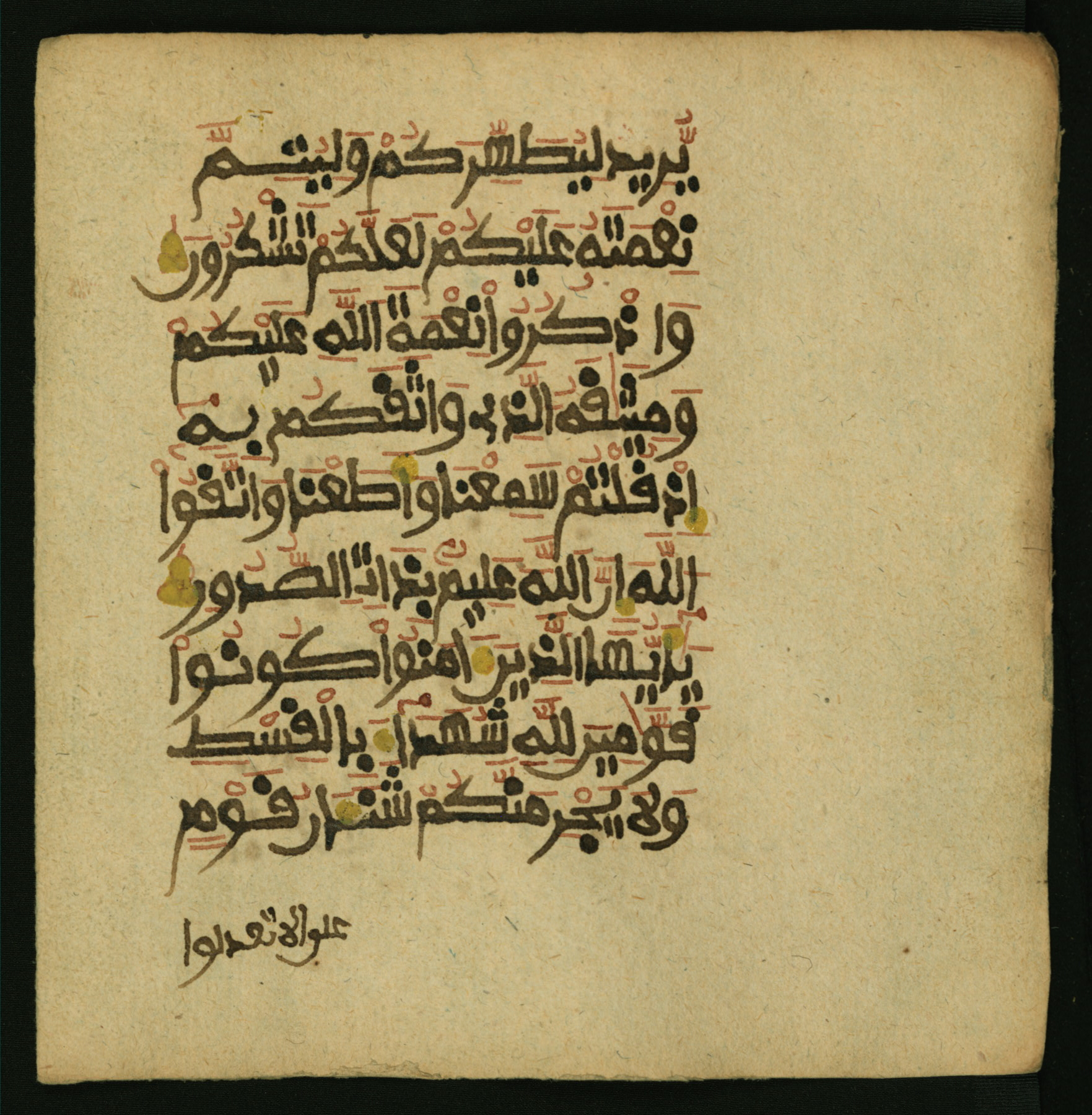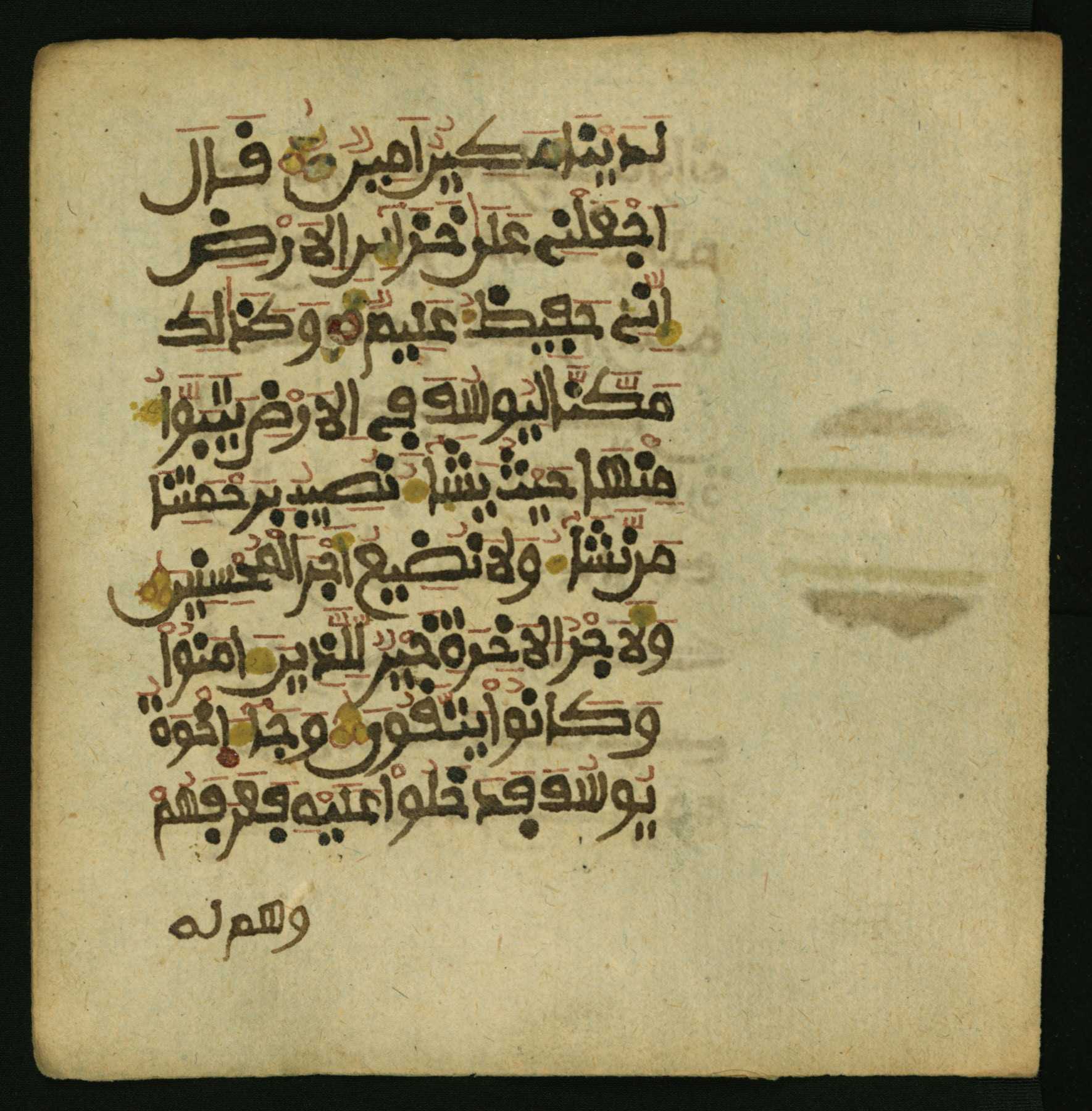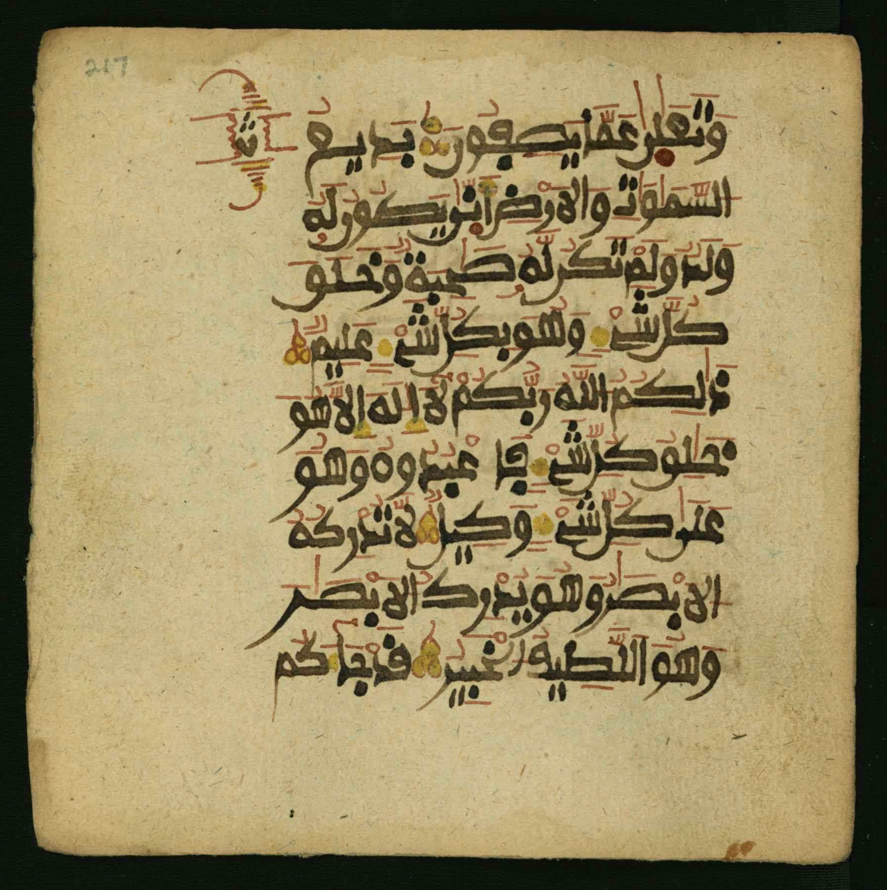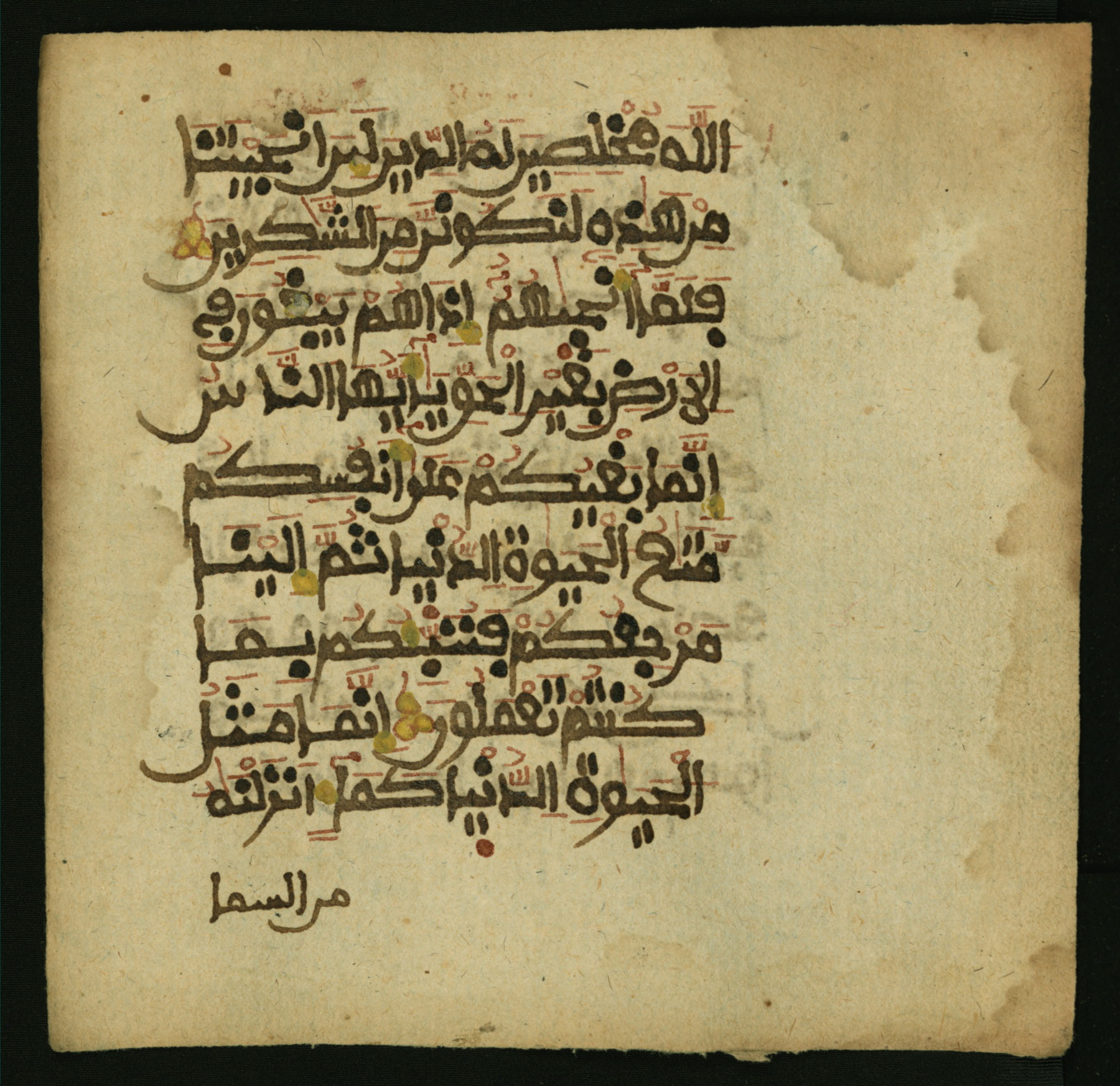 This square-format manuscript is volume 1, containing chapters 1-18 (Sūrat al-fātiḥah through Sūrat al-kahf), of an illuminated two-volume Qur'an produced in Sub-Saharan (West) Africa in the thirteenth century AH / nineteenth CE. The text is written in Sūdānī script in dark brown ink with vocalization in red on loose leaves. Chapter headings are in reddish-brown ink. Three yellow dots outlined in red arranged in a triangular form separate verses. Polychrome circular medallions as well as square and rectangular devices in a variety of patterns and colors mark textual divisions. The leaves of the text are organized between two decorated boards with geometric compositions. The pages and boards are housed in a leather pouch (satchel).
