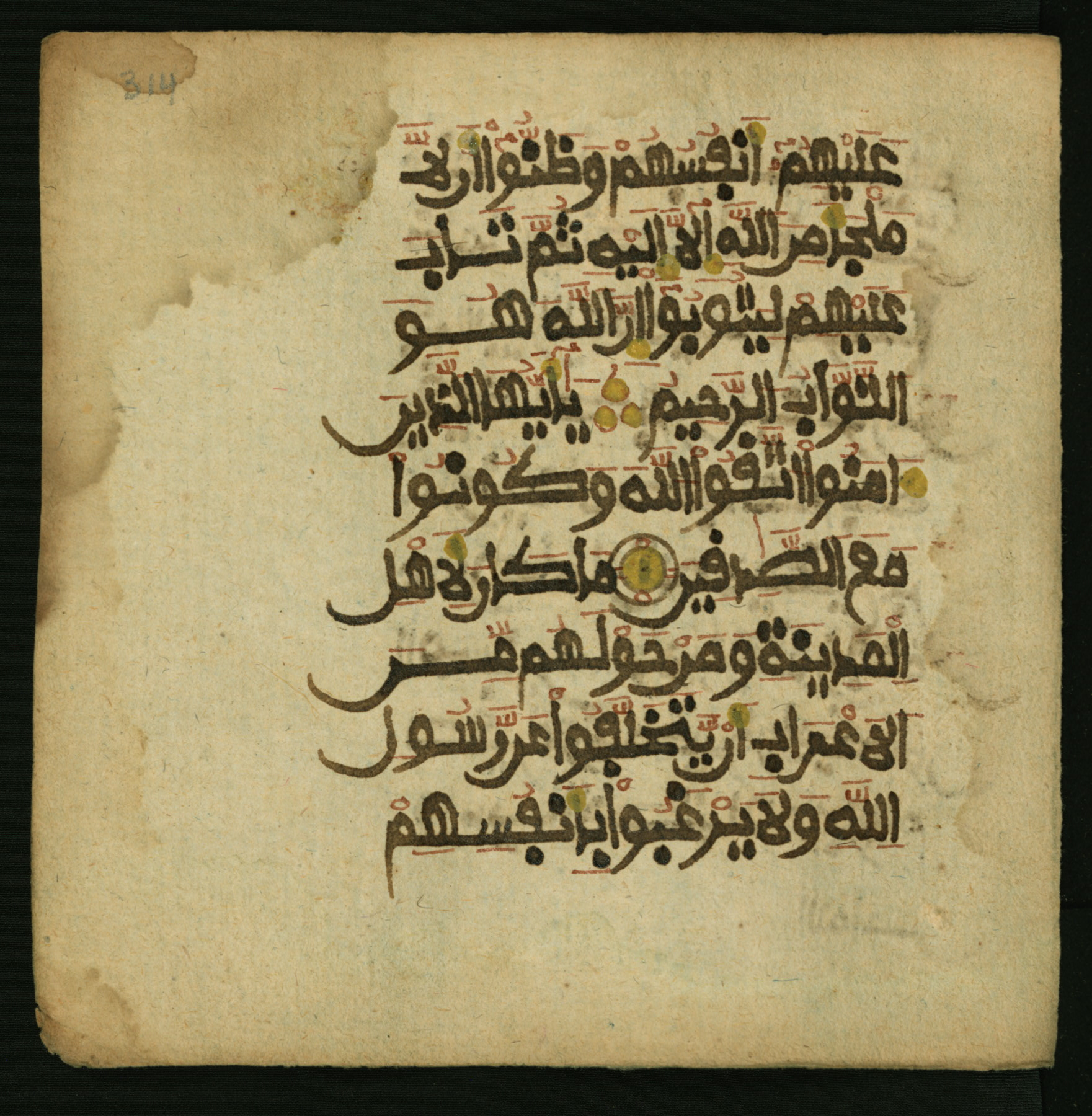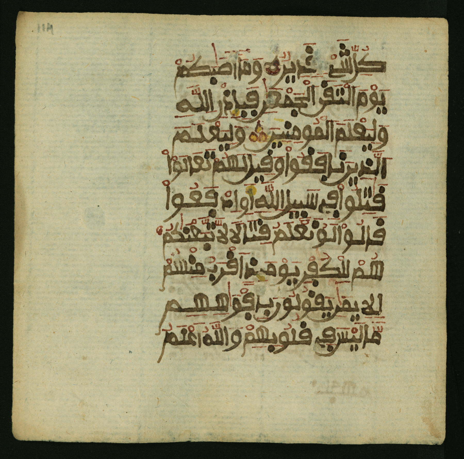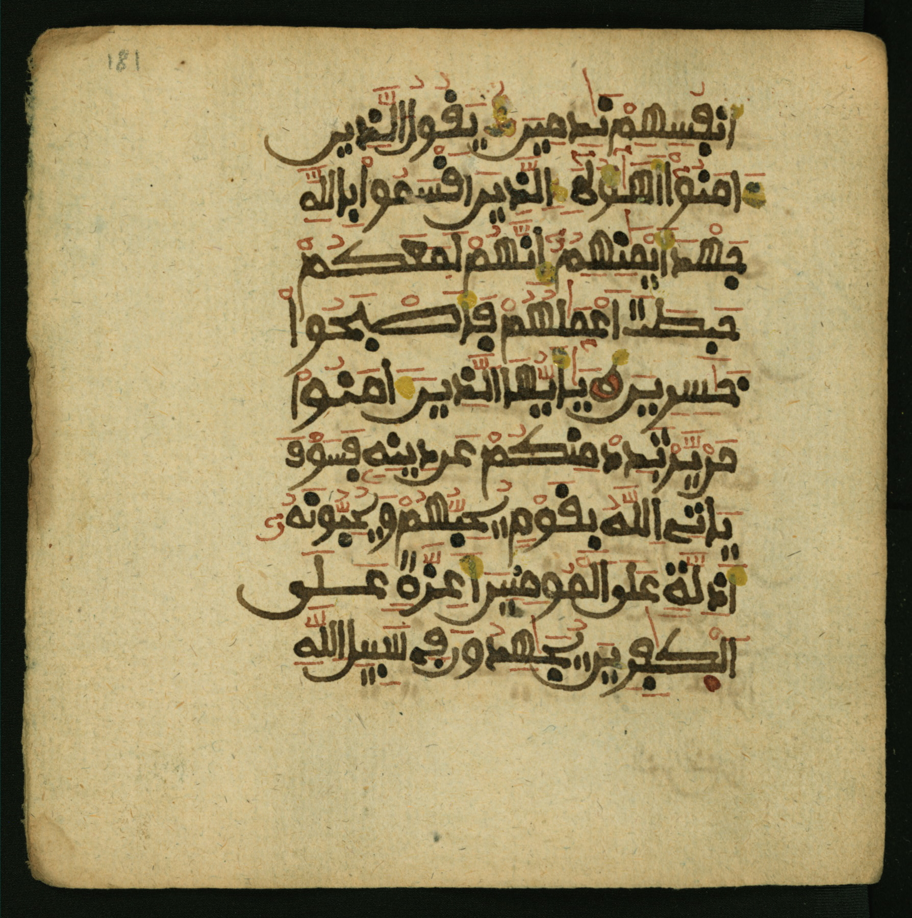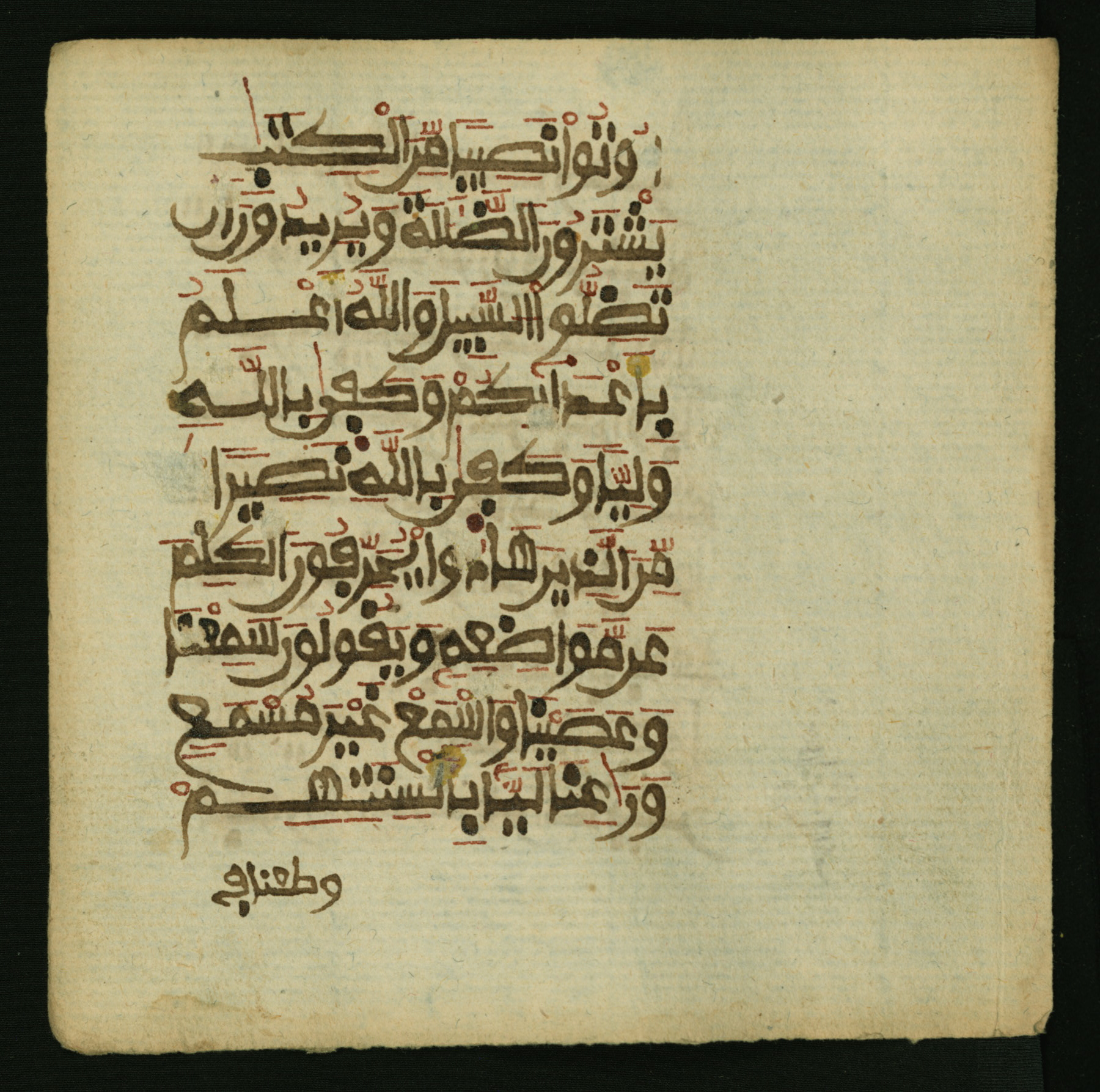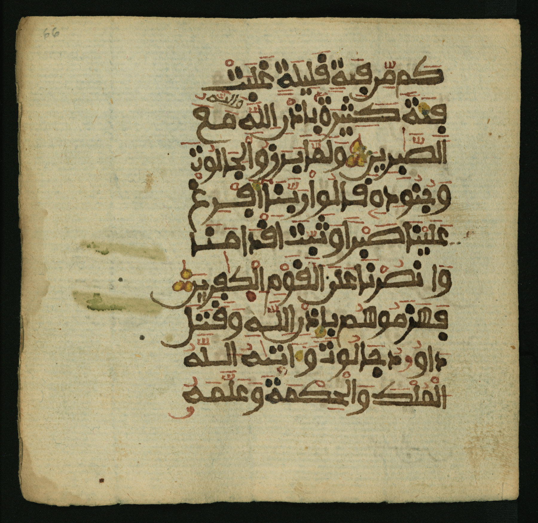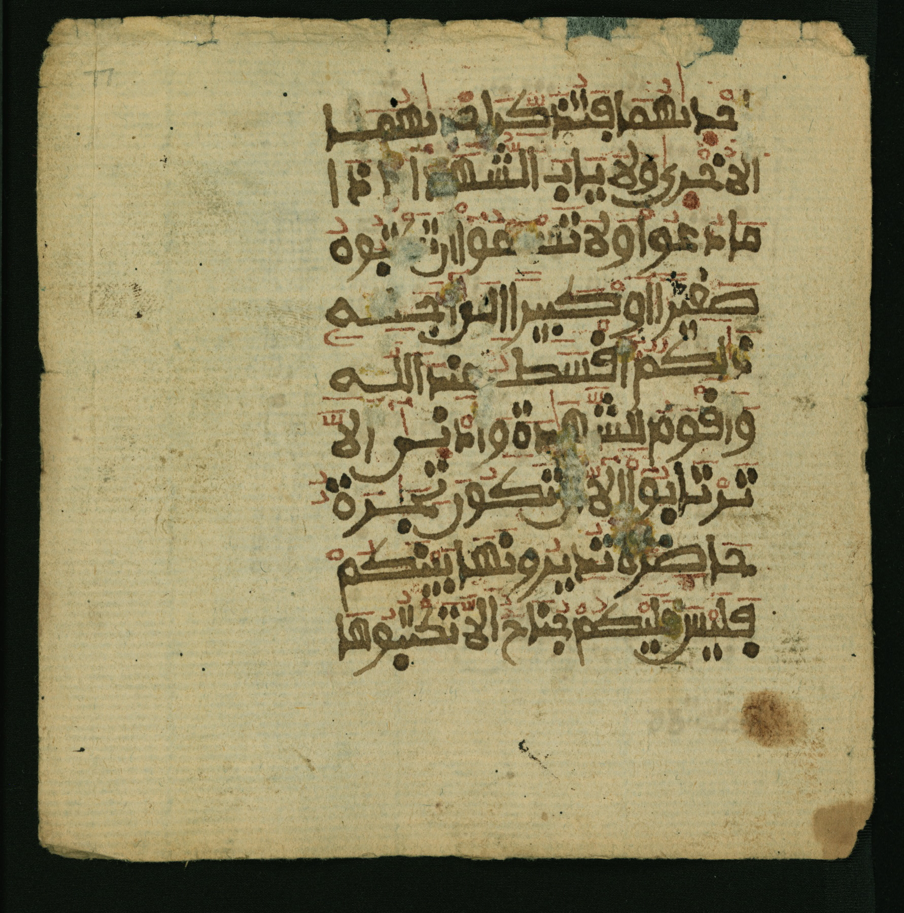 This square-format manuscript is volume 1, containing chapters 1-18 (Sūrat al-fātiḥah through Sūrat al-kahf), of an illuminated two-volume Qur'an produced in Sub-Saharan (West) Africa in the thirteenth century AH / nineteenth CE. The text is written in Sūdānī script in dark brown ink with vocalization in red on loose leaves. Chapter headings are in reddish-brown ink. Three yellow dots outlined in red arranged in a triangular form separate verses. Polychrome circular medallions as well as square and rectangular devices in a variety of patterns and colors mark textual divisions. The leaves of the text are organized between two decorated boards with geometric compositions. The pages and boards are housed in a leather pouch (satchel).