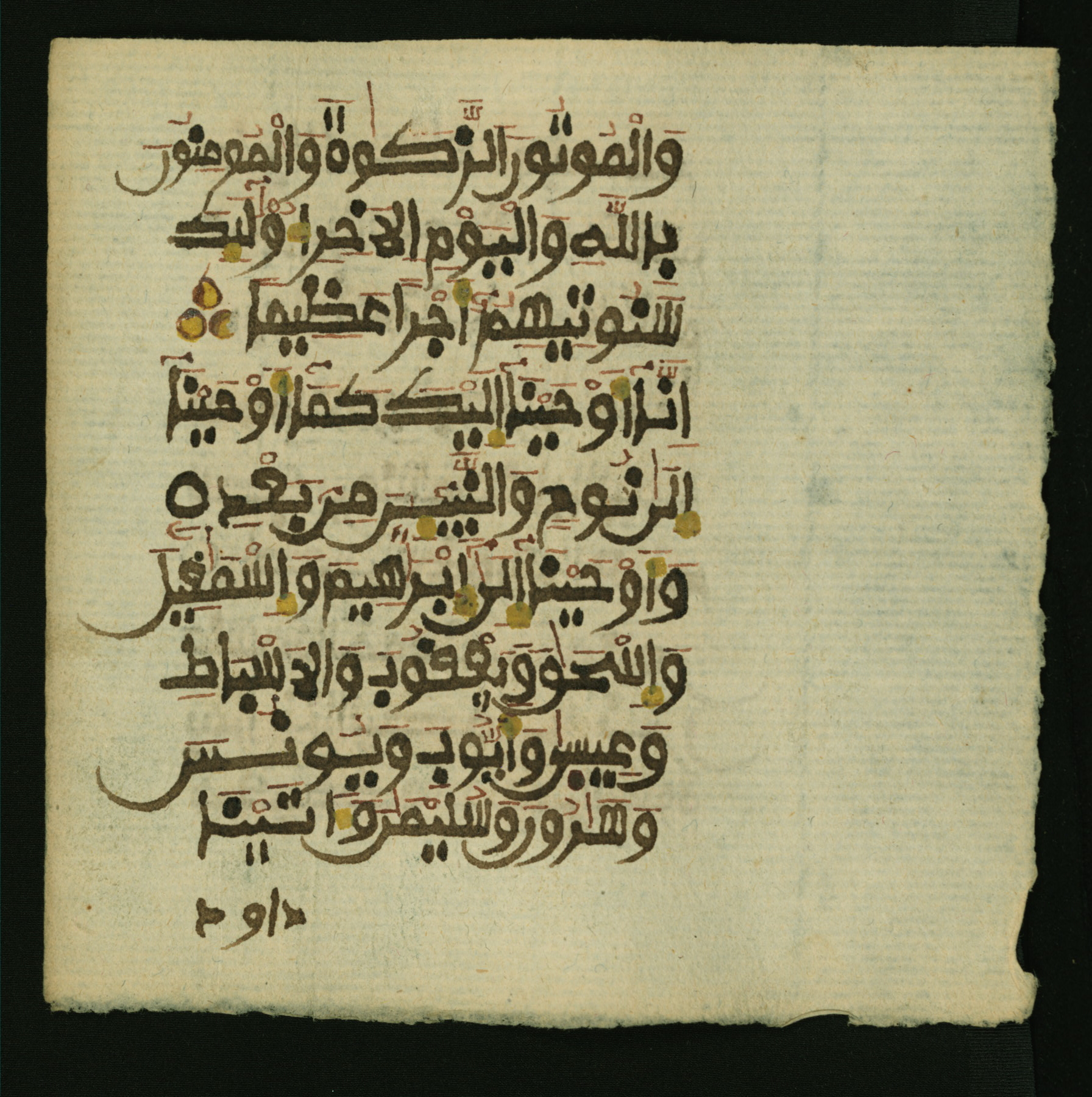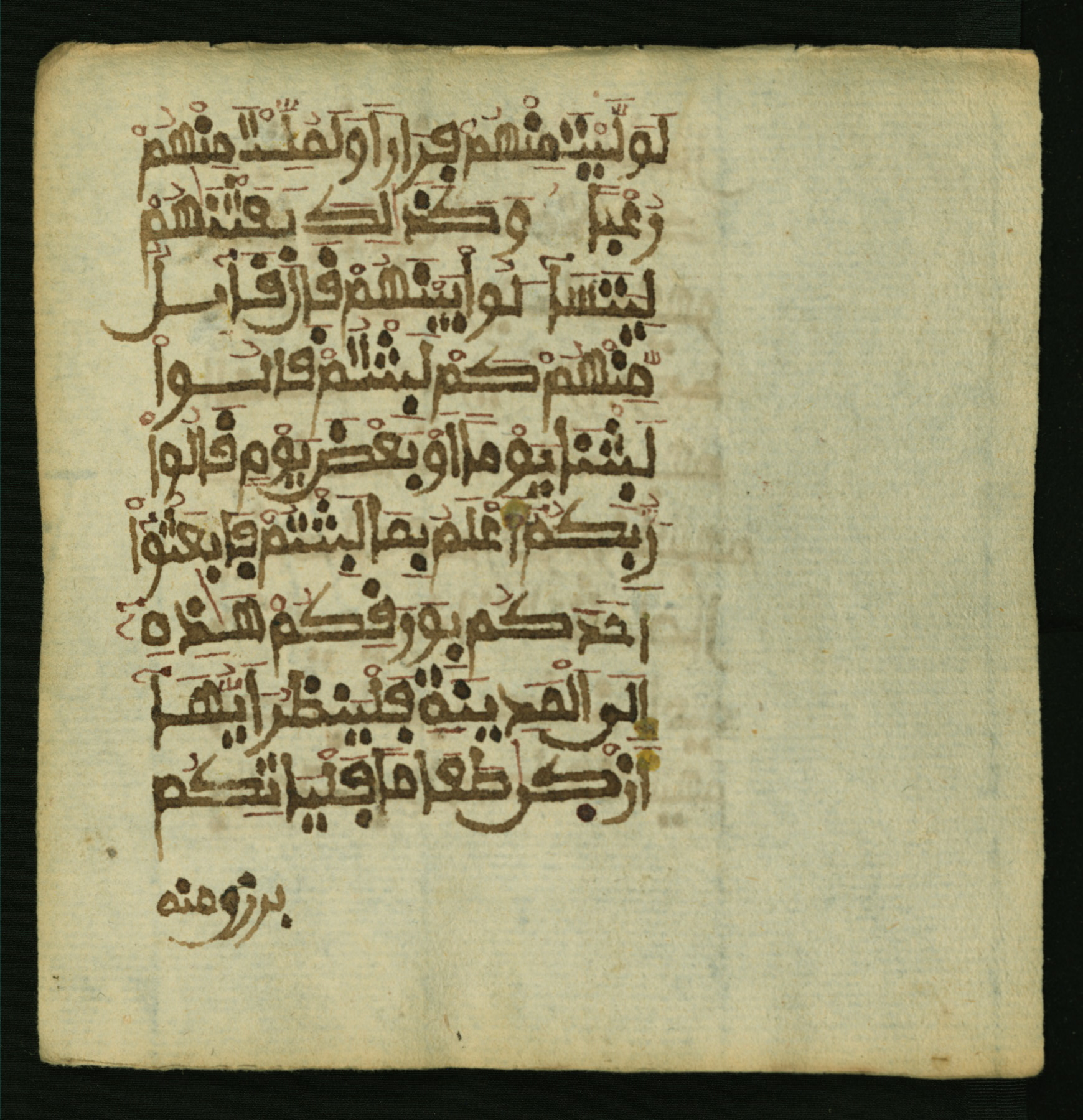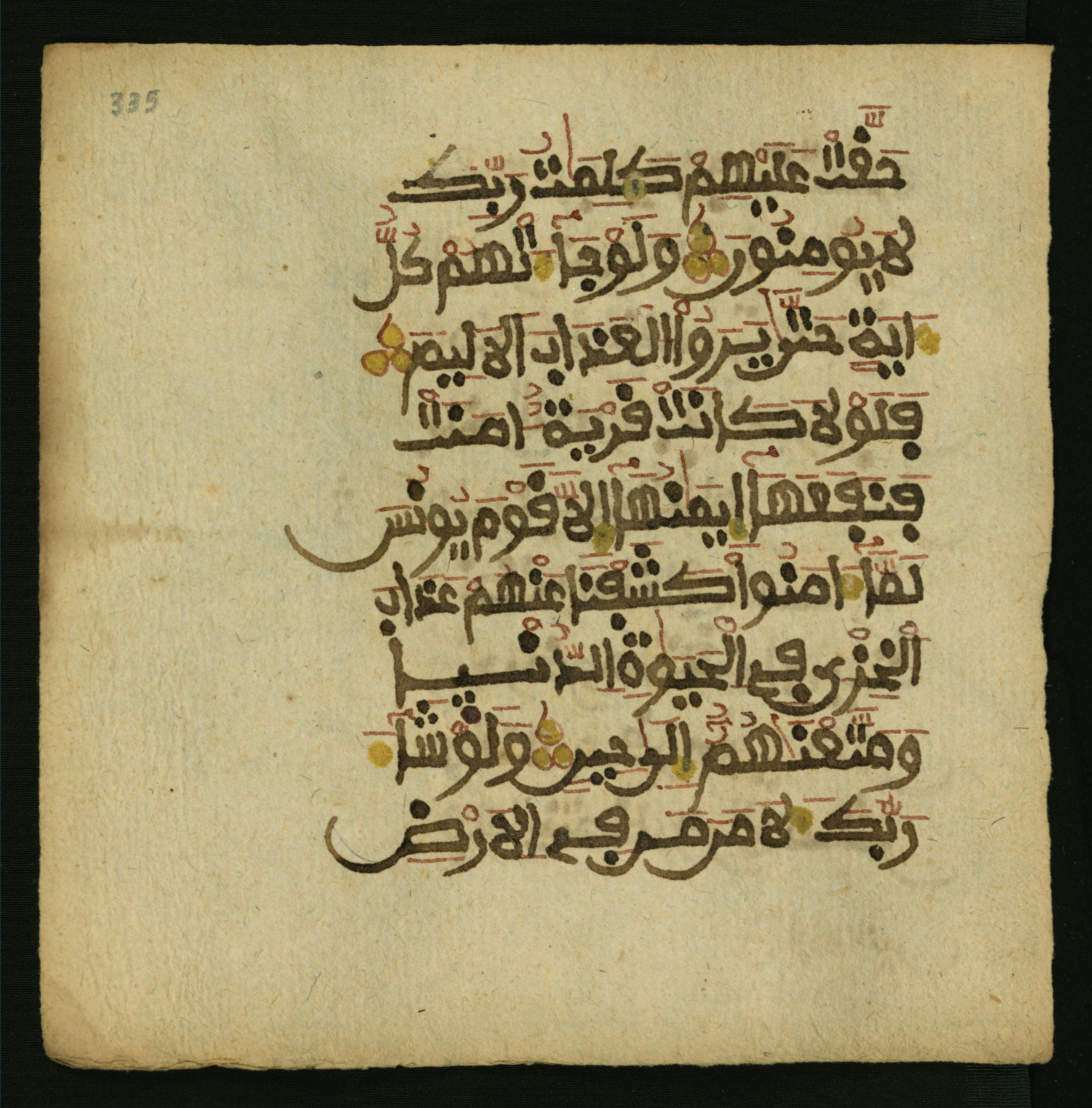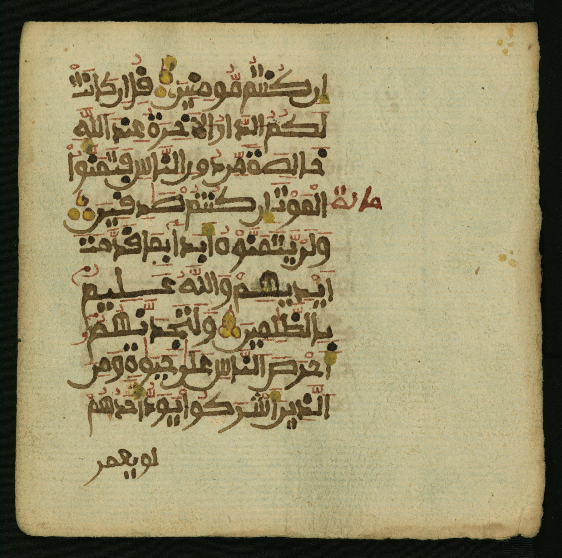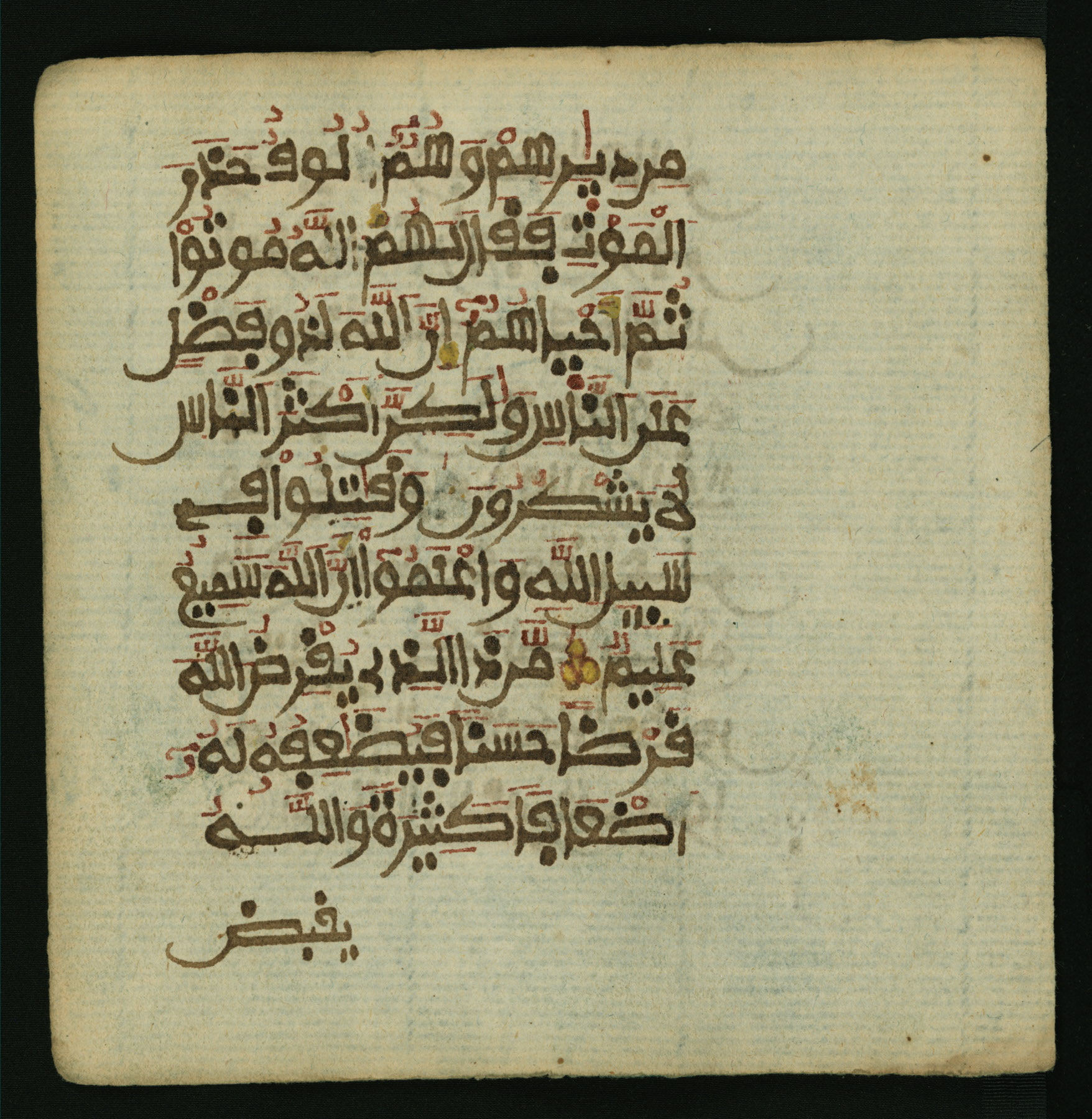 This square-format manuscript is volume 1, containing chapters 1-18 (Sūrat al-fātiḥah through Sūrat al-kahf), of an illuminated two-volume Qur'an produced in Sub-Saharan (West) Africa in the thirteenth century AH / nineteenth CE. The text is written in Sūdānī script in dark brown ink with vocalization in red on loose leaves. Chapter headings are in reddish-brown ink. Three yellow dots outlined in red arranged in a triangular form separate verses. Polychrome circular medallions as well as square and rectangular devices in a variety of patterns and colors mark textual divisions. The leaves of the text are organized between two decorated boards with geometric compositions. The pages and boards are housed in a leather pouch (satchel).