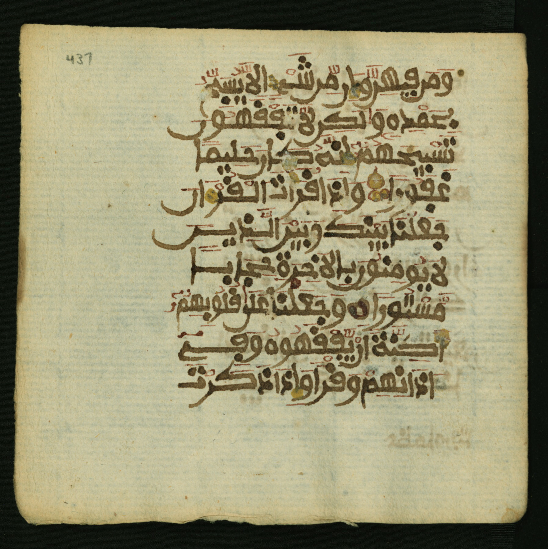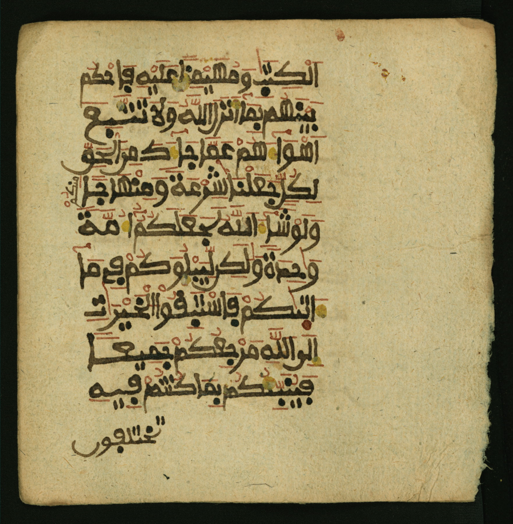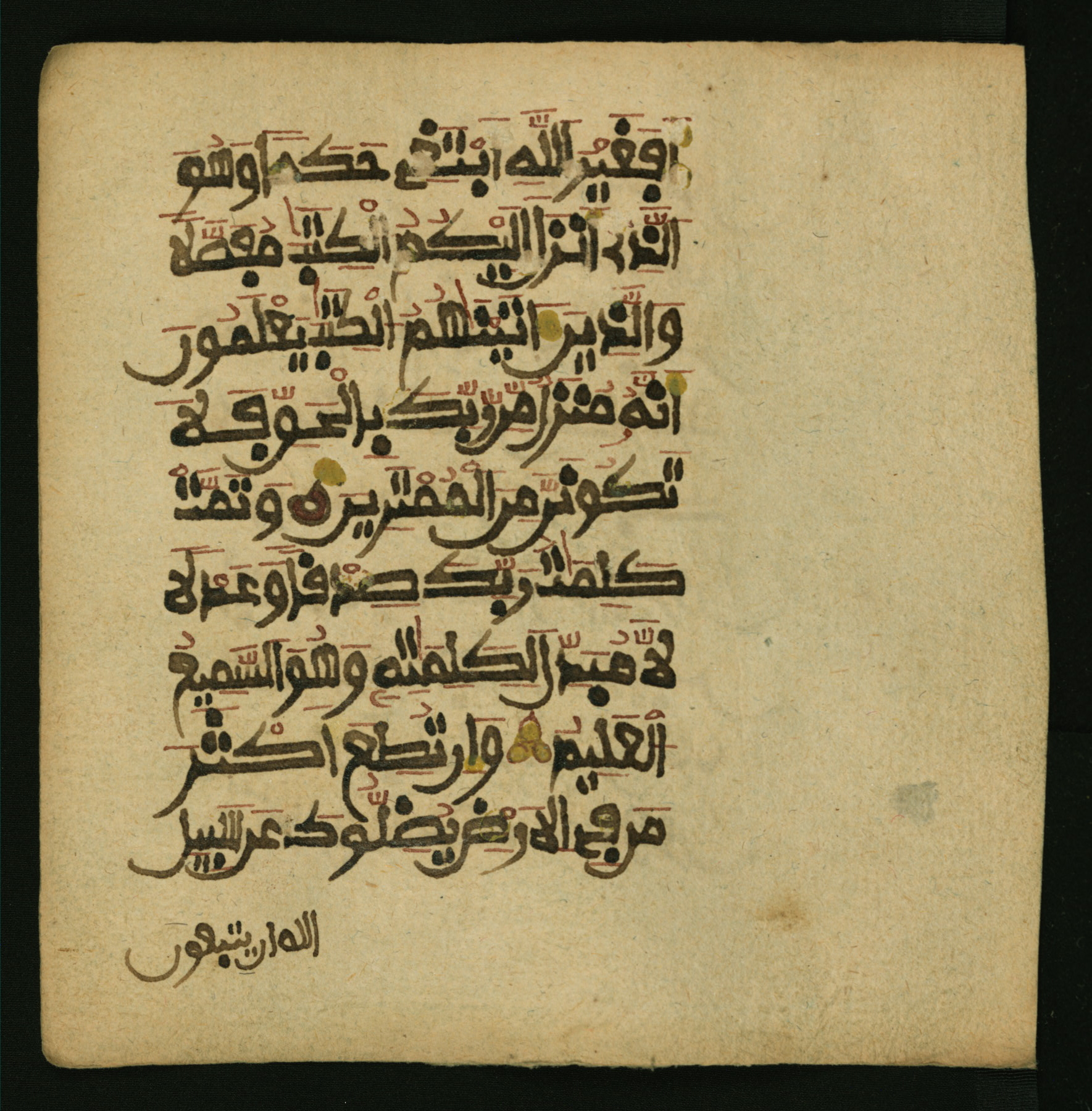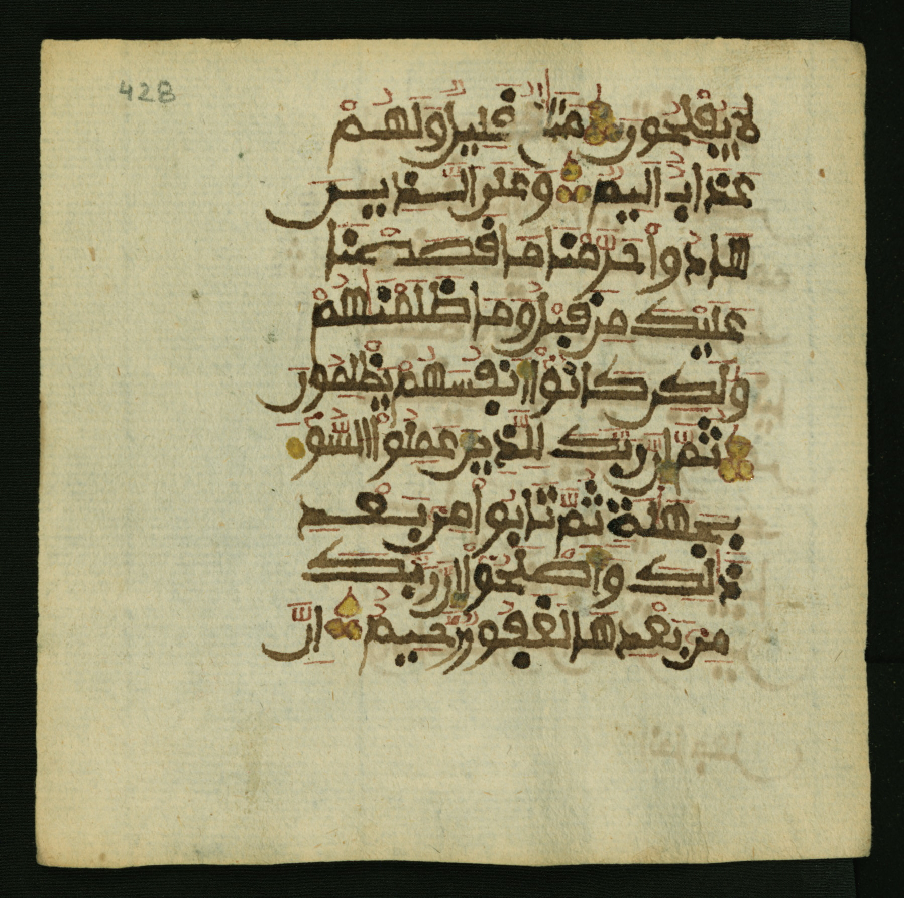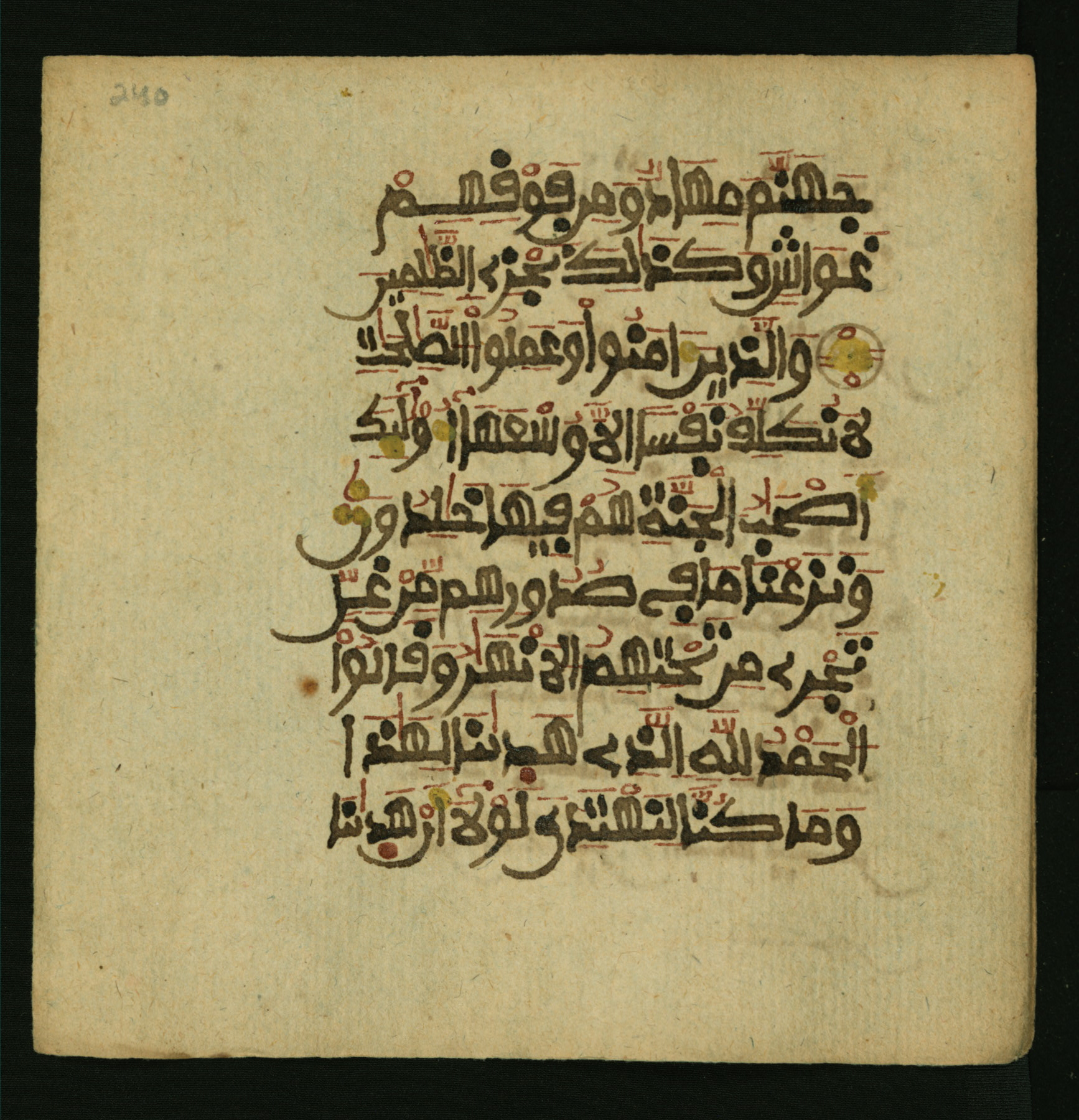 This square-format manuscript is volume 1, containing chapters 1-18 (Sūrat al-fātiḥah through Sūrat al-kahf), of an illuminated two-volume Qur'an produced in Sub-Saharan (West) Africa in the thirteenth century AH / nineteenth CE. The text is written in Sūdānī script in dark brown ink with vocalization in red on loose leaves. Chapter headings are in reddish-brown ink. Three yellow dots outlined in red arranged in a triangular form separate verses. Polychrome circular medallions as well as square and rectangular devices in a variety of patterns and colors mark textual divisions. The leaves of the text are organized between two decorated boards with geometric compositions. The pages and boards are housed in a leather pouch (satchel).