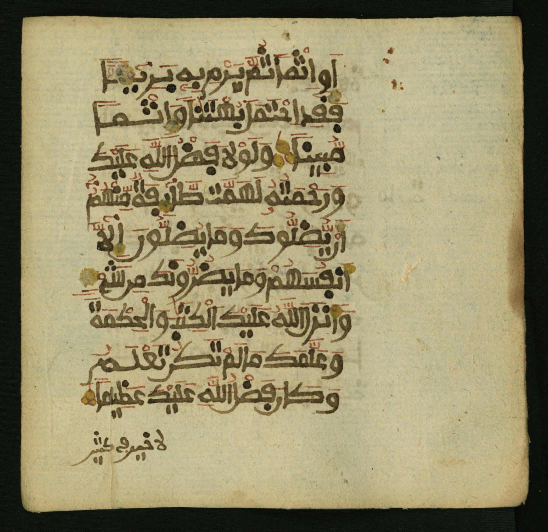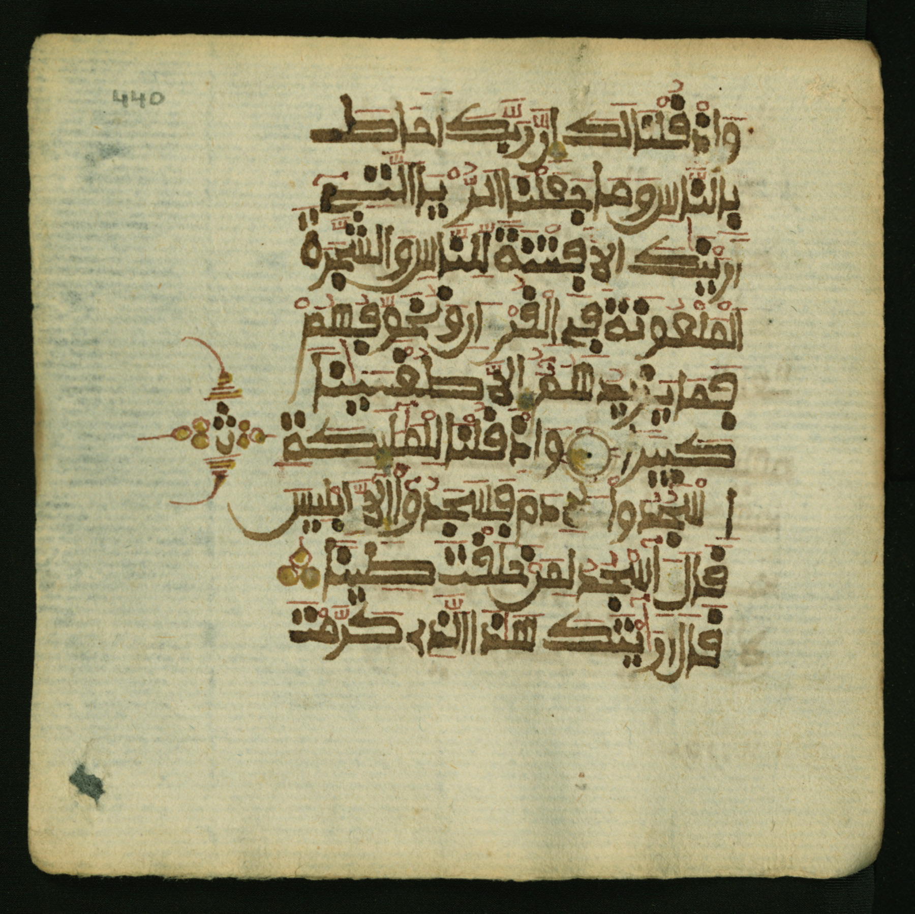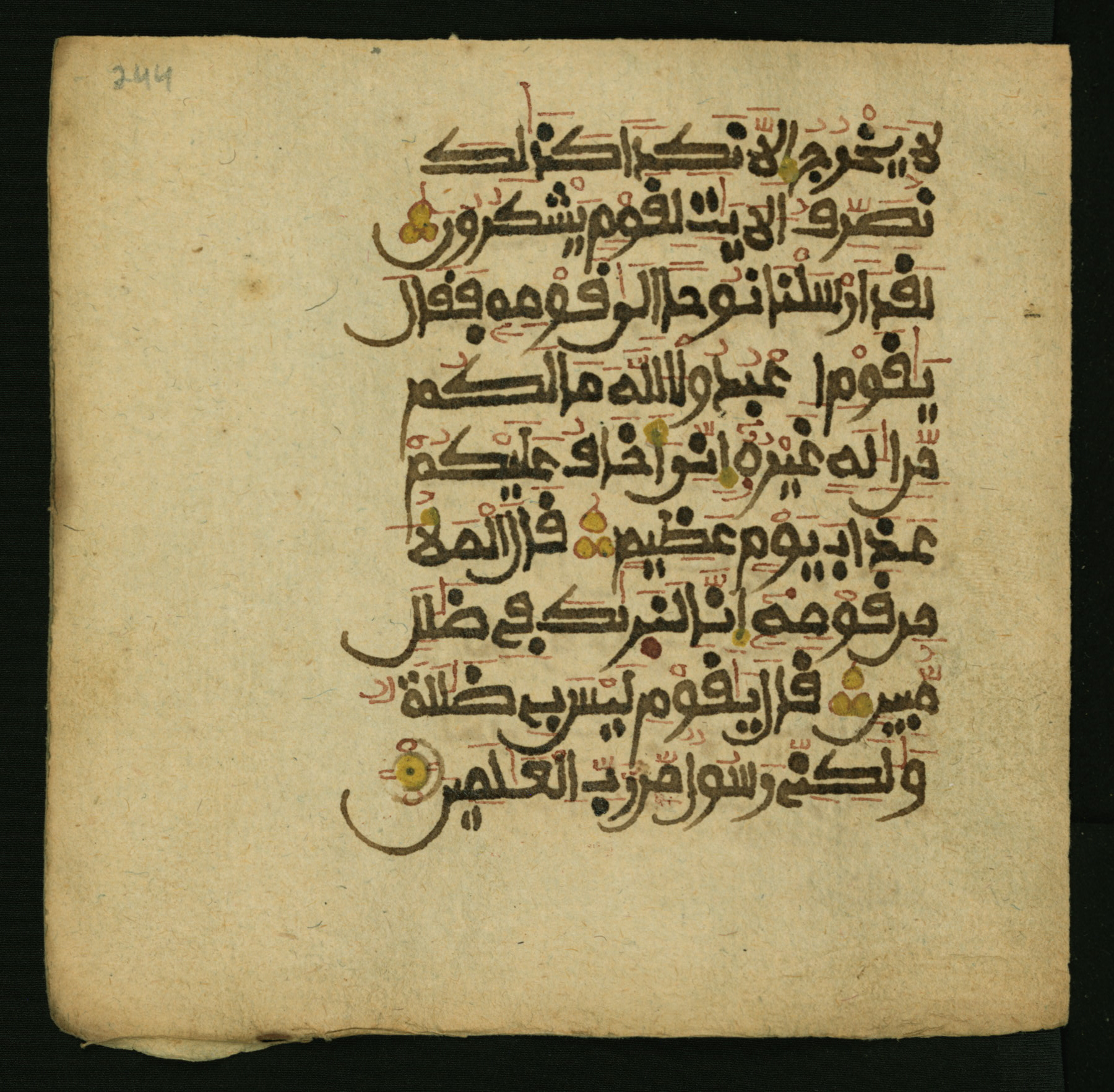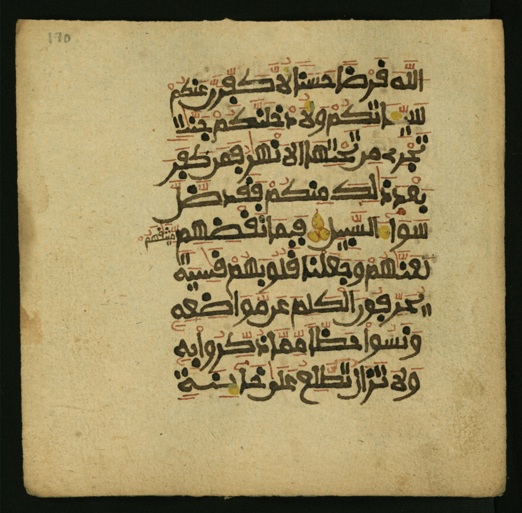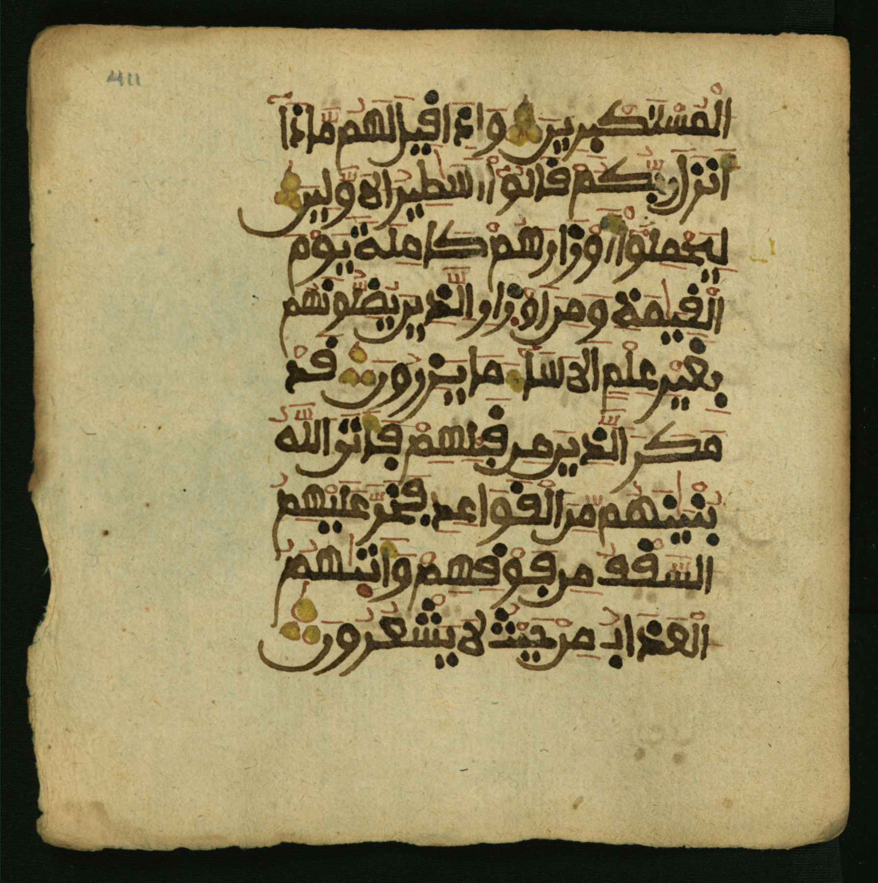This square-format manuscript is volume 1, containing chapters 1-18 (Sūrat al-fātiḥah through Sūrat al-kahf), of an illuminated two-volume Qur'an produced in Sub-Saharan (West) Africa in the thirteenth century AH / nineteenth CE. The text is written in Sūdānī script in dark brown ink with vocalization in red on loose leaves. Chapter headings are in reddish-brown ink. Three yellow dots outlined in red arranged in a triangular form separate verses. Polychrome circular medallions as well as square and rectangular devices in a variety of patterns and colors mark textual divisions. The leaves of the text are organized between two decorated boards with geometric compositions. The pages and boards are housed in a leather pouch (satchel).