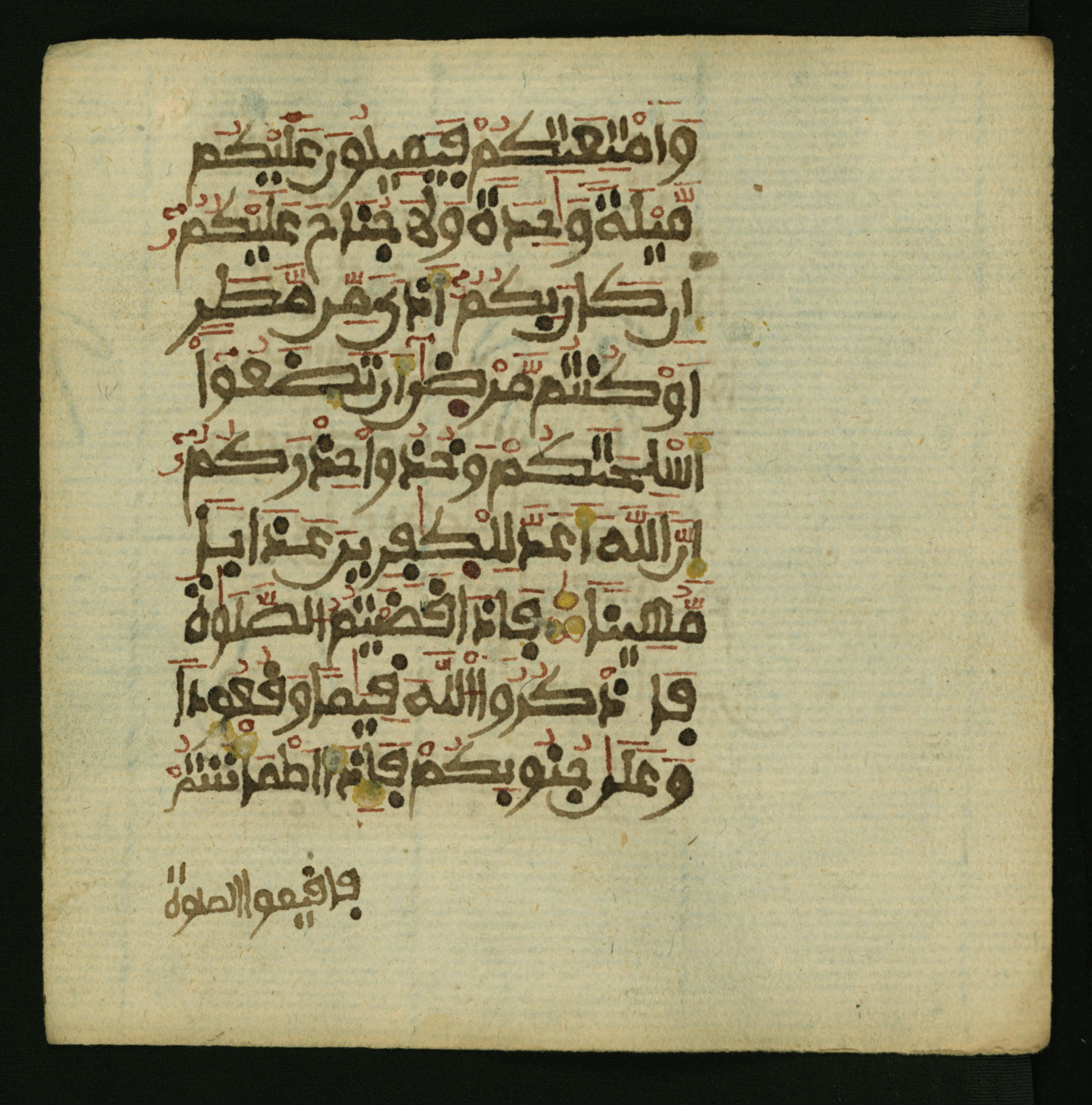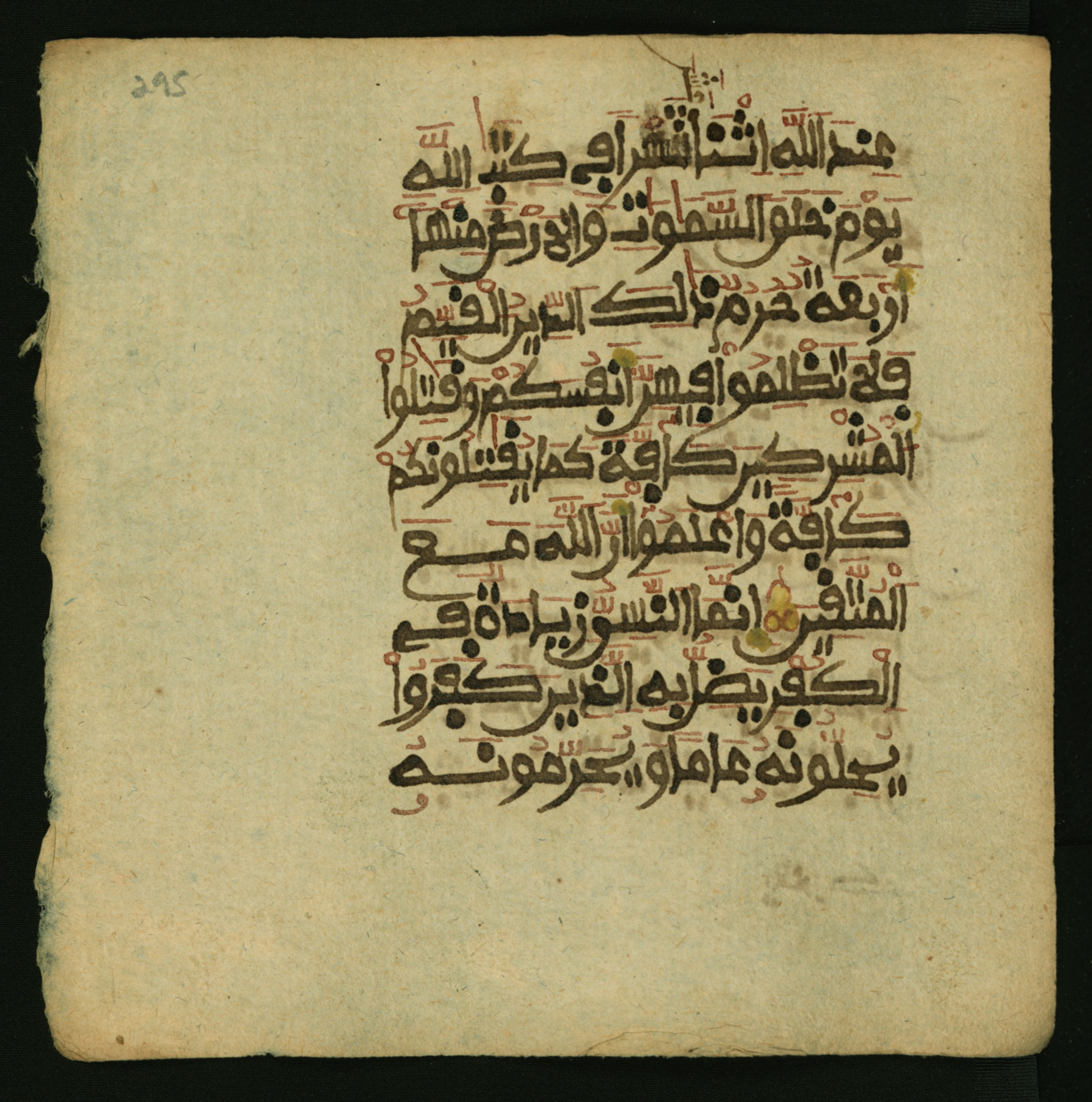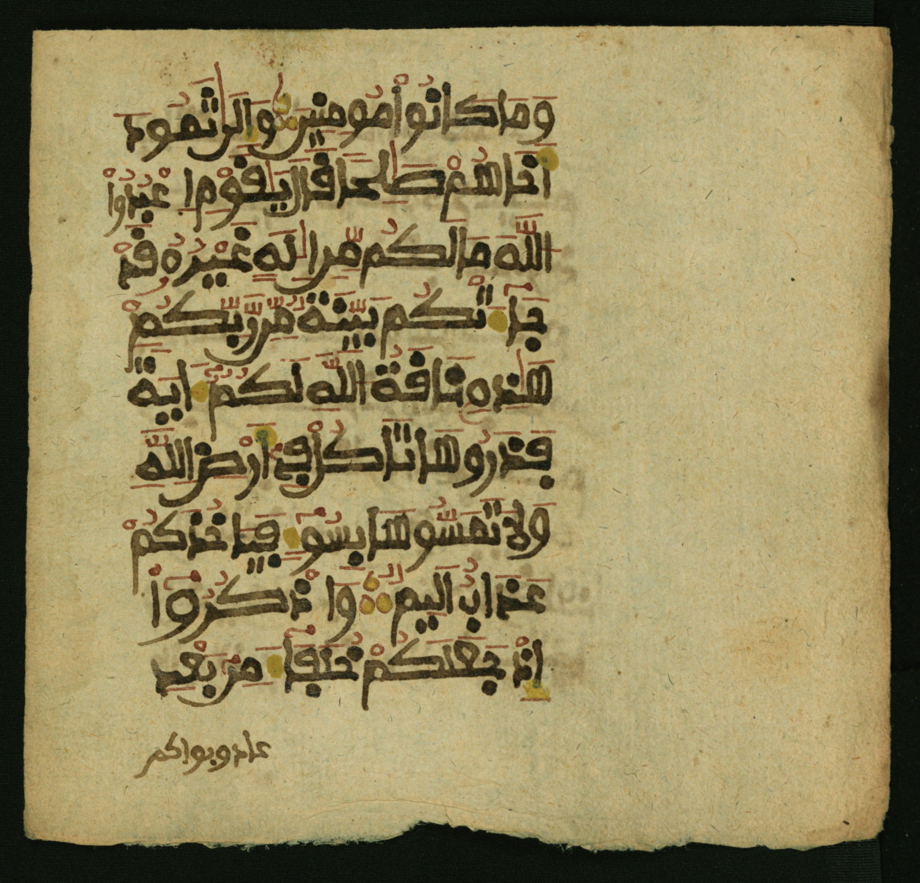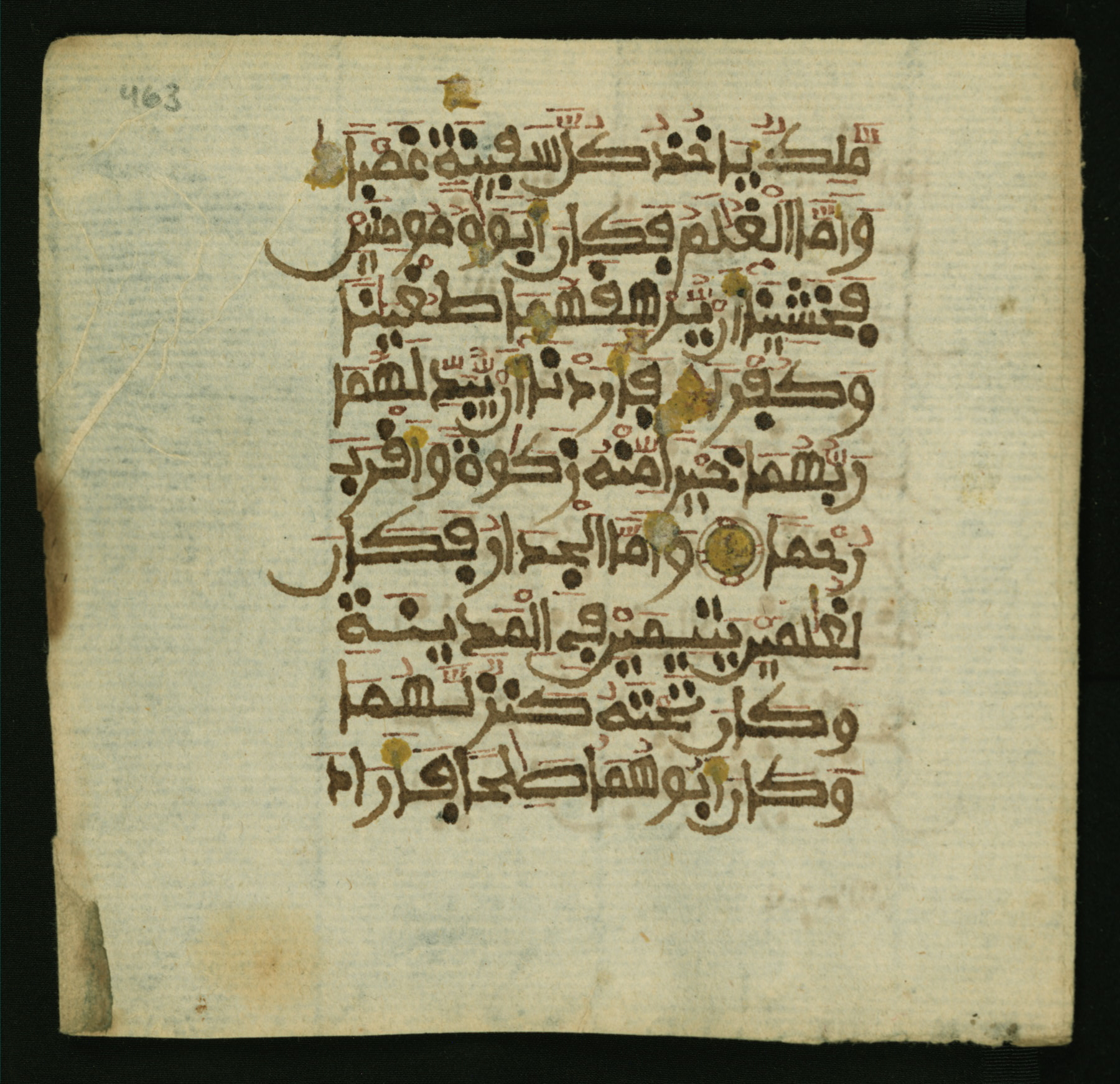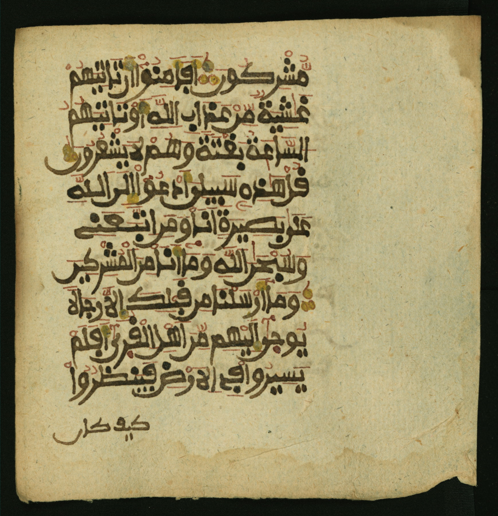This square-format manuscript is volume 1, containing chapters 1-18 (Sūrat al-fātiḥah through Sūrat al-kahf), of an illuminated two-volume Qur'an produced in Sub-Saharan (West) Africa in the thirteenth century AH / nineteenth CE. The text is written in Sūdānī script in dark brown ink with vocalization in red on loose leaves. Chapter headings are in reddish-brown ink. Three yellow dots outlined in red arranged in a triangular form separate verses. Polychrome circular medallions as well as square and rectangular devices in a variety of patterns and colors mark textual divisions. The leaves of the text are organized between two decorated boards with geometric compositions. The pages and boards are housed in a leather pouch (satchel).