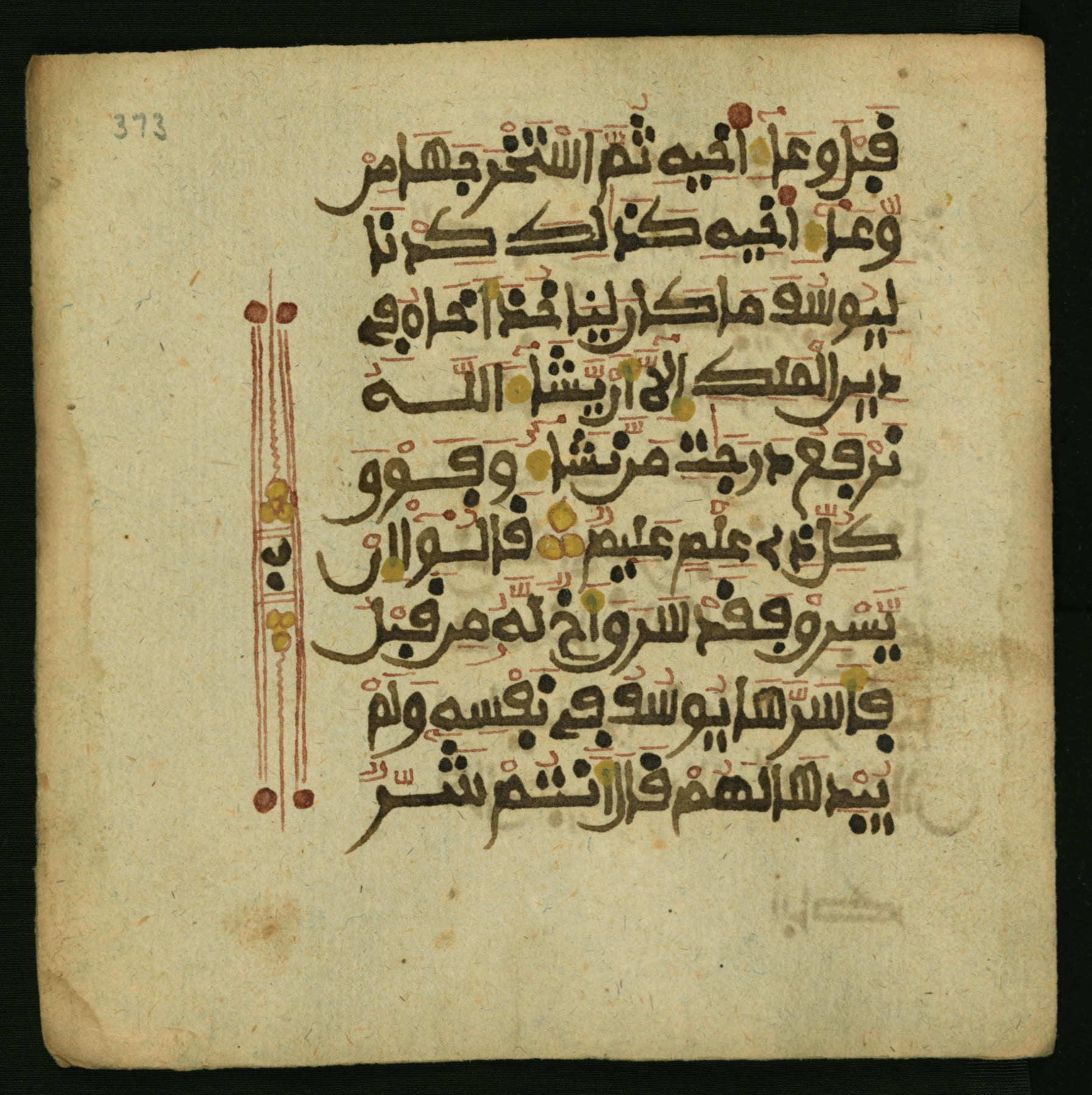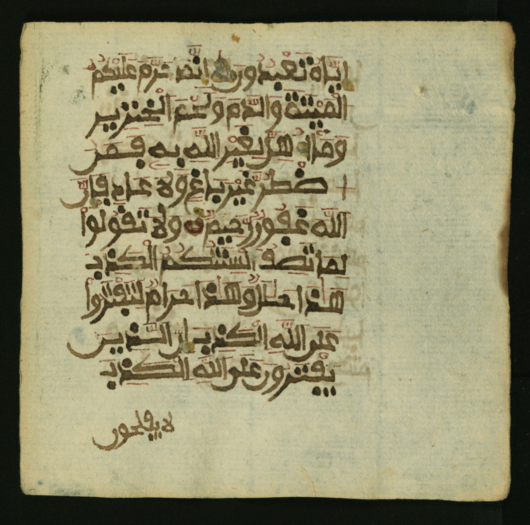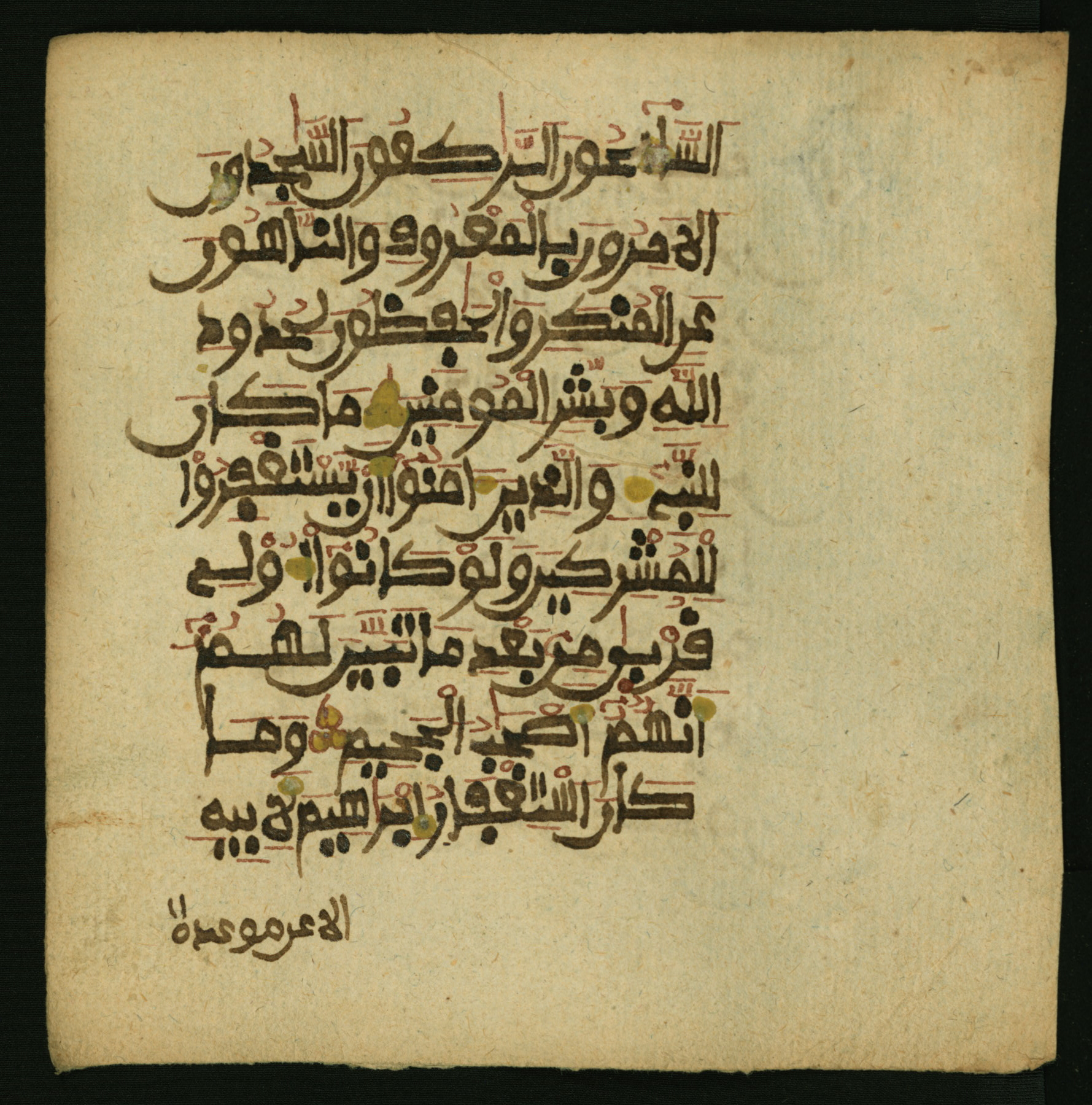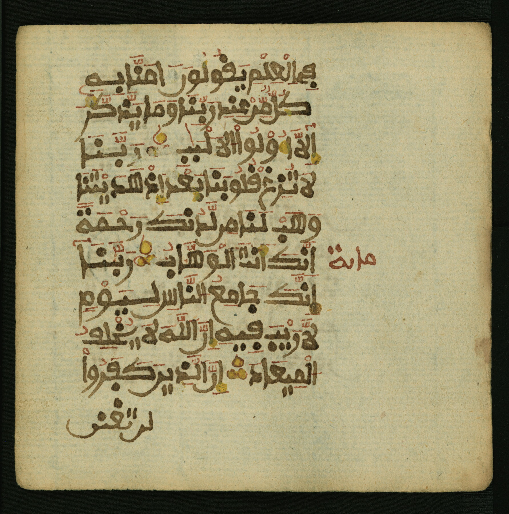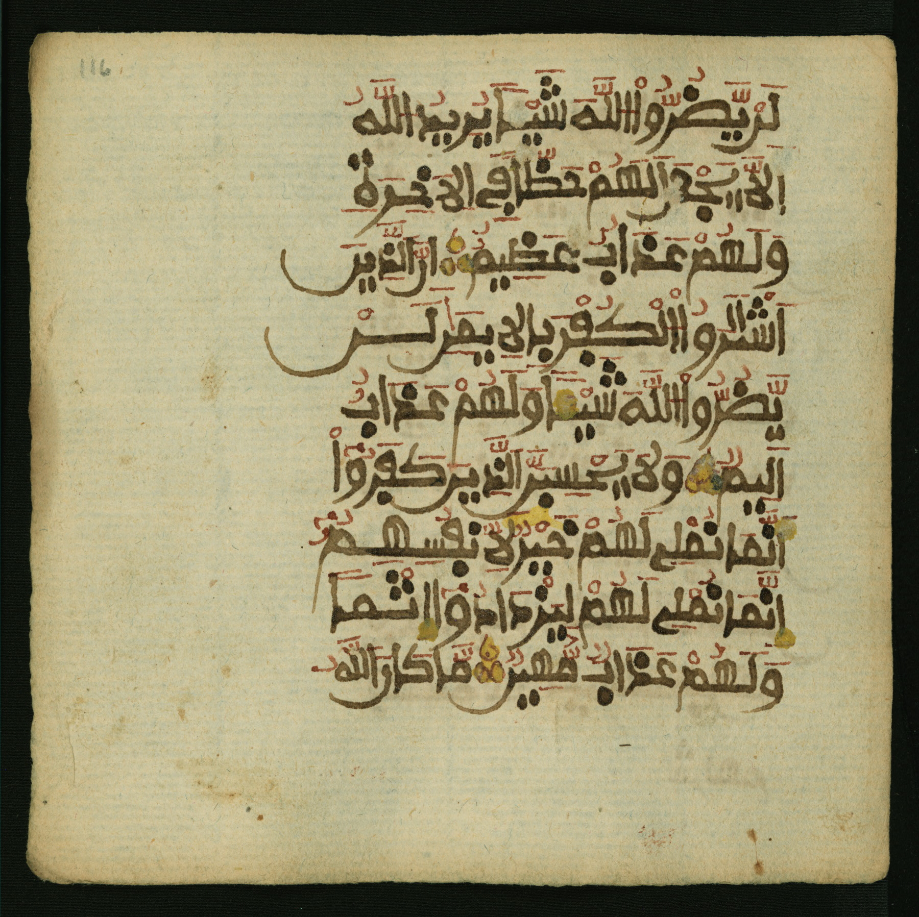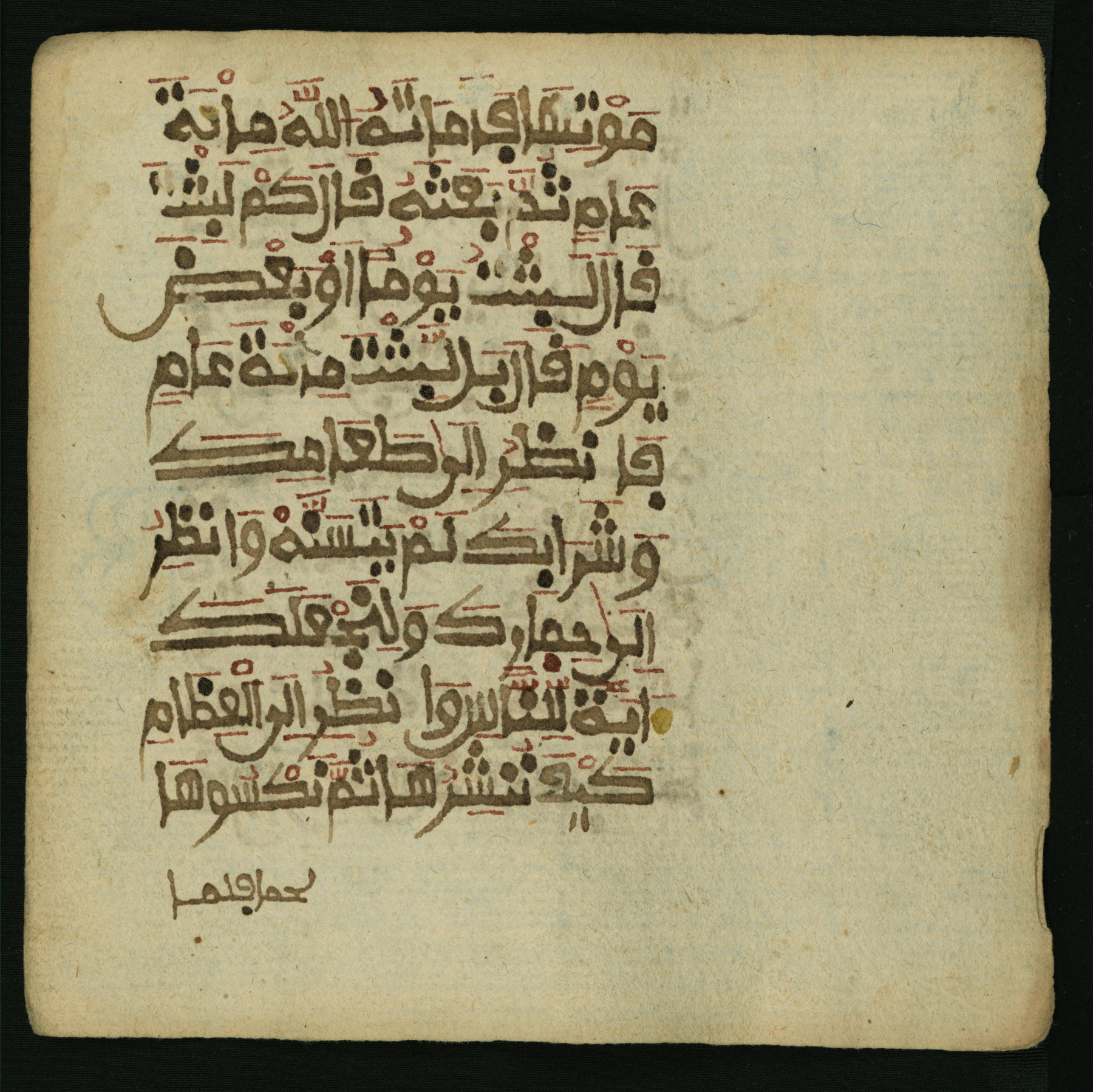 This square-format manuscript is volume 1, containing chapters 1-18 (Sūrat al-fātiḥah through Sūrat al-kahf), of an illuminated two-volume Qur'an produced in Sub-Saharan (West) Africa in the thirteenth century AH / nineteenth CE. The text is written in Sūdānī script in dark brown ink with vocalization in red on loose leaves. Chapter headings are in reddish-brown ink. Three yellow dots outlined in red arranged in a triangular form separate verses. Polychrome circular medallions as well as square and rectangular devices in a variety of patterns and colors mark textual divisions. The leaves of the text are organized between two decorated boards with geometric compositions. The pages and boards are housed in a leather pouch (satchel).