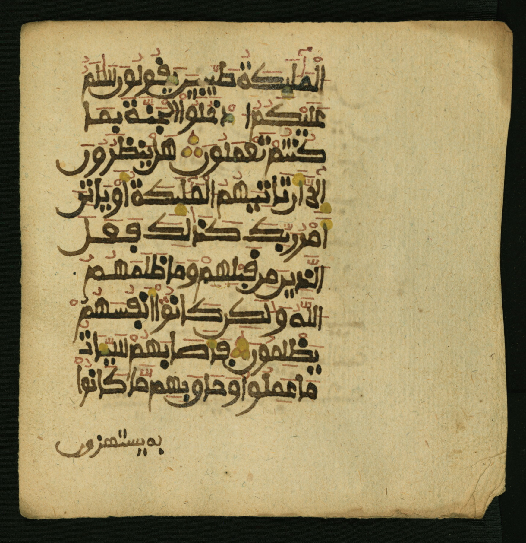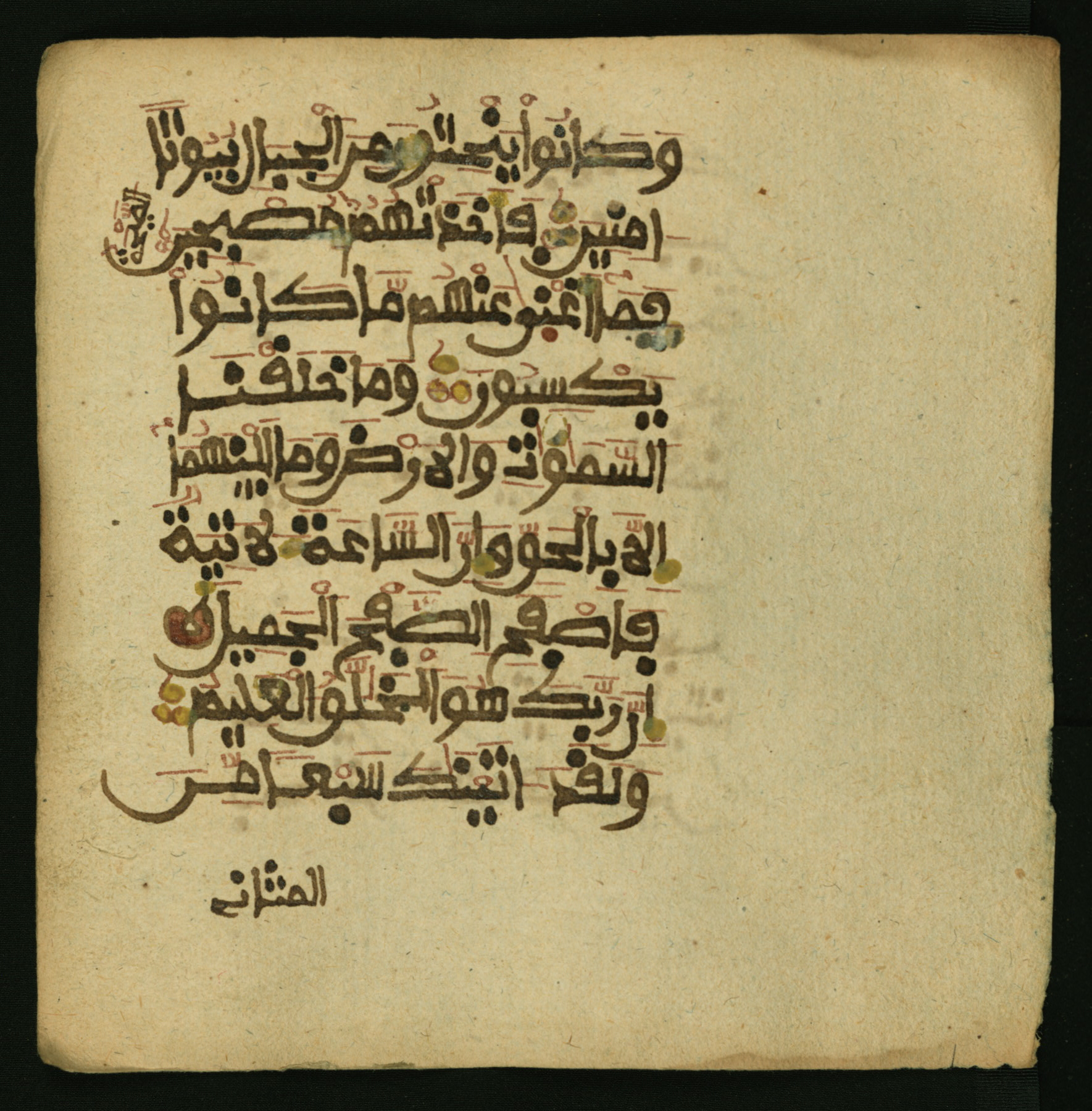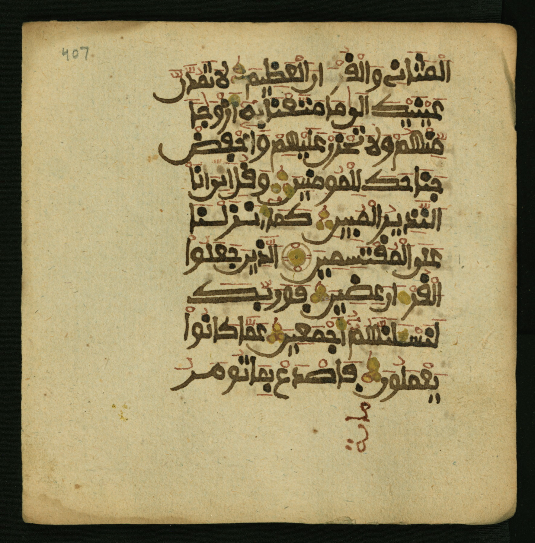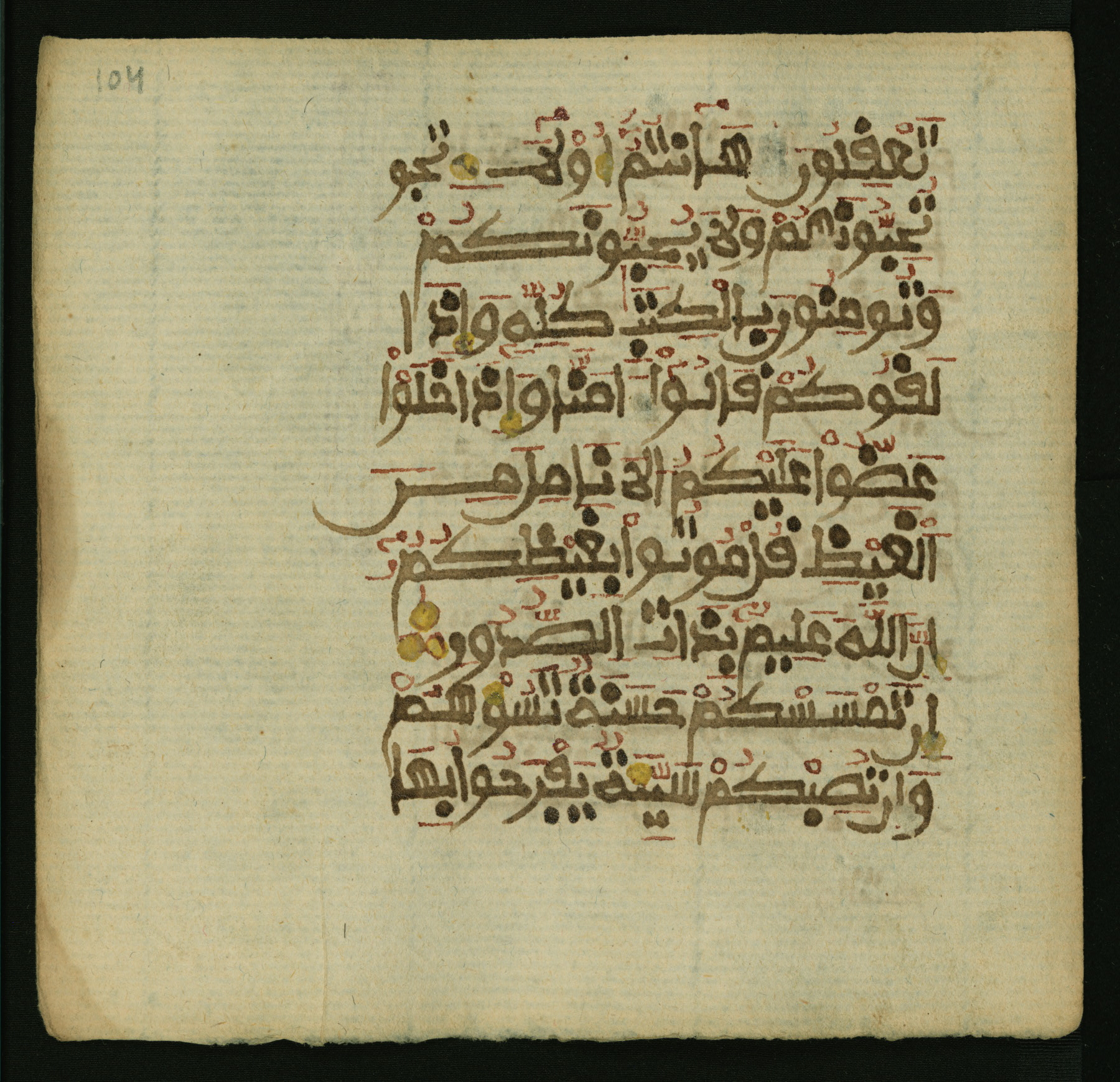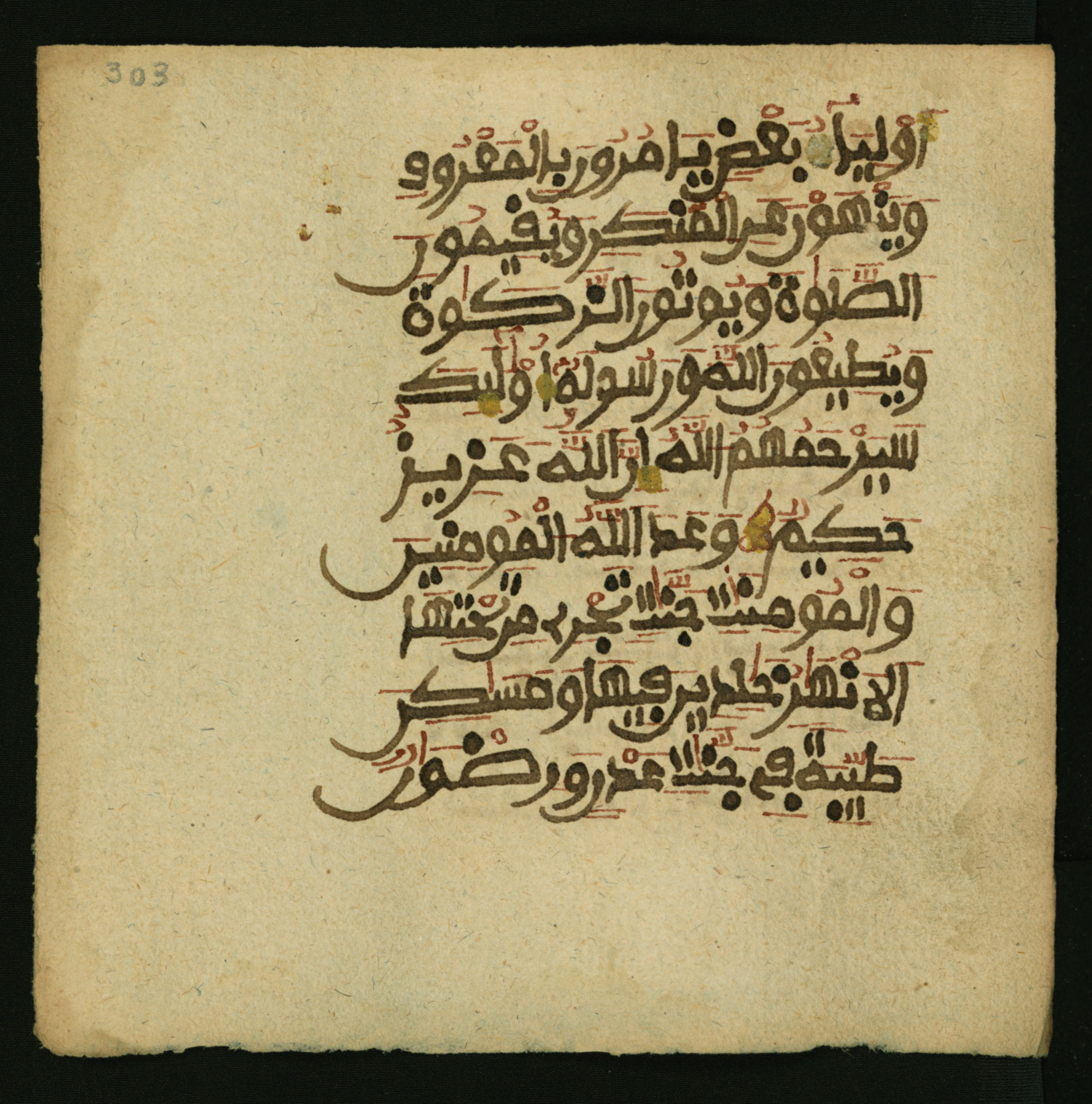 This square-format manuscript is volume 1, containing chapters 1-18 (Sūrat al-fātiḥah through Sūrat al-kahf), of an illuminated two-volume Qur'an produced in Sub-Saharan (West) Africa in the thirteenth century AH / nineteenth CE. The text is written in Sūdānī script in dark brown ink with vocalization in red on loose leaves. Chapter headings are in reddish-brown ink. Three yellow dots outlined in red arranged in a triangular form separate verses. Polychrome circular medallions as well as square and rectangular devices in a variety of patterns and colors mark textual divisions. The leaves of the text are organized between two decorated boards with geometric compositions. The pages and boards are housed in a leather pouch (satchel).