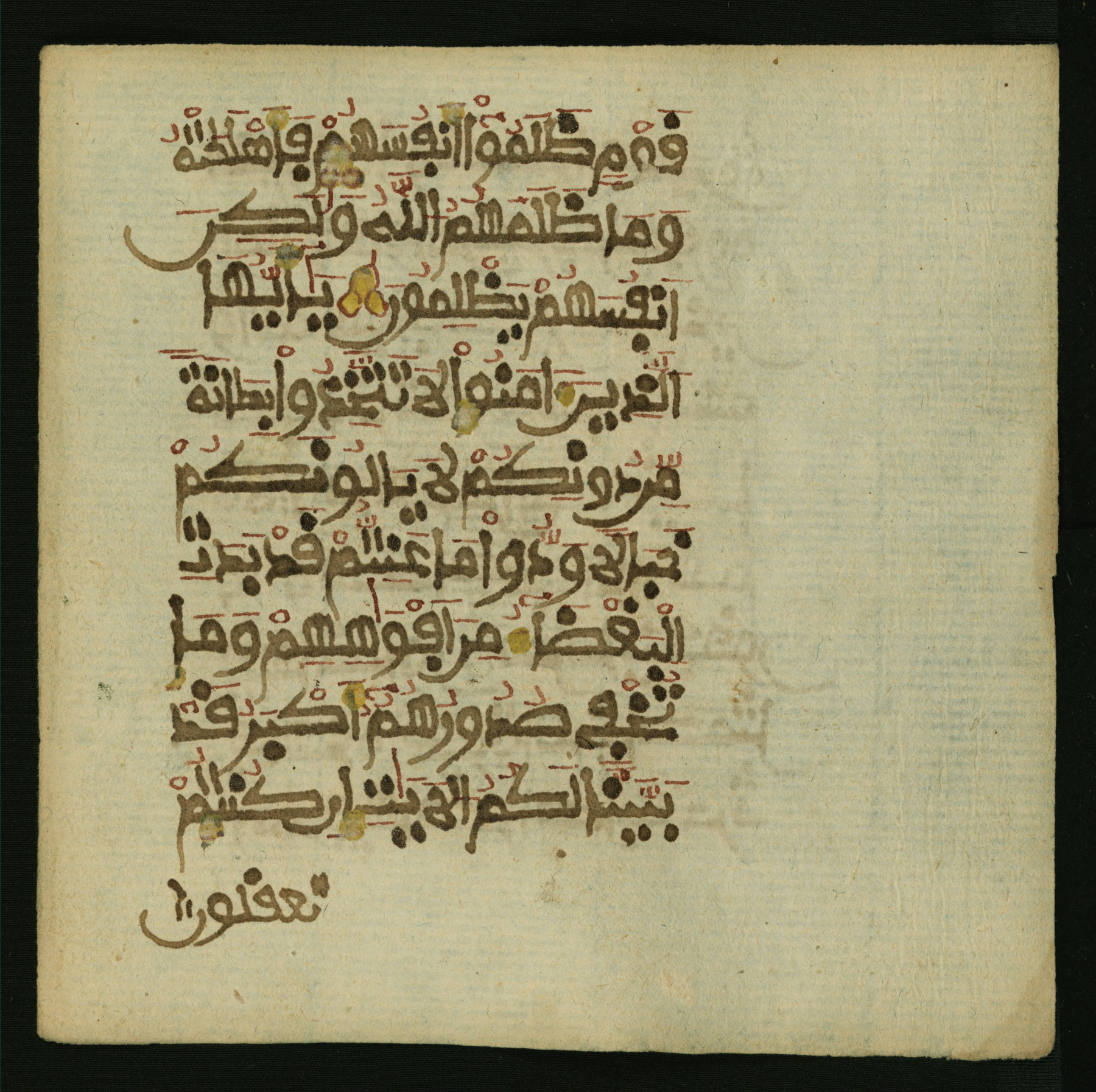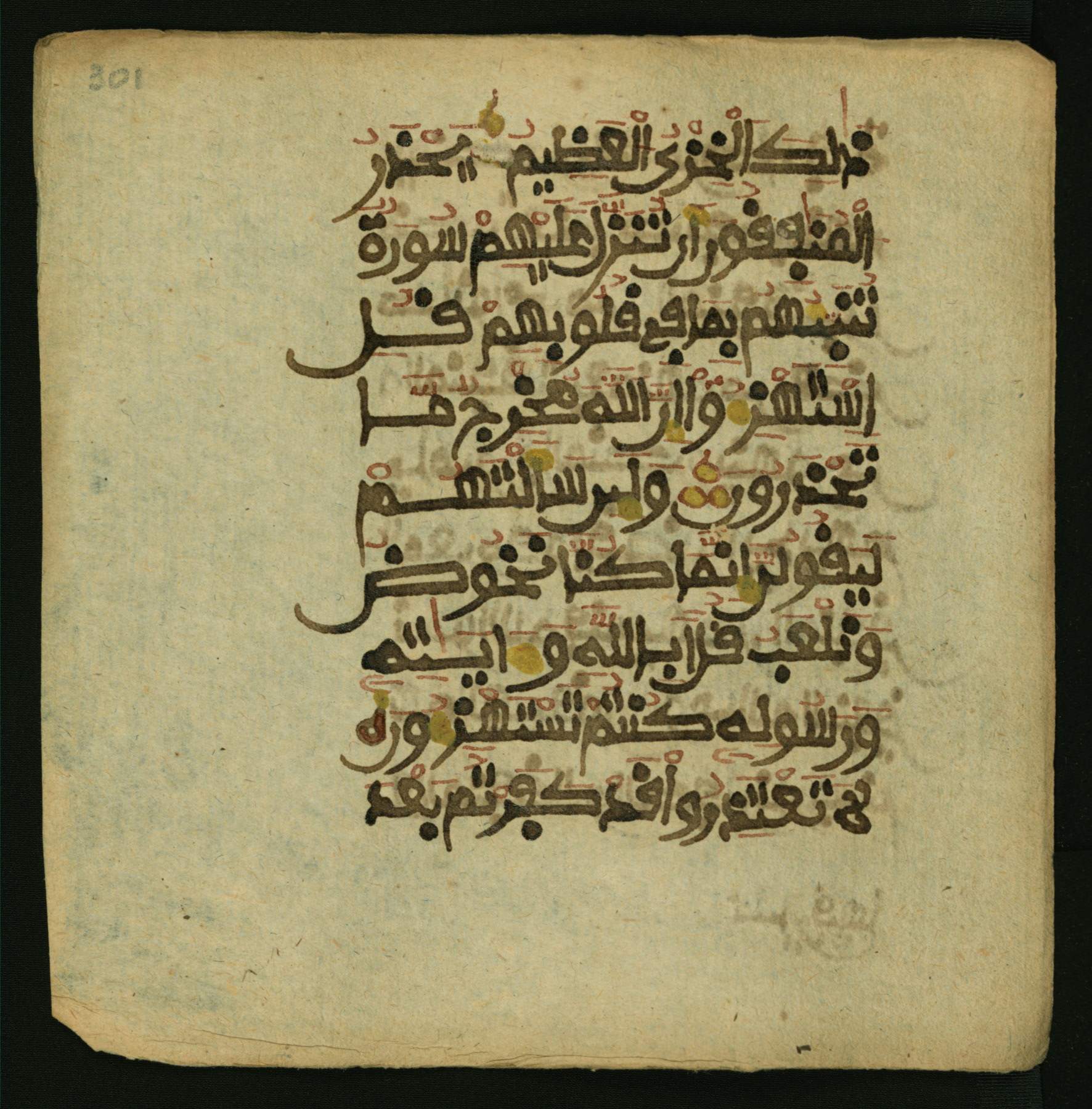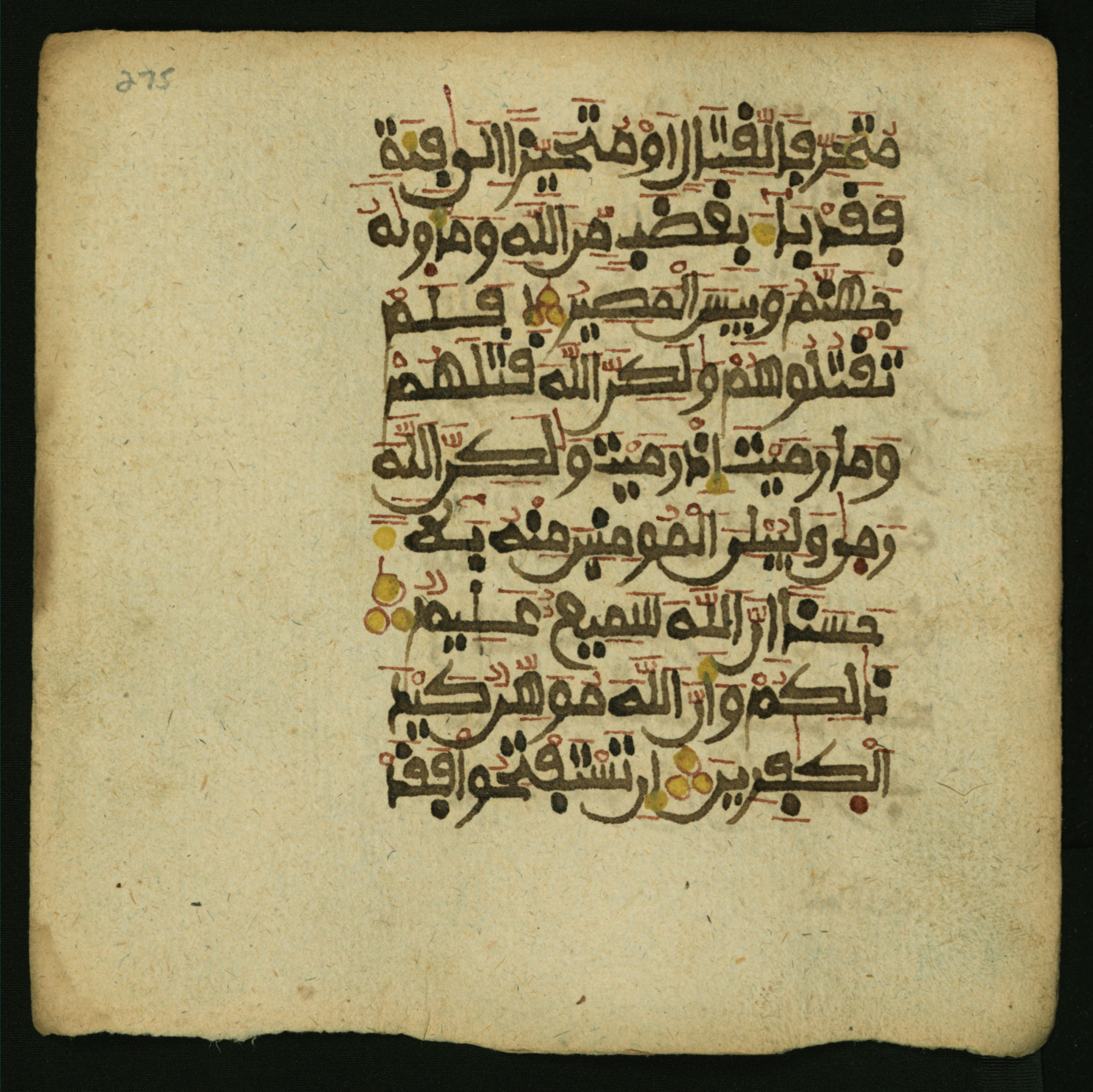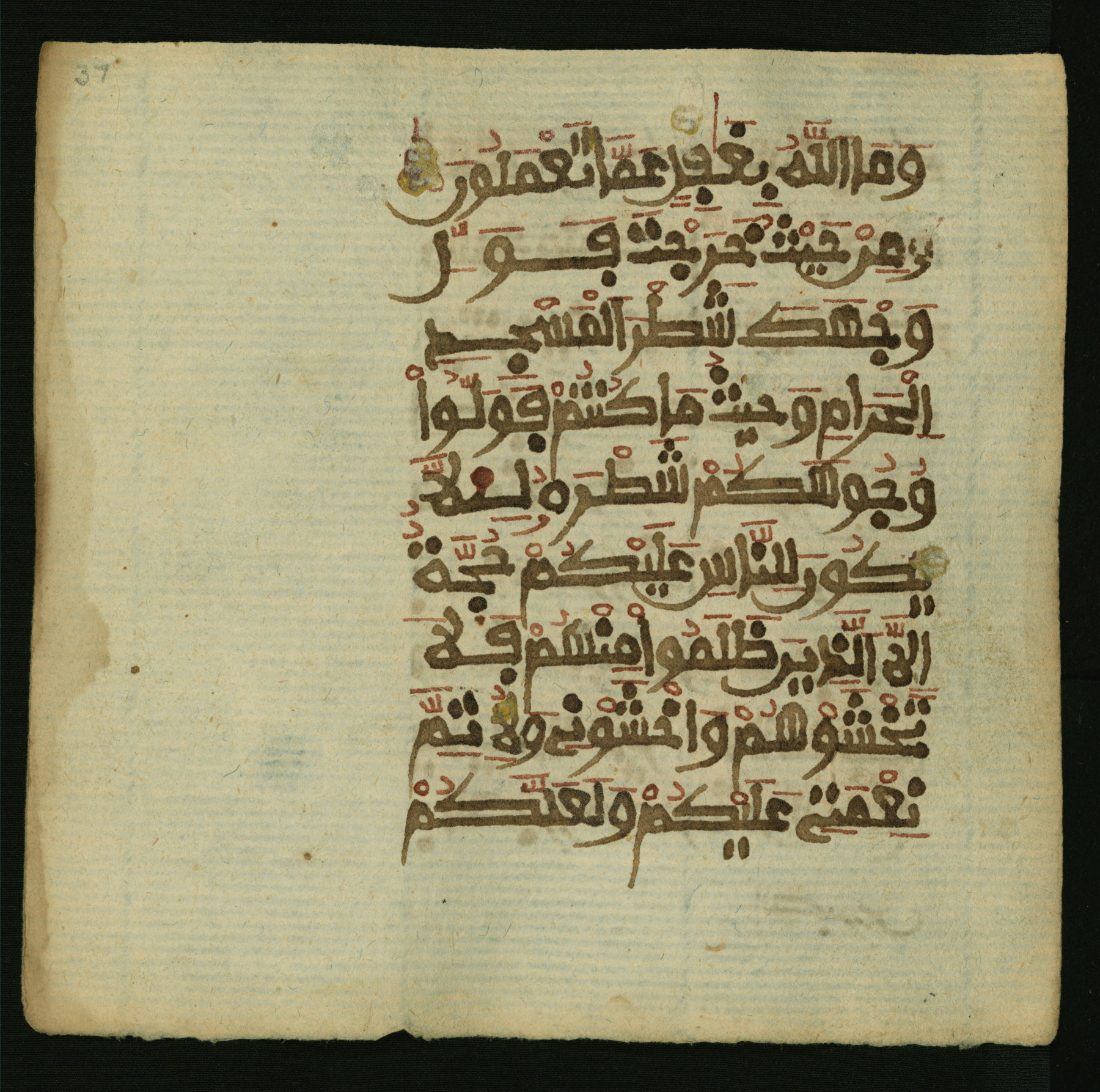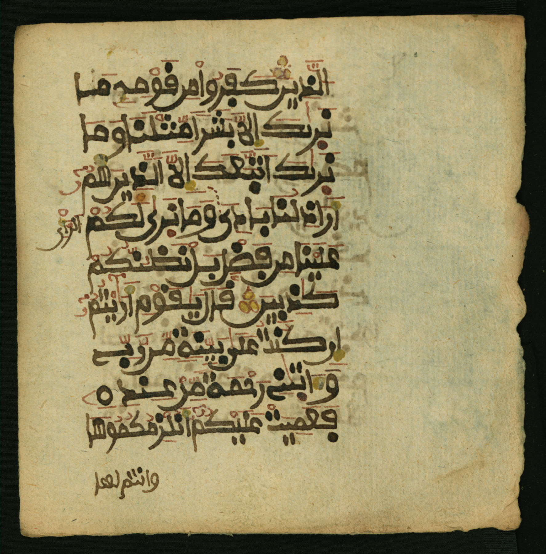 This square-format manuscript is volume 1, containing chapters 1-18 (Sūrat al-fātiḥah through Sūrat al-kahf), of an illuminated two-volume Qur'an produced in Sub-Saharan (West) Africa in the thirteenth century AH / nineteenth CE. The text is written in Sūdānī script in dark brown ink with vocalization in red on loose leaves. Chapter headings are in reddish-brown ink. Three yellow dots outlined in red arranged in a triangular form separate verses. Polychrome circular medallions as well as square and rectangular devices in a variety of patterns and colors mark textual divisions. The leaves of the text are organized between two decorated boards with geometric compositions. The pages and boards are housed in a leather pouch (satchel).