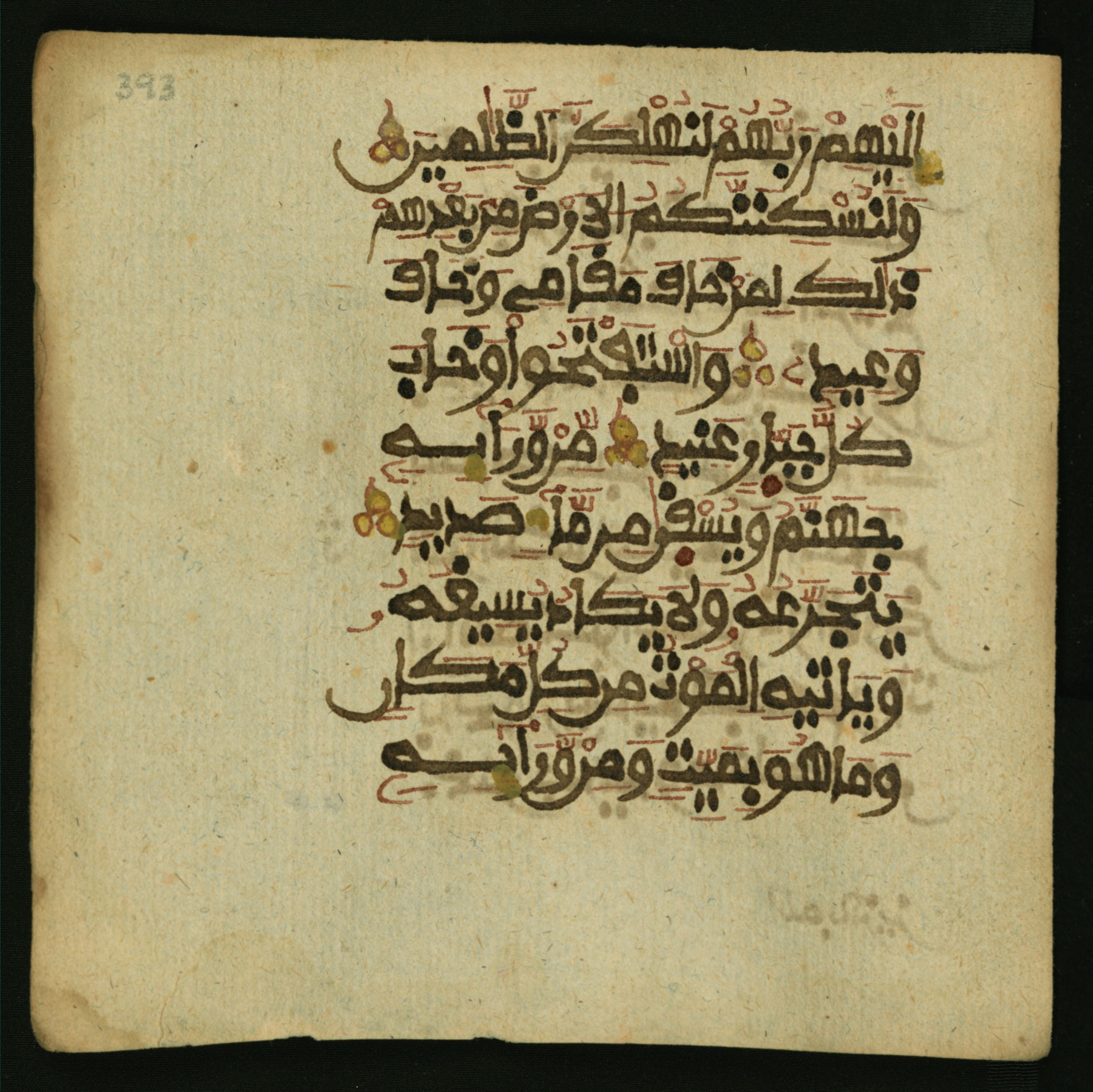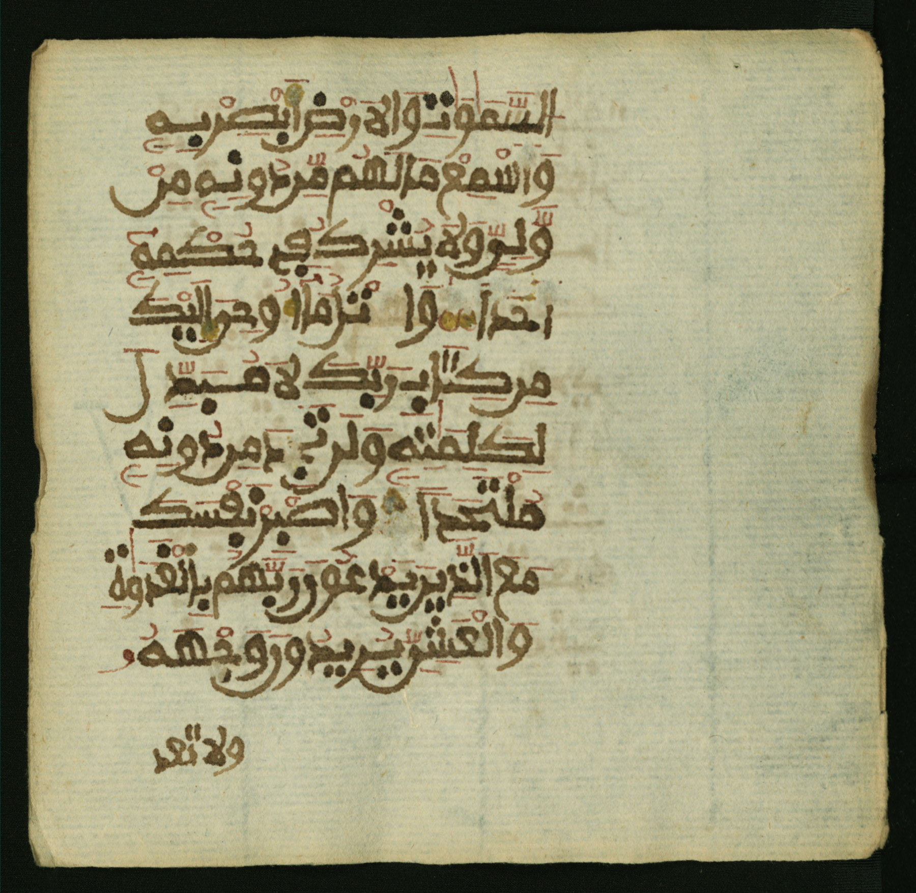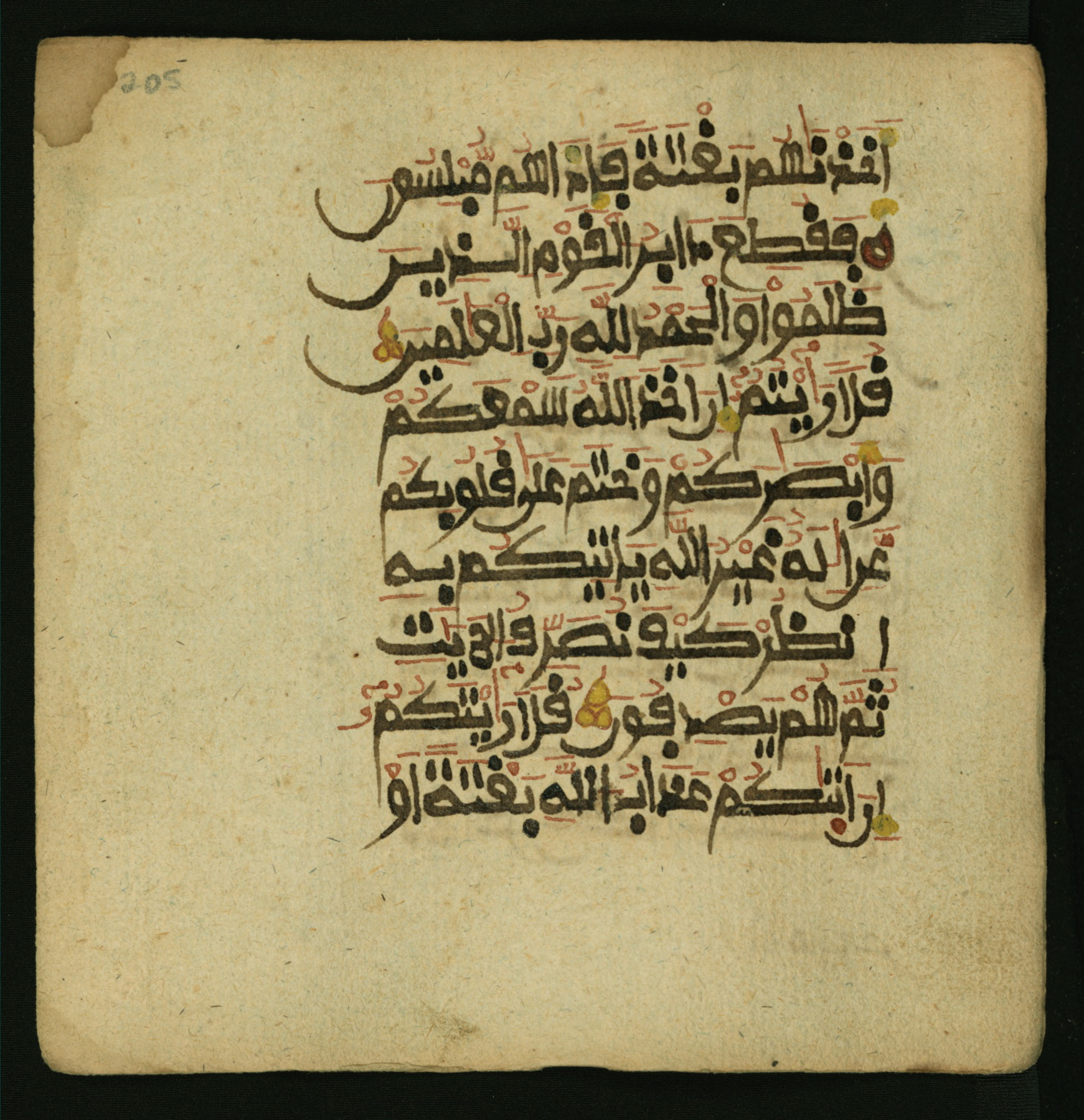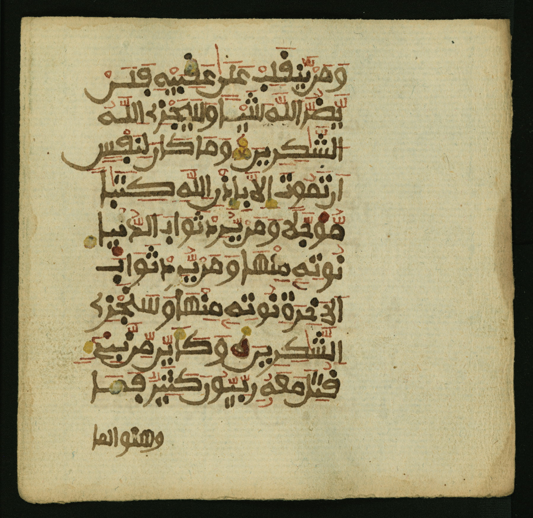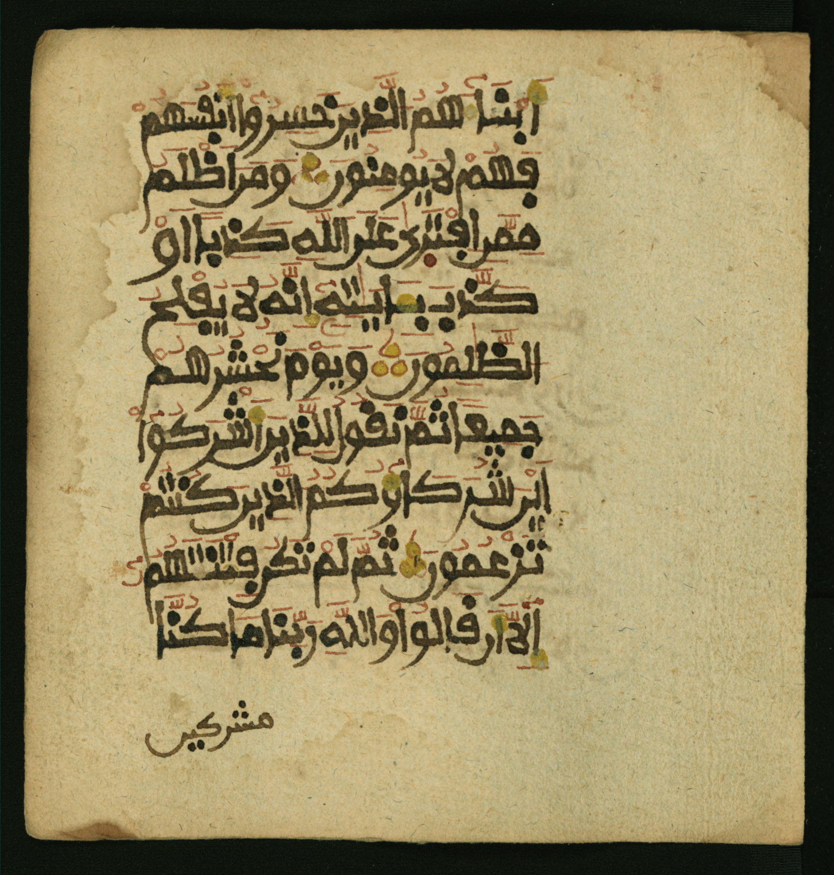 This square-format manuscript is volume 1, containing chapters 1-18 (Sūrat al-fātiḥah through Sūrat al-kahf), of an illuminated two-volume Qur'an produced in Sub-Saharan (West) Africa in the thirteenth century AH / nineteenth CE. The text is written in Sūdānī script in dark brown ink with vocalization in red on loose leaves. Chapter headings are in reddish-brown ink. Three yellow dots outlined in red arranged in a triangular form separate verses. Polychrome circular medallions as well as square and rectangular devices in a variety of patterns and colors mark textual divisions. The leaves of the text are organized between two decorated boards with geometric compositions. The pages and boards are housed in a leather pouch (satchel).
