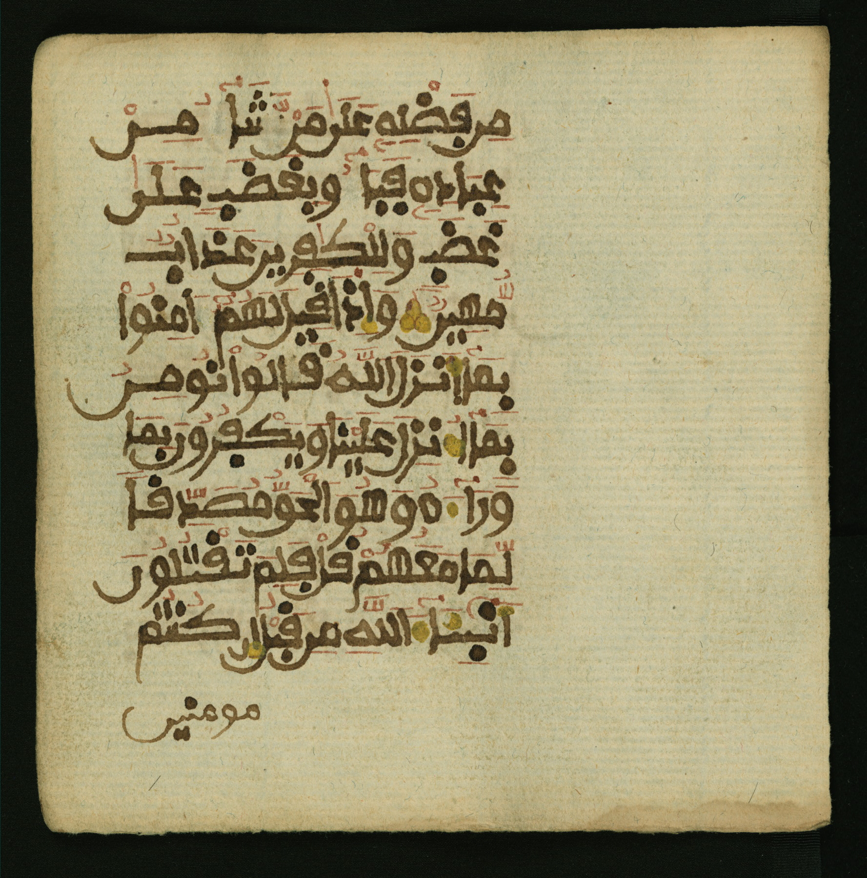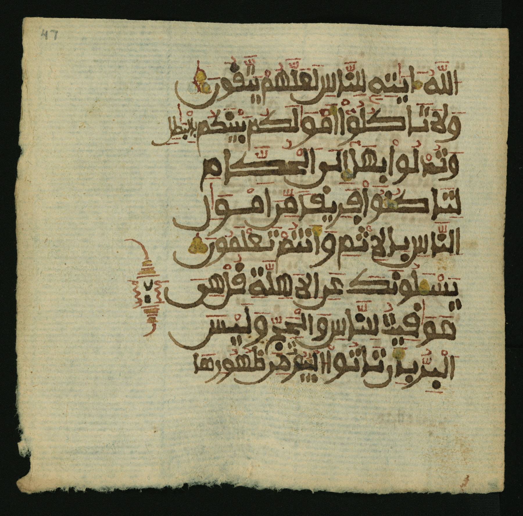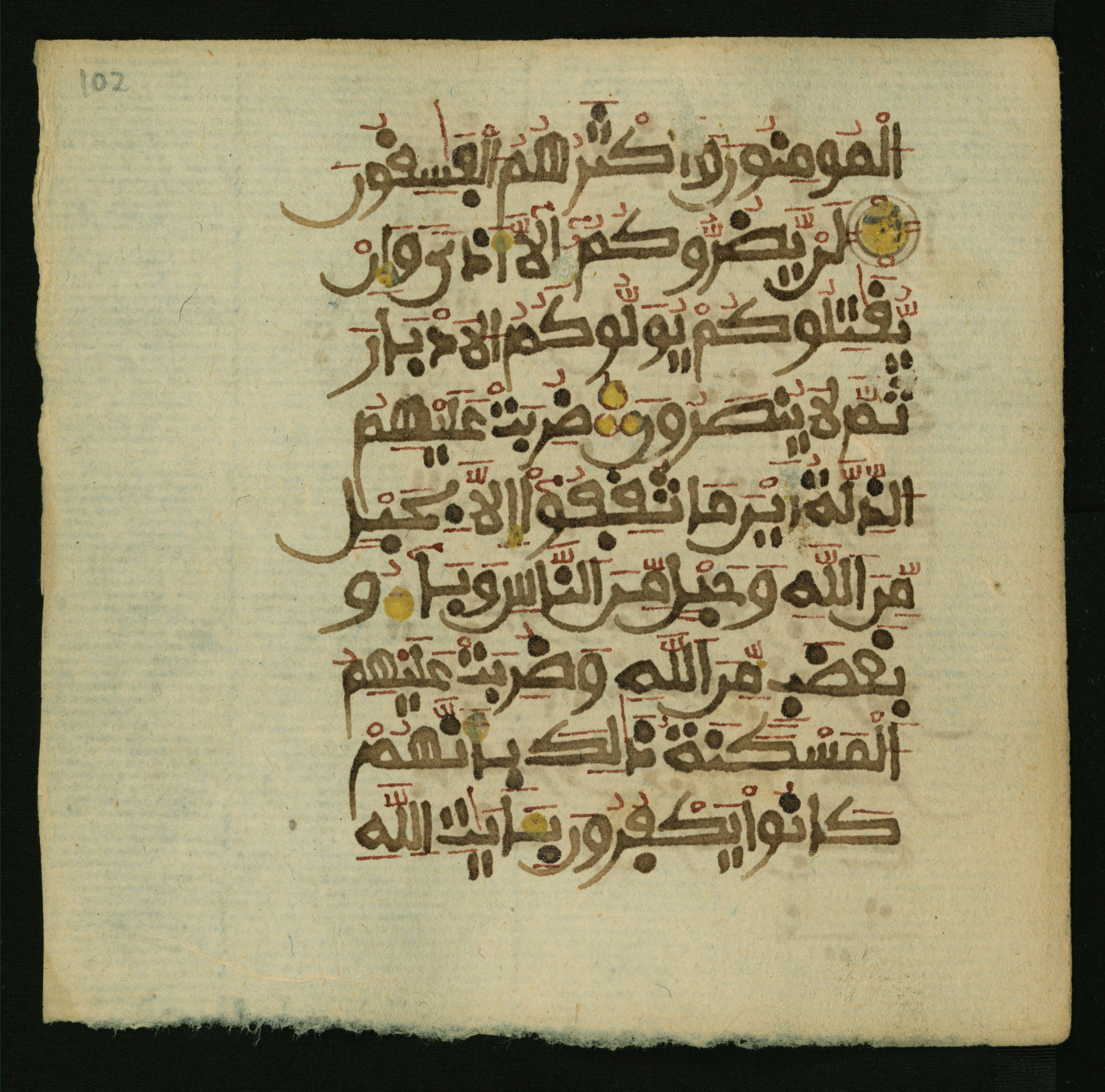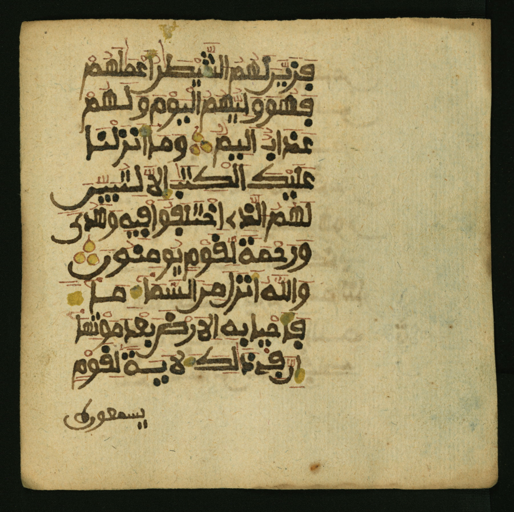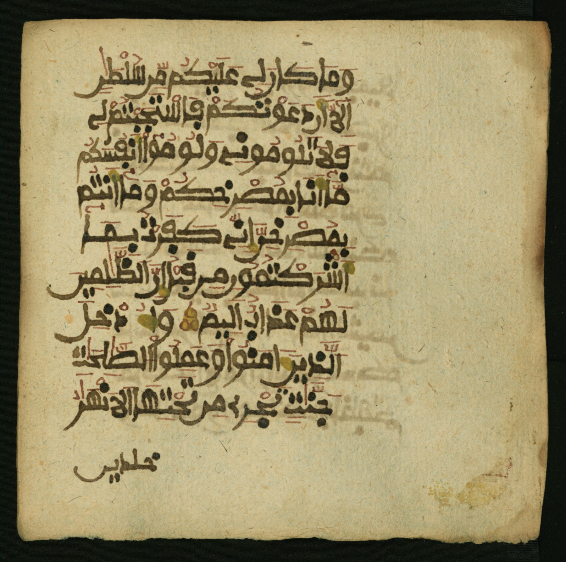 This square-format manuscript is volume 1, containing chapters 1-18 (Sūrat al-fātiḥah through Sūrat al-kahf), of an illuminated two-volume Qur'an produced in Sub-Saharan (West) Africa in the thirteenth century AH / nineteenth CE. The text is written in Sūdānī script in dark brown ink with vocalization in red on loose leaves. Chapter headings are in reddish-brown ink. Three yellow dots outlined in red arranged in a triangular form separate verses. Polychrome circular medallions as well as square and rectangular devices in a variety of patterns and colors mark textual divisions. The leaves of the text are organized between two decorated boards with geometric compositions. The pages and boards are housed in a leather pouch (satchel).