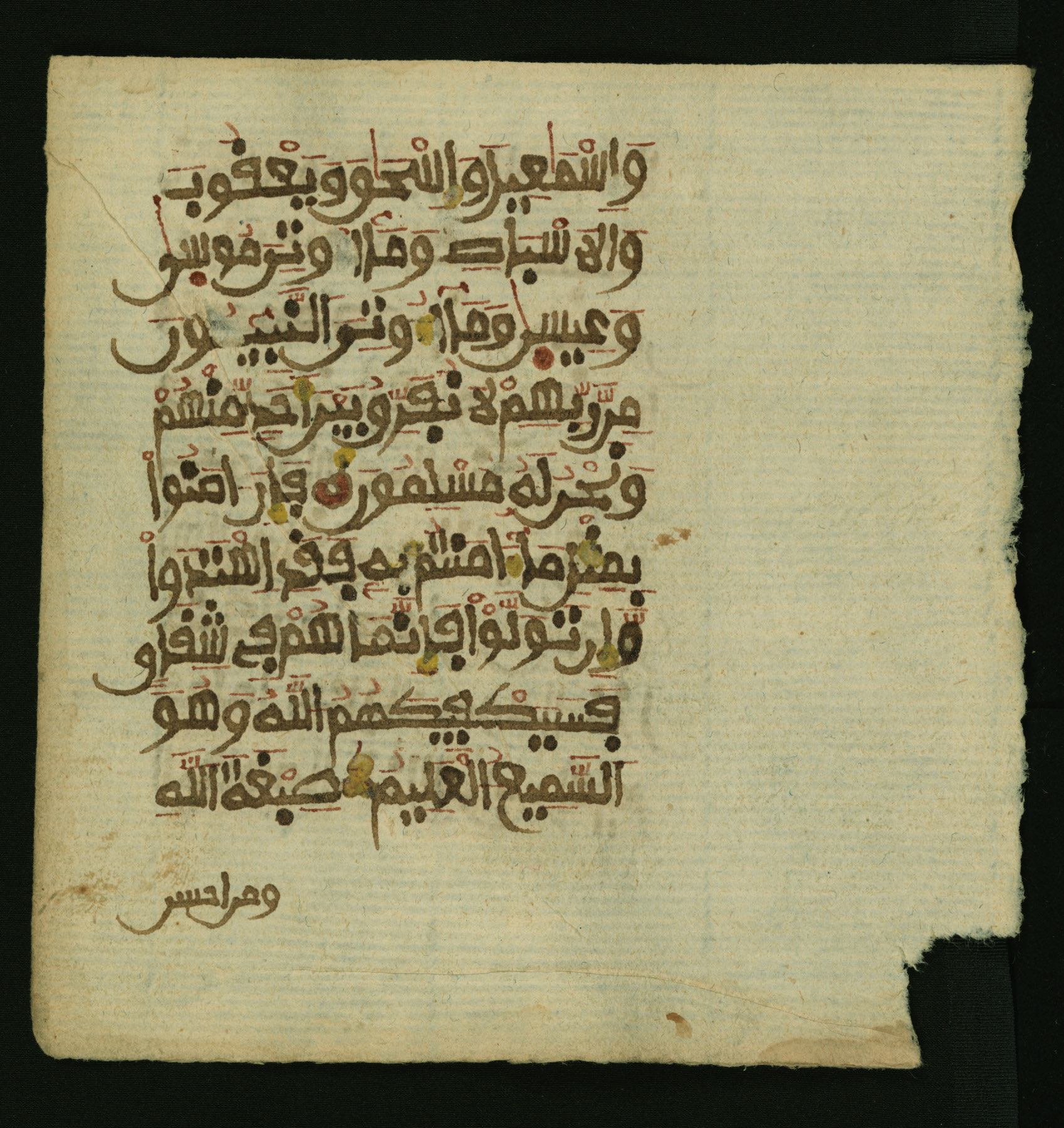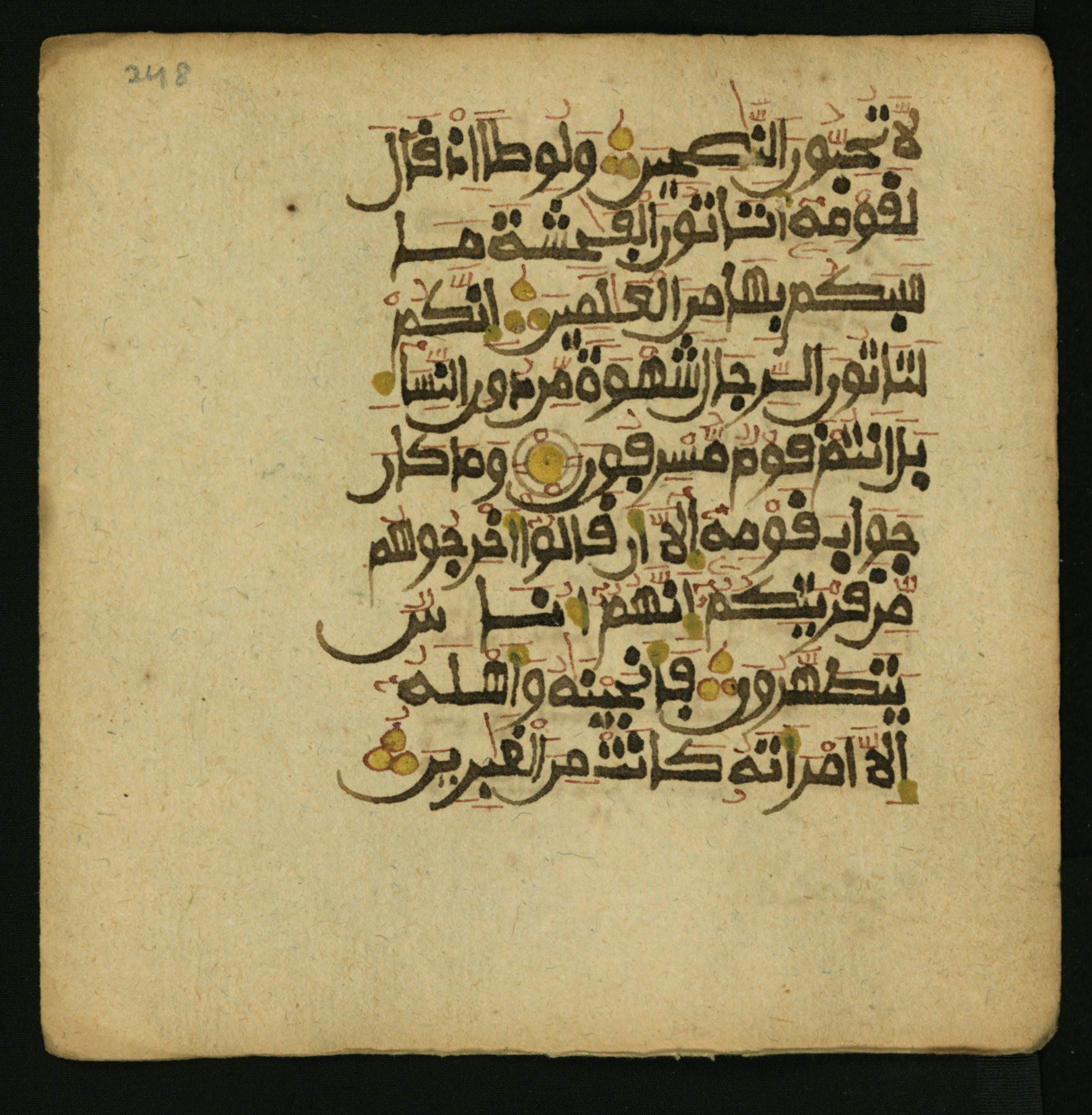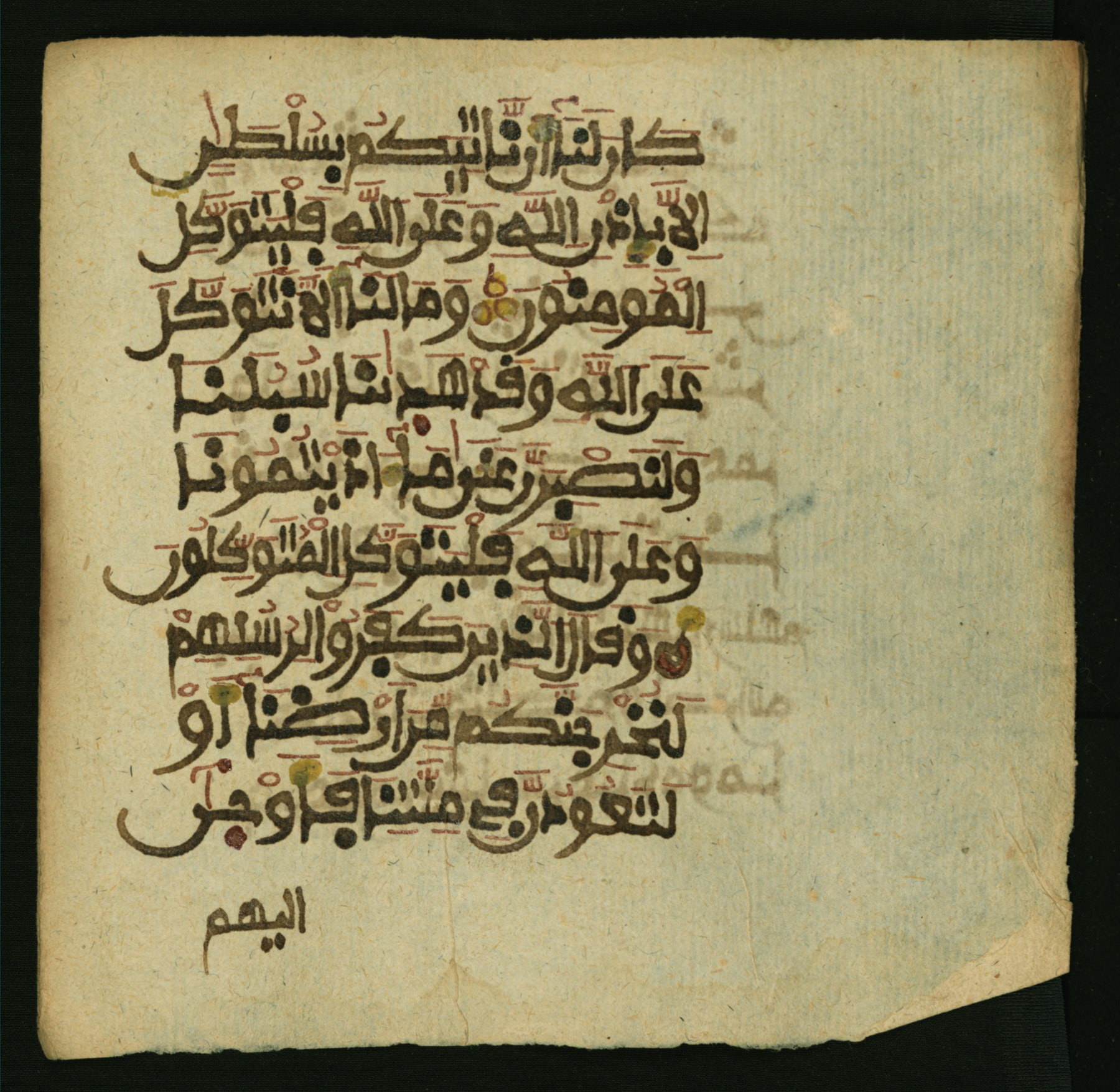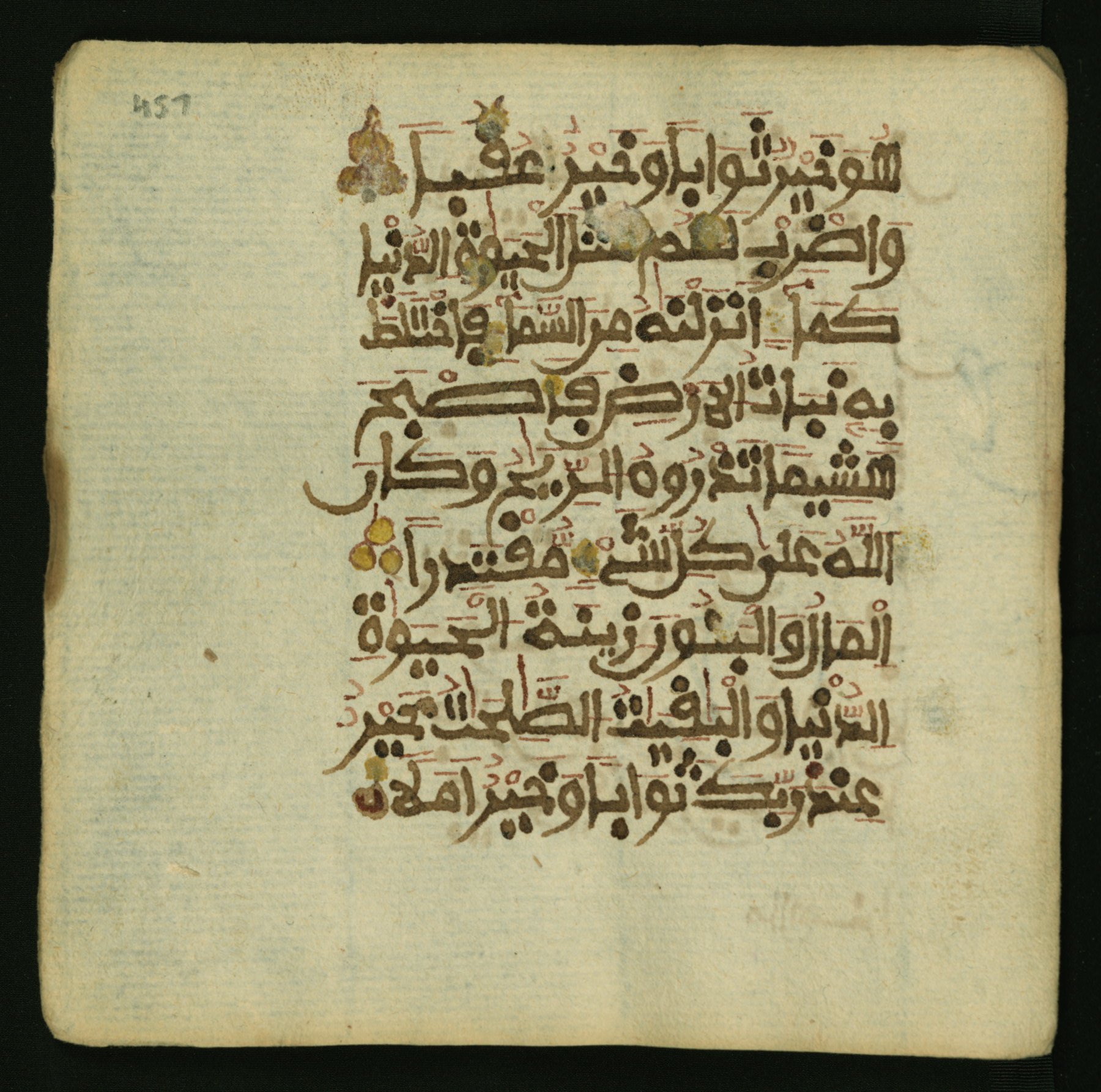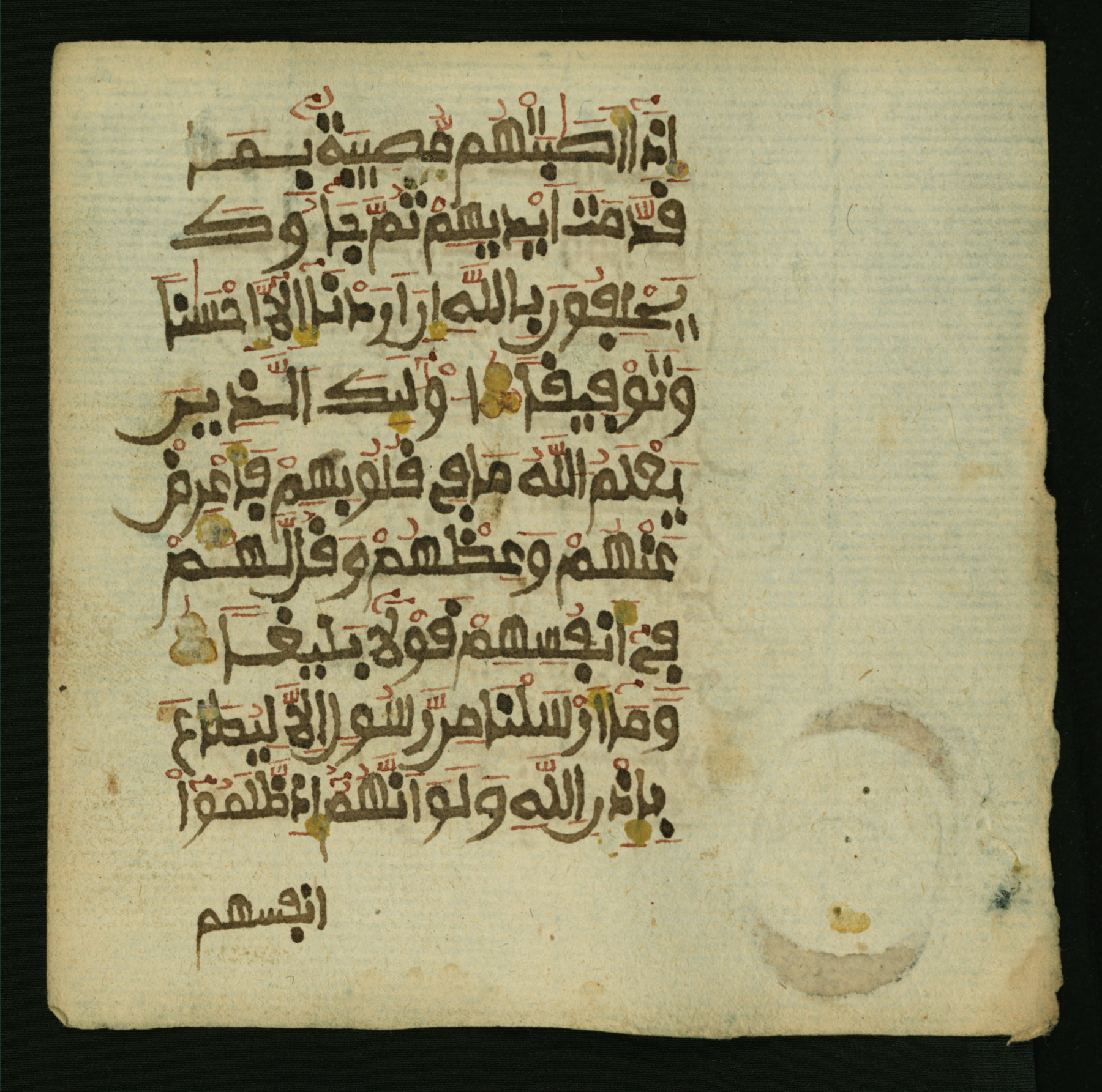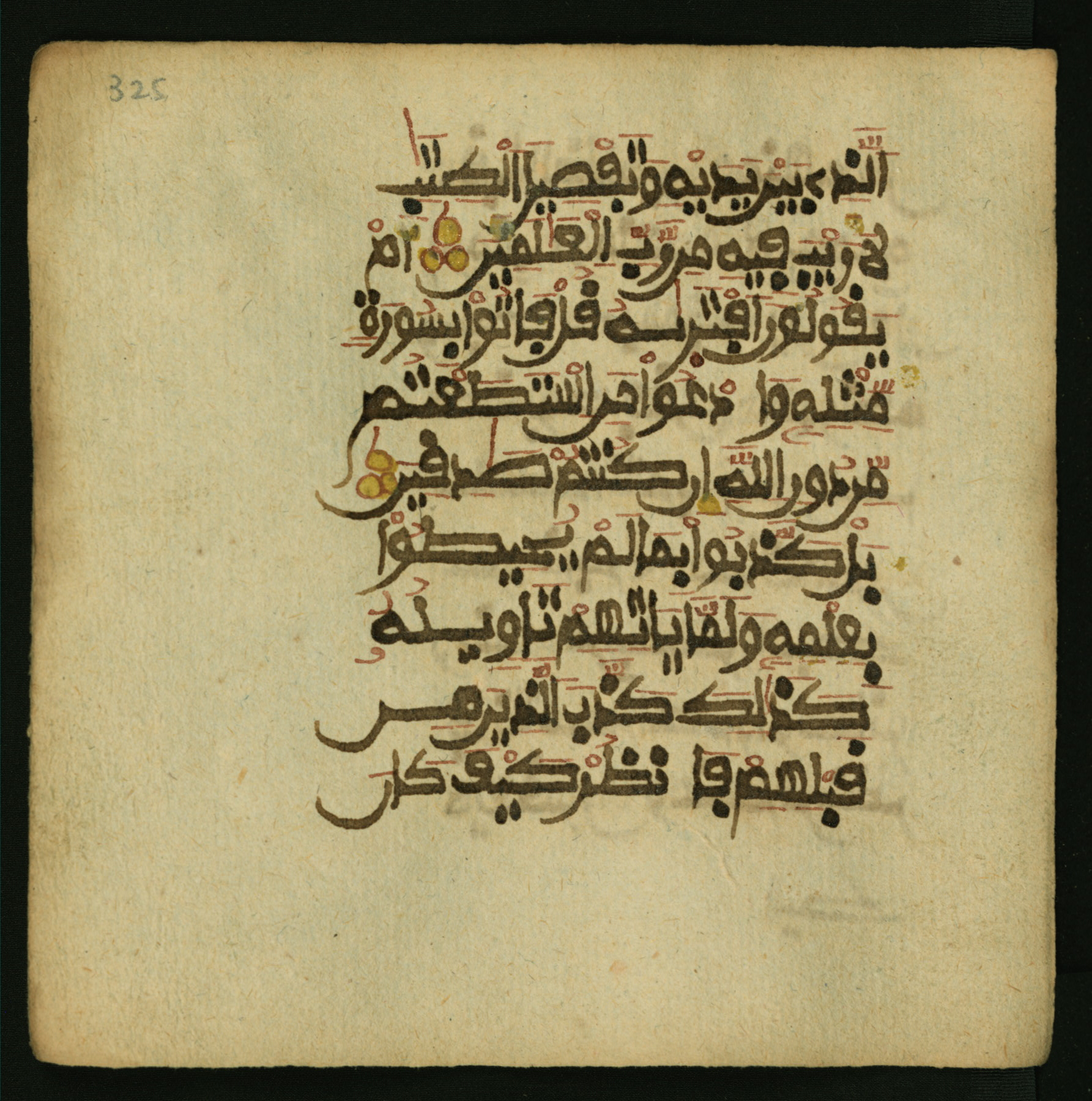 This square-format manuscript is volume 1, containing chapters 1-18 (Sūrat al-fātiḥah through Sūrat al-kahf), of an illuminated two-volume Qur'an produced in Sub-Saharan (West) Africa in the thirteenth century AH / nineteenth CE. The text is written in Sūdānī script in dark brown ink with vocalization in red on loose leaves. Chapter headings are in reddish-brown ink. Three yellow dots outlined in red arranged in a triangular form separate verses. Polychrome circular medallions as well as square and rectangular devices in a variety of patterns and colors mark textual divisions. The leaves of the text are organized between two decorated boards with geometric compositions. The pages and boards are housed in a leather pouch (satchel).