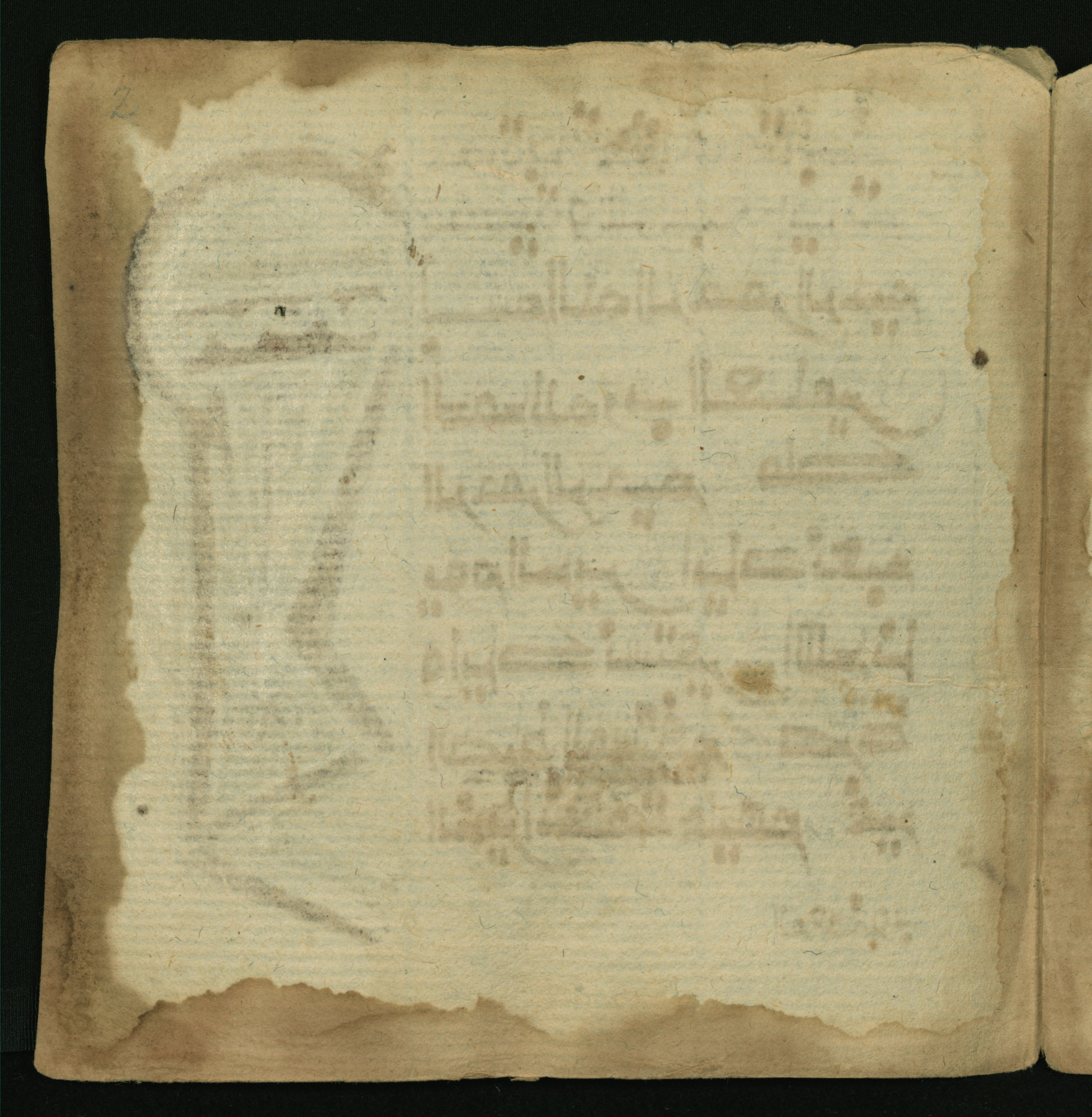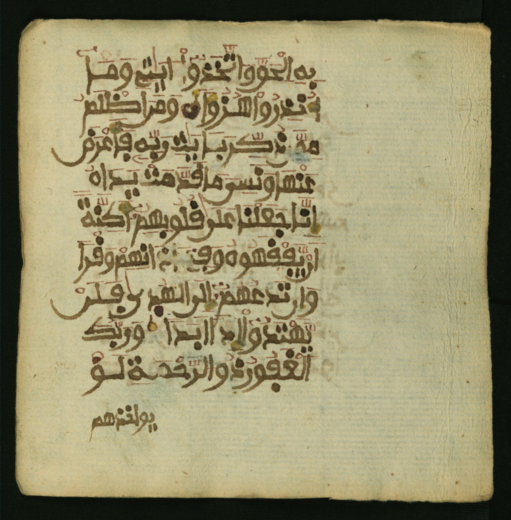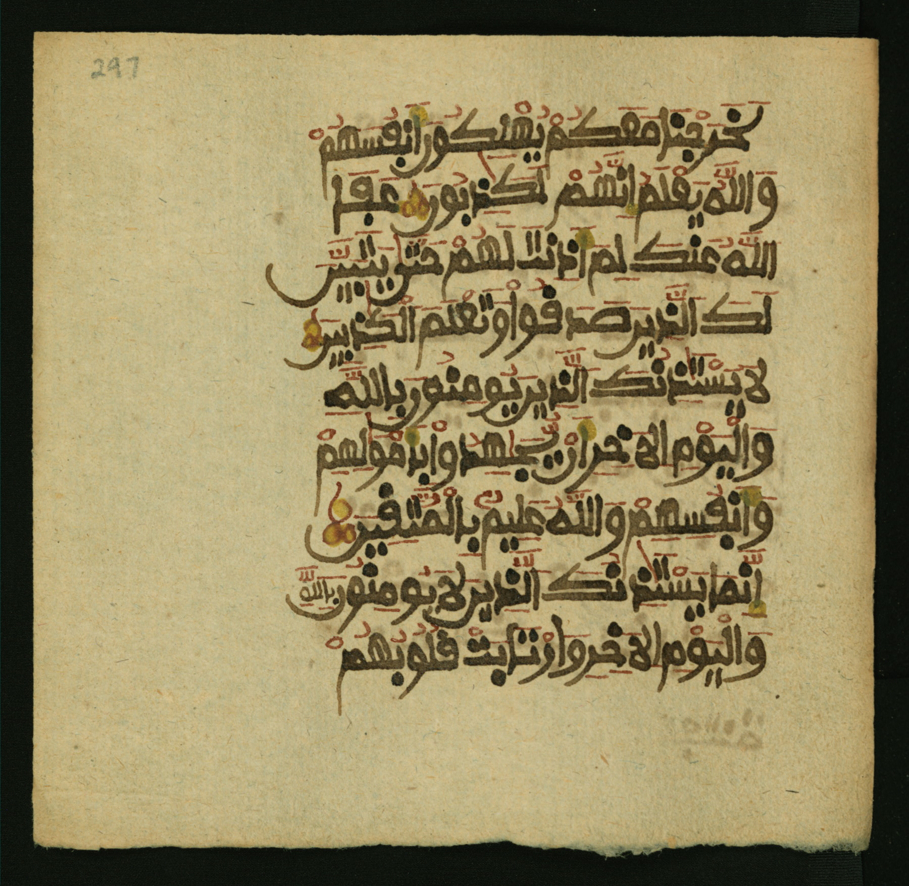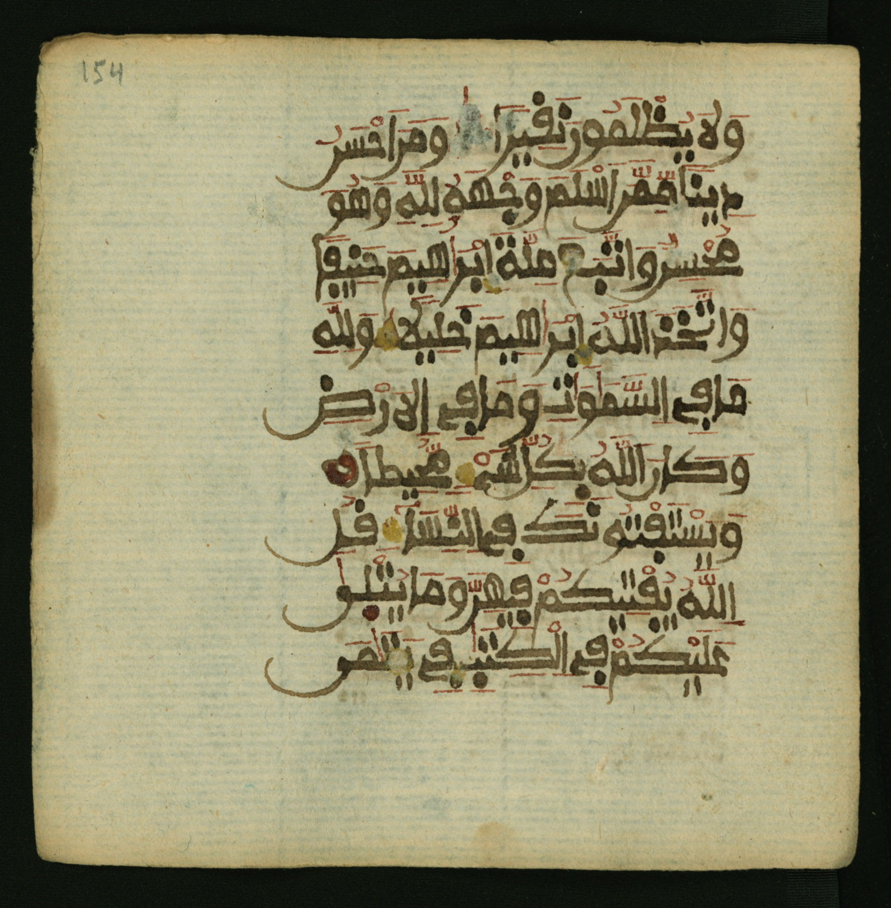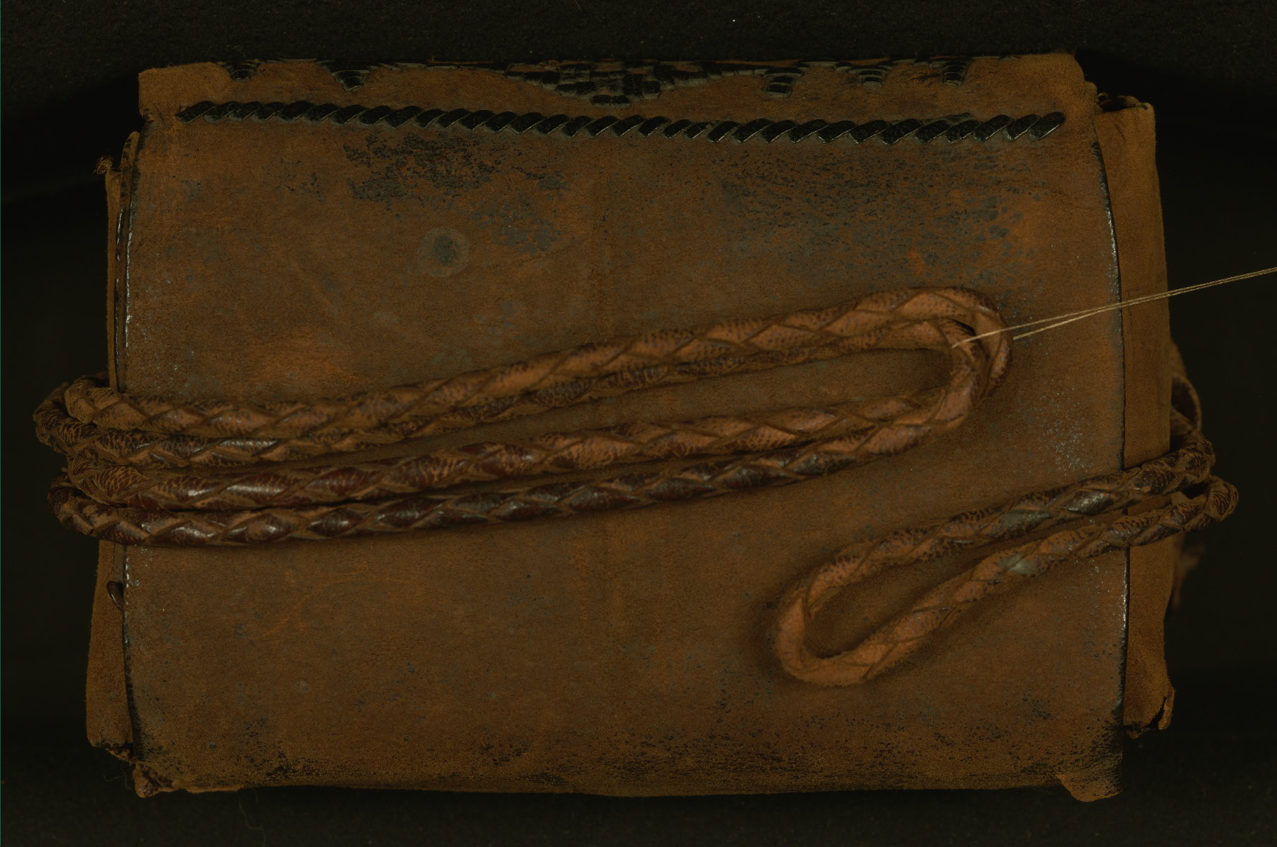 This square-format manuscript is volume 1, containing chapters 1-18 (Sūrat al-fātiḥah through Sūrat al-kahf), of an illuminated two-volume Qur'an produced in Sub-Saharan (West) Africa in the thirteenth century AH / nineteenth CE. The text is written in Sūdānī script in dark brown ink with vocalization in red on loose leaves. Chapter headings are in reddish-brown ink. Three yellow dots outlined in red arranged in a triangular form separate verses. Polychrome circular medallions as well as square and rectangular devices in a variety of patterns and colors mark textual divisions. The leaves of the text are organized between two decorated boards with geometric compositions. The pages and boards are housed in a leather pouch (satchel).