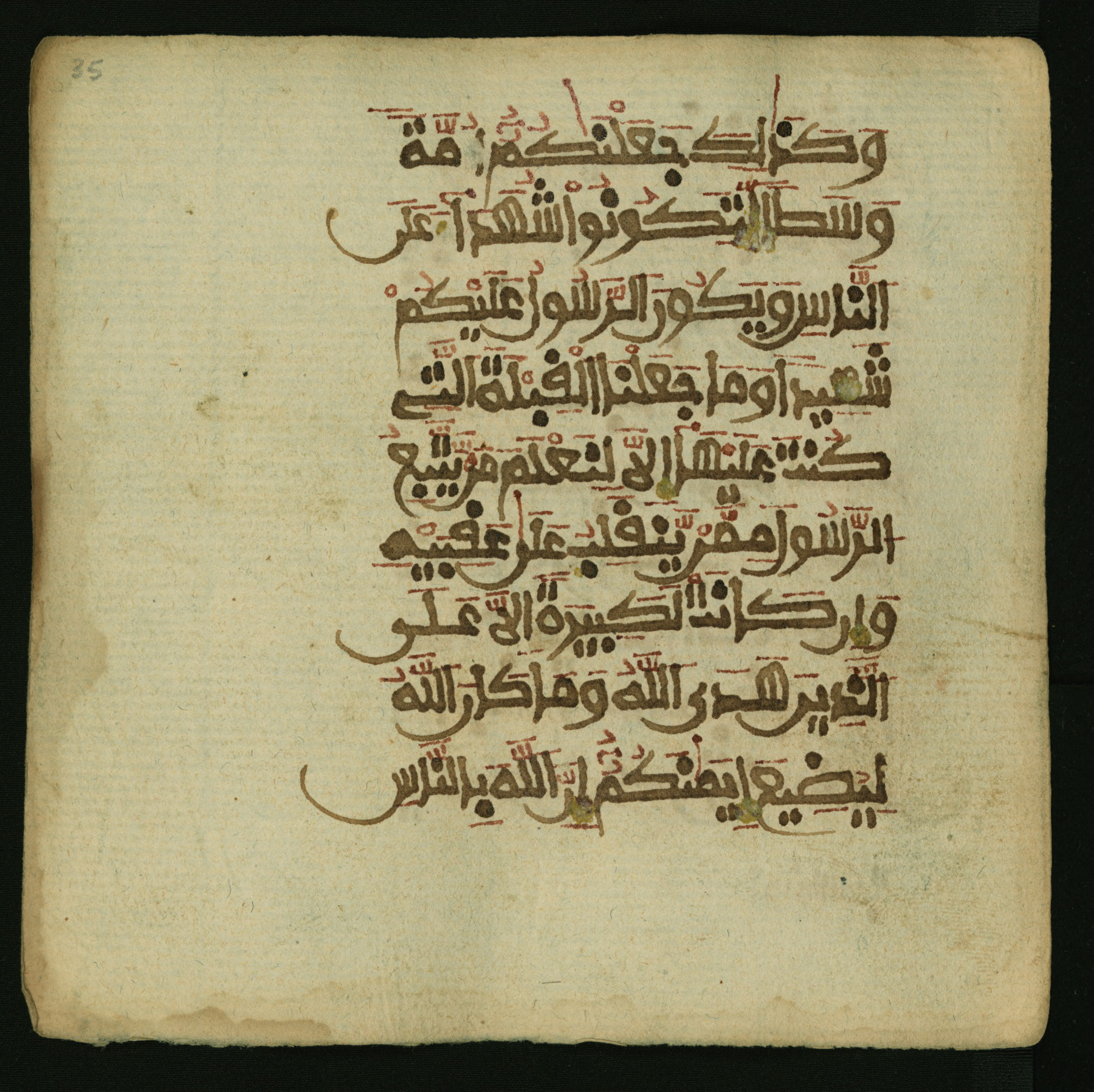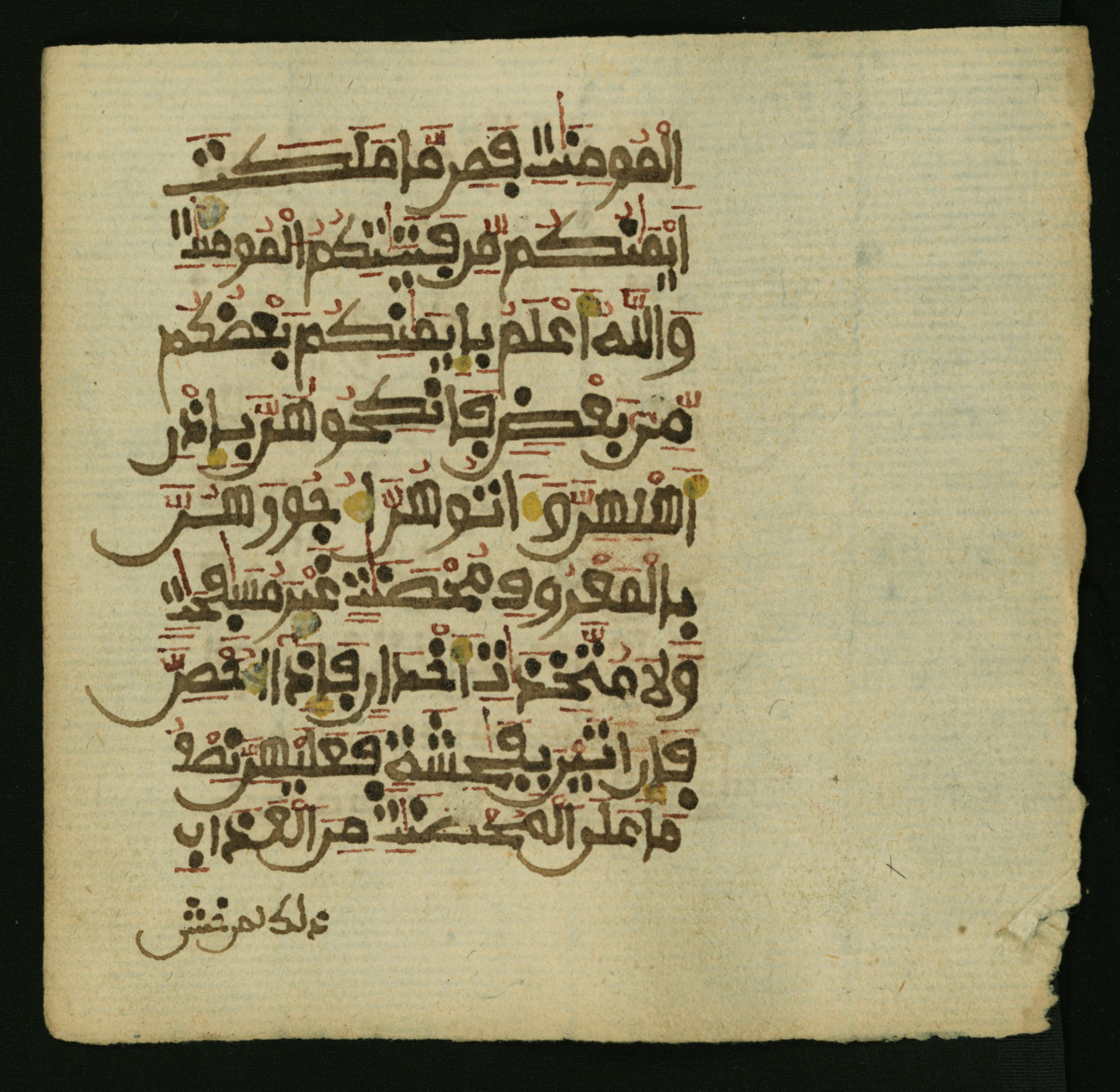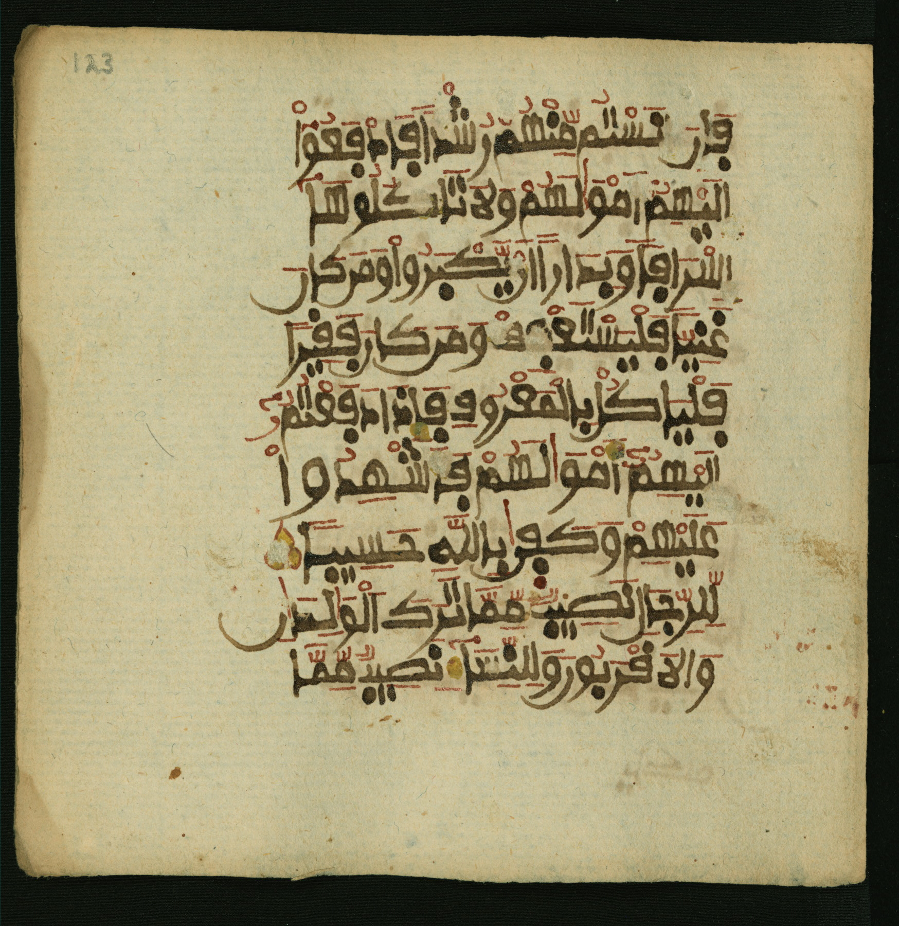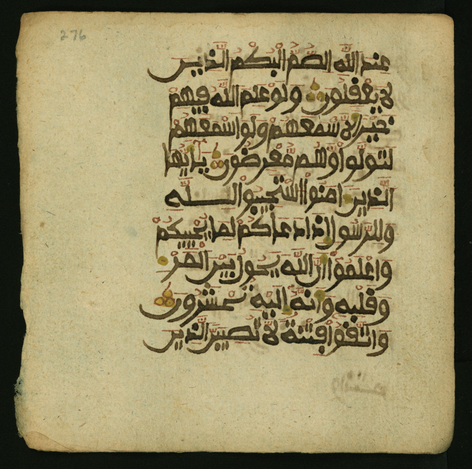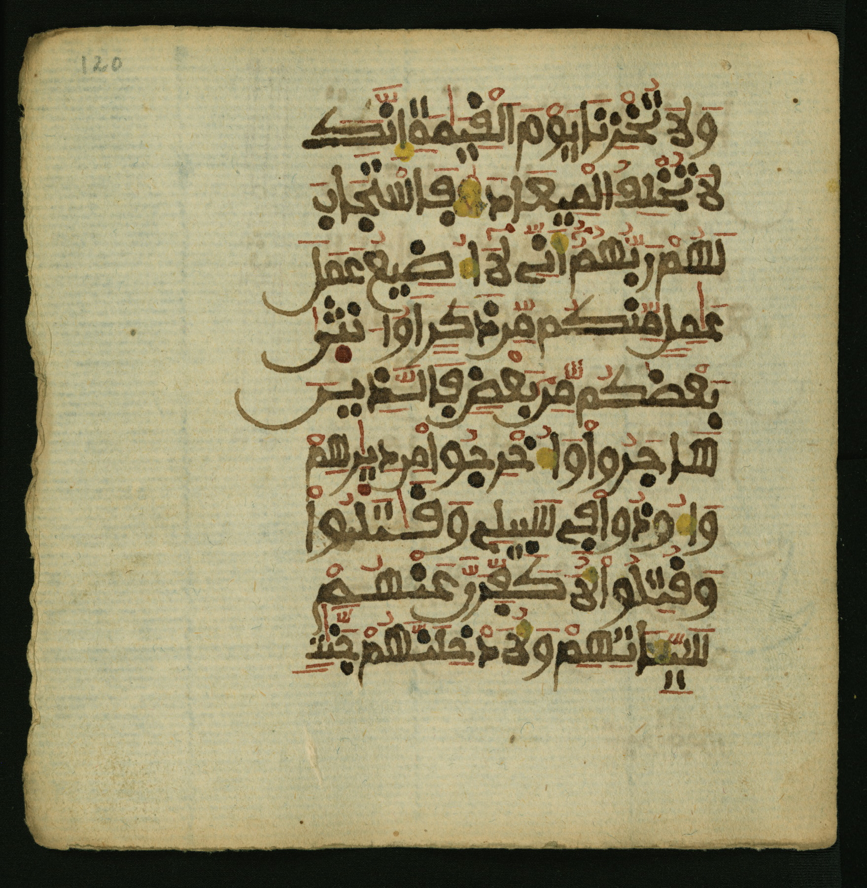 This square-format manuscript is volume 1, containing chapters 1-18 (Sūrat al-fātiḥah through Sūrat al-kahf), of an illuminated two-volume Qur'an produced in Sub-Saharan (West) Africa in the thirteenth century AH / nineteenth CE. The text is written in Sūdānī script in dark brown ink with vocalization in red on loose leaves. Chapter headings are in reddish-brown ink. Three yellow dots outlined in red arranged in a triangular form separate verses. Polychrome circular medallions as well as square and rectangular devices in a variety of patterns and colors mark textual divisions. The leaves of the text are organized between two decorated boards with geometric compositions. The pages and boards are housed in a leather pouch (satchel).